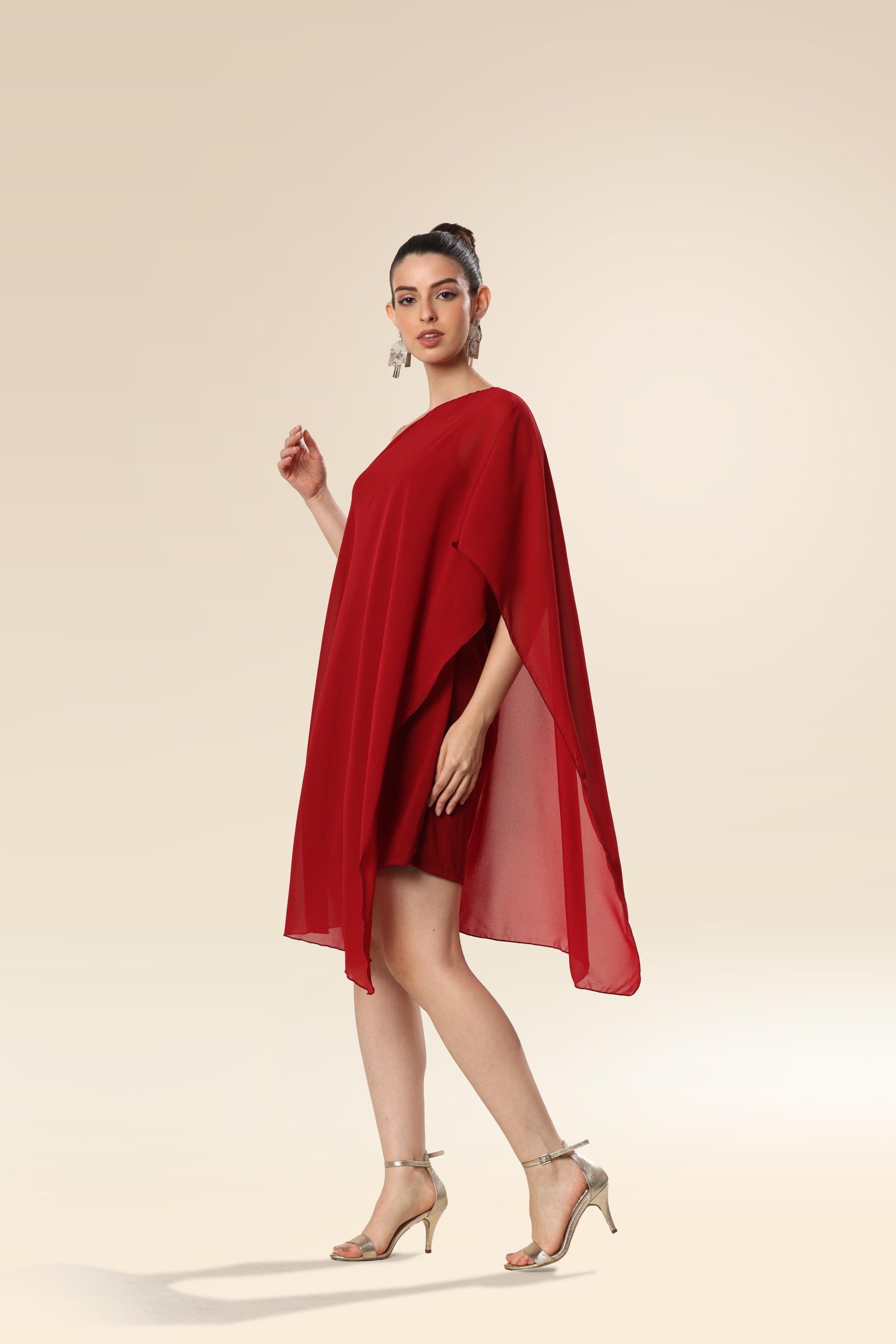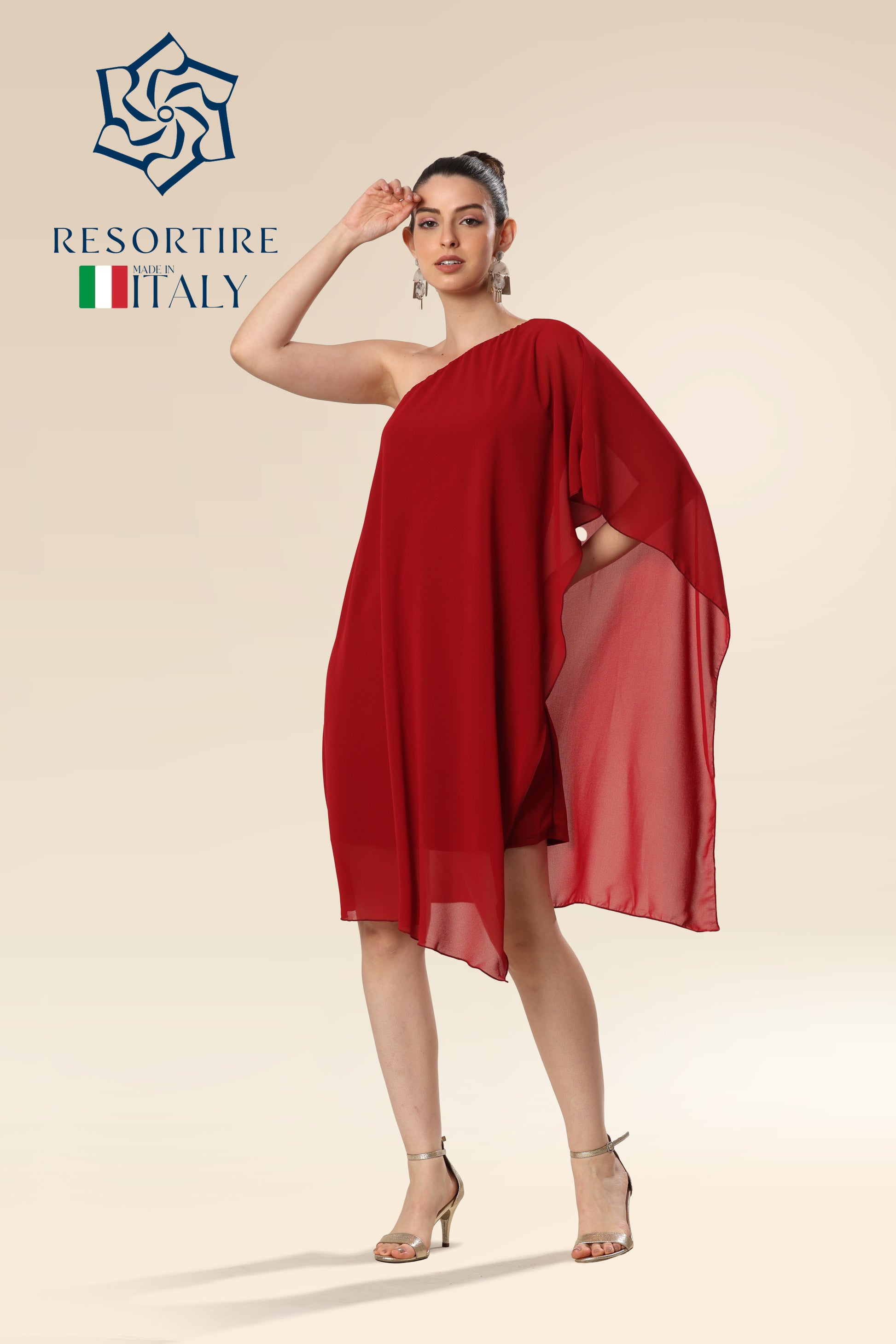 The dress is asymmetrical in length and has an open shoulder on one side and a lining along the entire length. It is decorated with sewn thin transparent fabric.