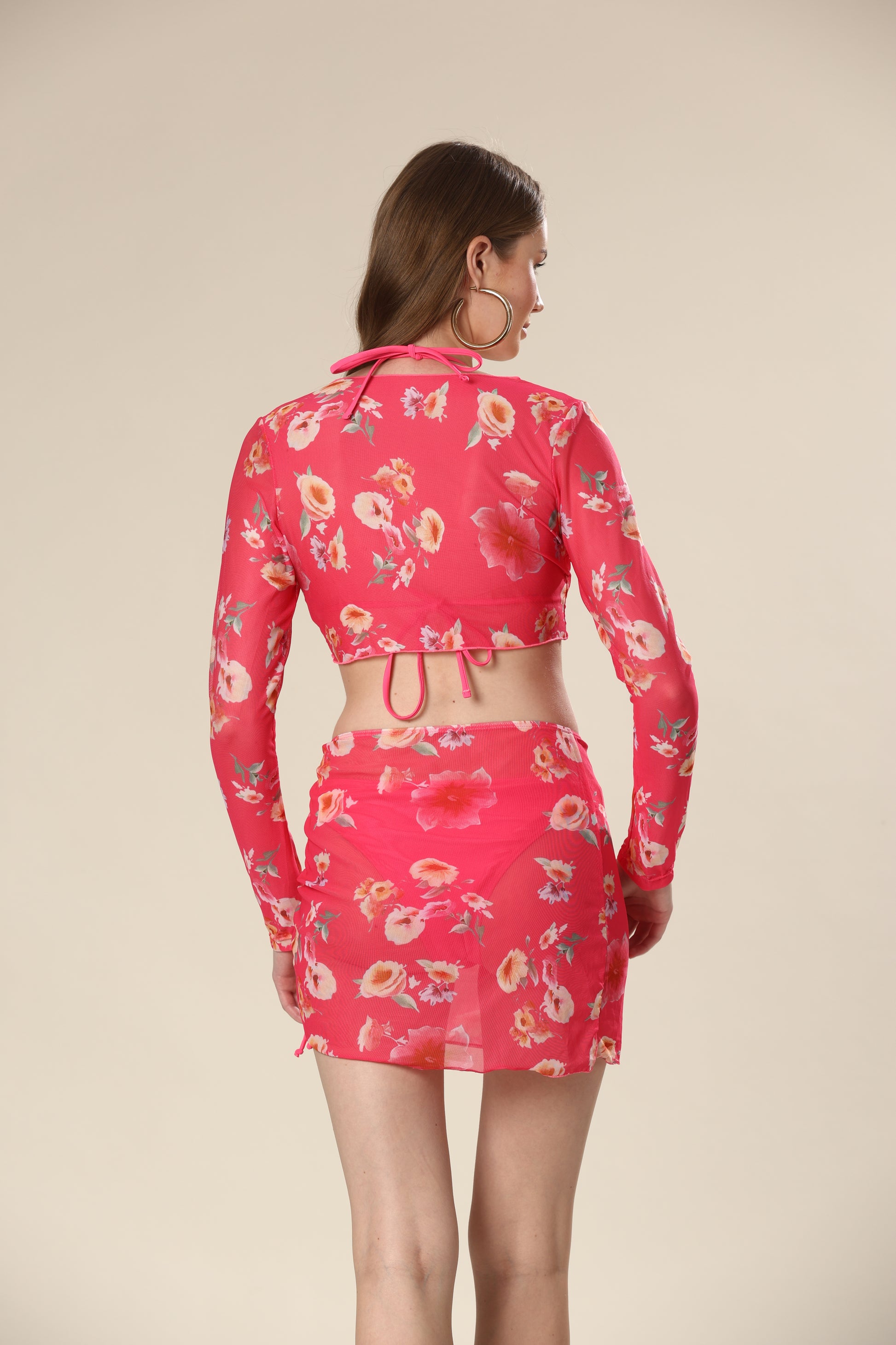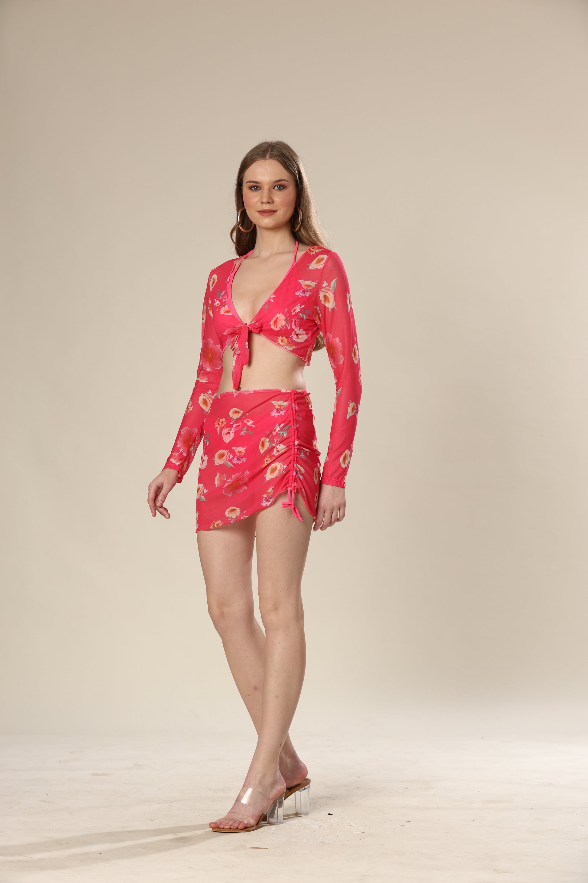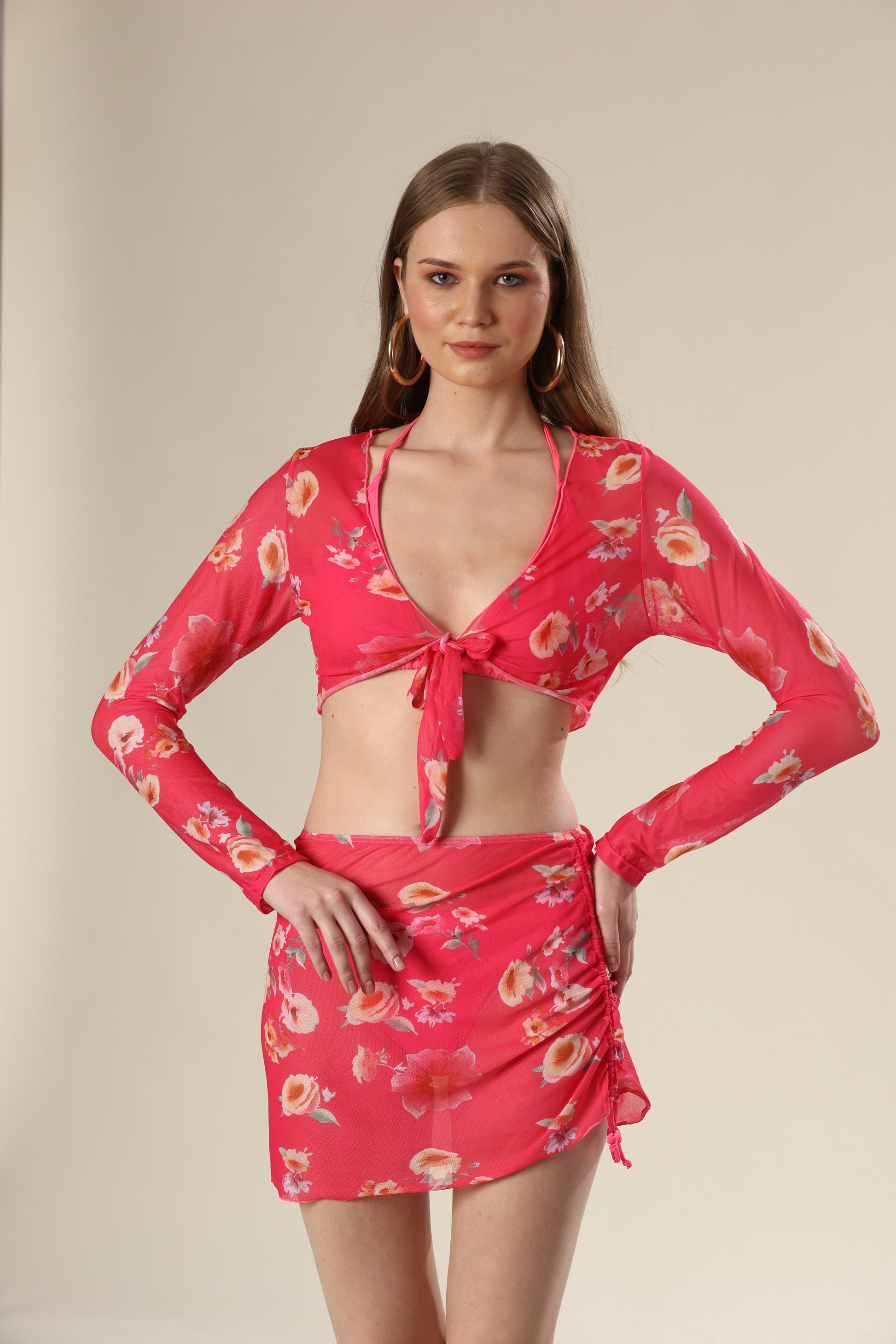 Floral long sleeved top & skirt swimsuit four piece set.