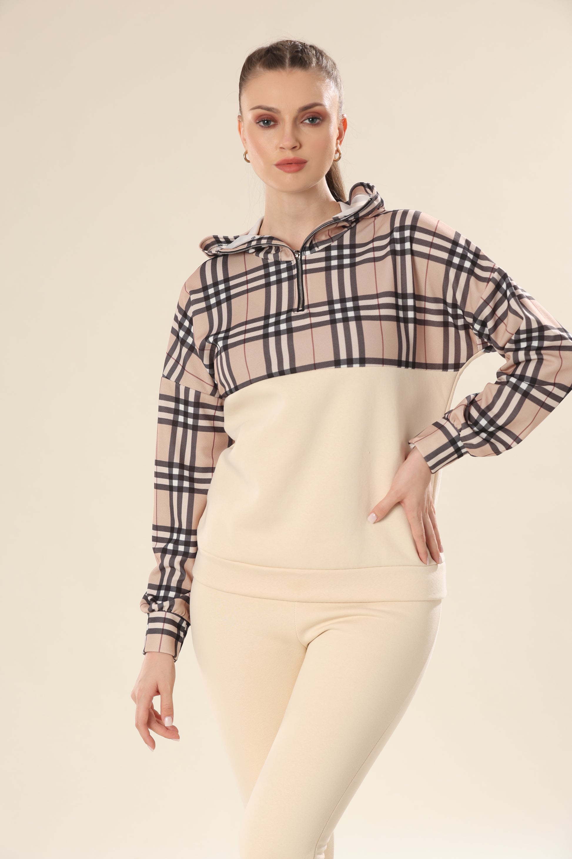 Fashionable Checks In Modern Beige Plaid Co-ord Set
