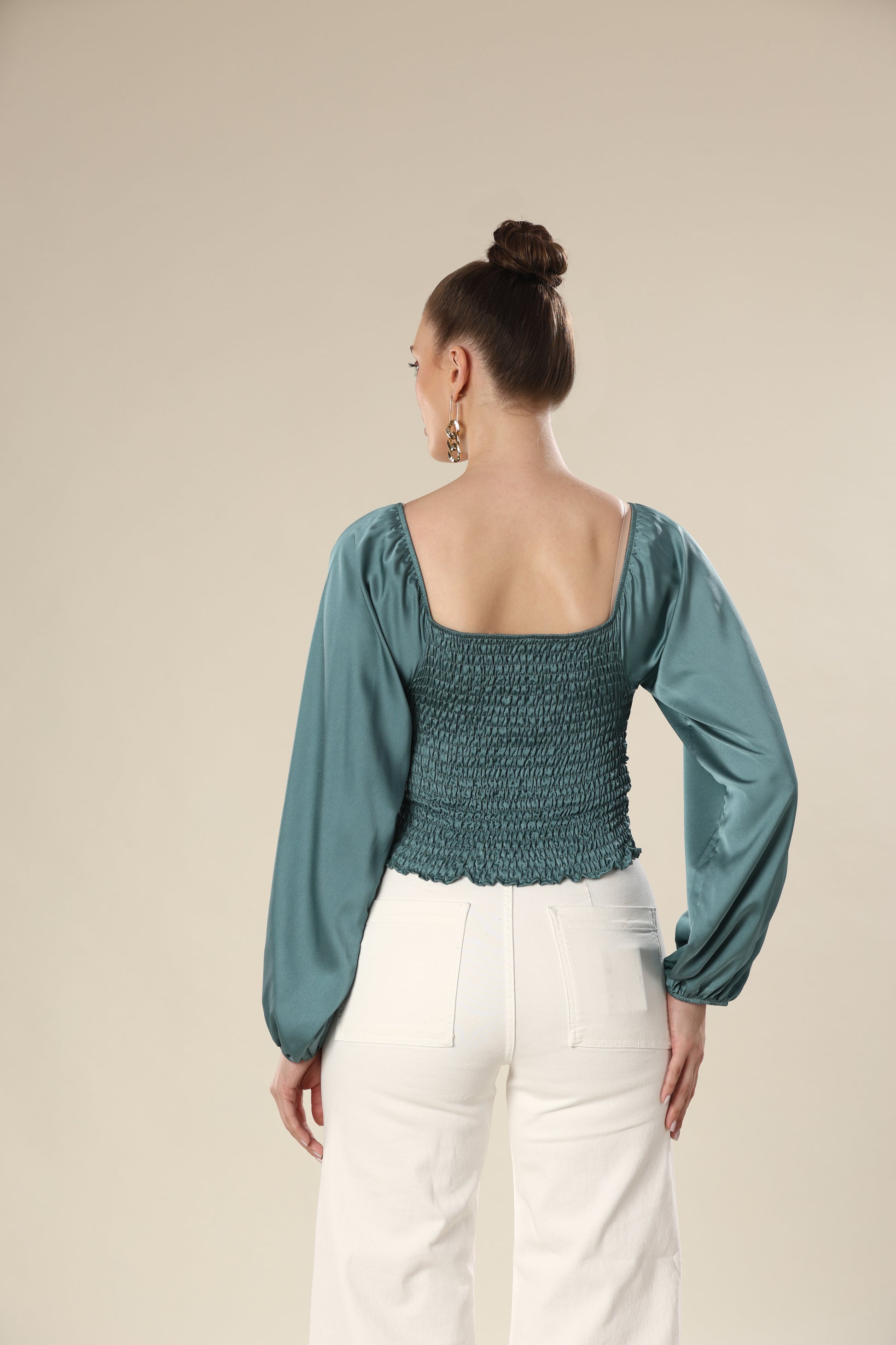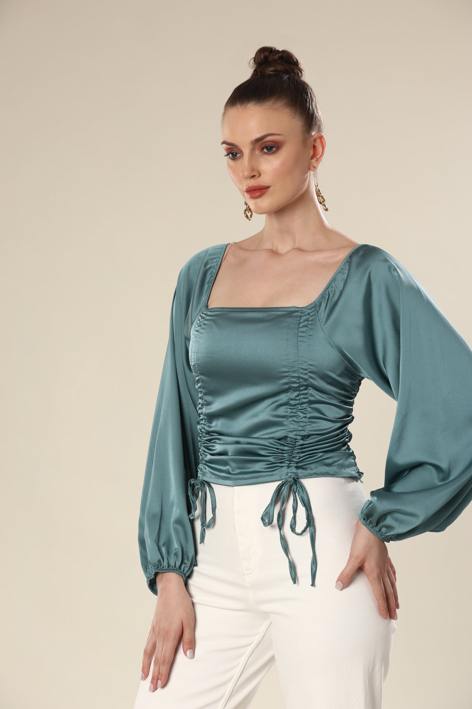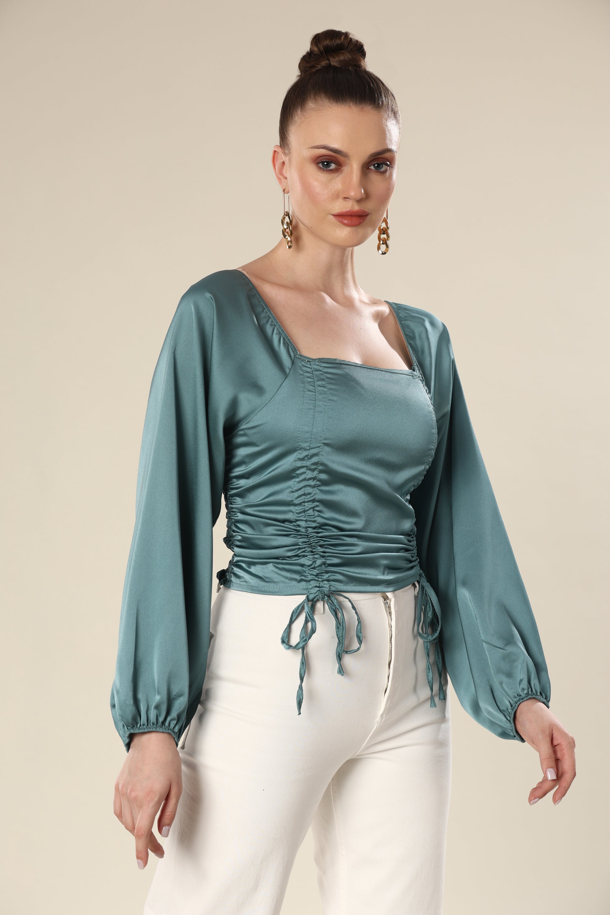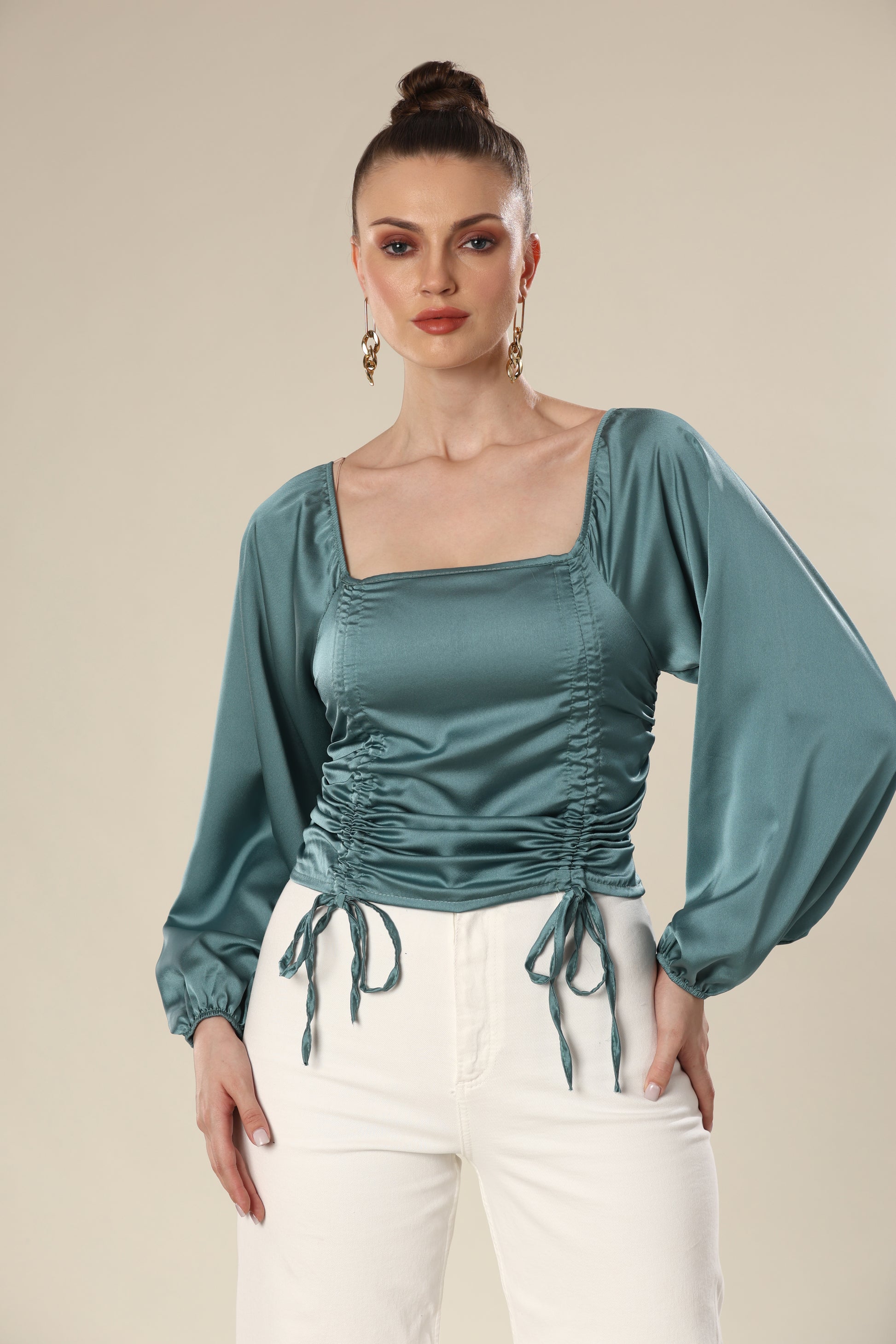 The crop top is made of high-quality imitation satin, offering full wearing comfort. The top is fitted cut, has a straight neckline and elastic around the shoulders. The sleeves are long and loose. With length adjustment laces at the front.