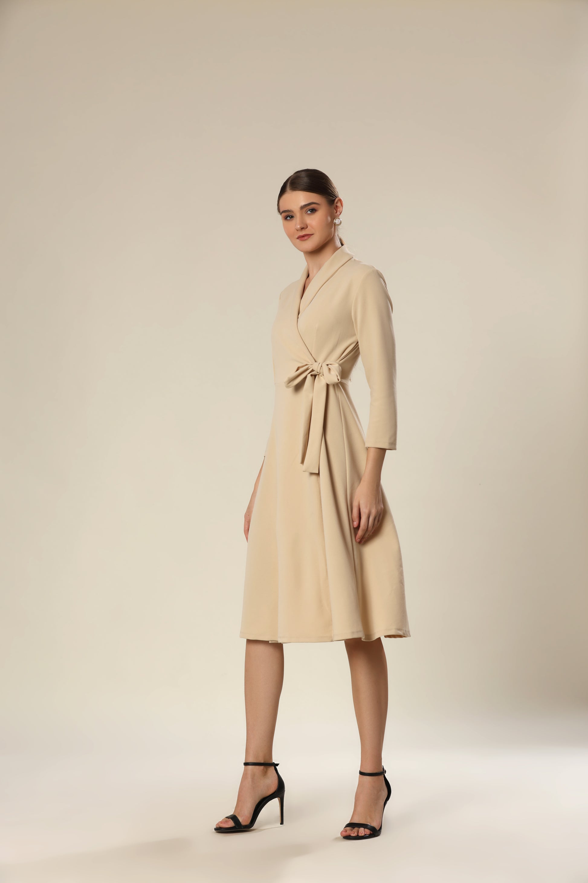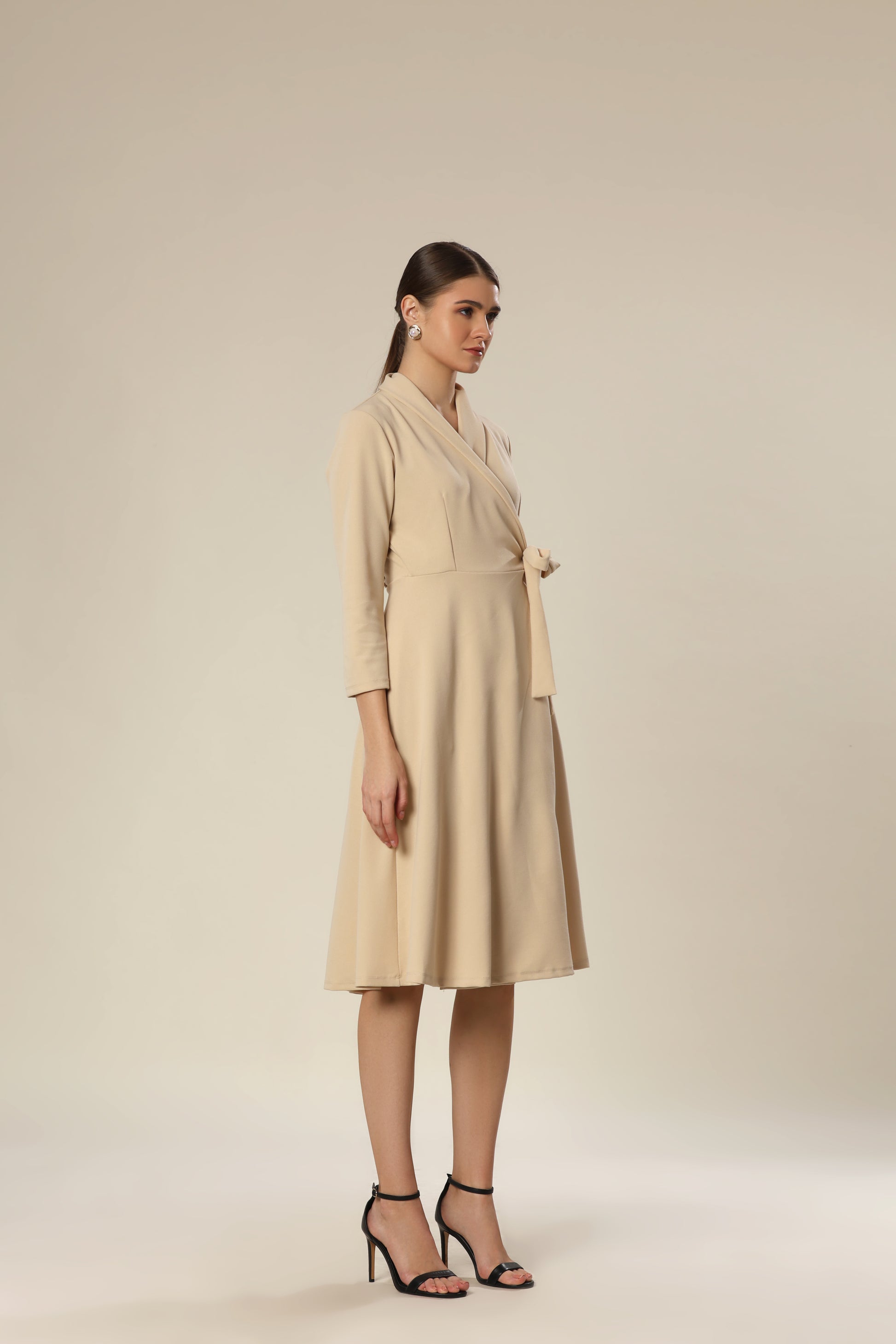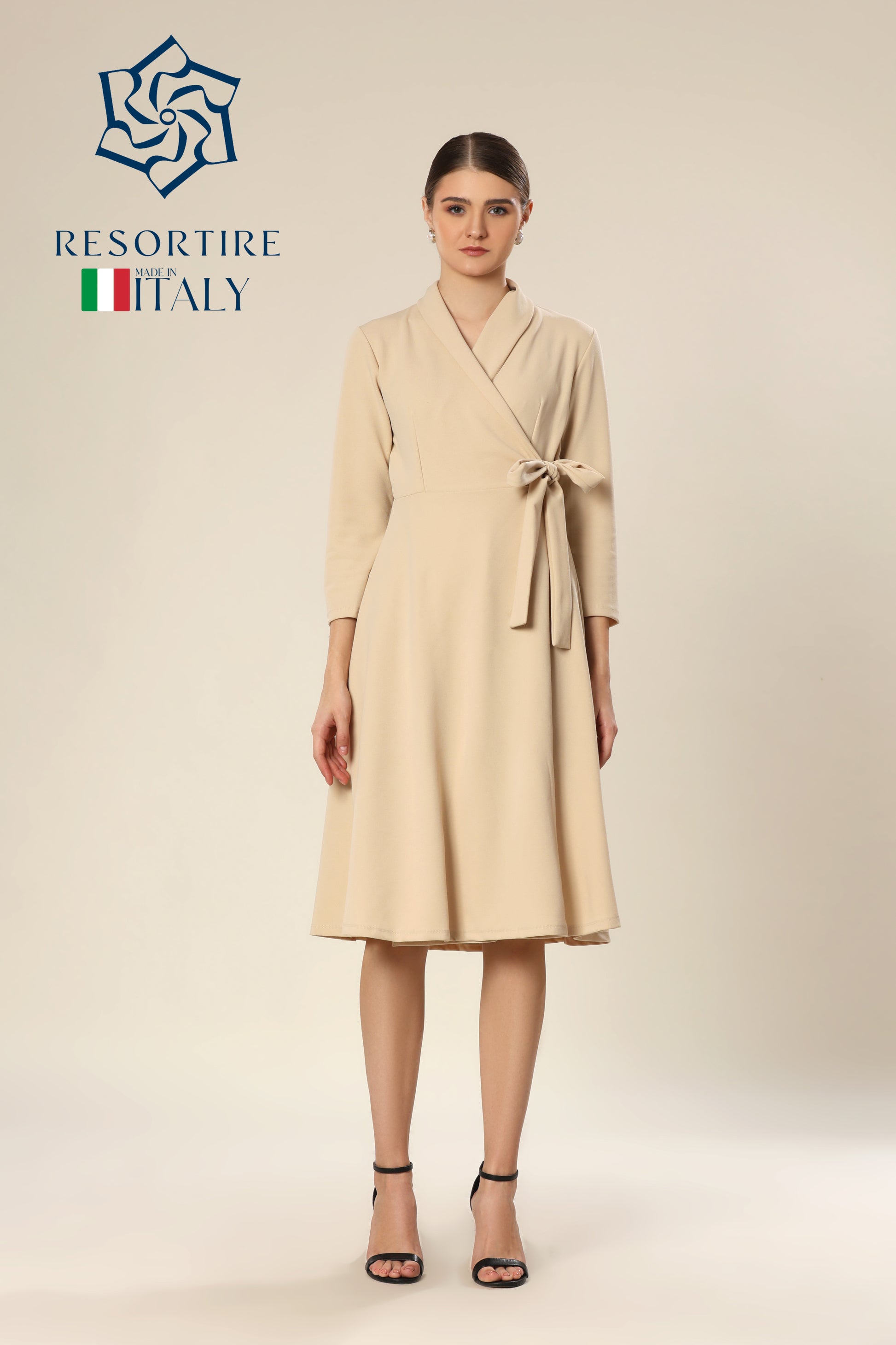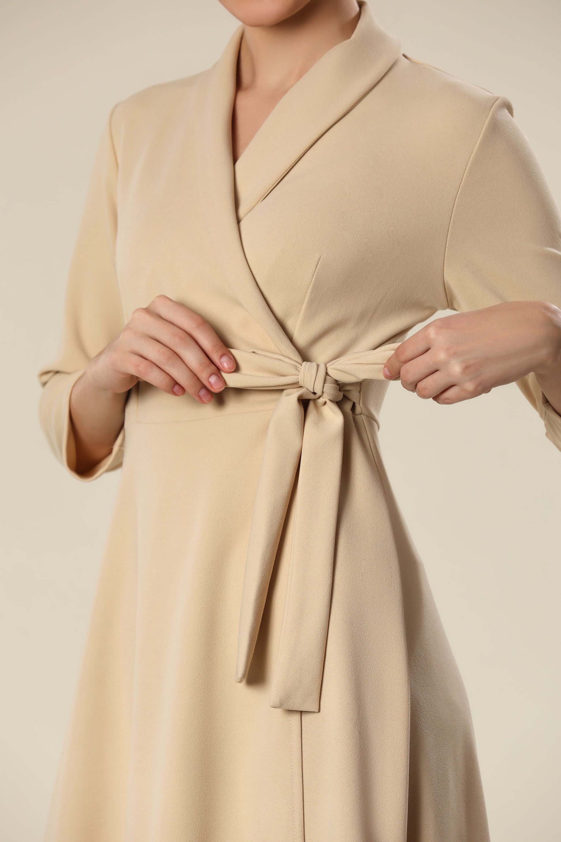 The dress has a tight fit and is made of soft and elastic high quality fabric, which ensures complete wearing comfort. The dress has belt to tie at the waist and a folded collar. It has a 3/4 sleeve and a deep "V" neckline. The skirt is loose and has a mid-thigh length