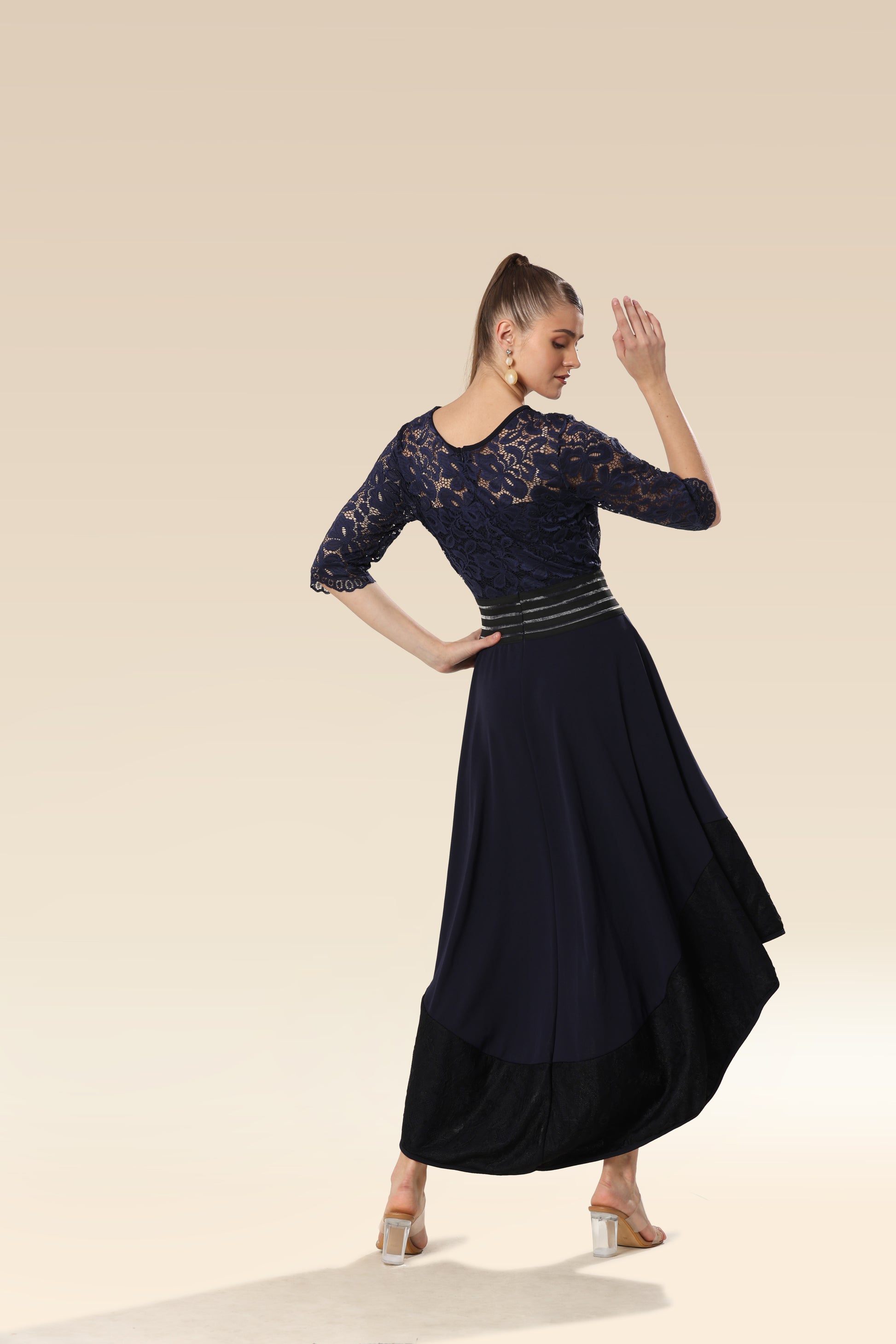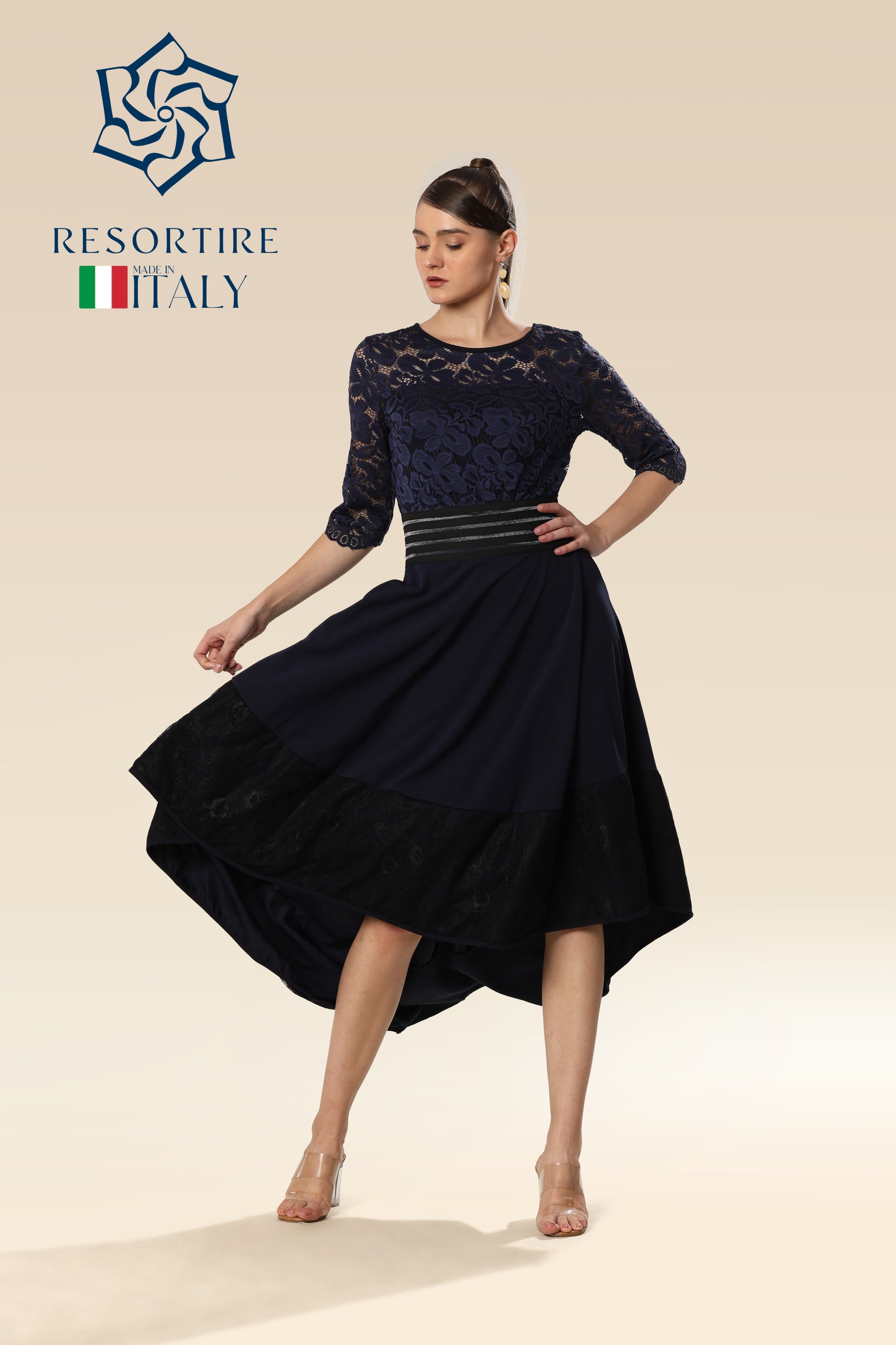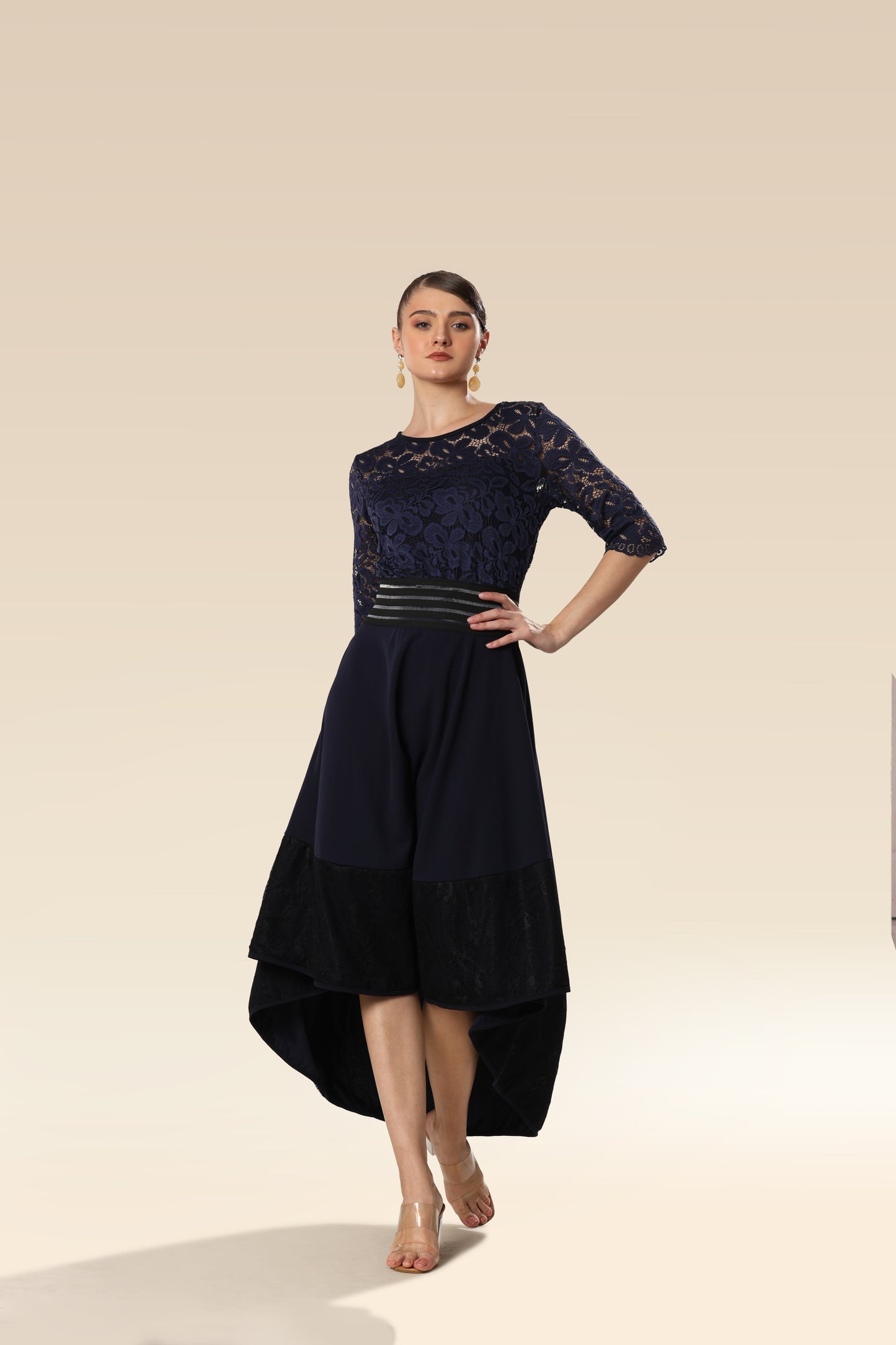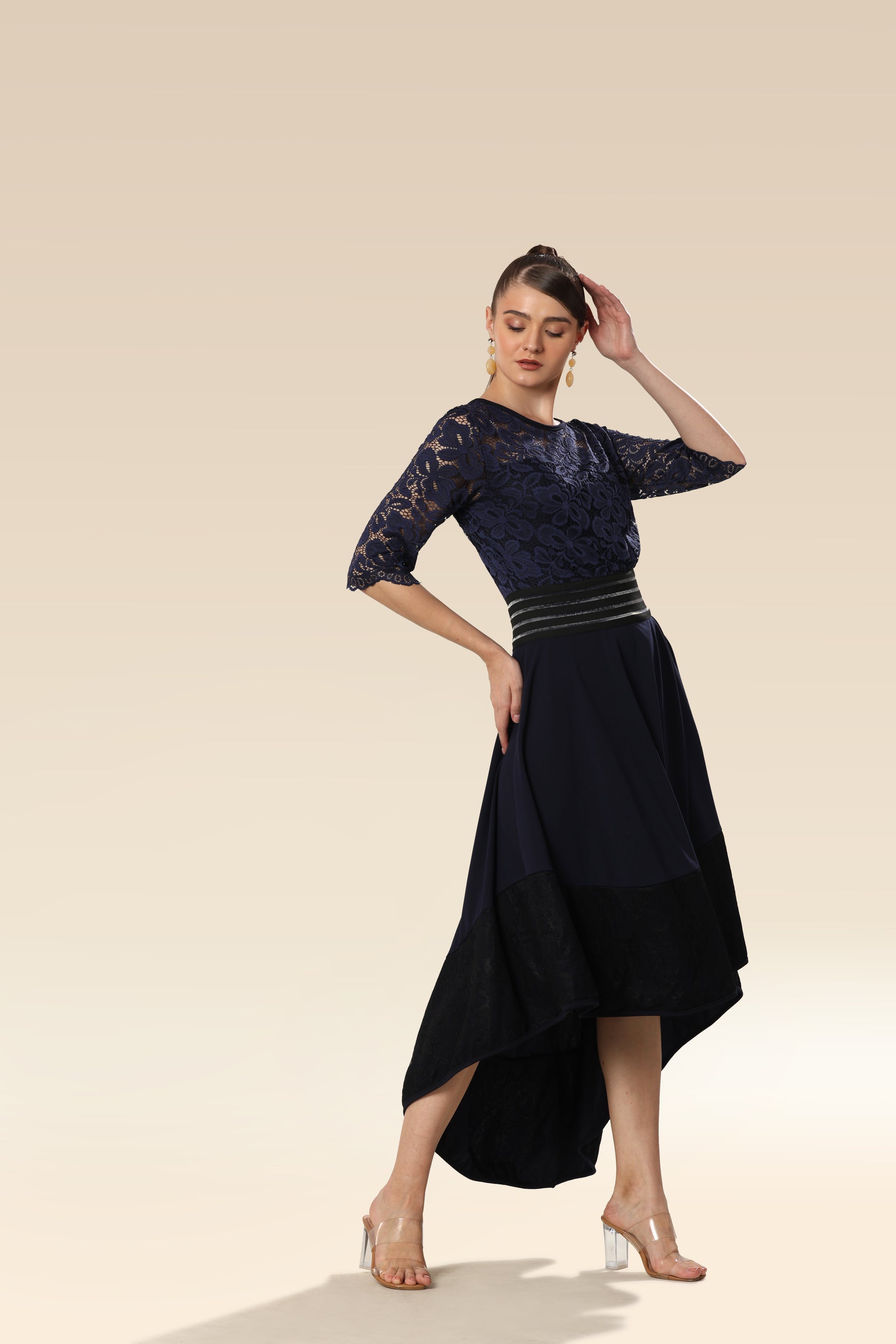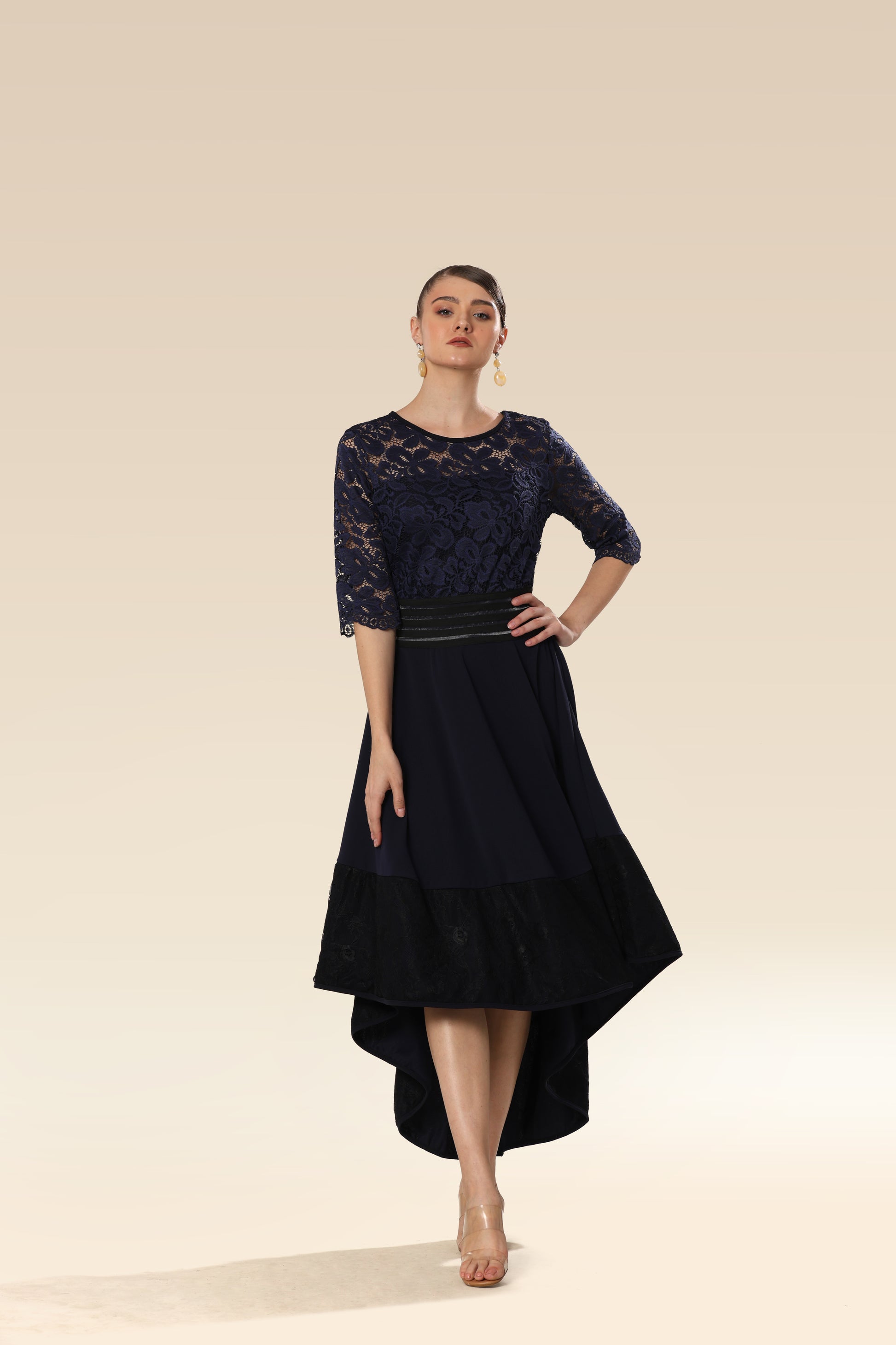 Machine washable. Round neck. Tight at the waist. Sheer 3/4 sleeves. The asymmetric length of the skirt is finished with beautiful lace. Lace top and sleeves. Zip closure on the back. Fashion accessories are not included with the dress.