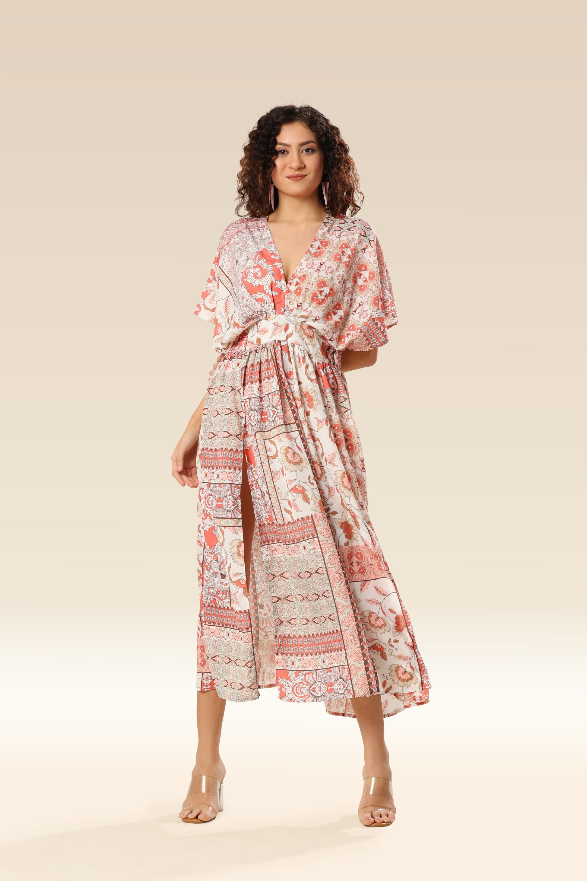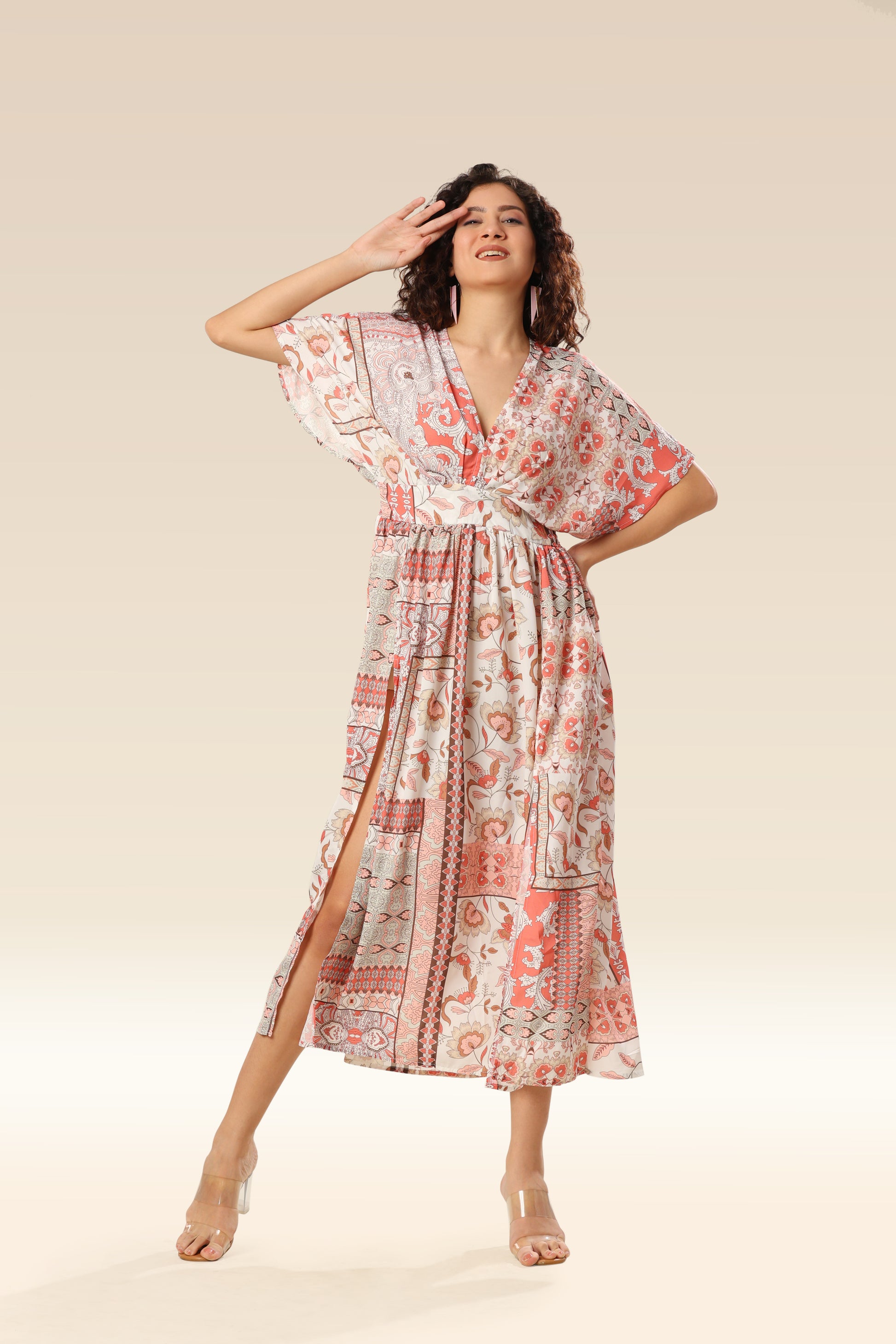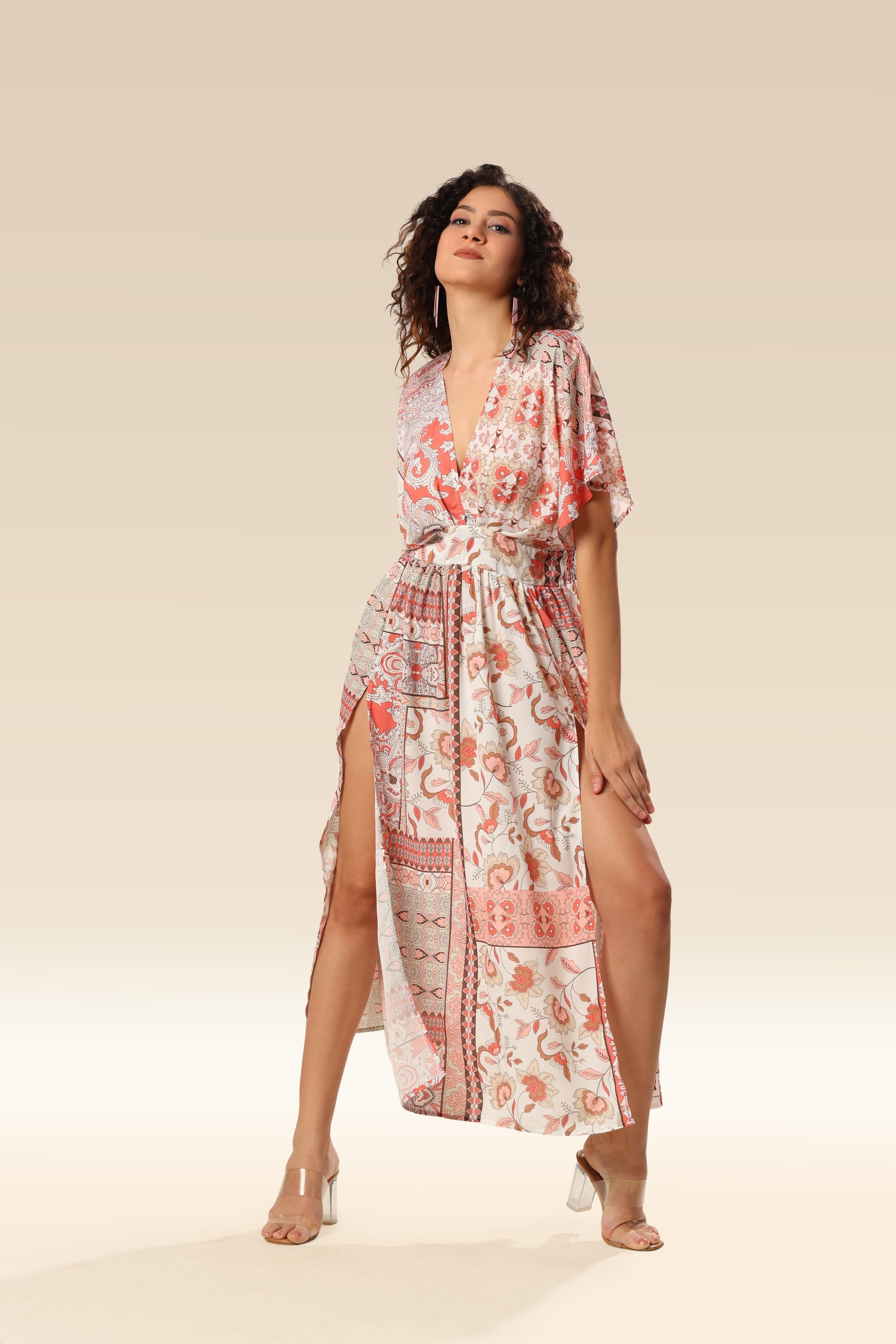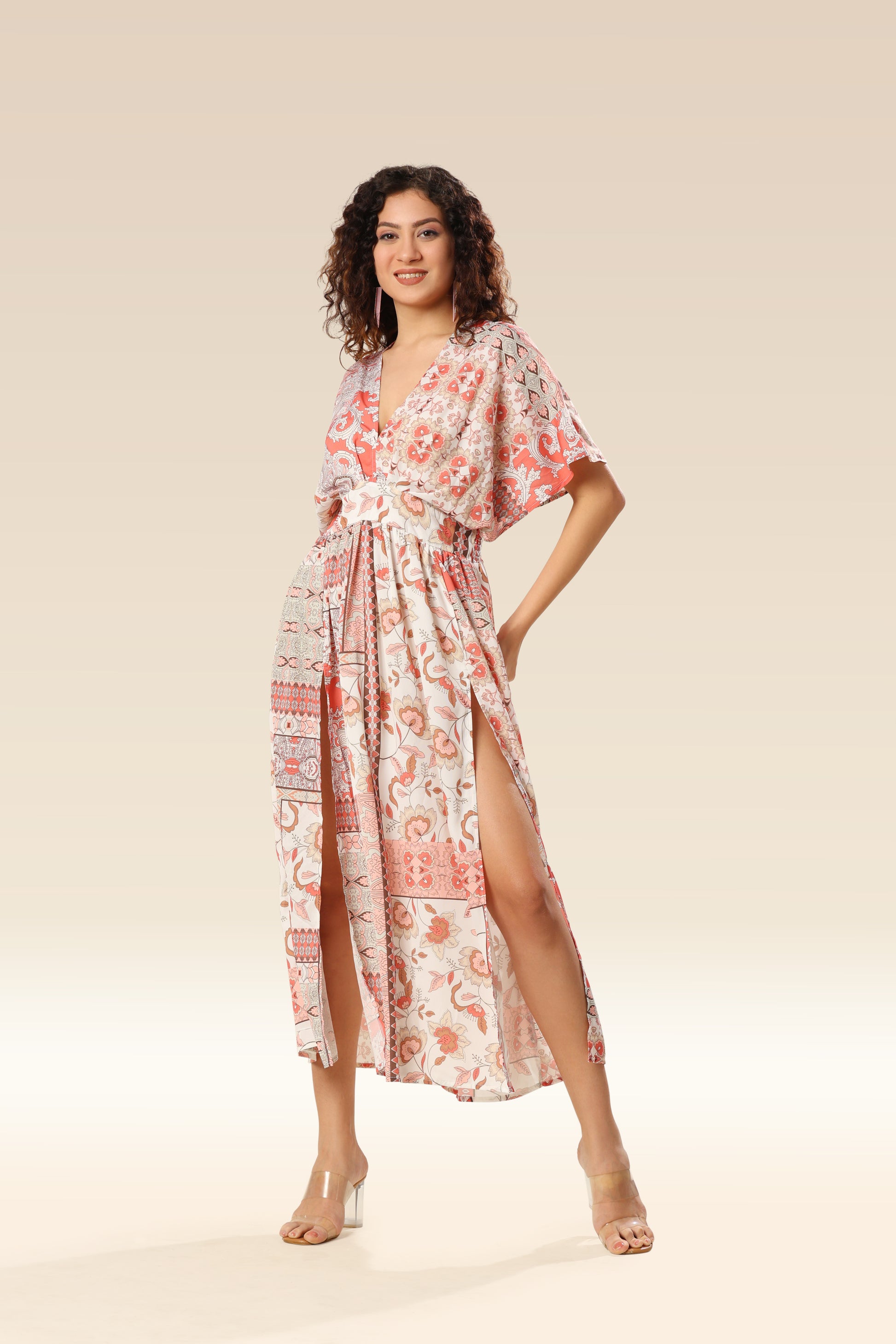Boho print deep V-Kimono sleeves each dress with split .