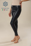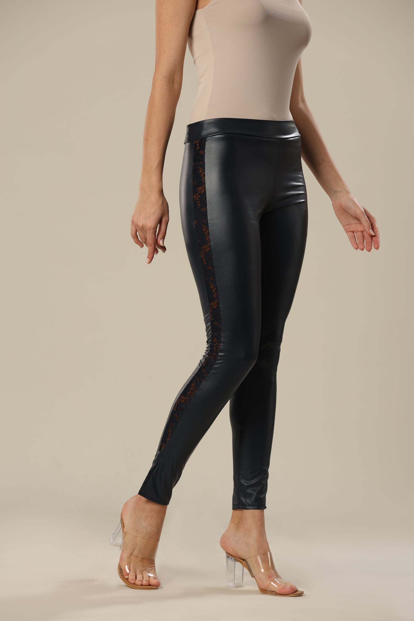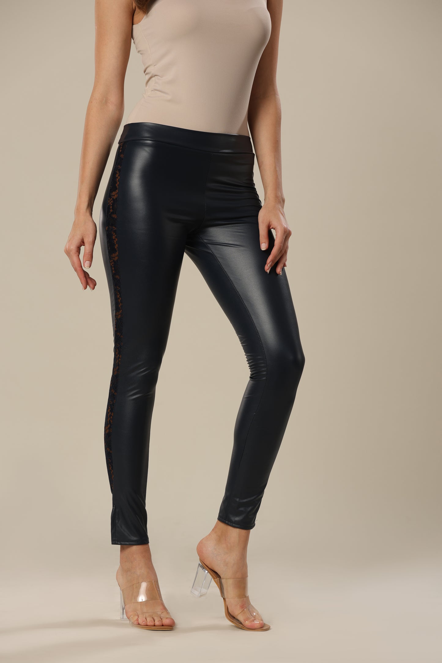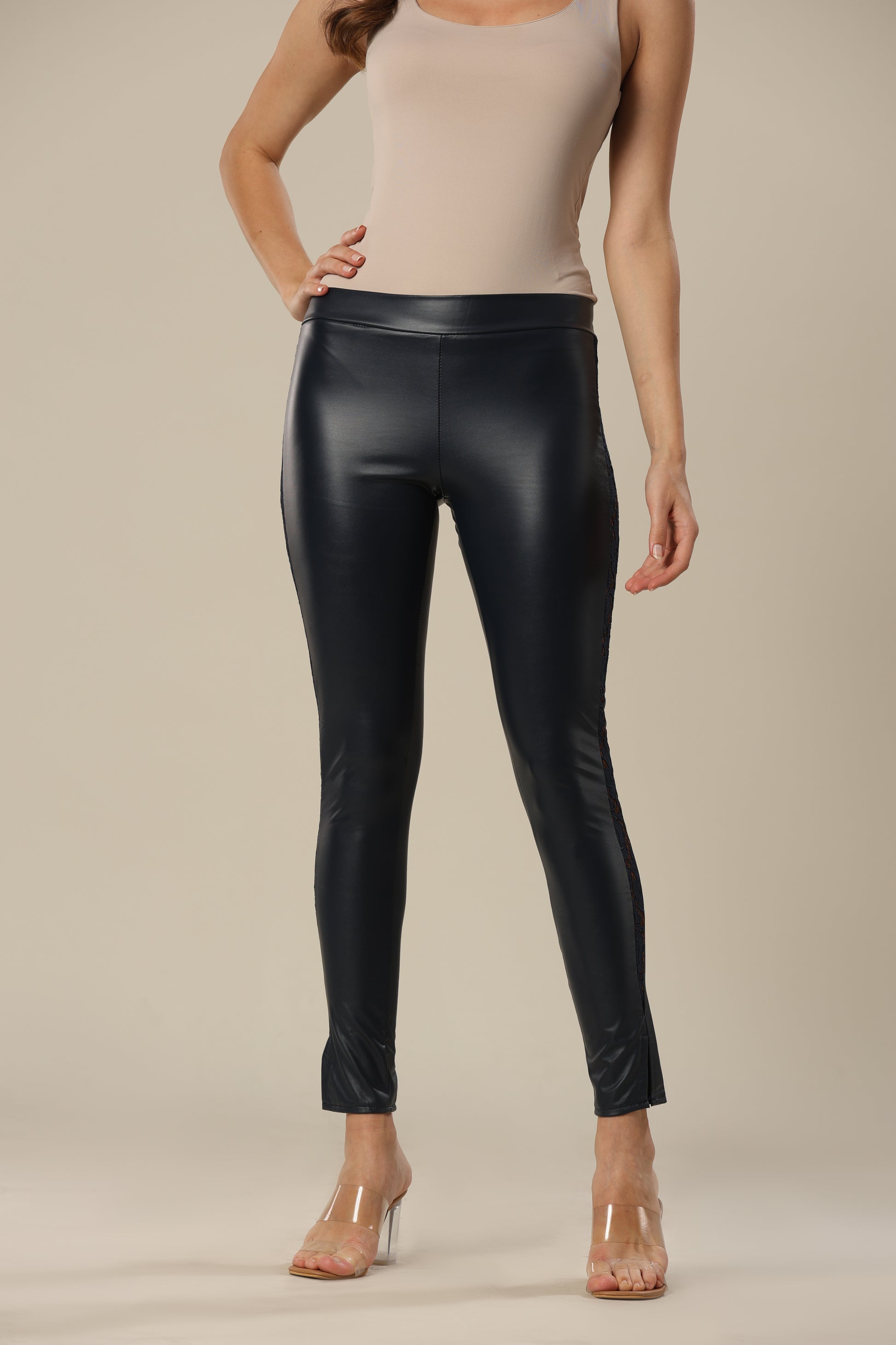 The stylish faux leather leggings are made of high-quality and comfortable fabric that offers total wearing comfort. The leggings have a high waist, lined lace detail on the sides and a metal zipper at the back.