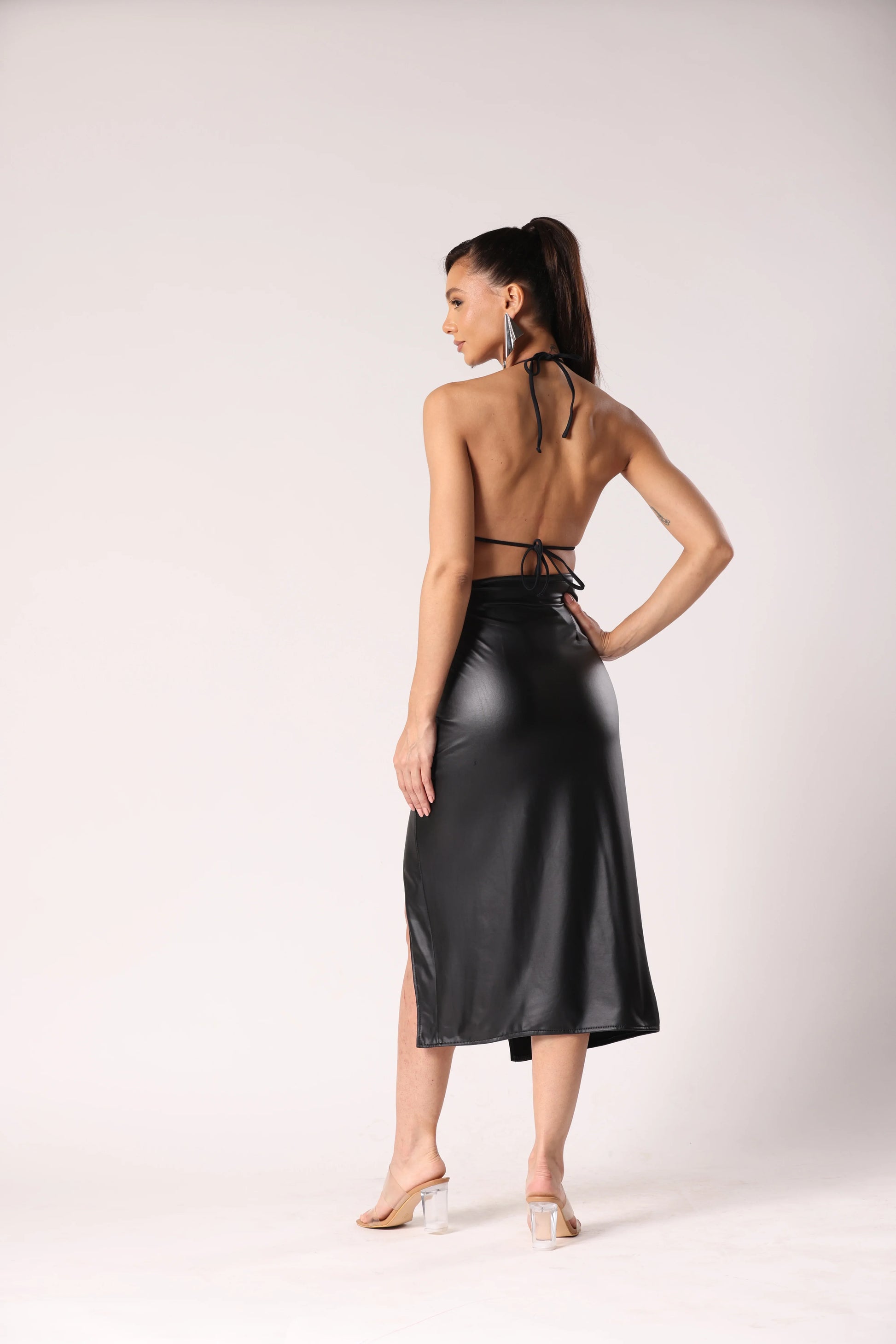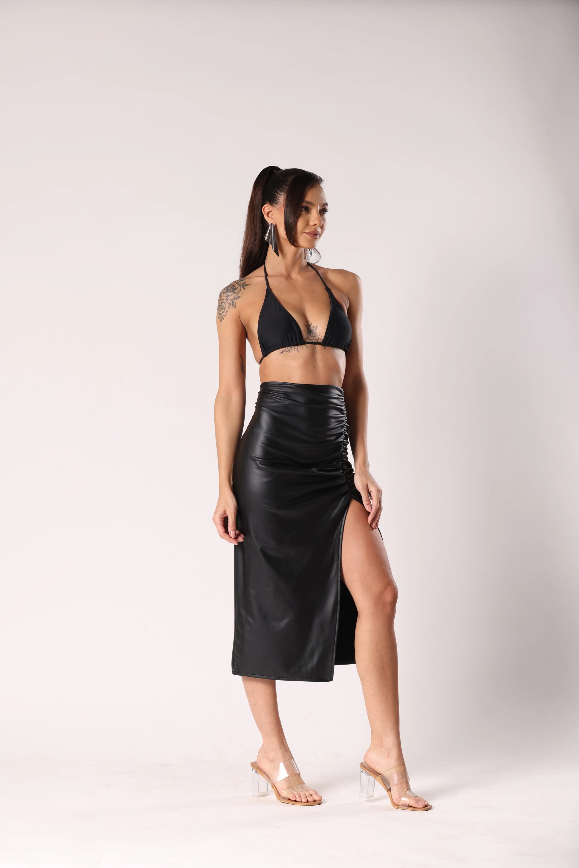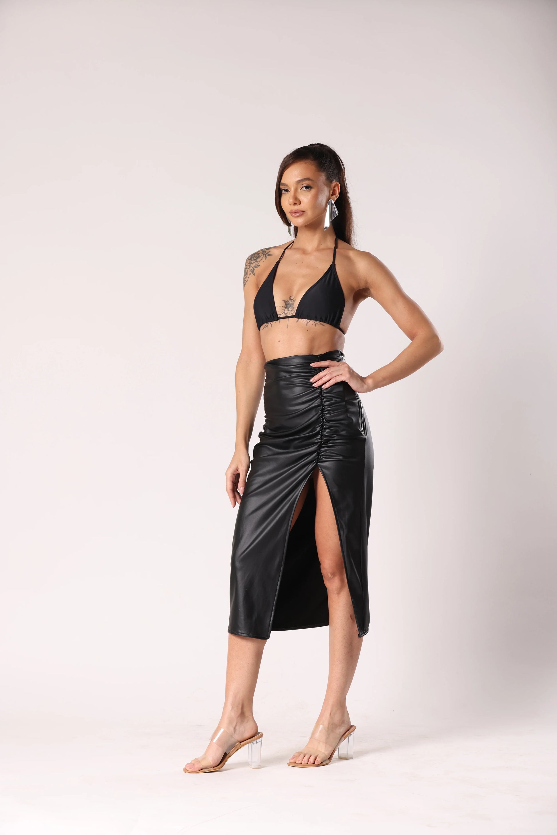 The slim fit midi skirt is made of high-quality faux leather, offering total wearing comfort. The skirt is made of gathered fabric in the front part, it has a high waist and a fashionable opening. On the side it closes with a metal zipper.