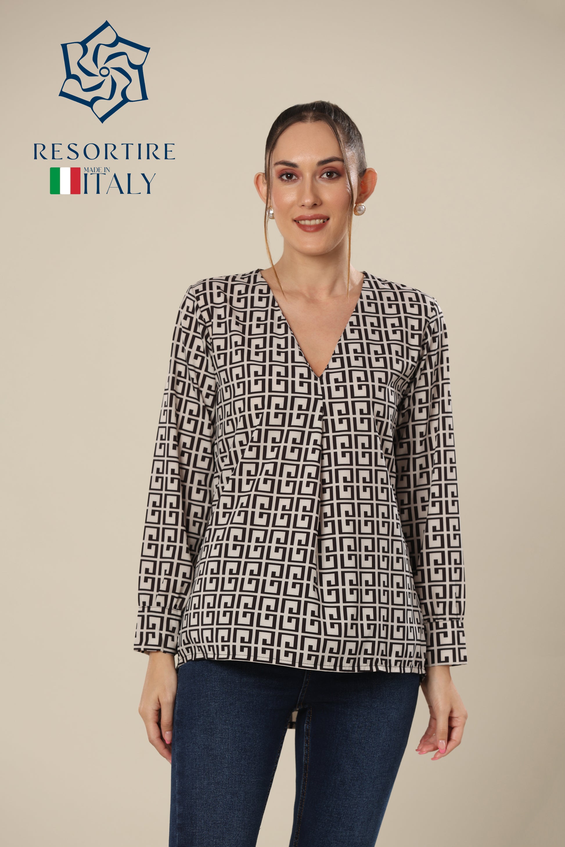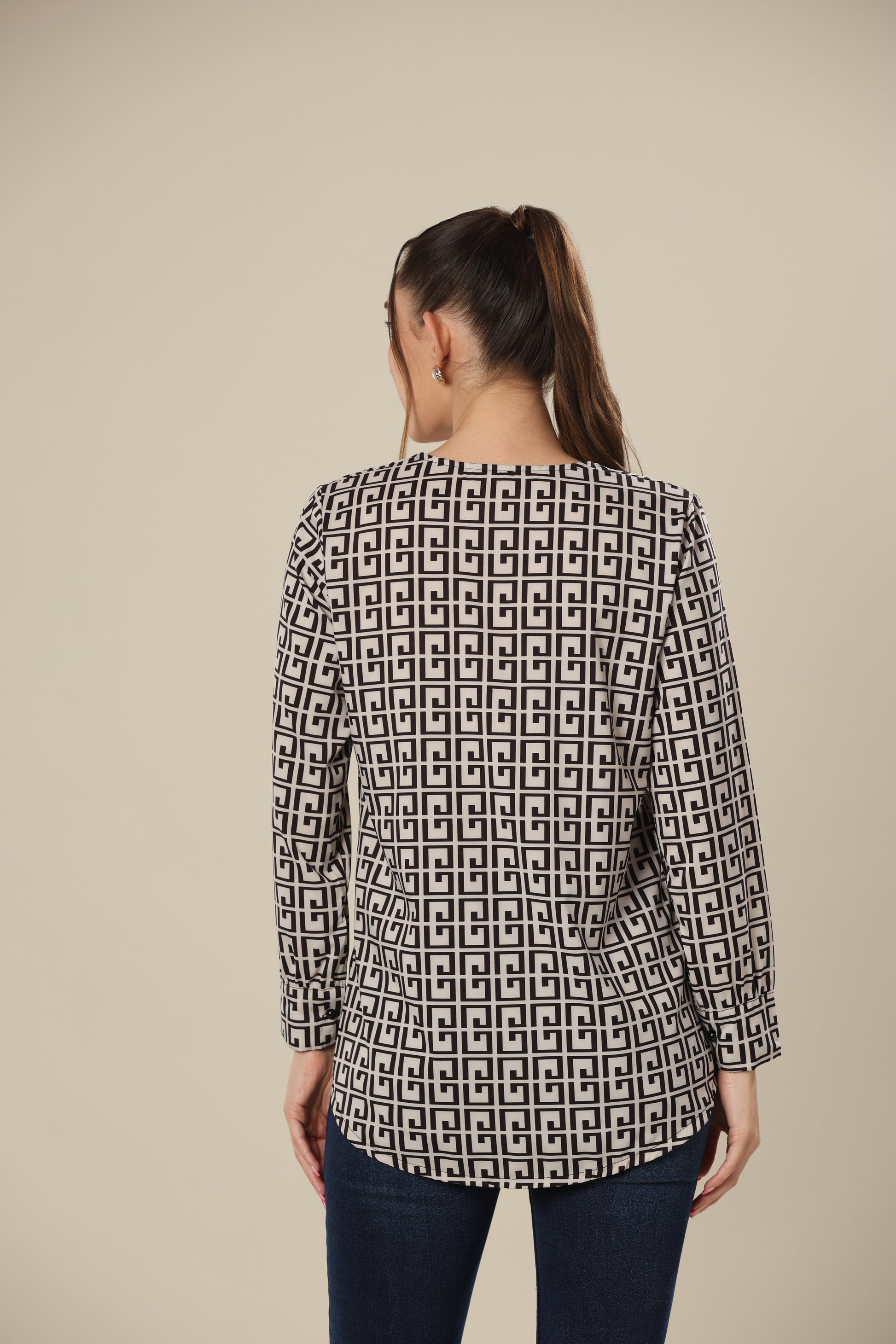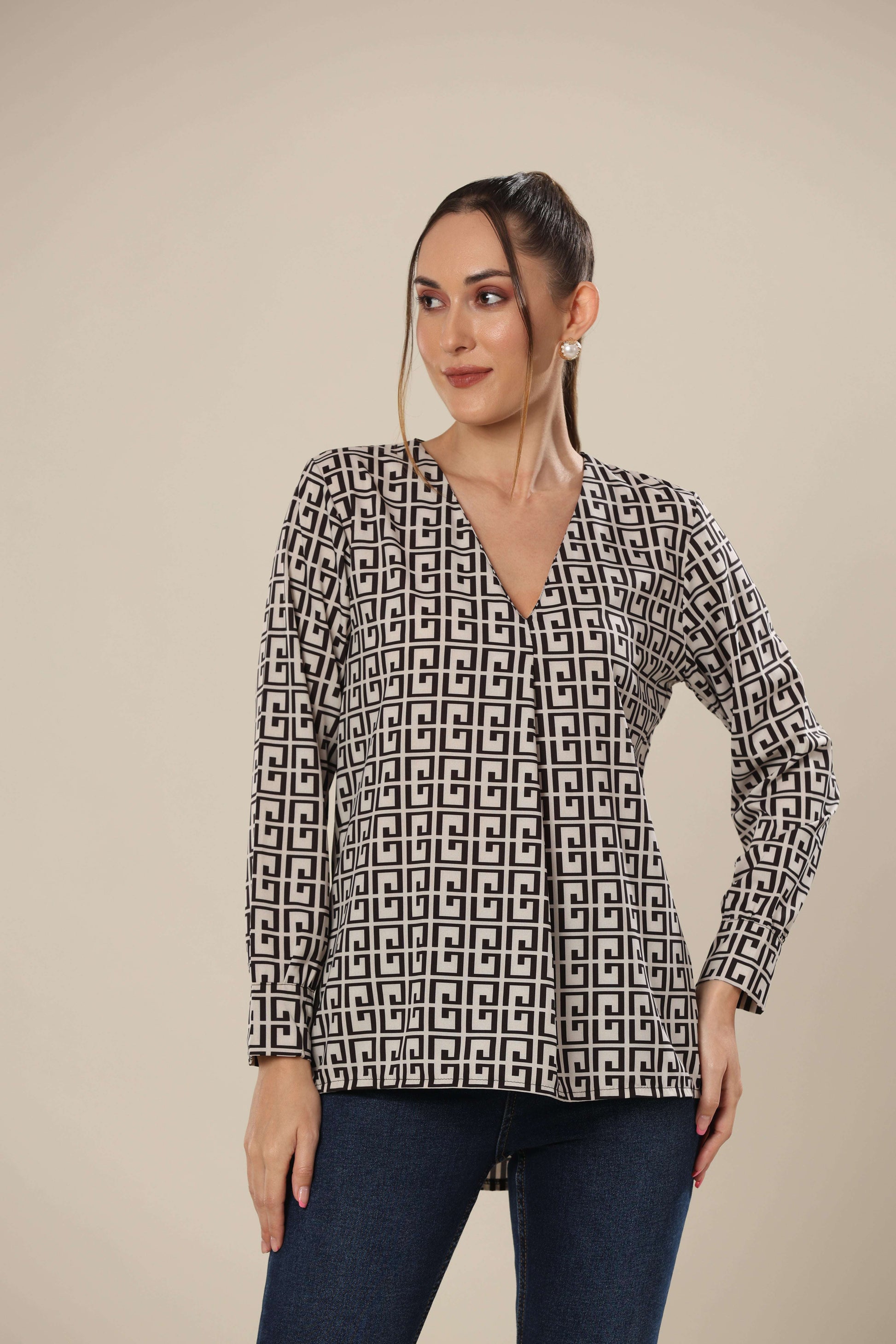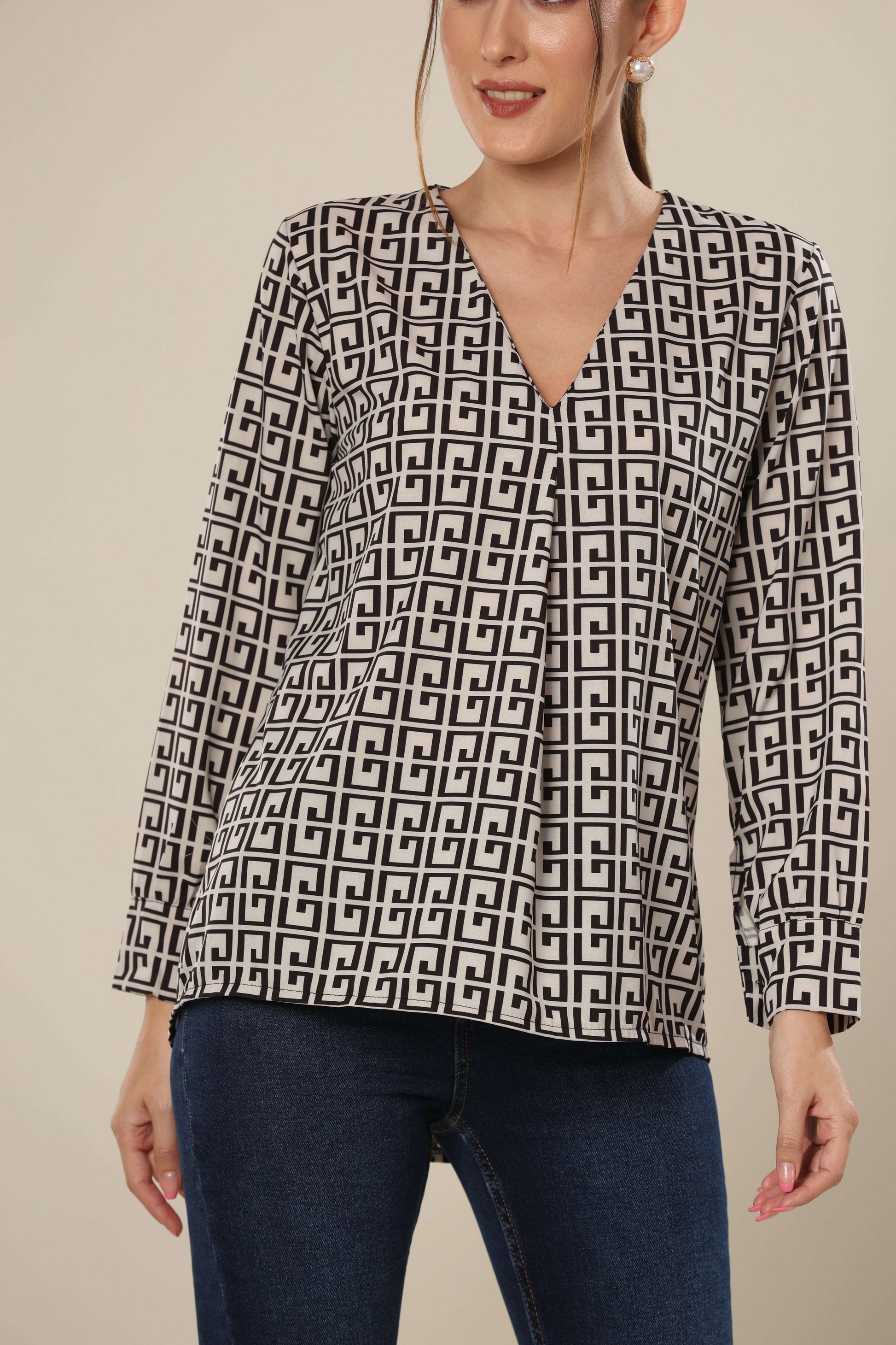 The Top is made of high-quality faux satin, offering total comfort. The trendy geometric print Top has a "V" neckline and long sleeves.