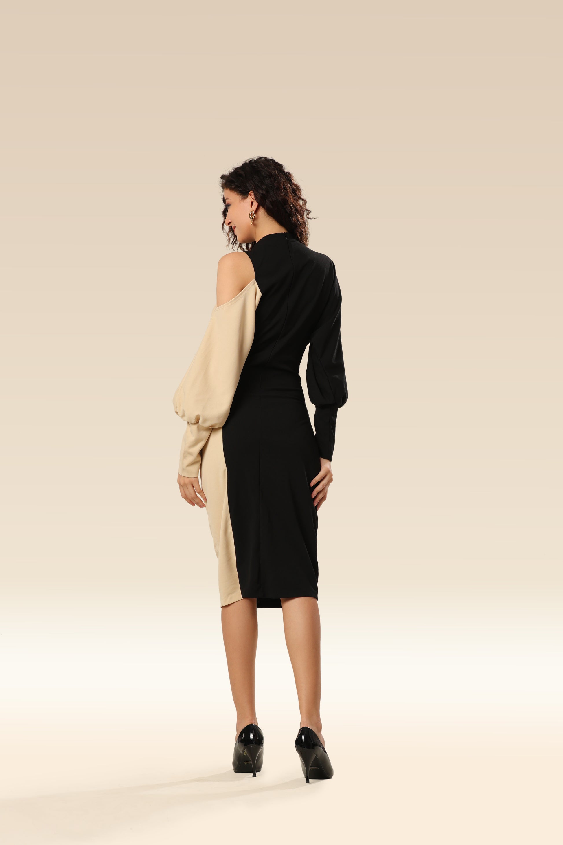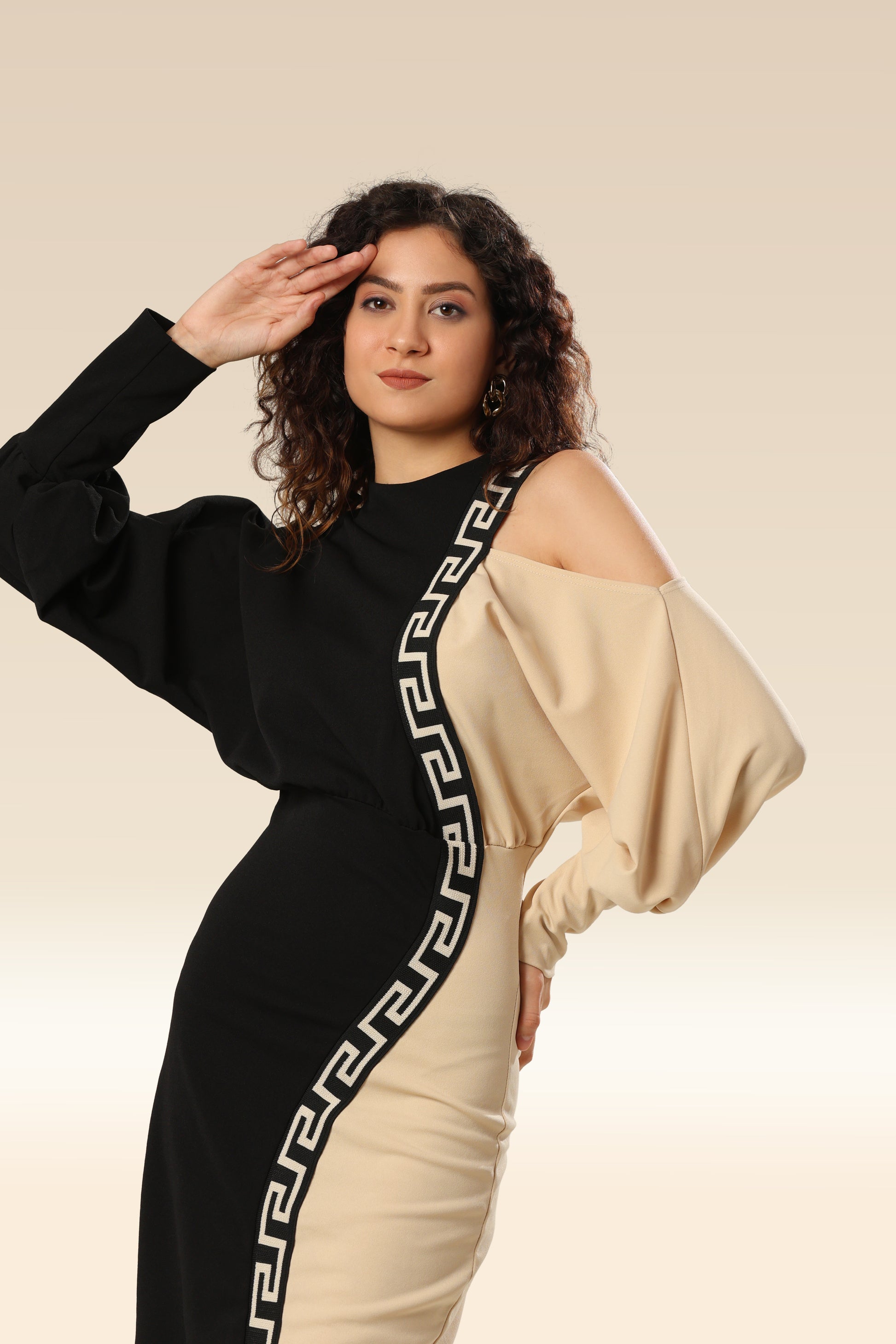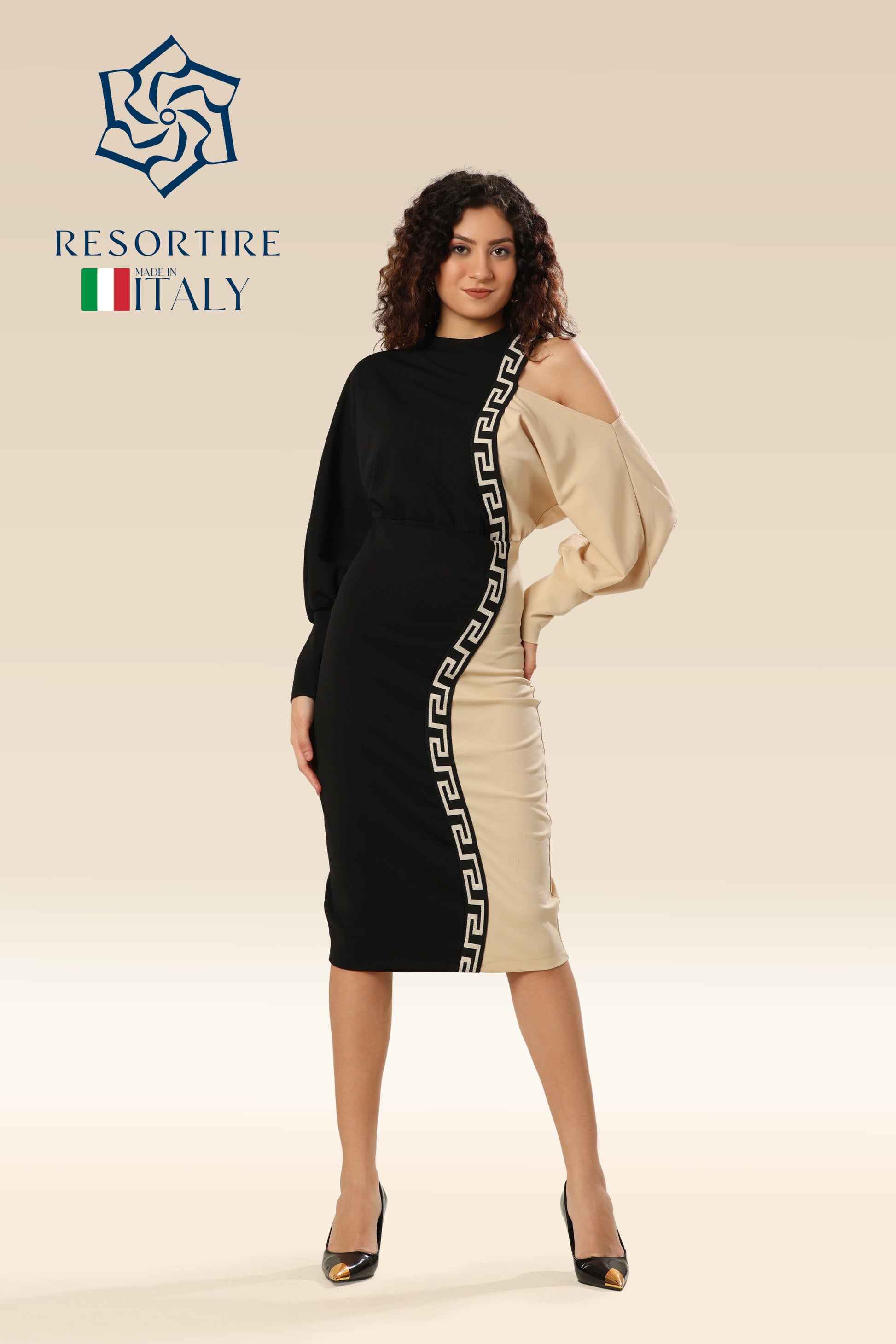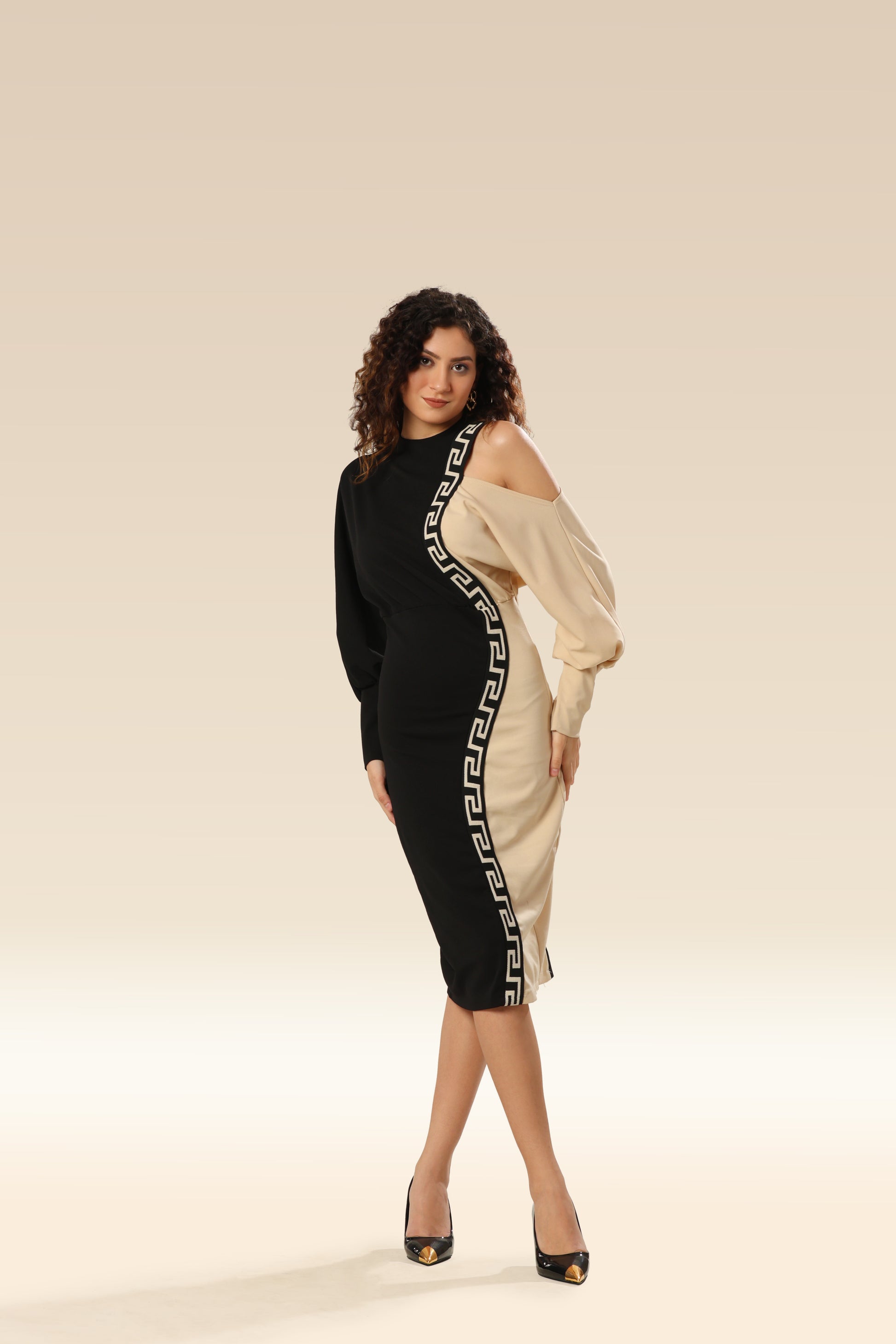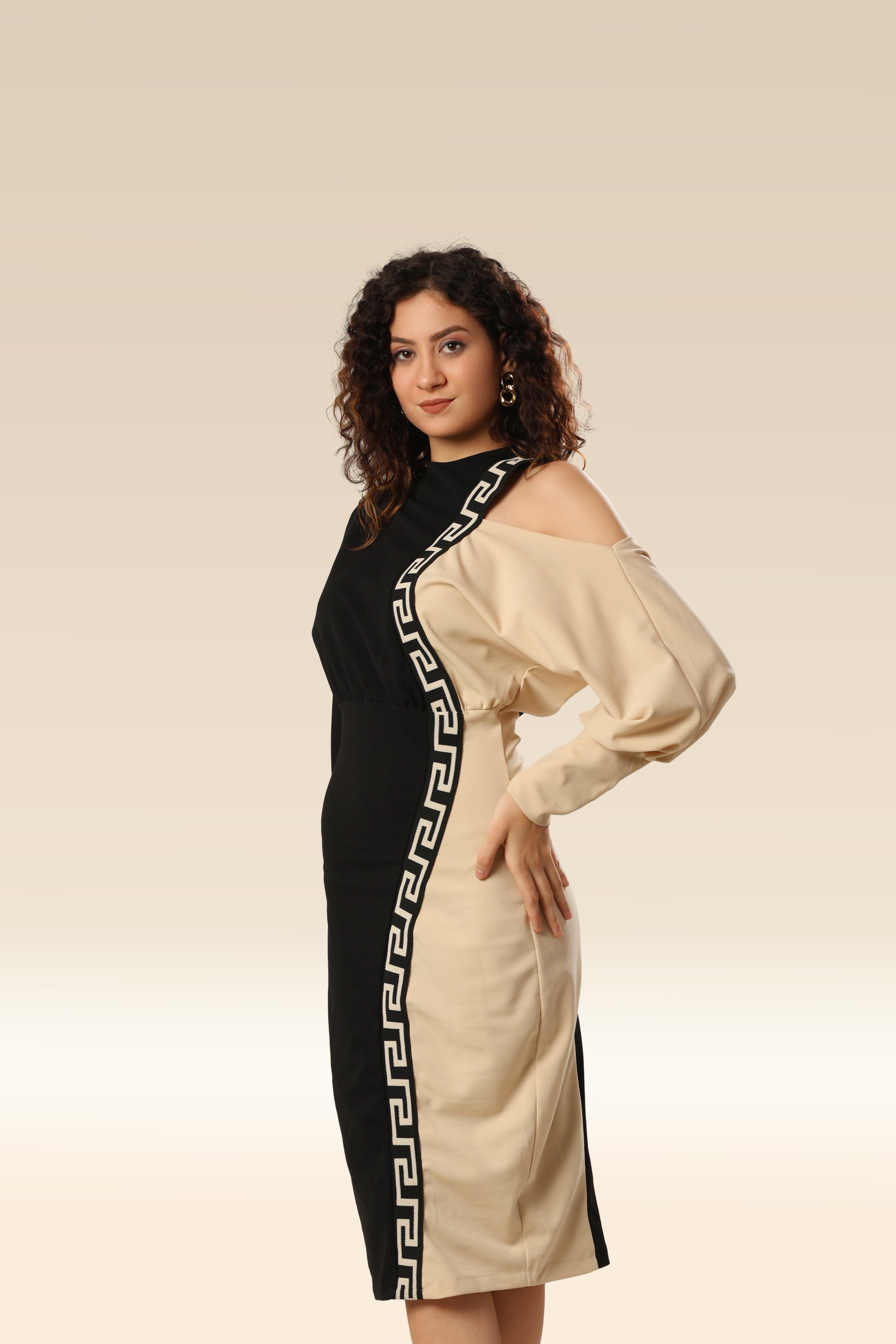 The midi dress is made of high-quality, soft, compact fabric that offers perfect wearing comfort. The geometric print dress has a loose fit top, off the shoulder and a high neckline. The skirt is fitted and reaches the knees.