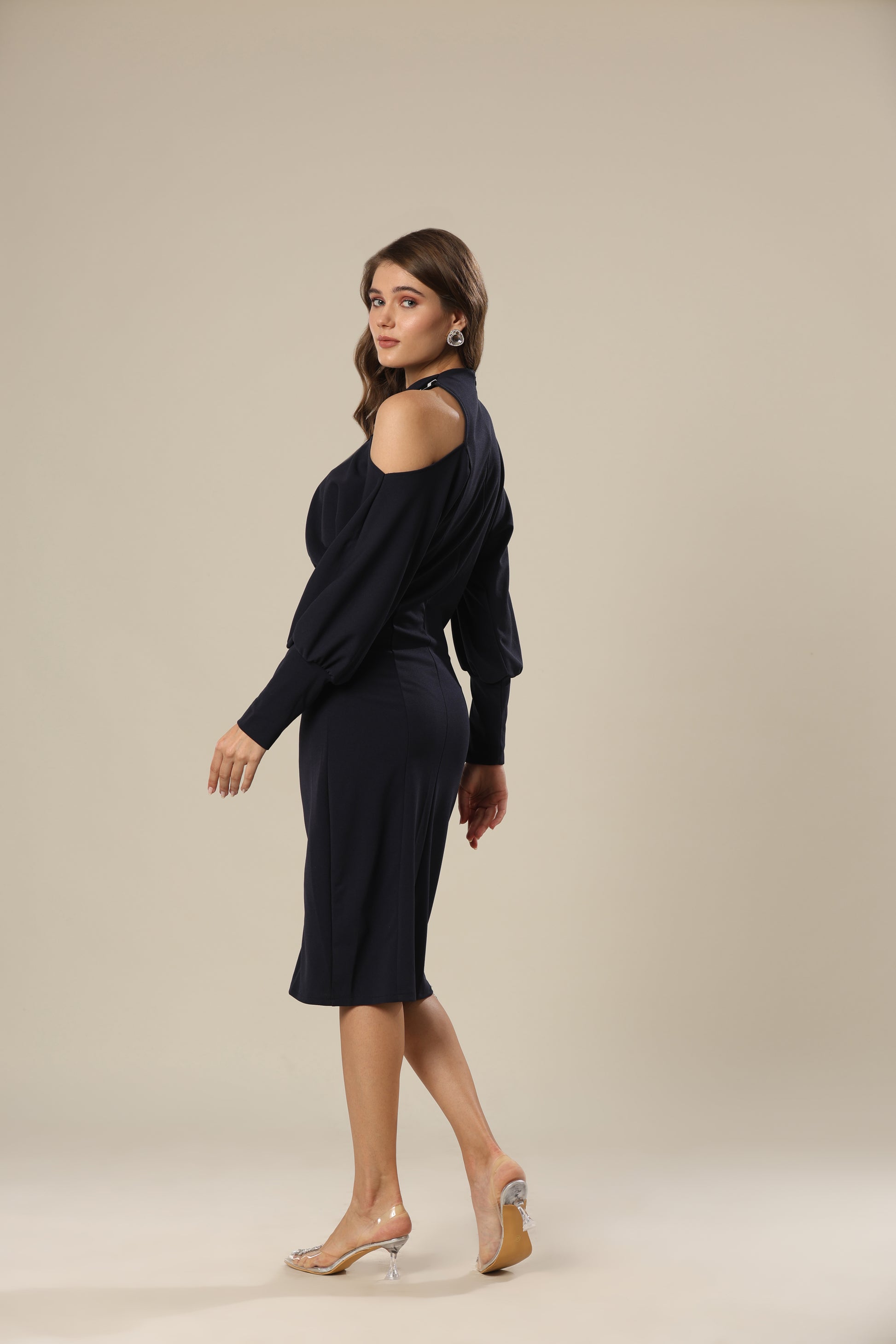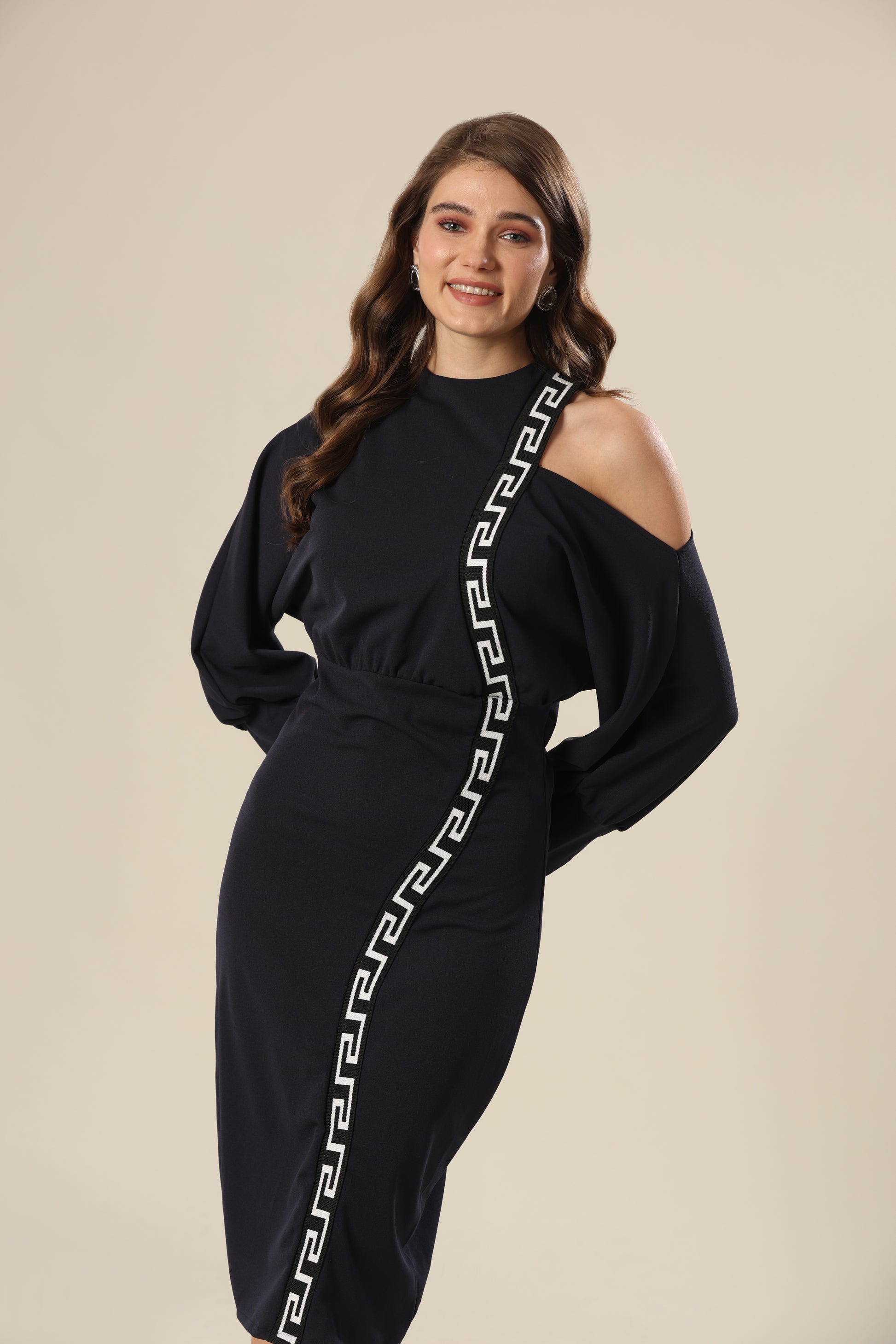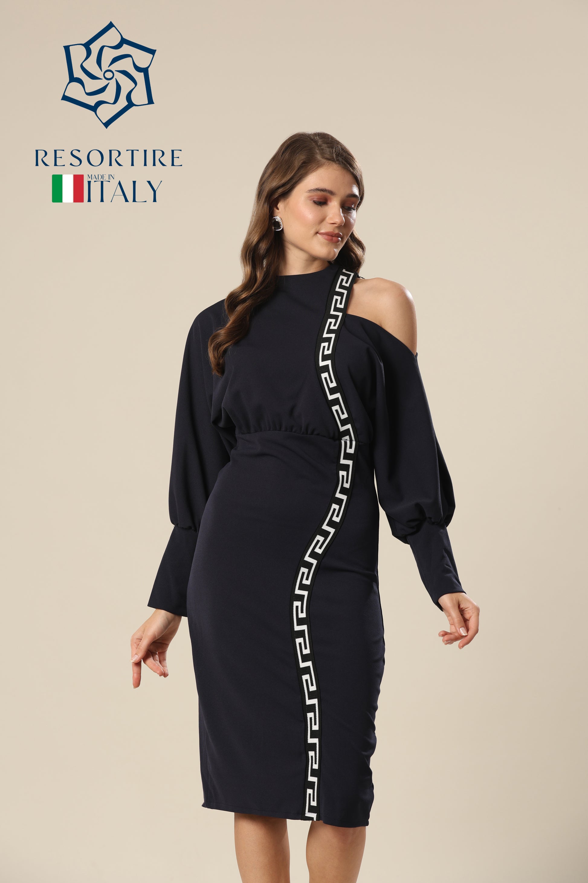 The midi dress is made of high-quality, soft, compact fabric that offers perfect wearing comfort. The geometric print dress has a loose fit top, off the shoulder and a high neckline. The skirt is fitted and reaches the knees.