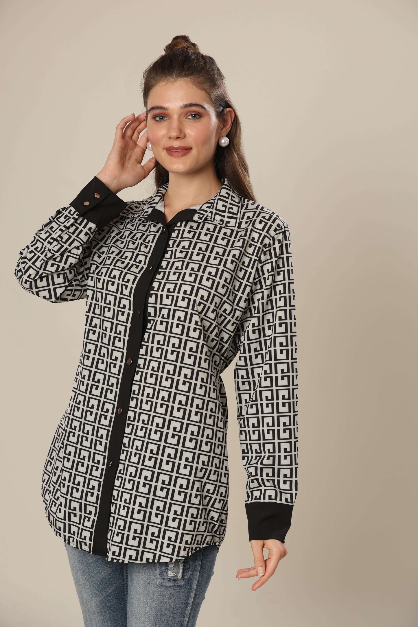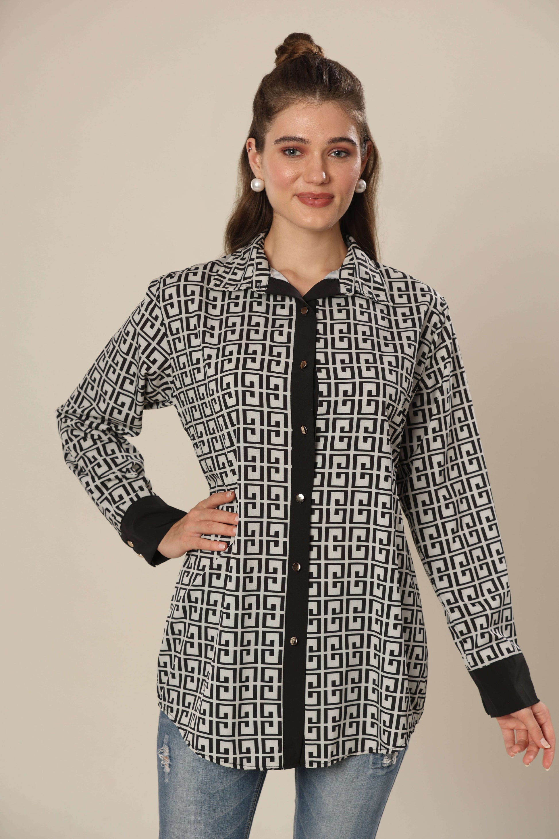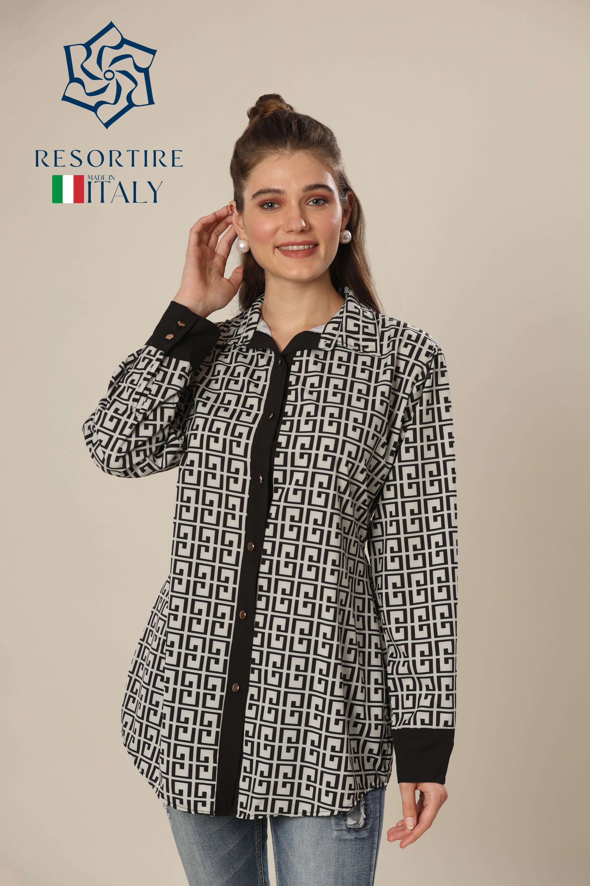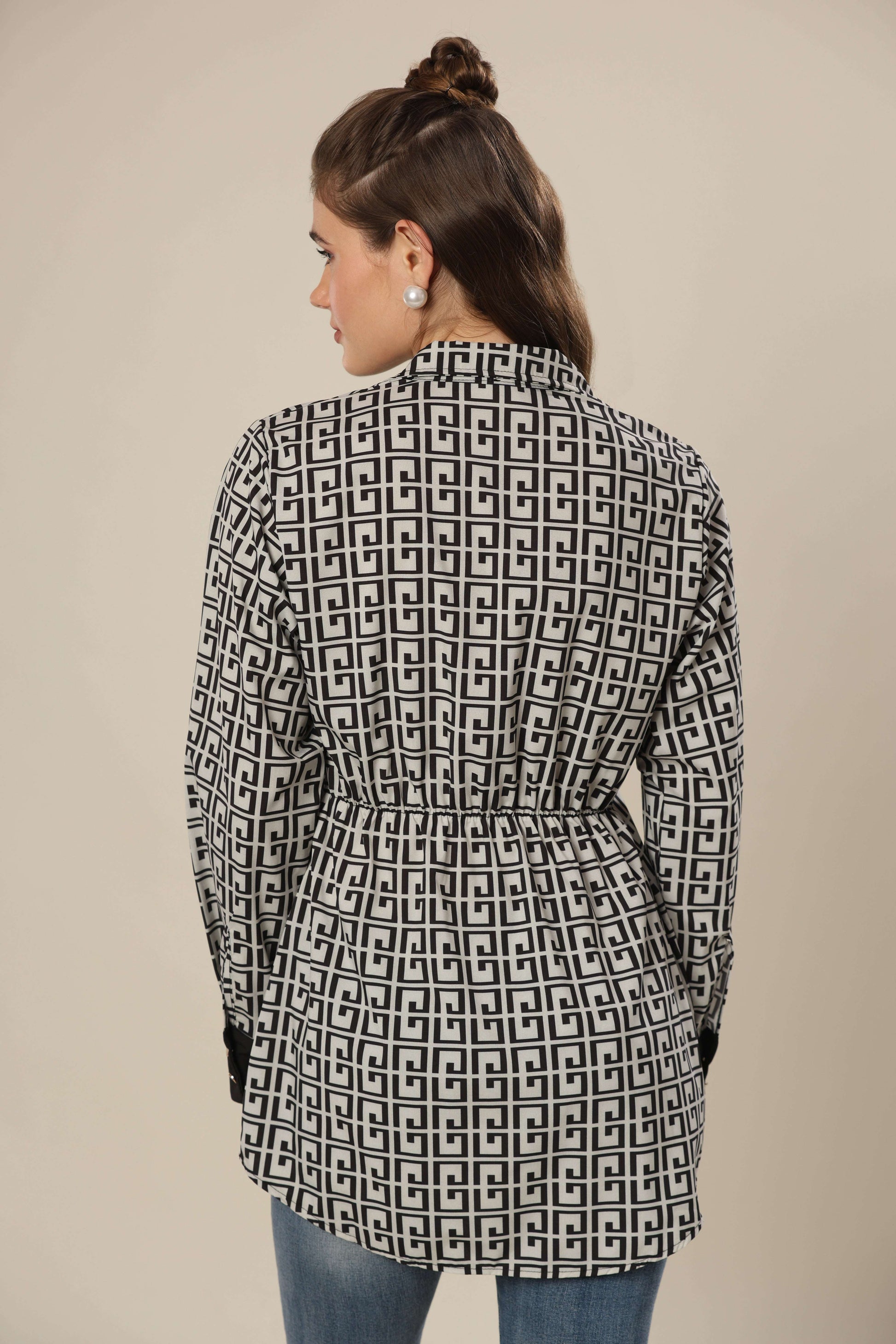 The geometric print mini shirt dress is made of high-quality imitation satin, which offers perfect comfort. The shirt dress has a classic collar, button fastenings at the front and long sleeves. Length to mid-thigh.