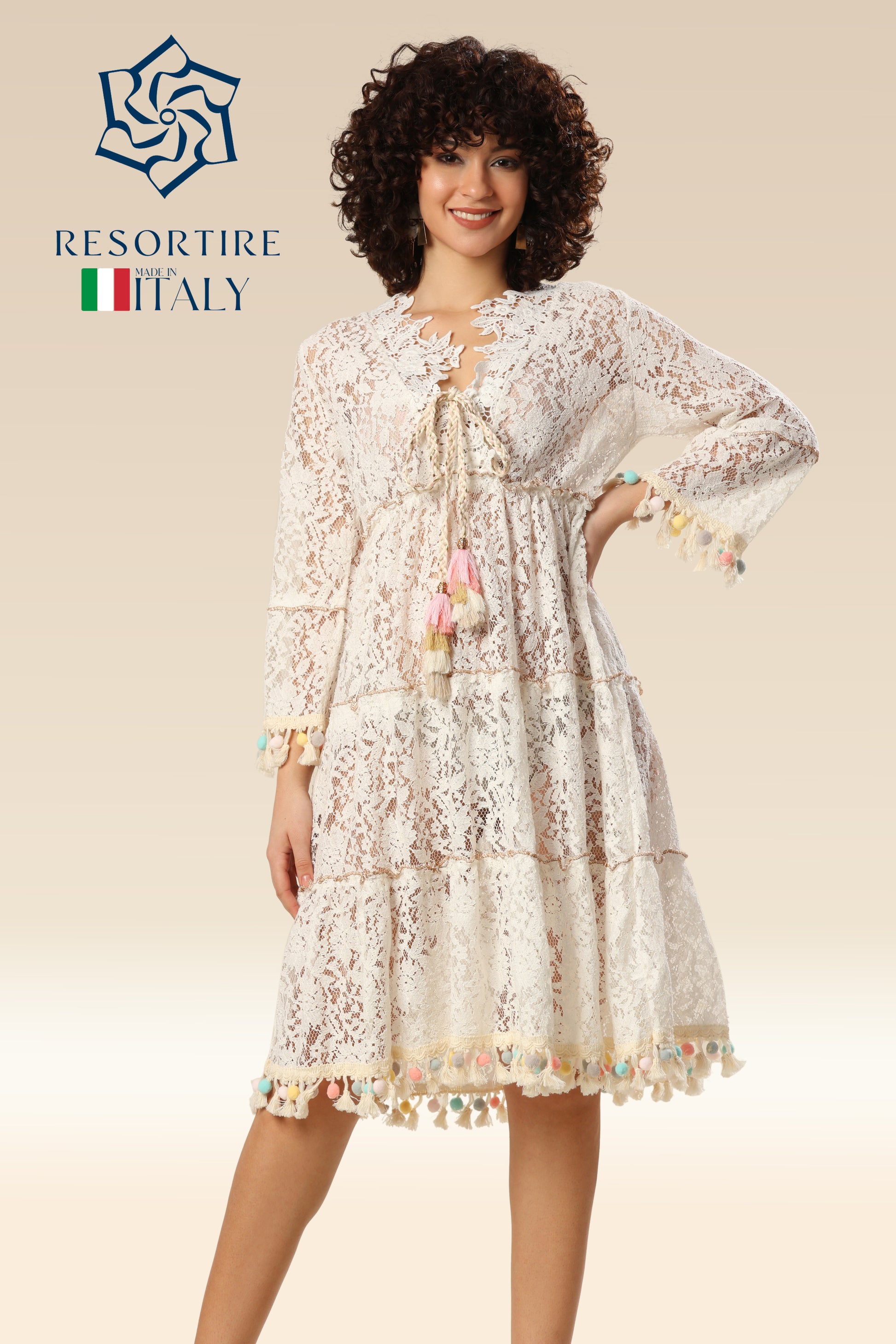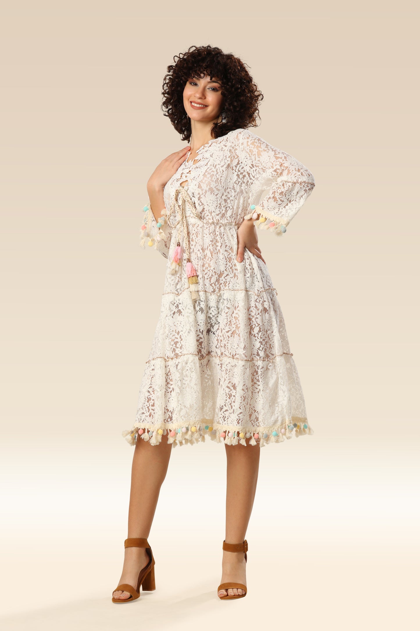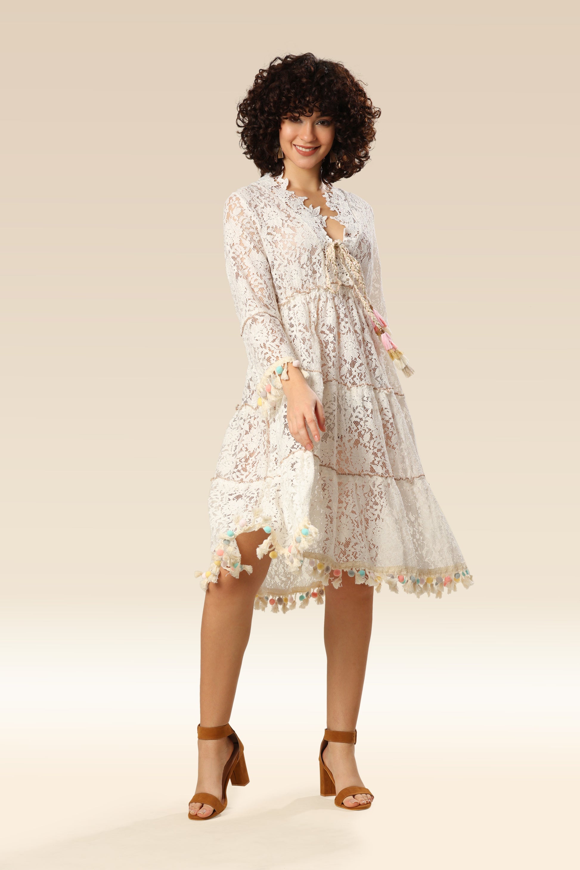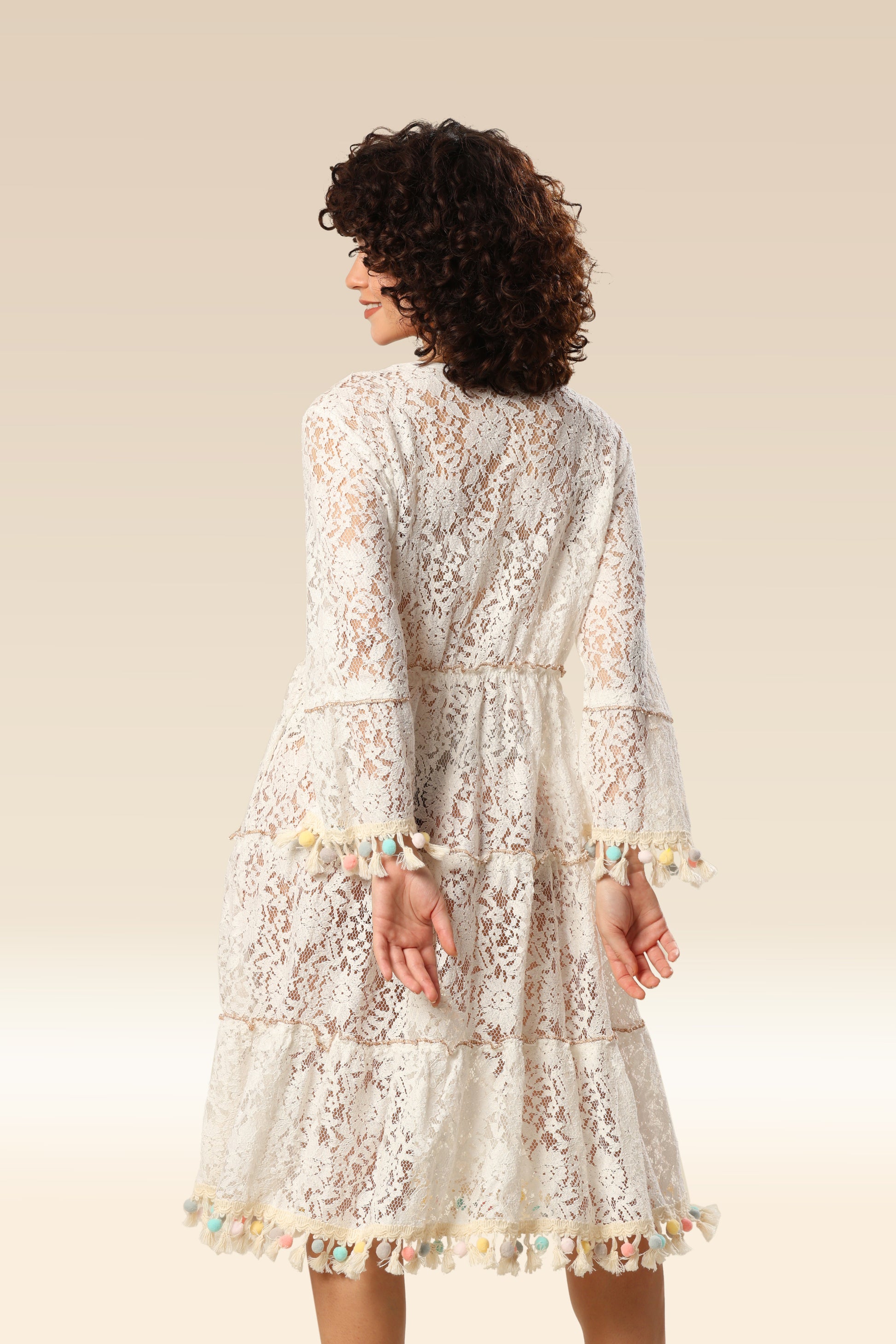 Maxi summer dress is made entirely of beautiful high-quality transparent lace, which offers complete comfort when worn. The dress has the deep "V" neckline, long sleeves and decorative pom poms. With elastic at the waist.