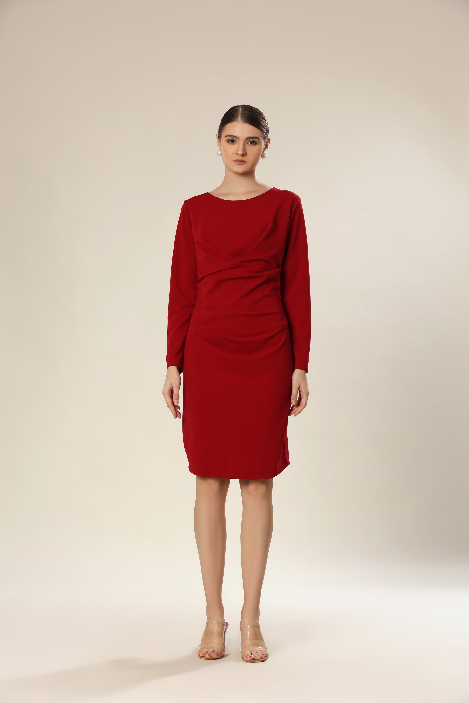 The midi dress is made of high-quality soft and compact fabric that offers perfect wearing comfort. The dress is fitted and has a bateau neckline and long sleeves. Pleated at the front. The skirt is fitted and reaches the knees