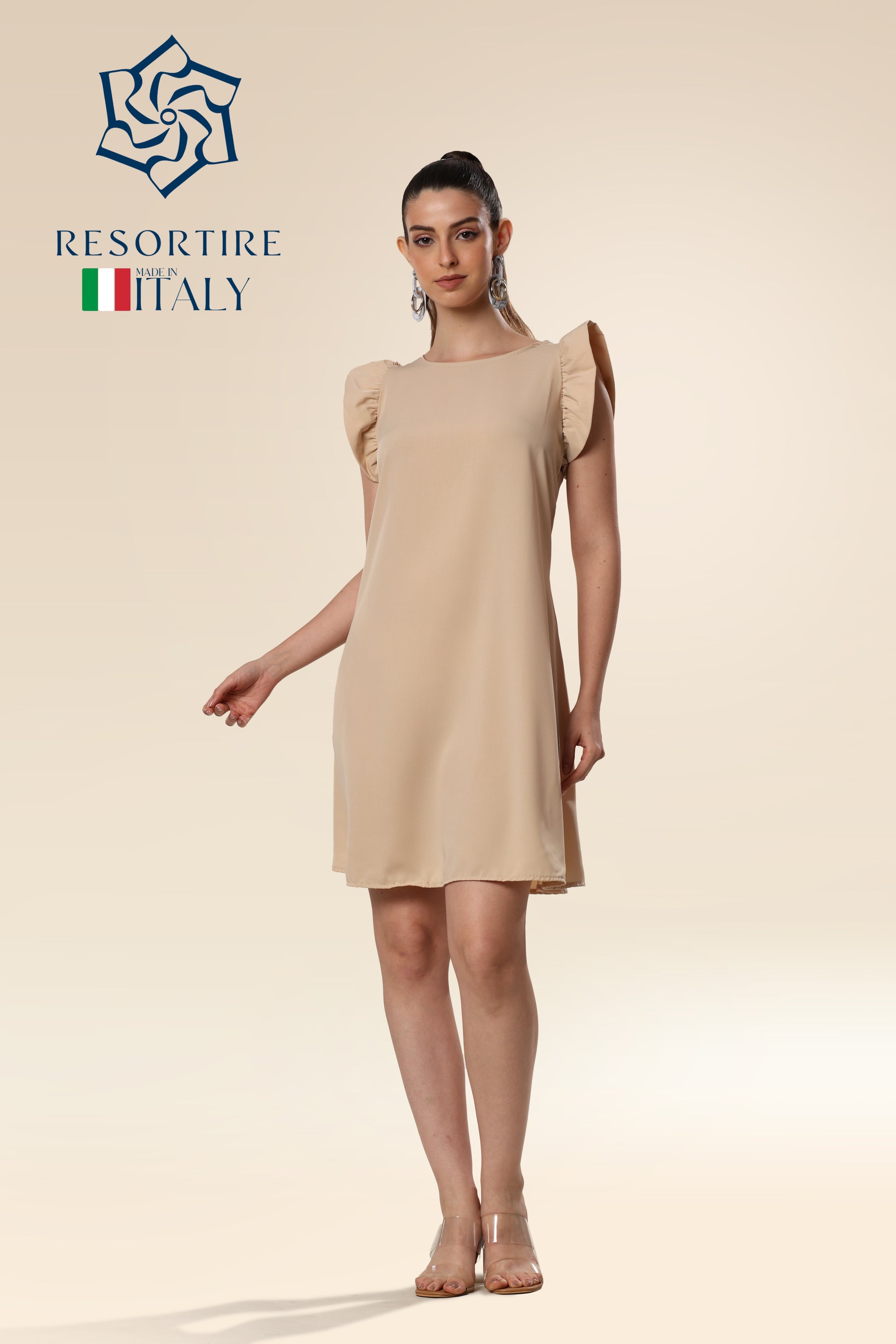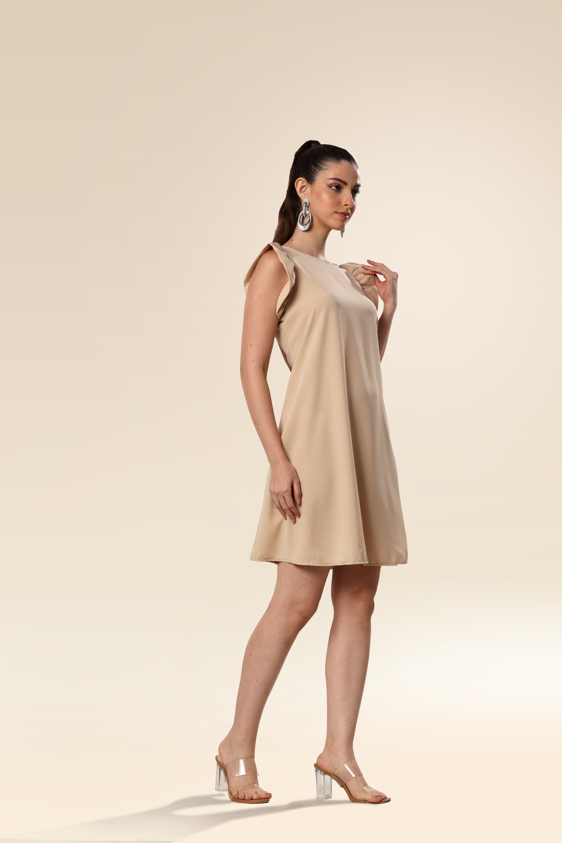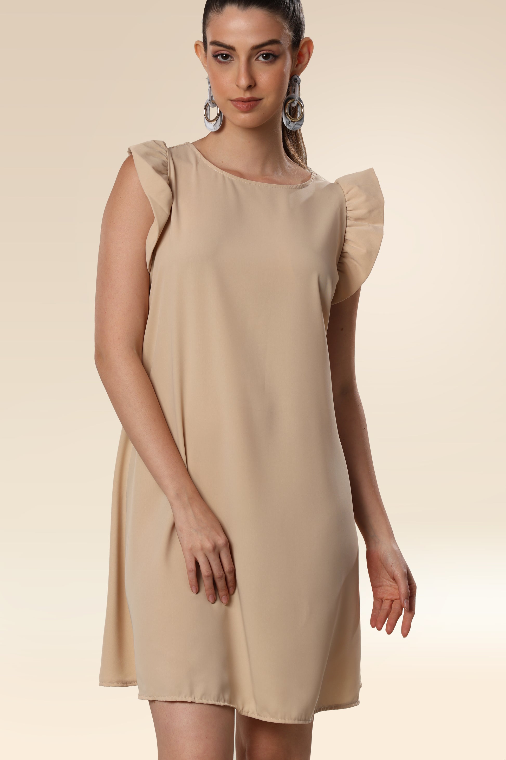 The mini dress is made of soft and compact fabric of high quality, which offers complete wearing comfort. The sleeveless dress has a round neckline and reaches to the middle of the thighs. The dress has decorative ruffles instead of sleeves.