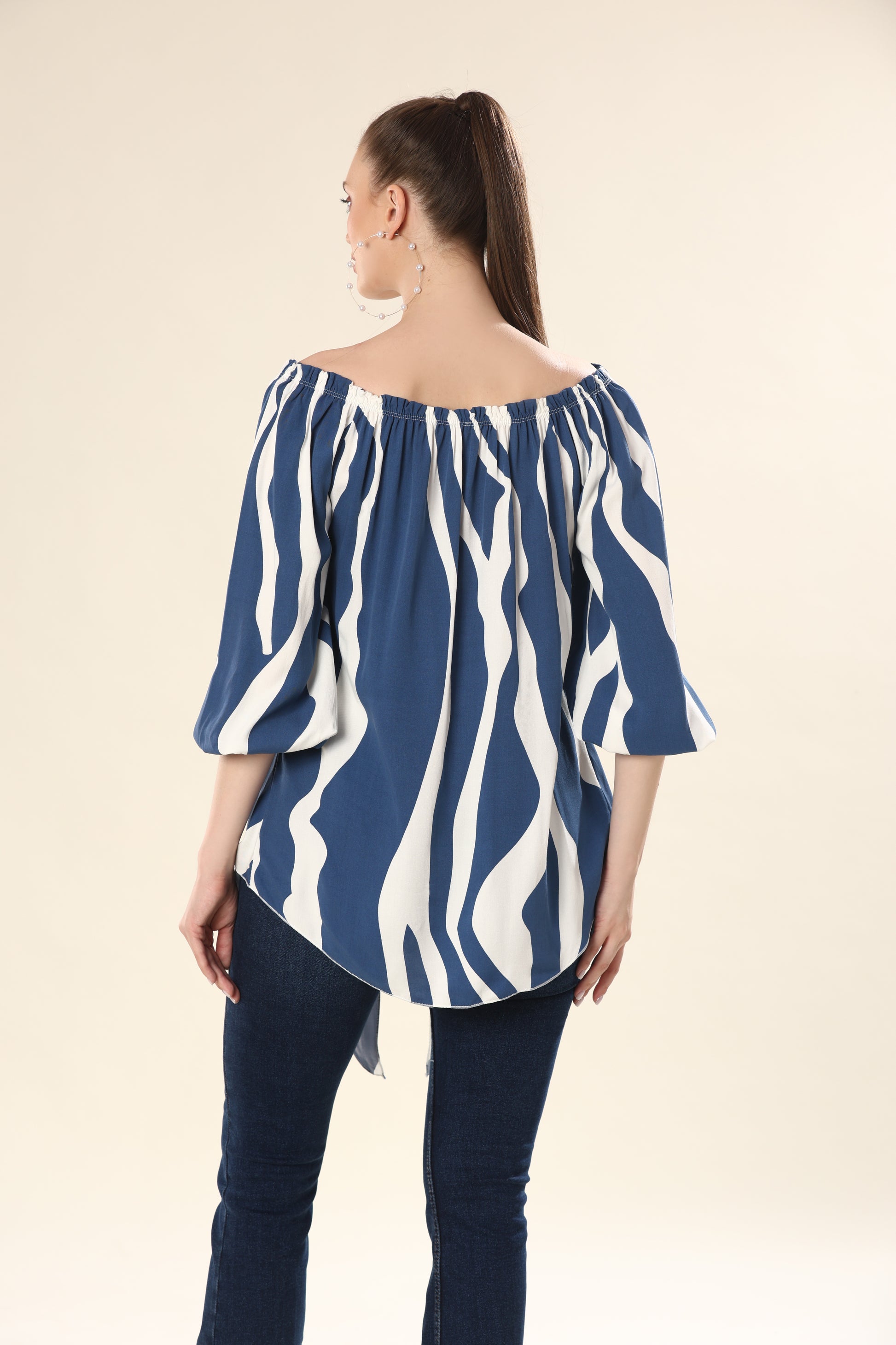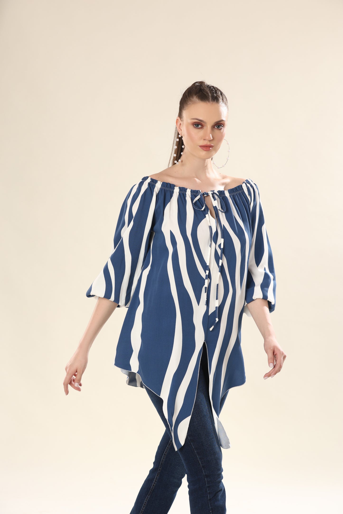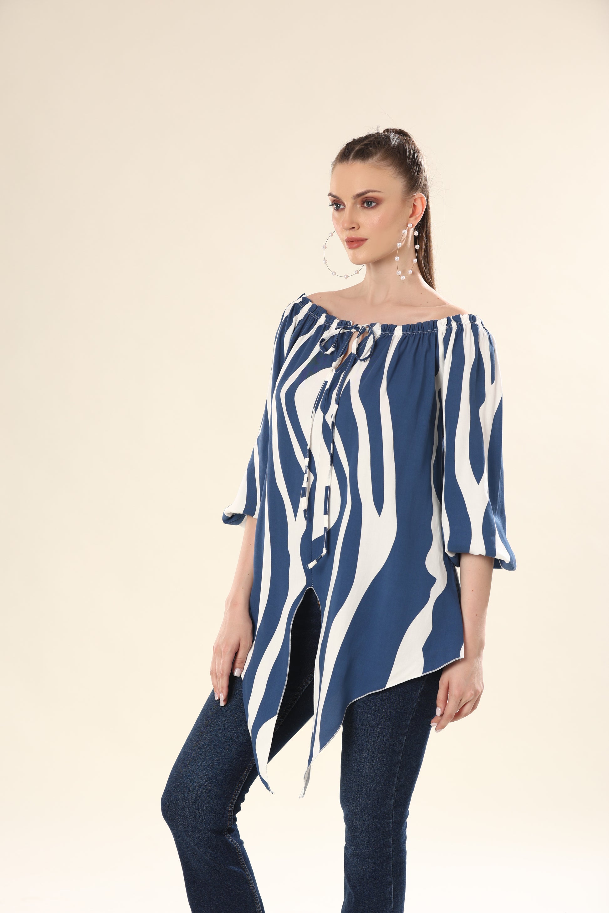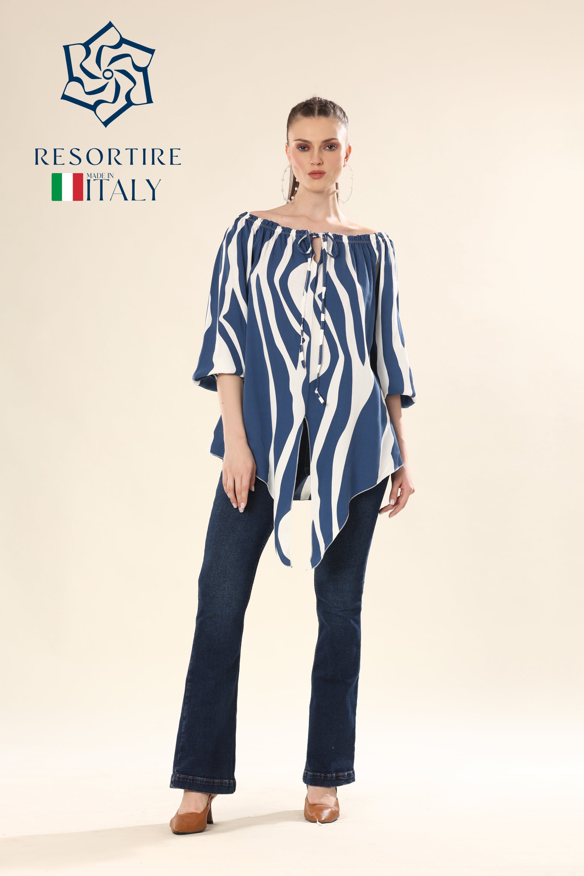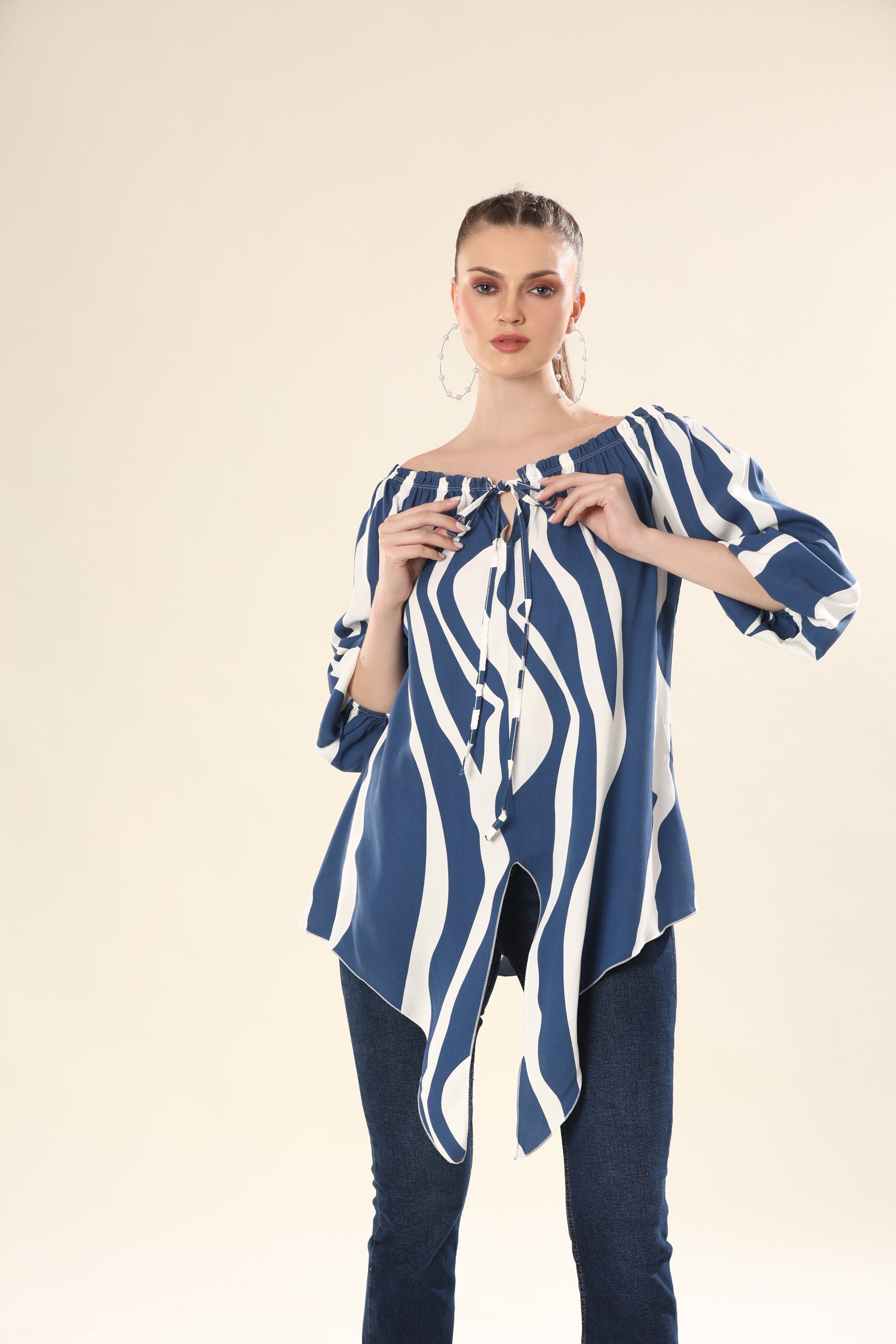 he loose-fitting Top is made of high-quality viscose, which provides complete wearing comfort. The loose-fitting Top has an elastic around the shoulders, a "v" neckline and a drawstring. The Top has 3/4 loose sleeves compressed with elastic.