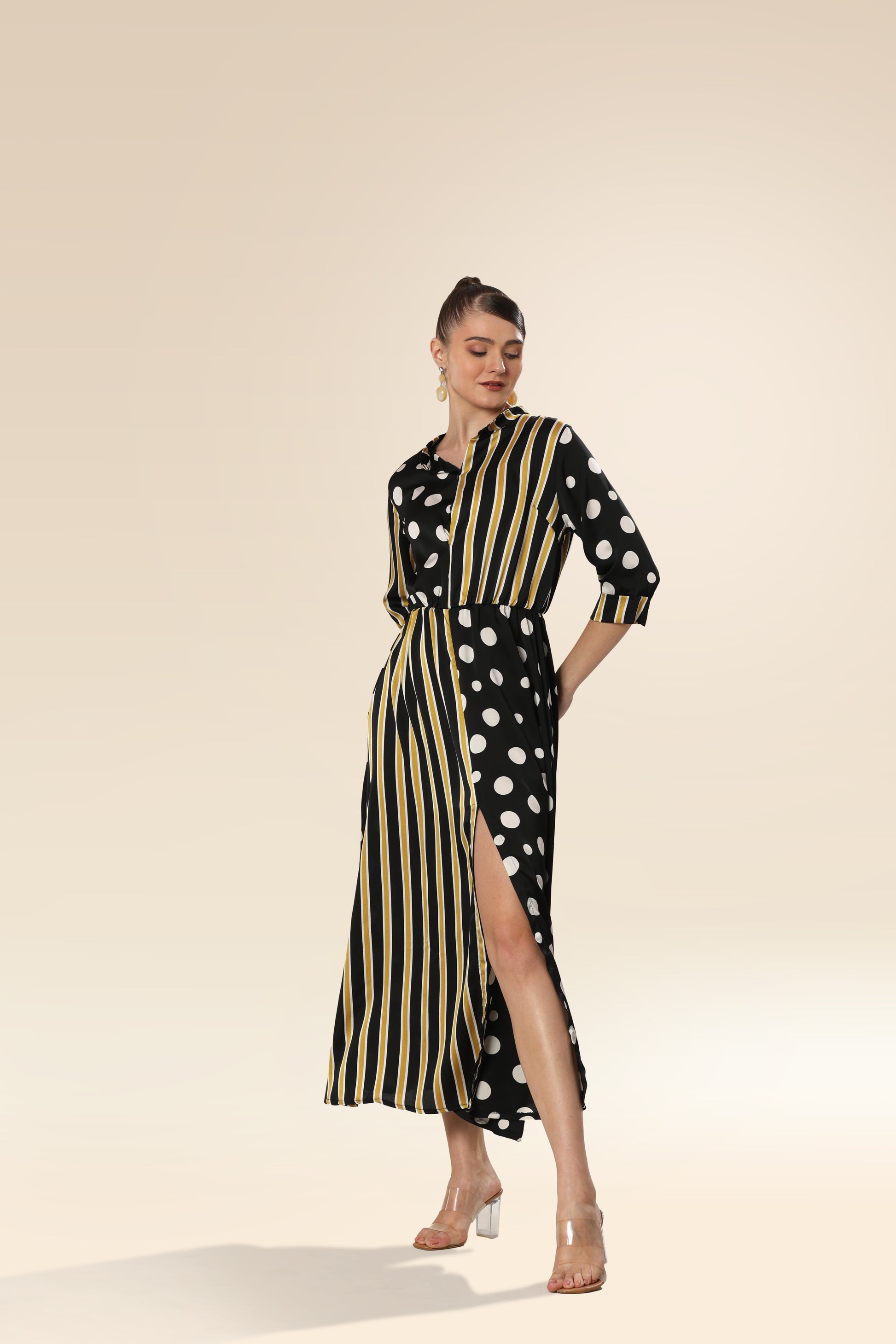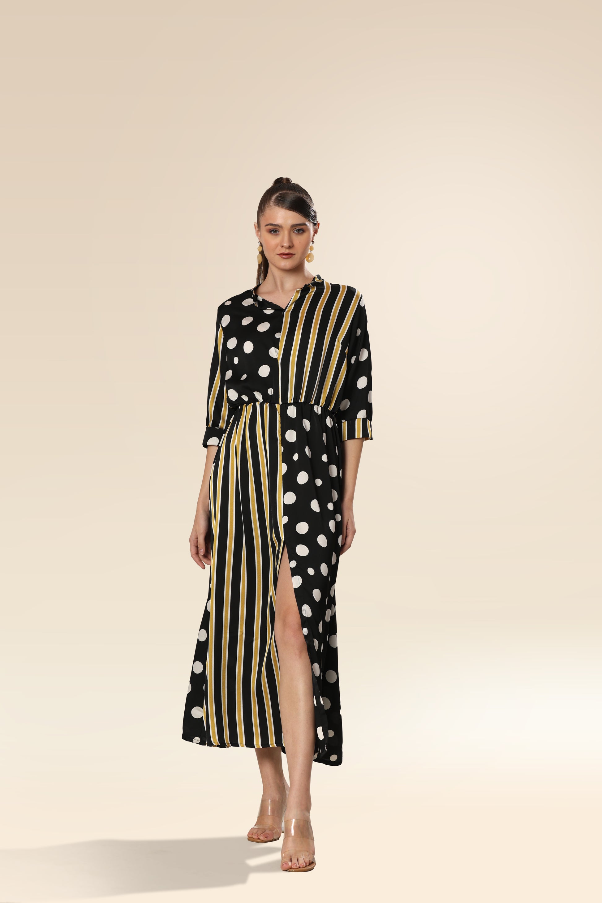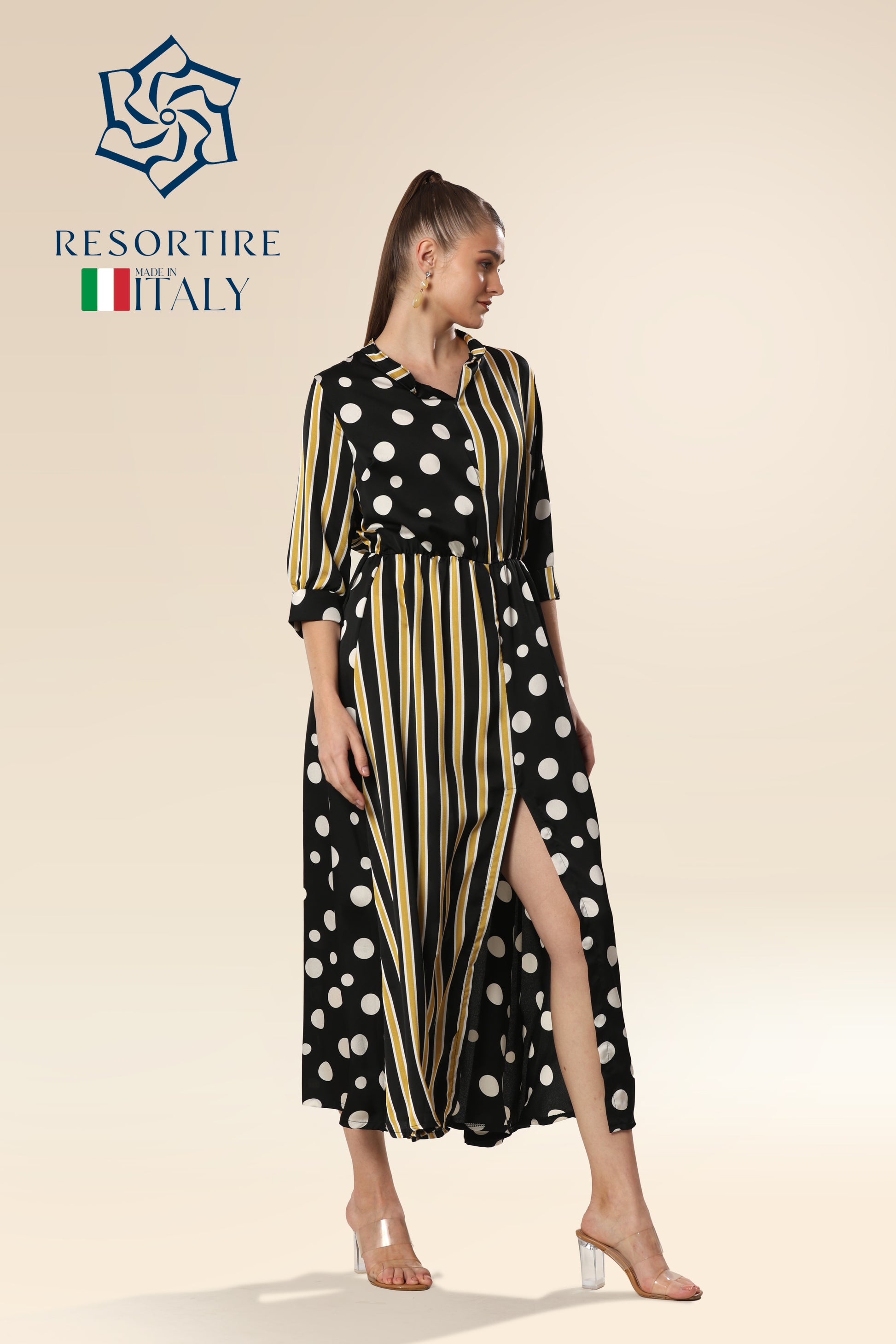 Machine washable. A gorgeous dress made from a mixture of compact materials and printed with beautiful motifs. "V" neck. 3/4 sleeve. Elastic waist. Long skirt with front cutout.