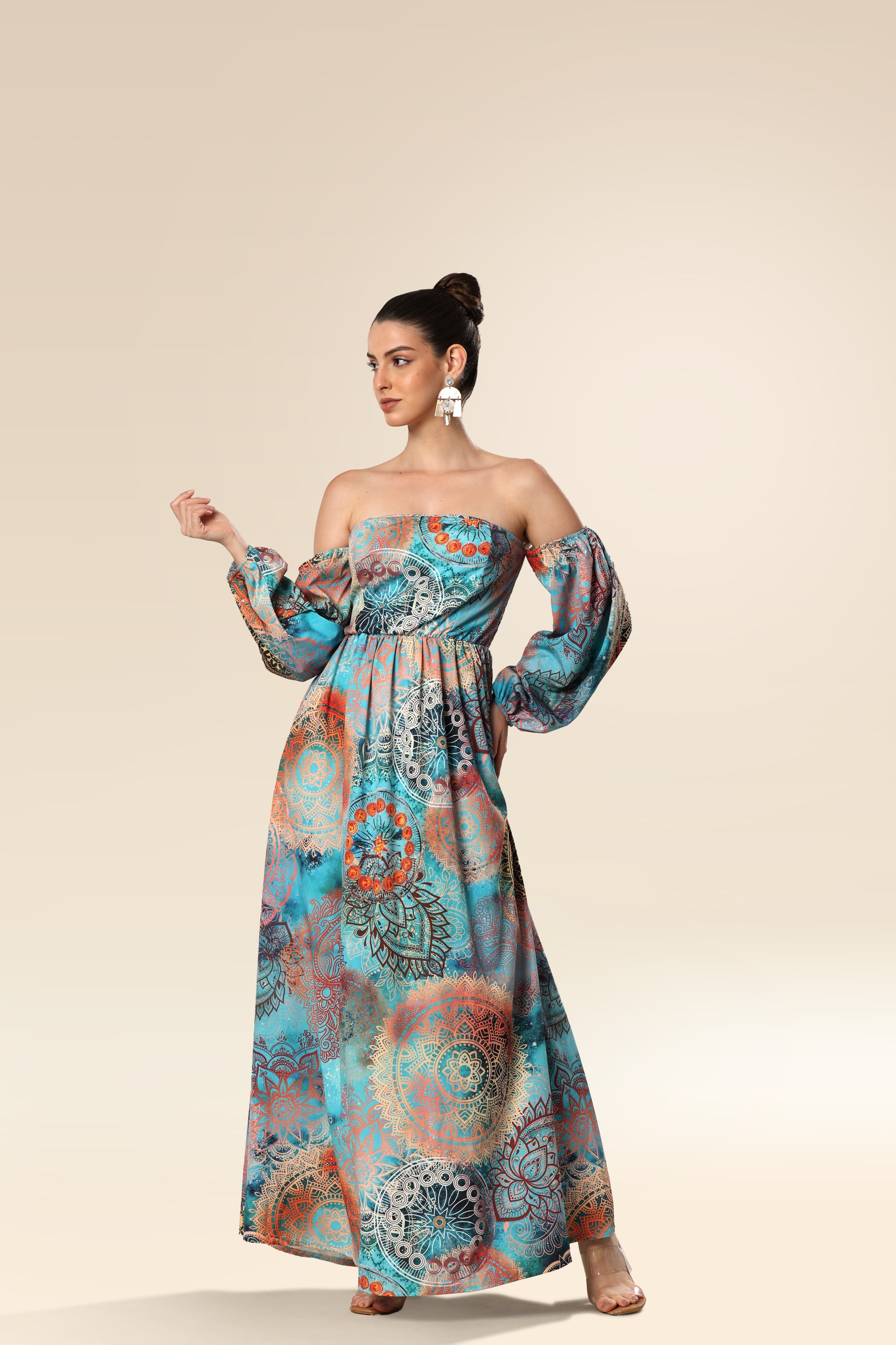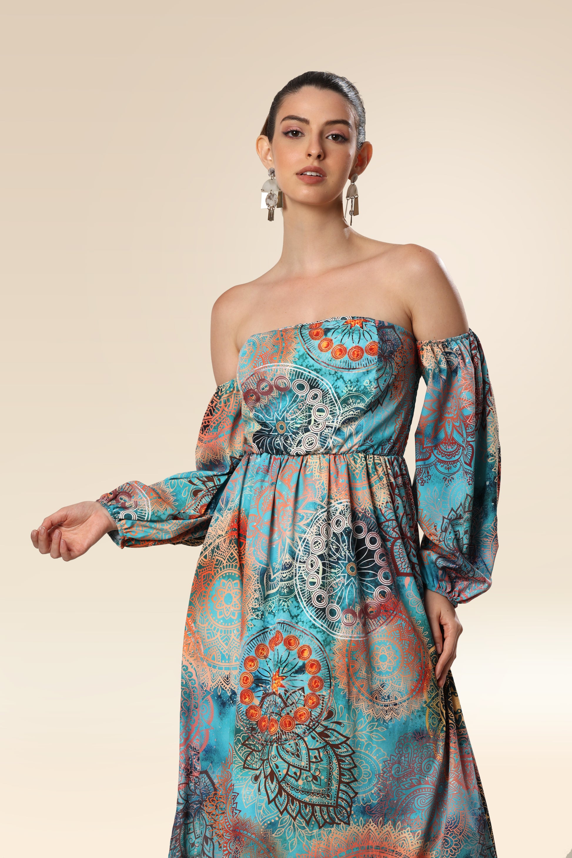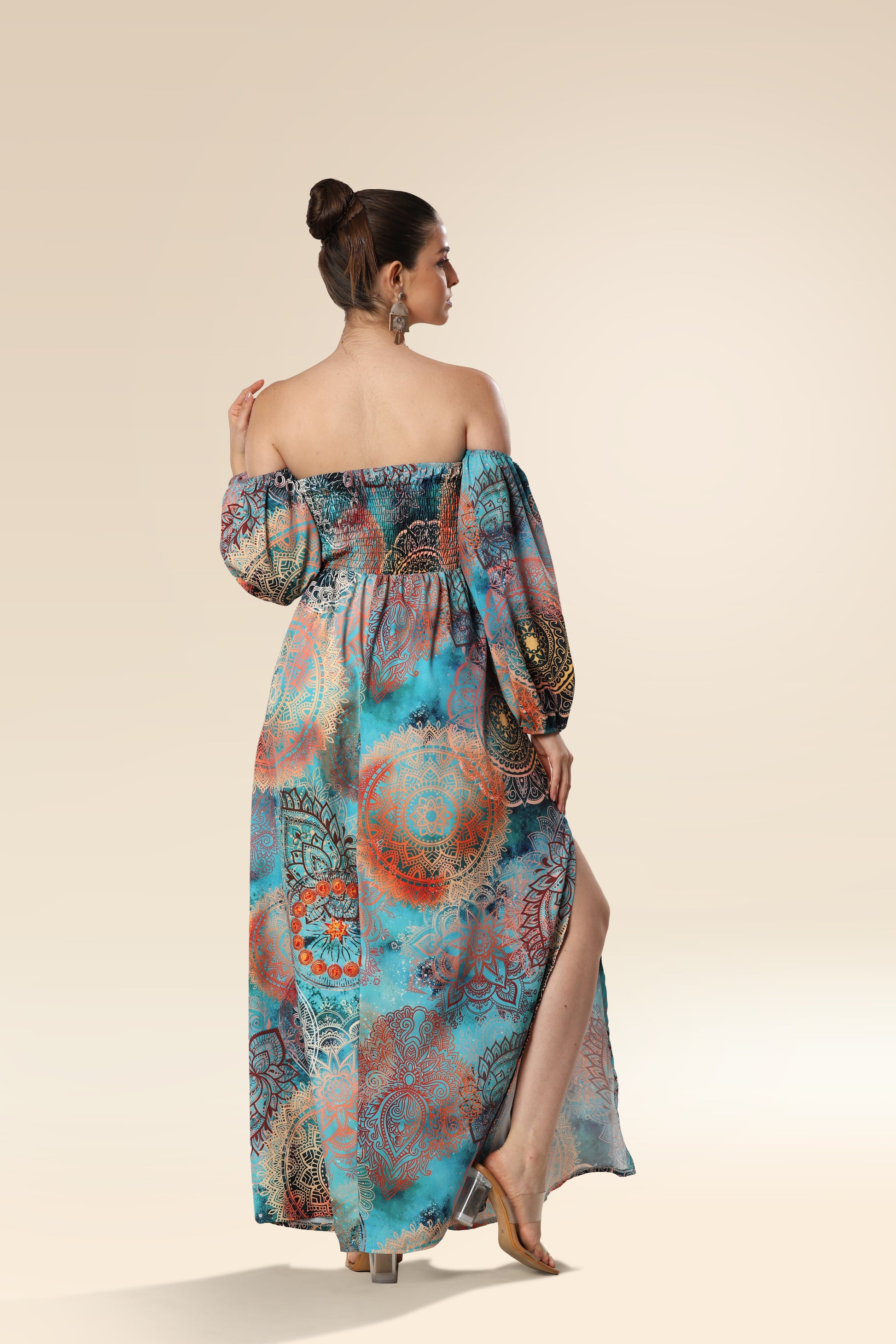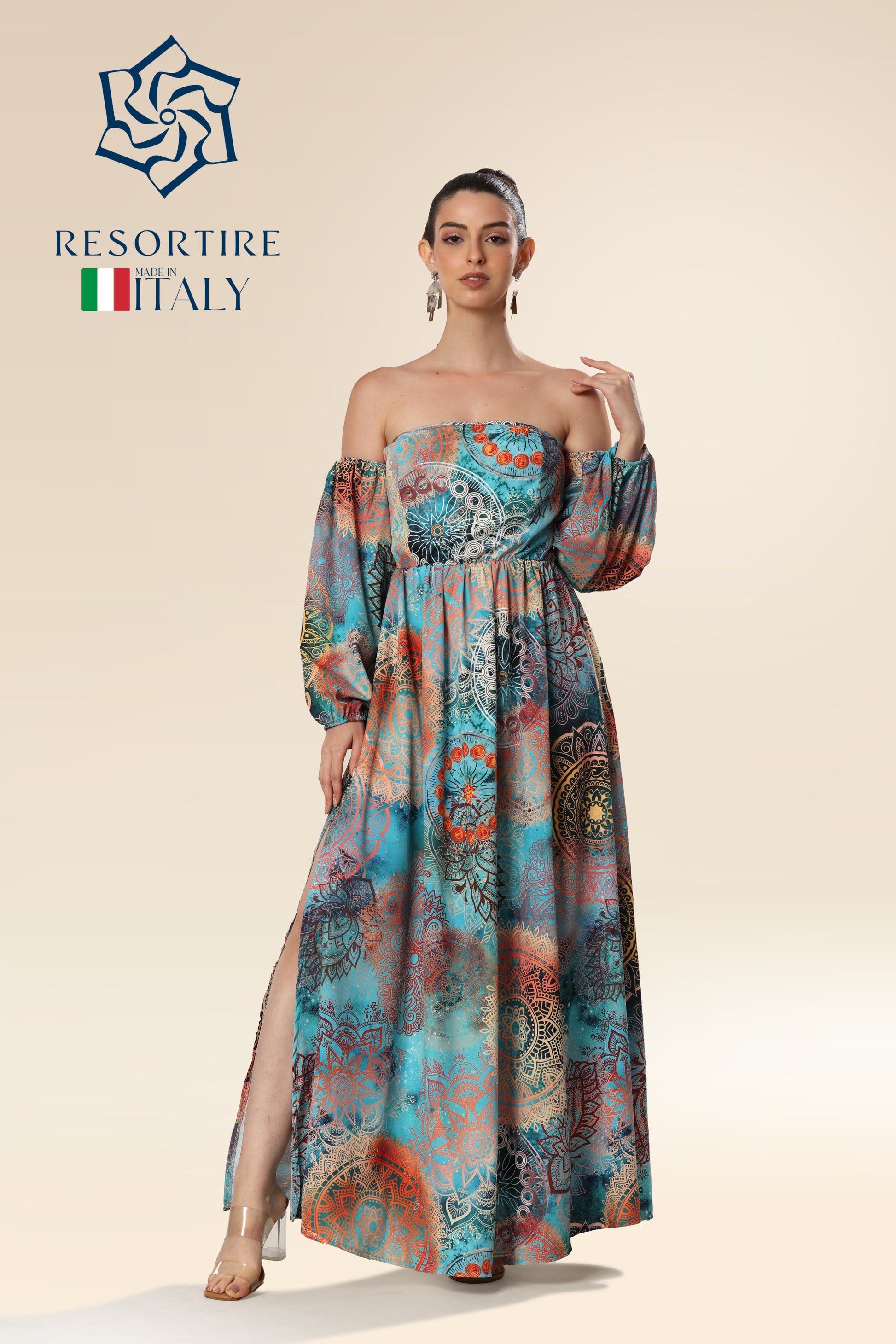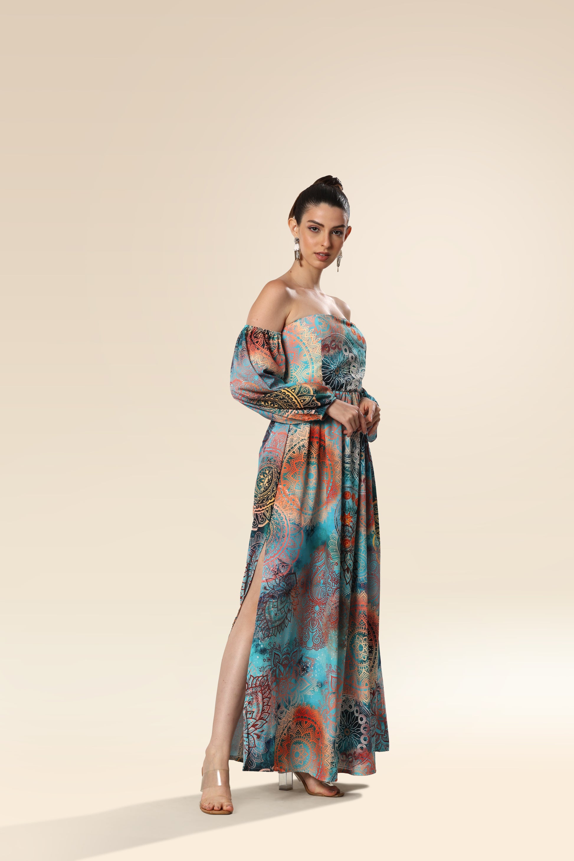 The maxi dress is made of high-quality soft and compact fabric that offers perfect wearing comfort. The printed dress has a straight neckline and long sleeves. The skirt with an opening in the front part is loose cut.