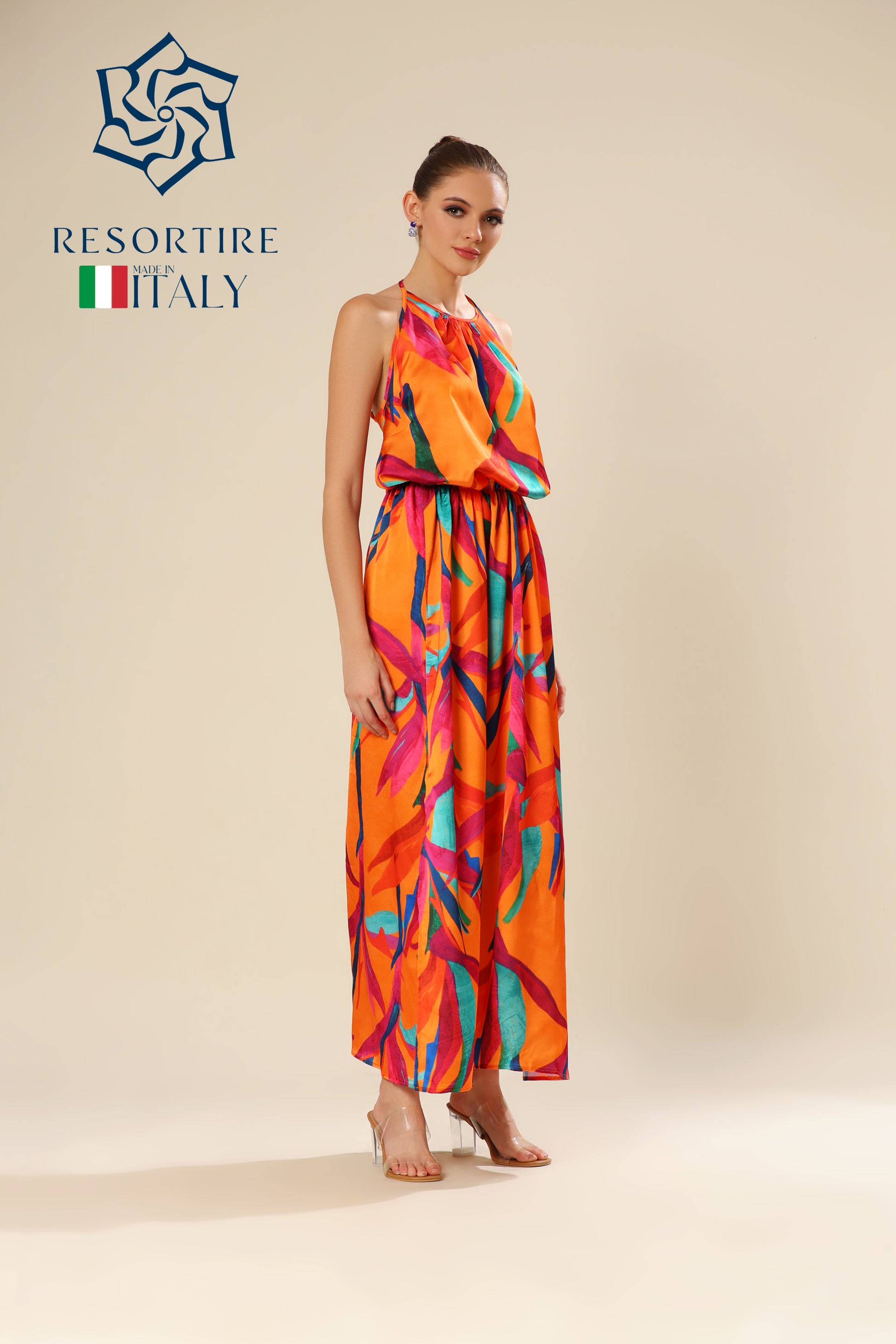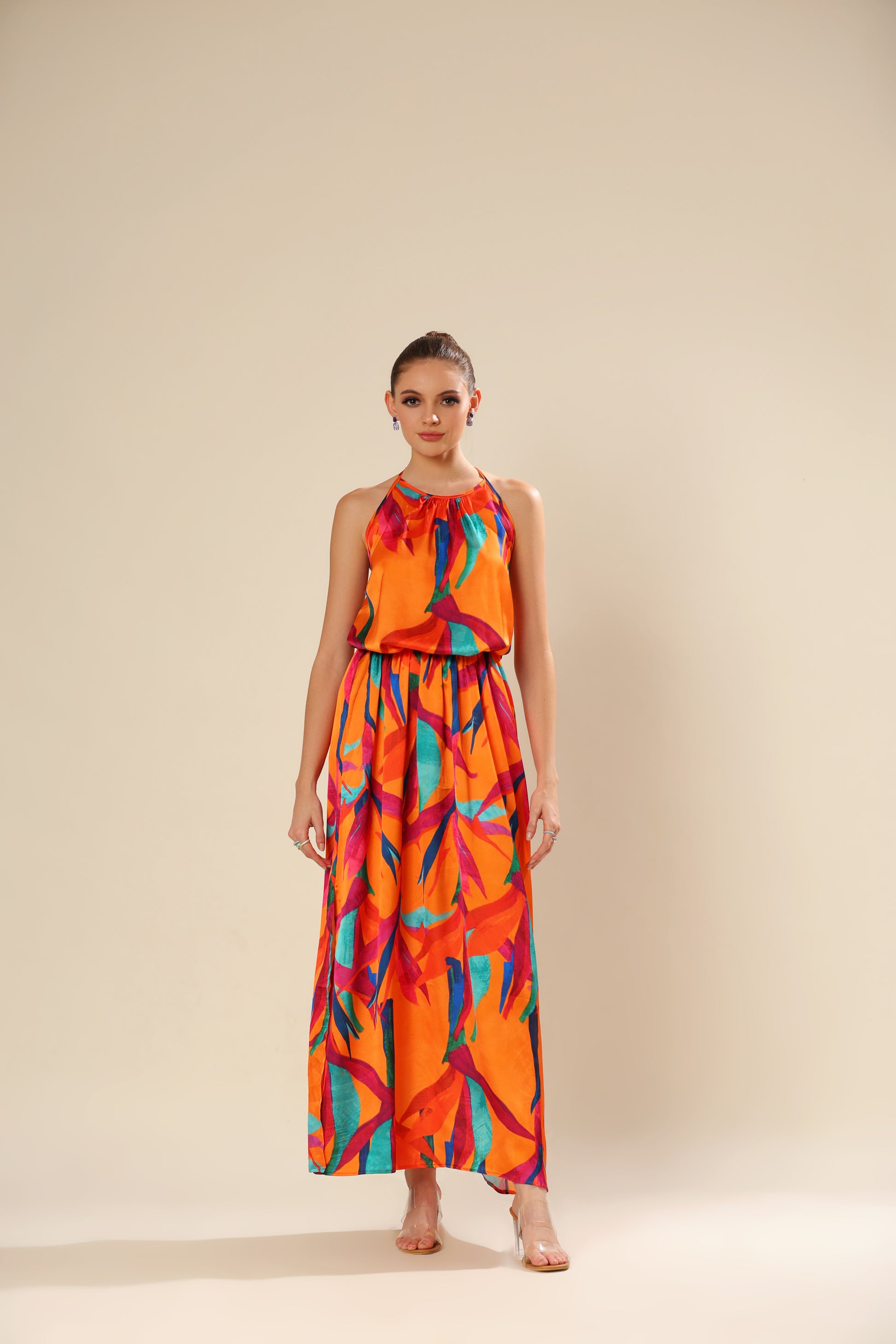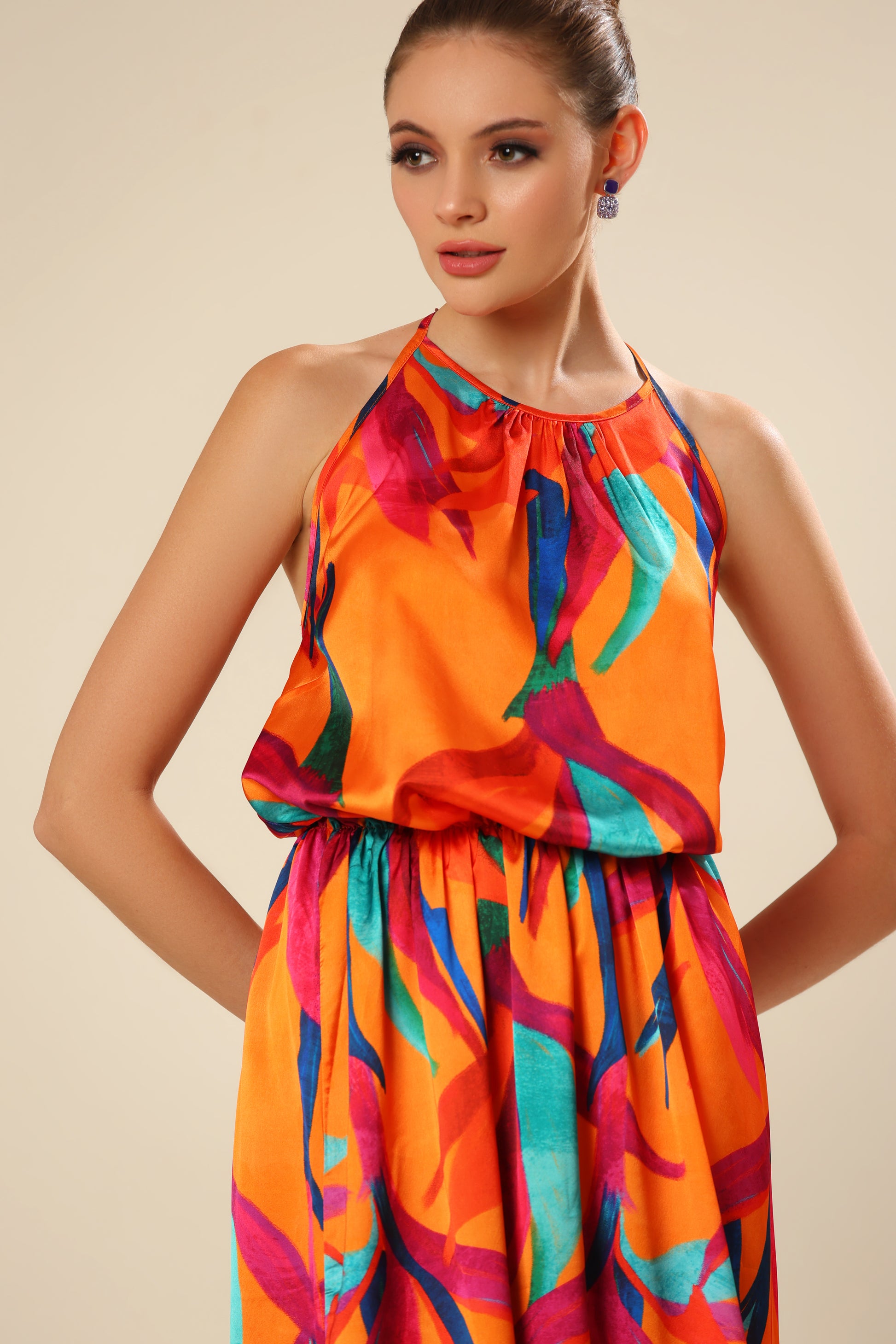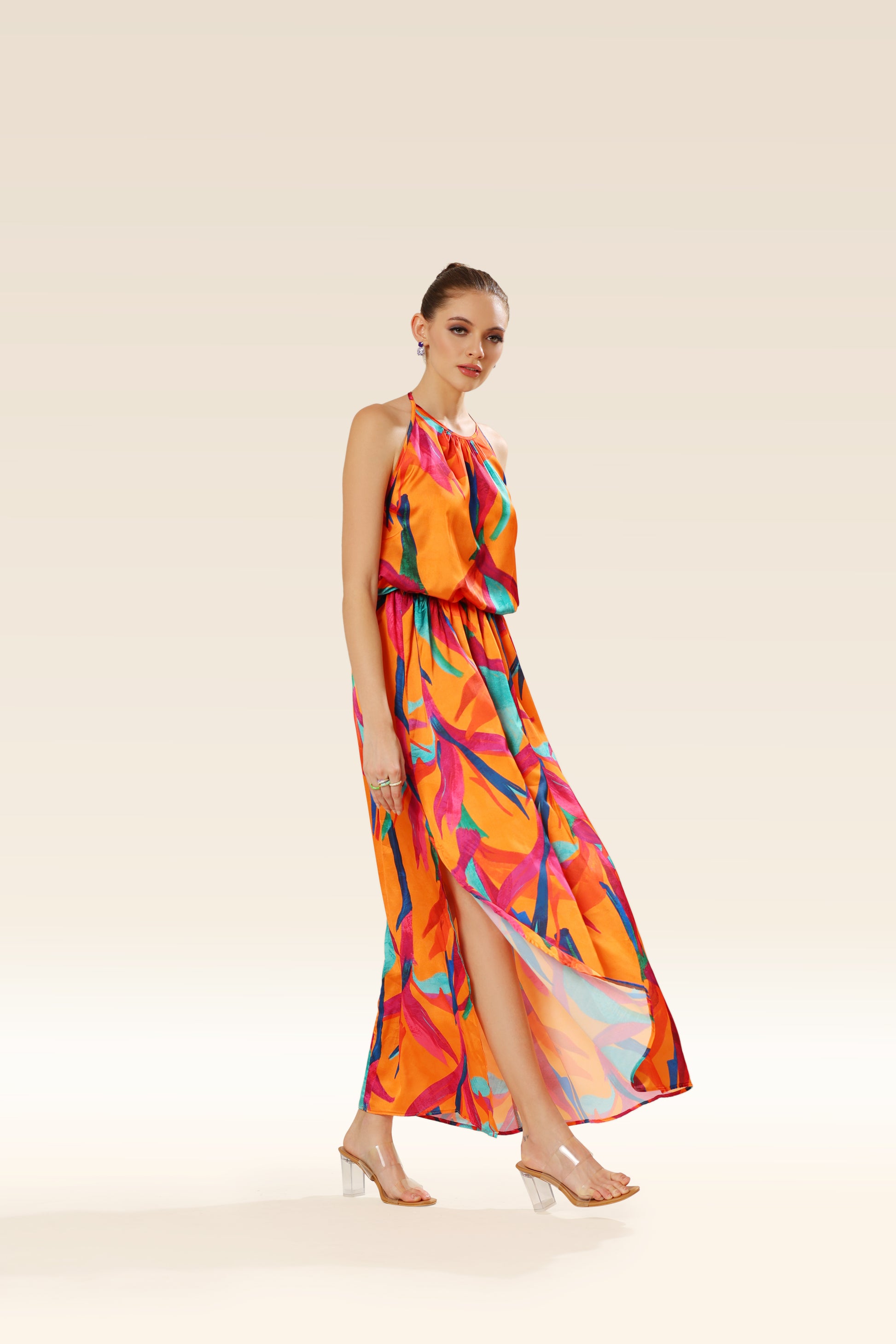 The maxi dress is made of high-quality imitation satin, which offers perfect wearing comfort. The printed dress has a round neckline and an elasticated waist.