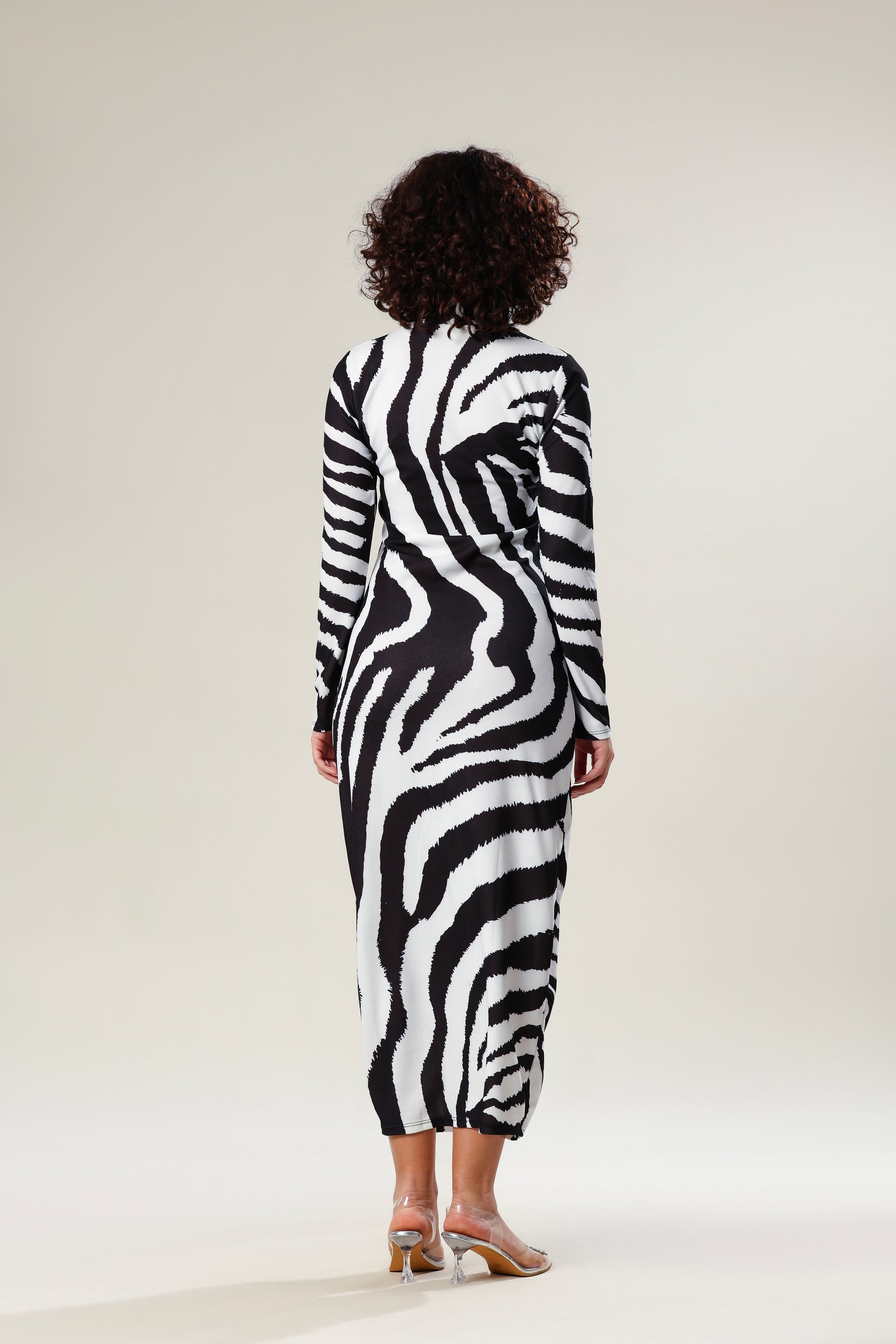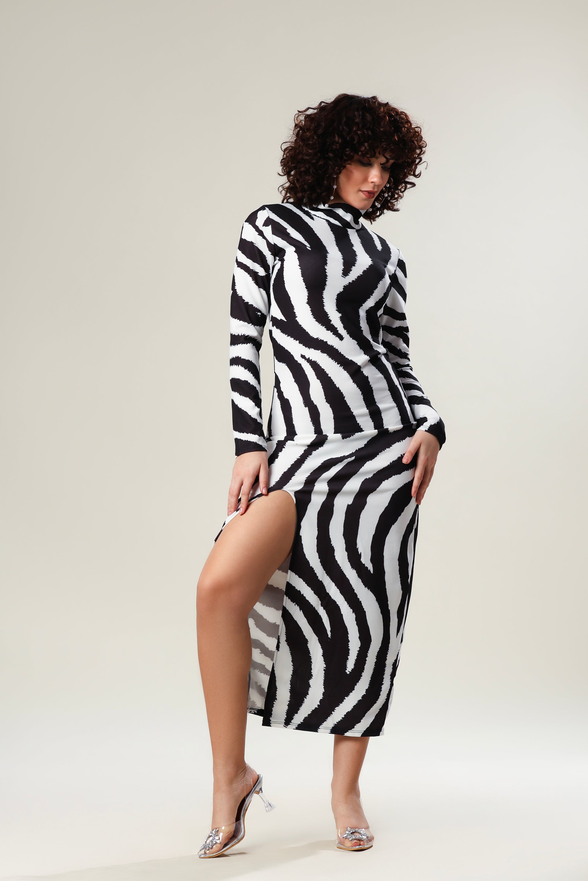 The maxi dress is made of high-quality soft and compact fabric that offers perfect comfort. The zebra print dress has a high neck and long sleeves. The skirt with an opening is fitted and reaches the ankles.