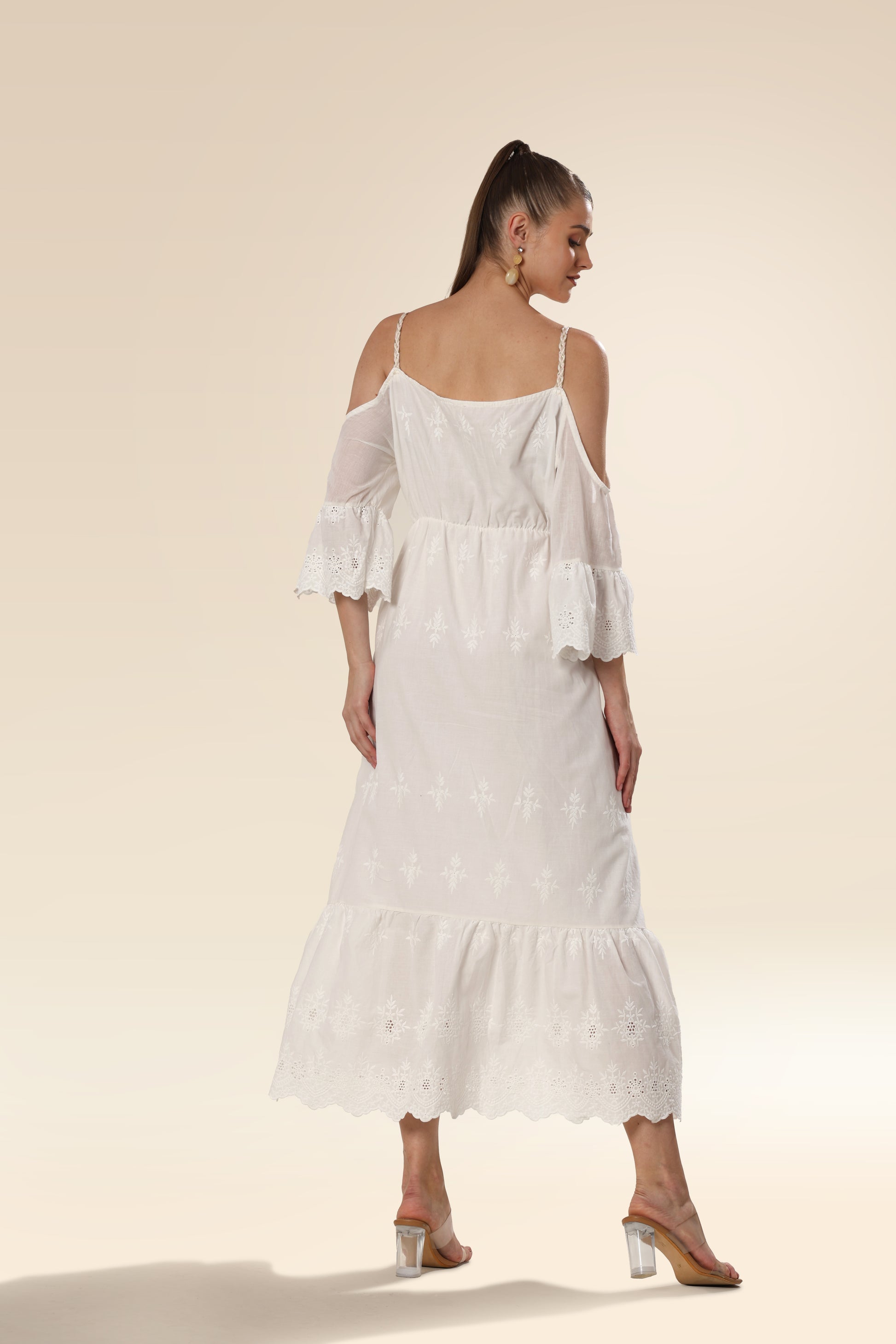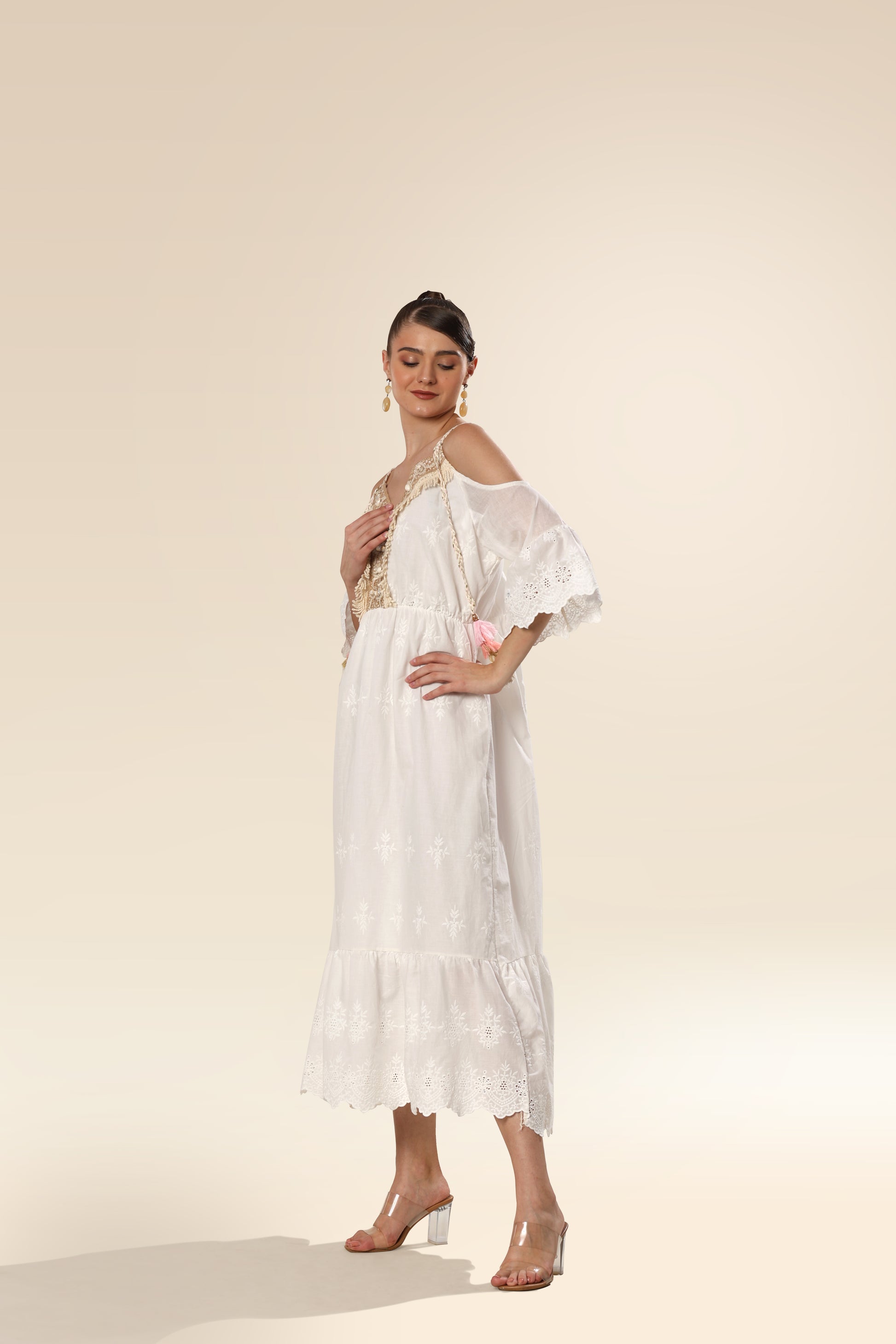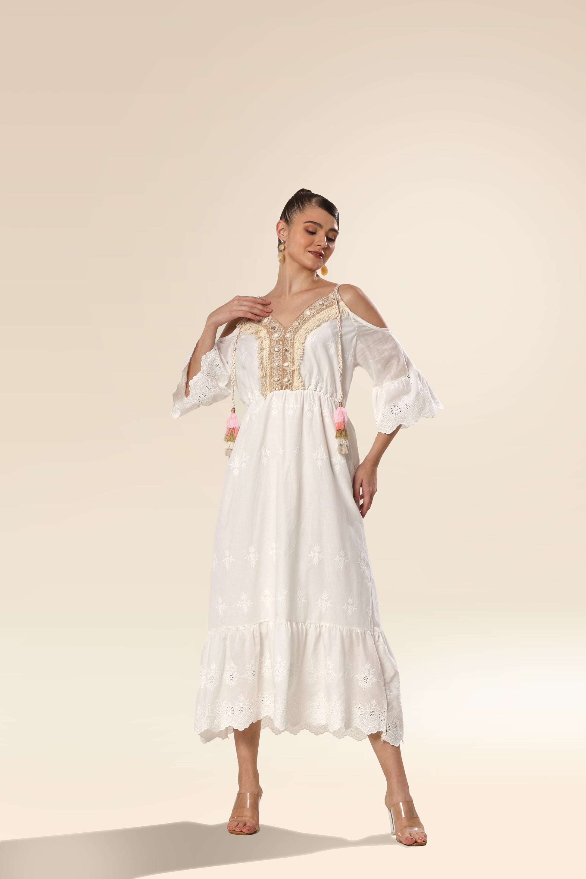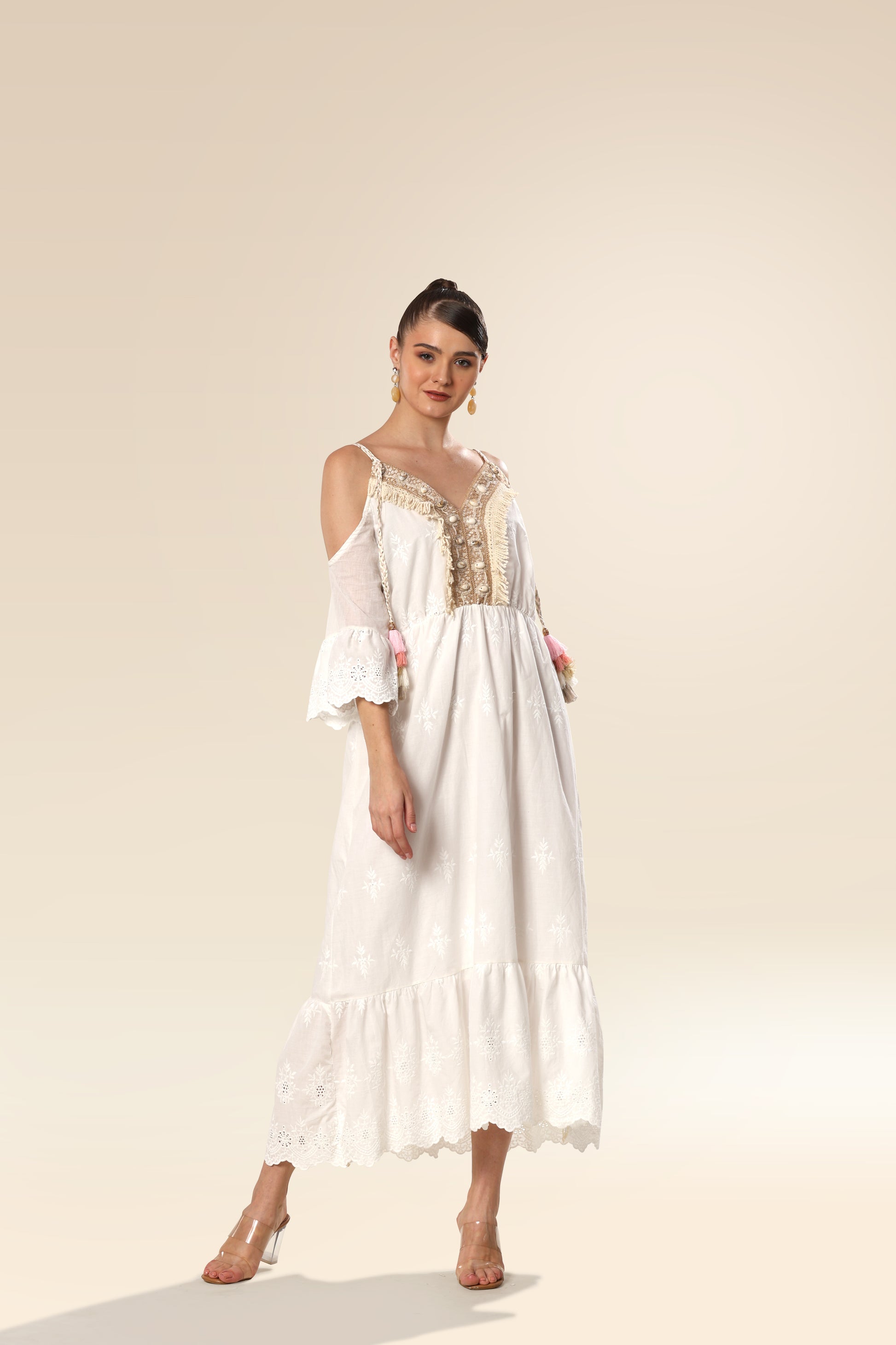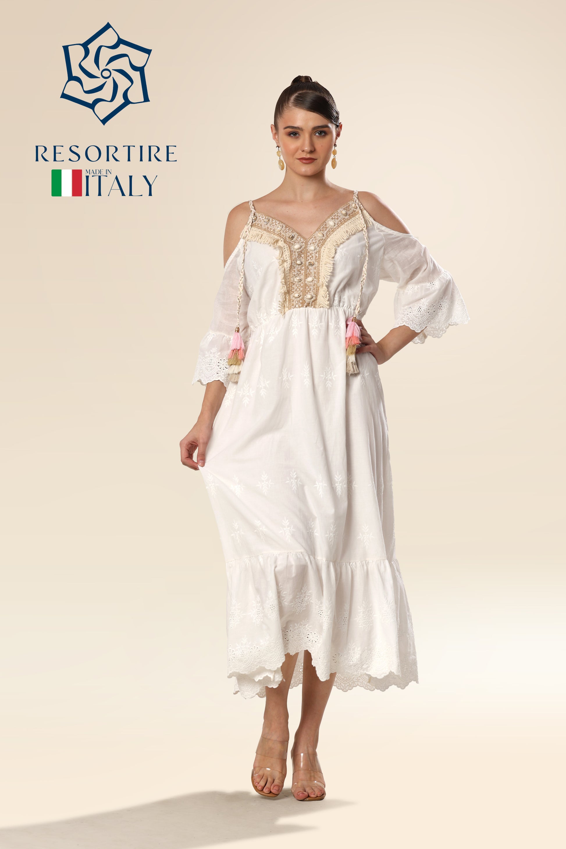 The loose maxi beach dress is made of lightweight and comfortable cotton, which offers total comfort when worn. Dress with thin straps, short sleeves and decorative details on the front. It has a "V" neckline and bare shoulders