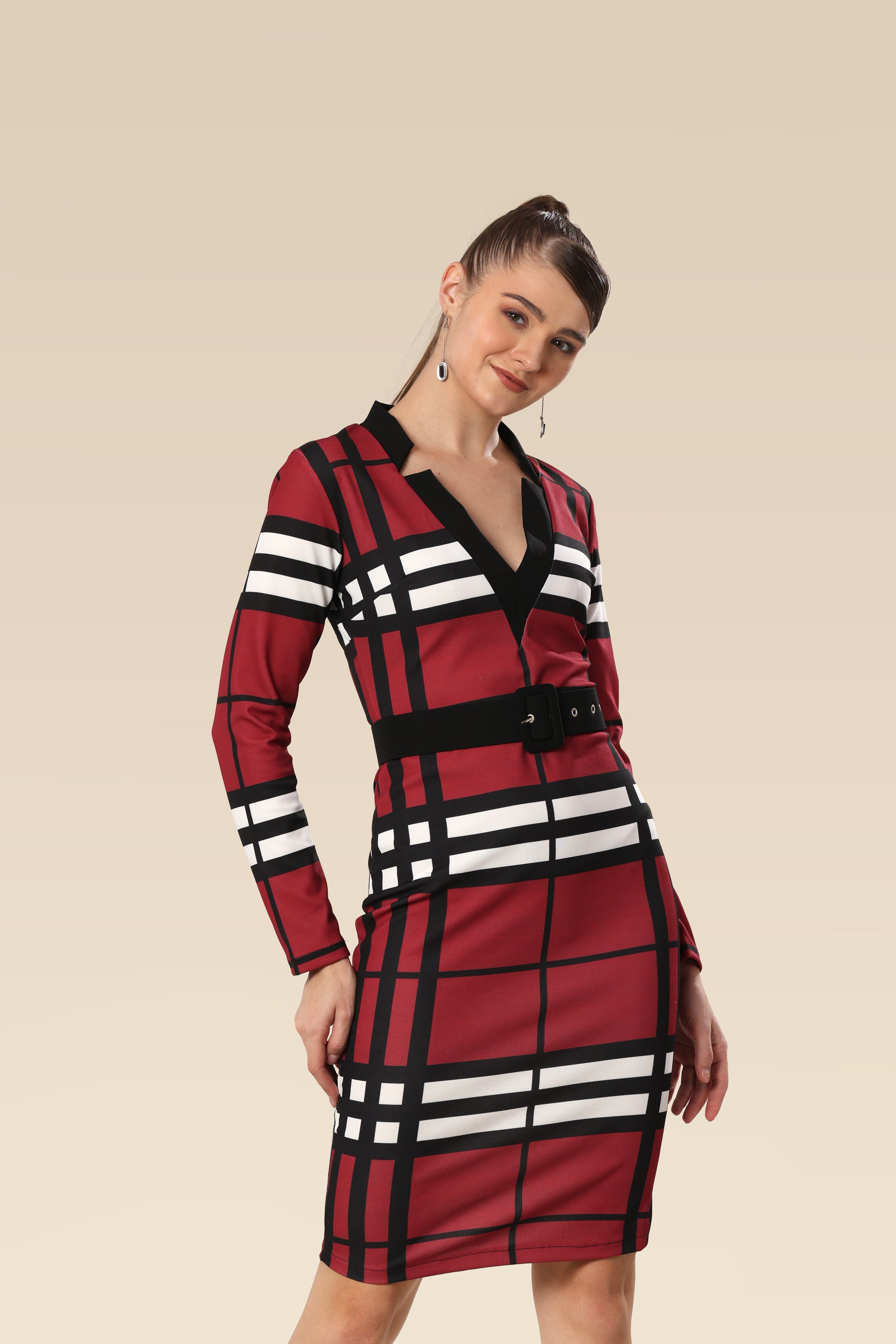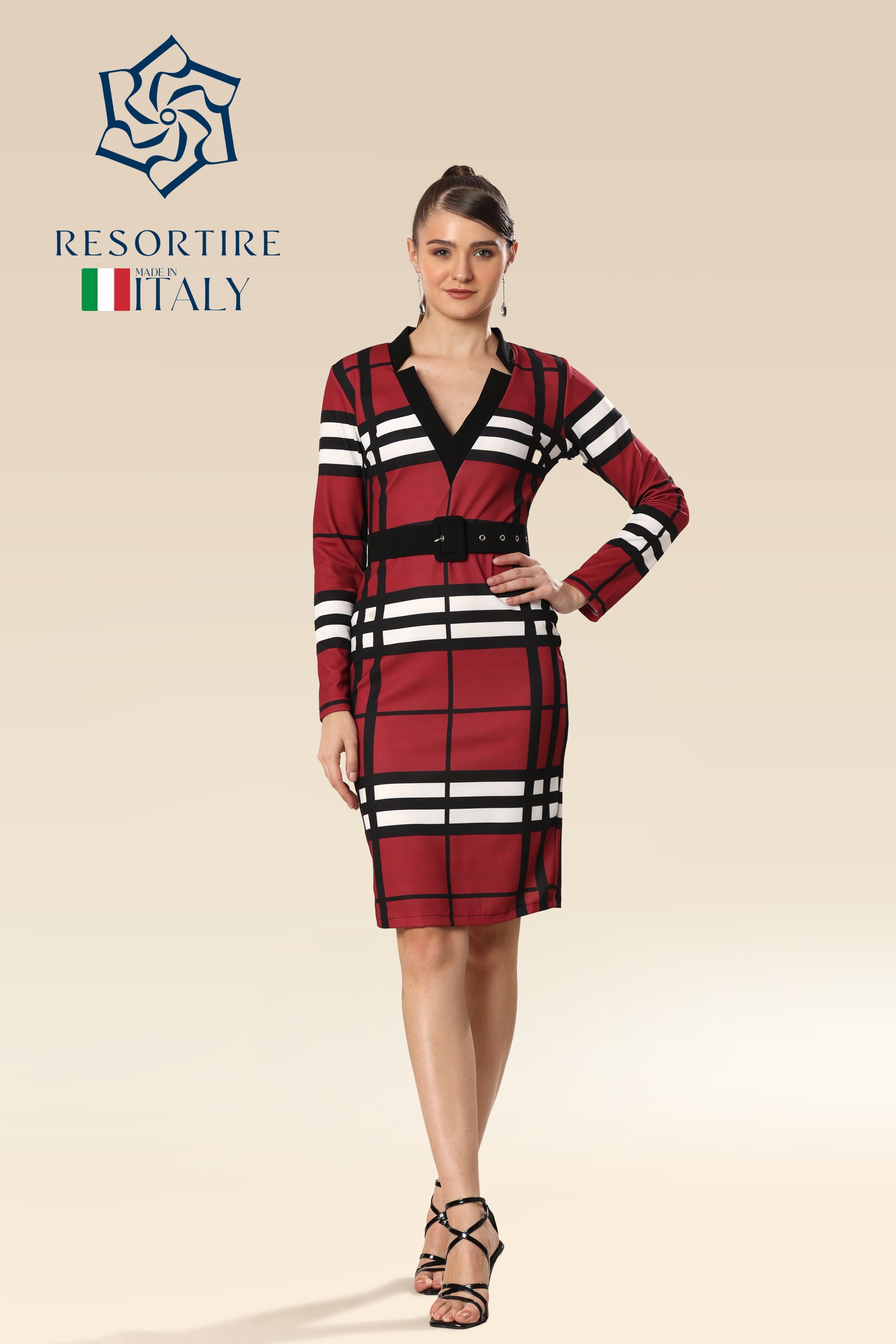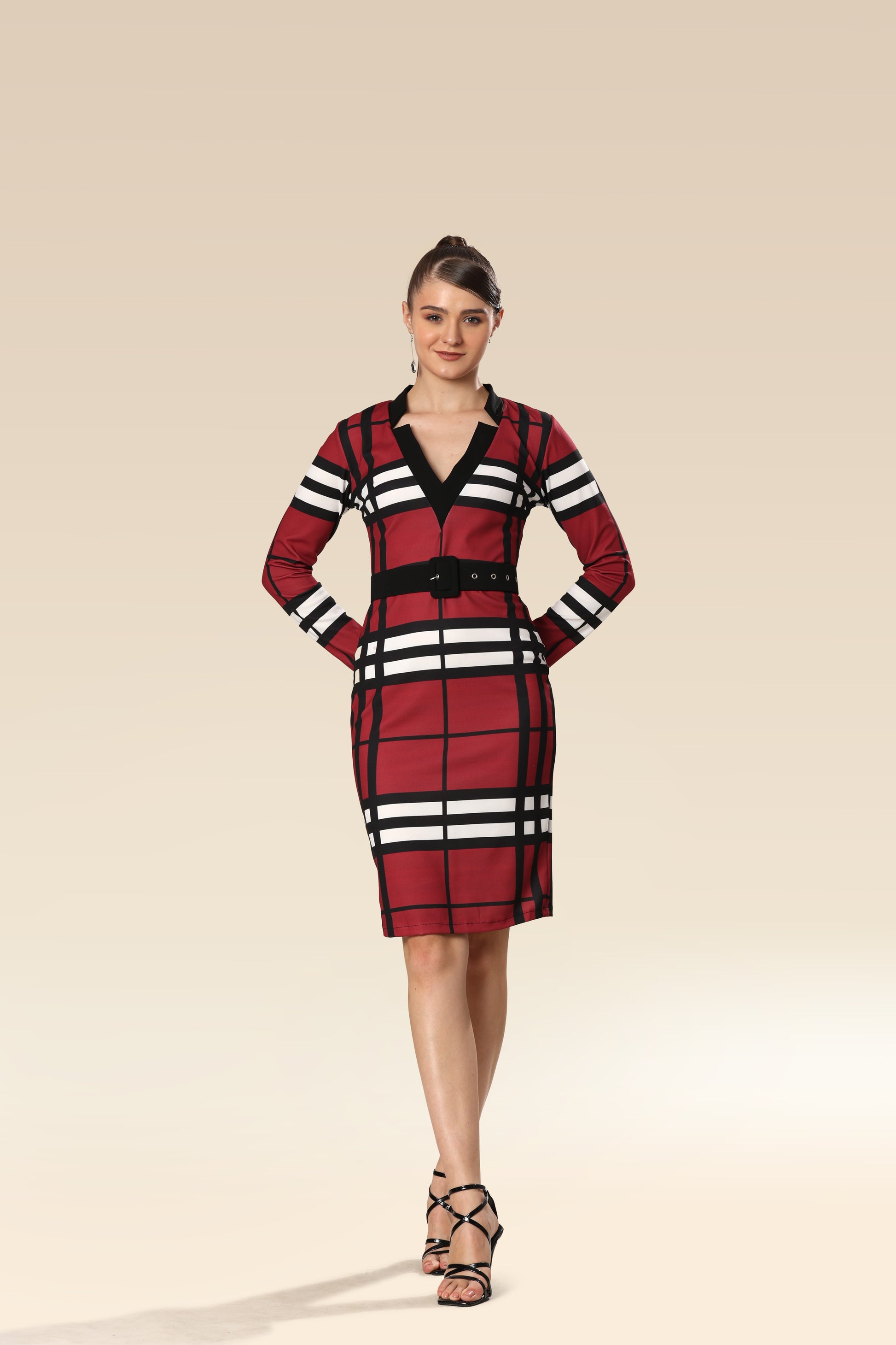 The slim fit midi dress is made from high quality soft and compact fabric, which offers total comfort when wearing it. The modern checkered dress has a deep V neckline and long sleeves with belt. The skirt is fitted and falls below the knees.