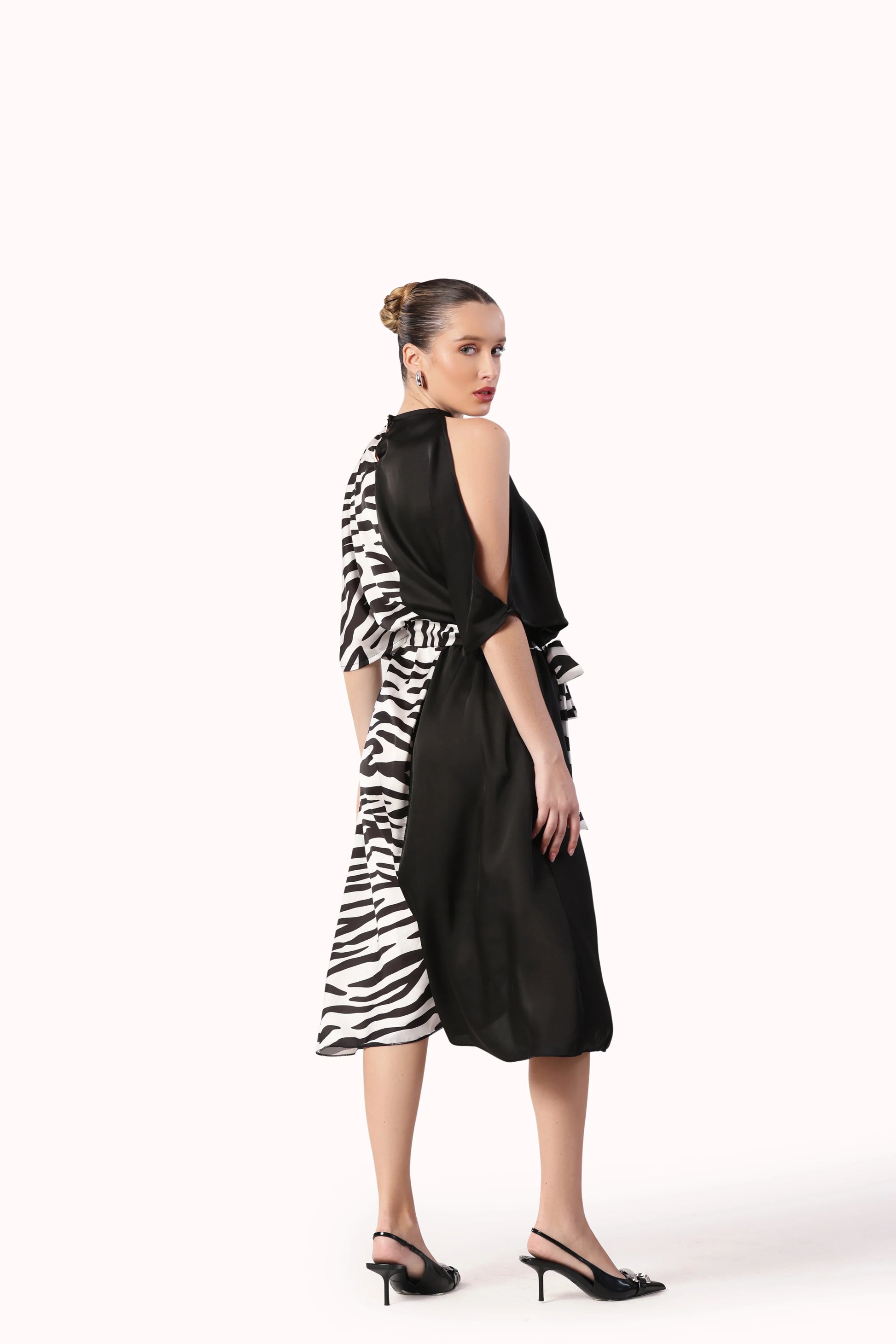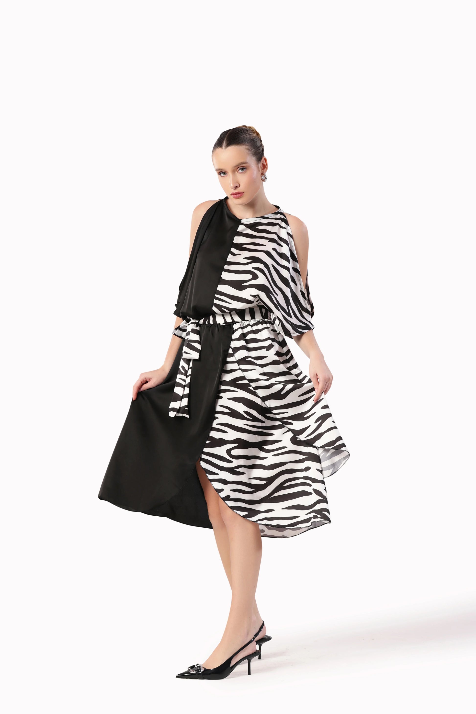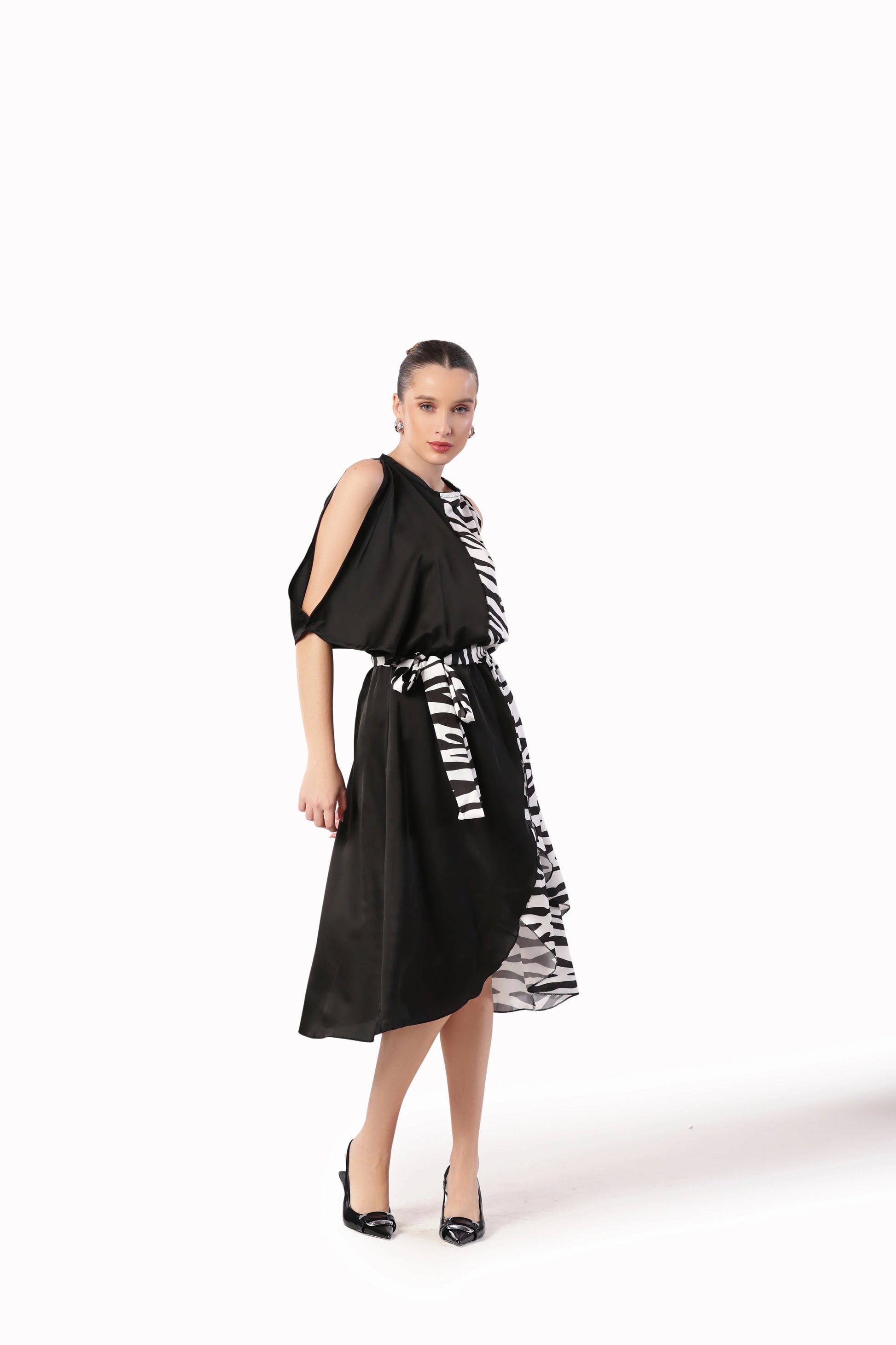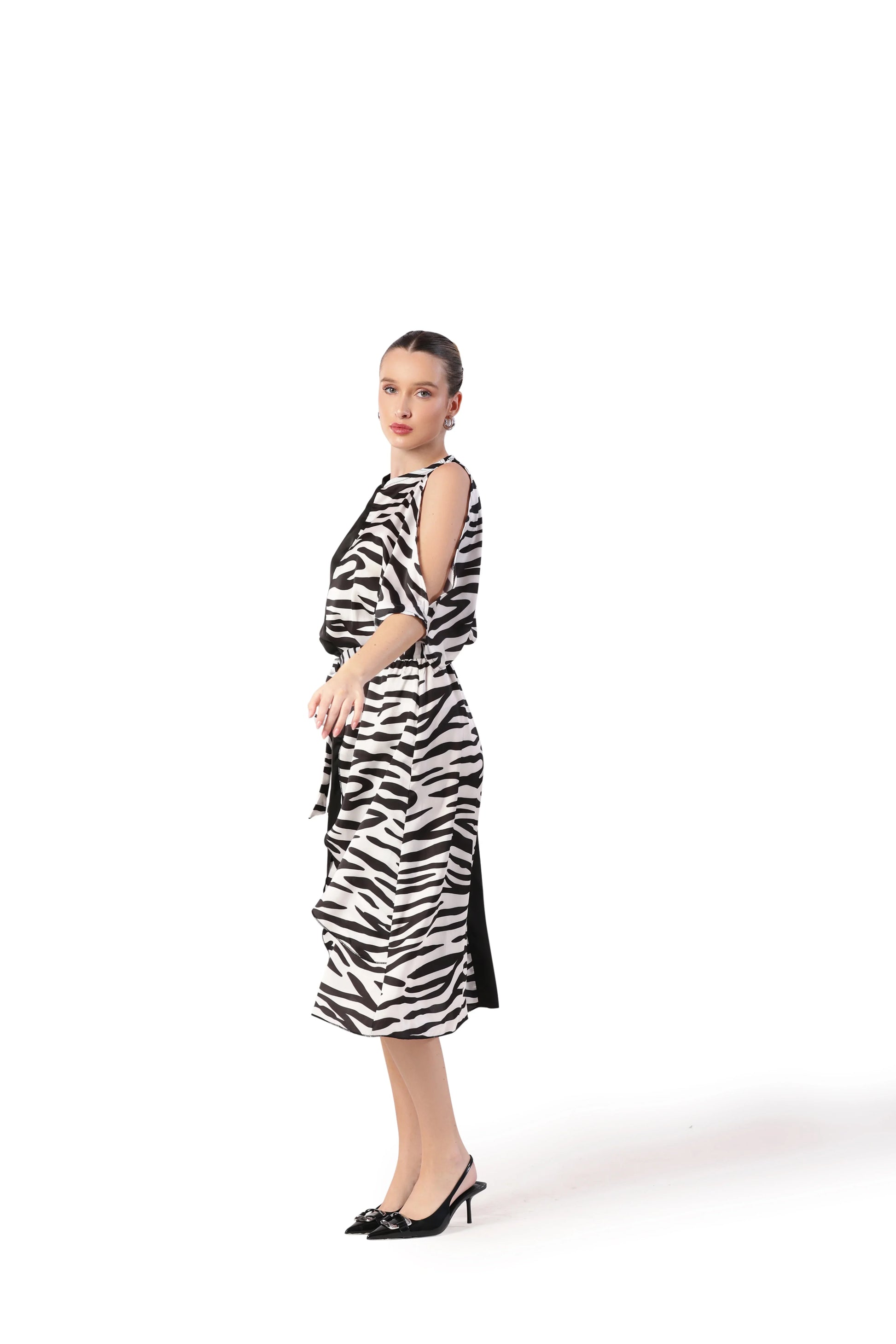 The loose fit midi dress is made of high quality faux satin, offering complete comfort. Printed midi dress features a round neckline and short sleeves with slits on the shoulders. The skirt is crossed and reaches below the knees.