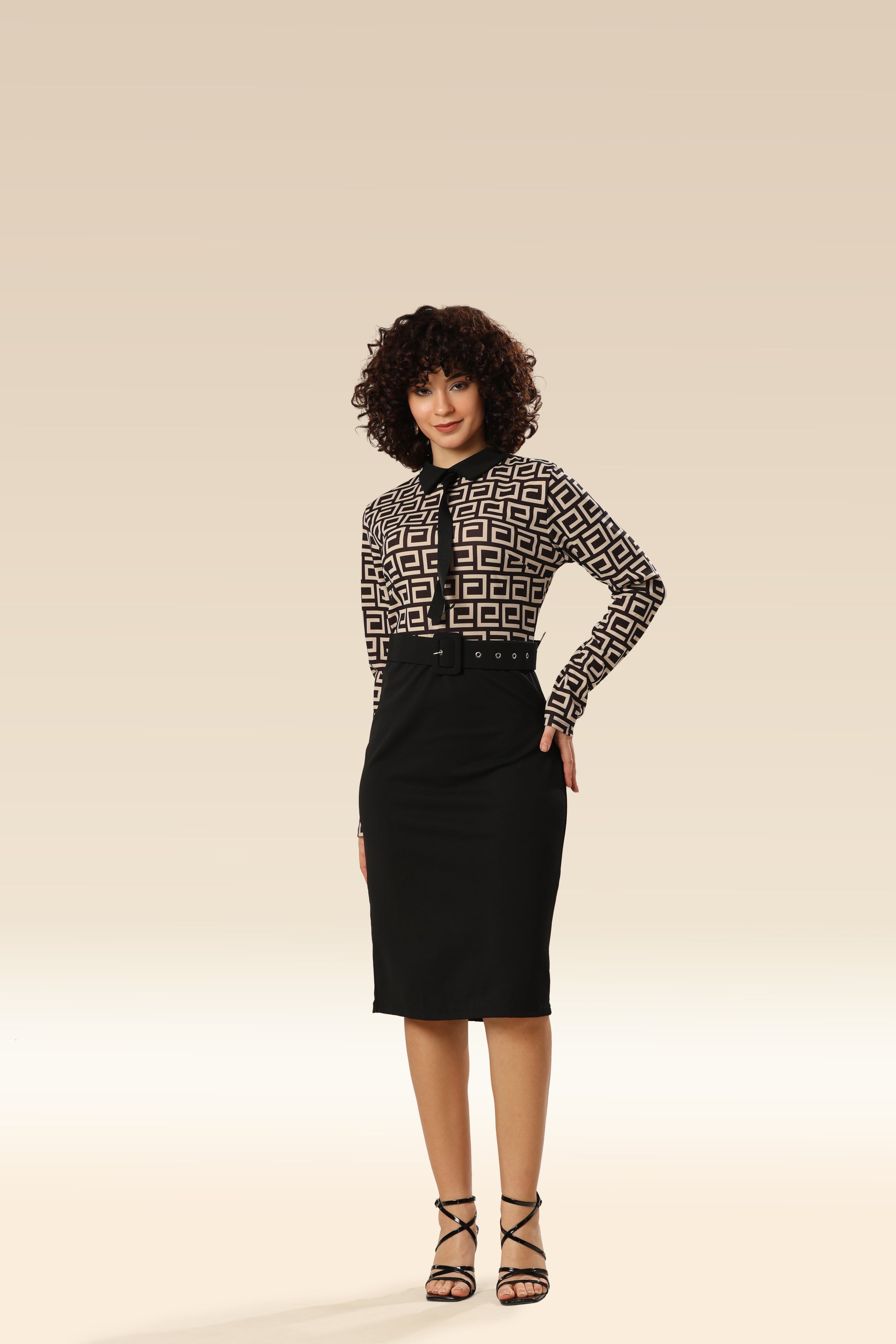 The slim fit midi dress is made from high quality soft and compact fabric, which offers total comfort when wearing it. The fashionable geometric print dress has a high neckline and long sleeves. The skirt is fitted and falls below the knees.