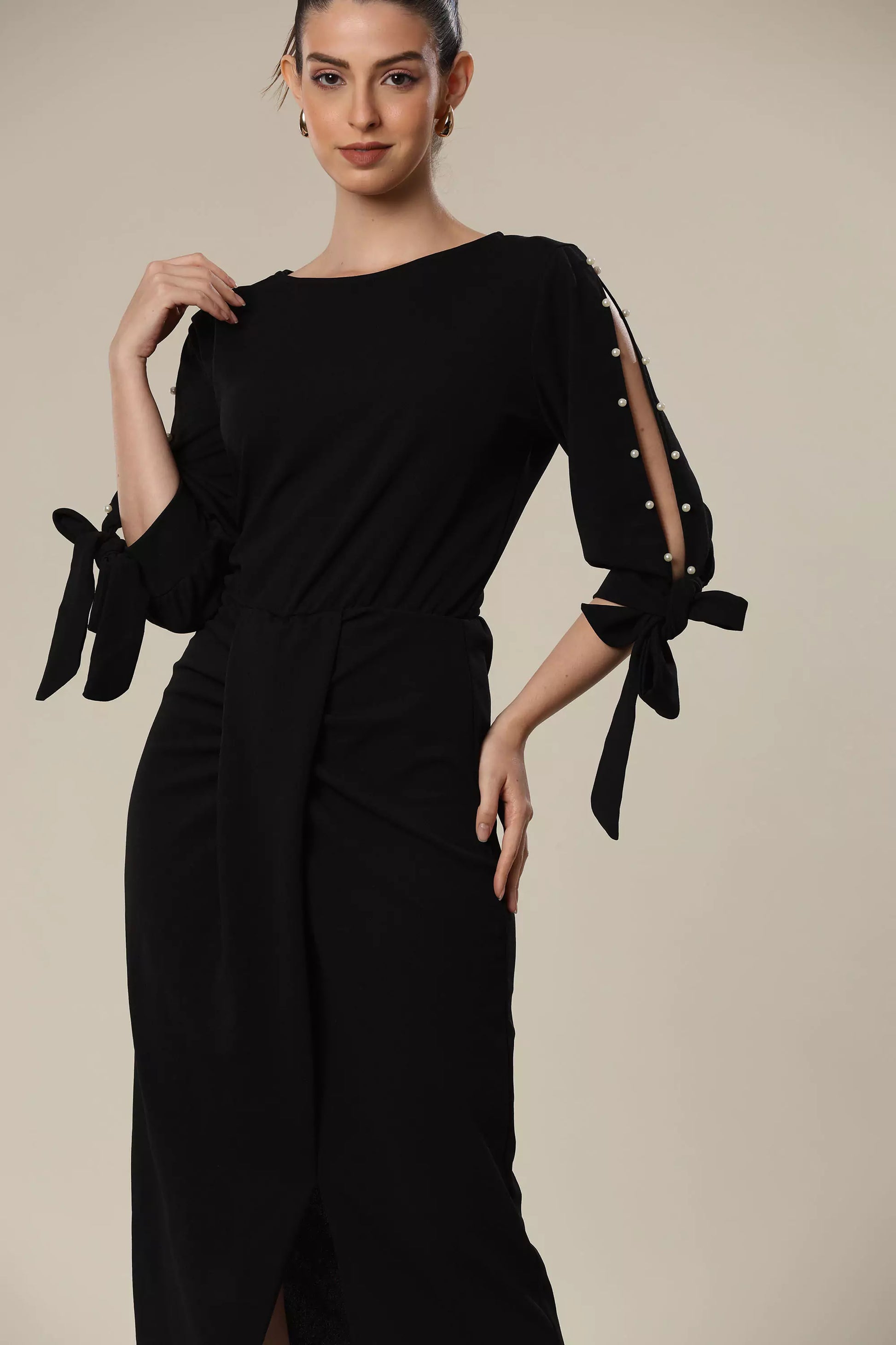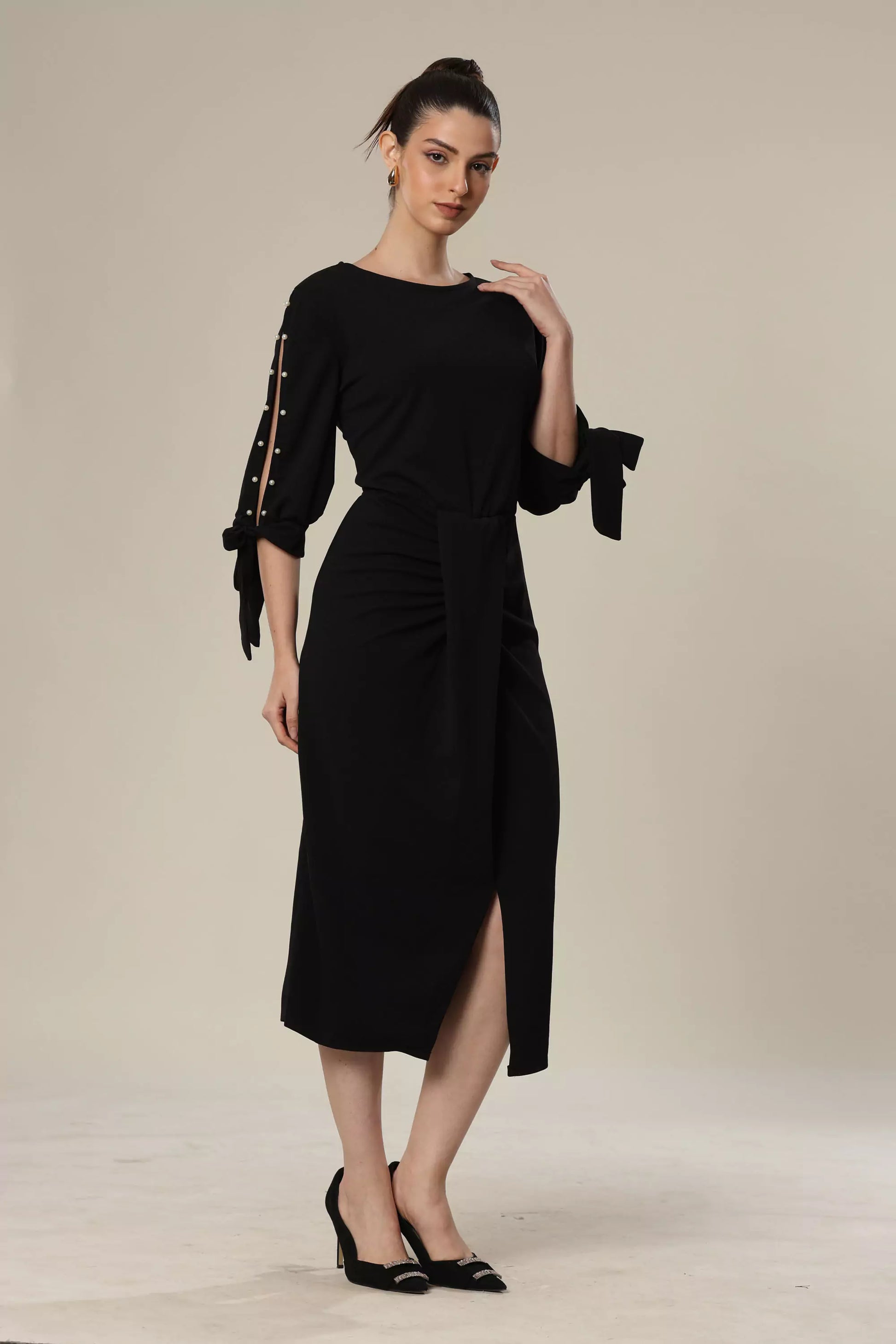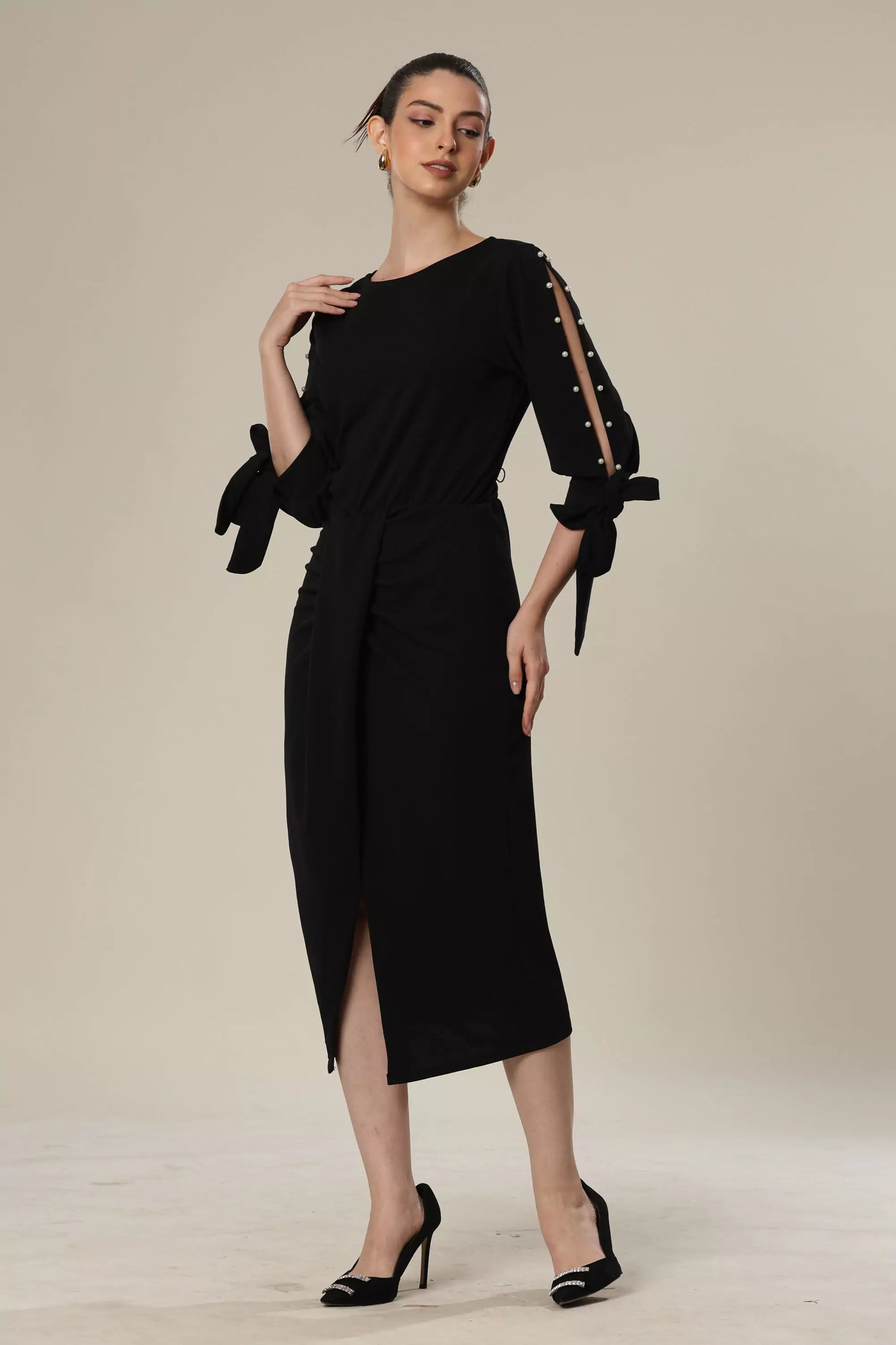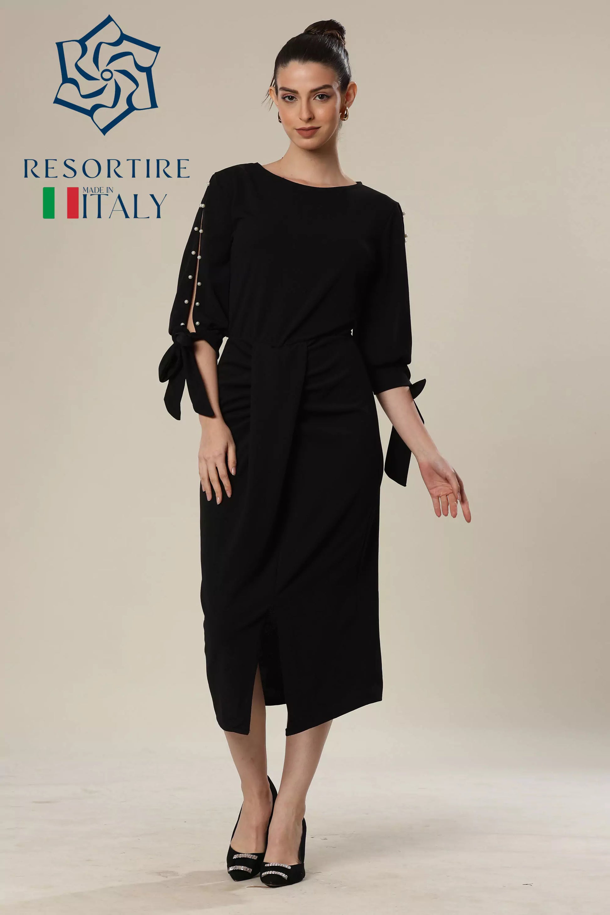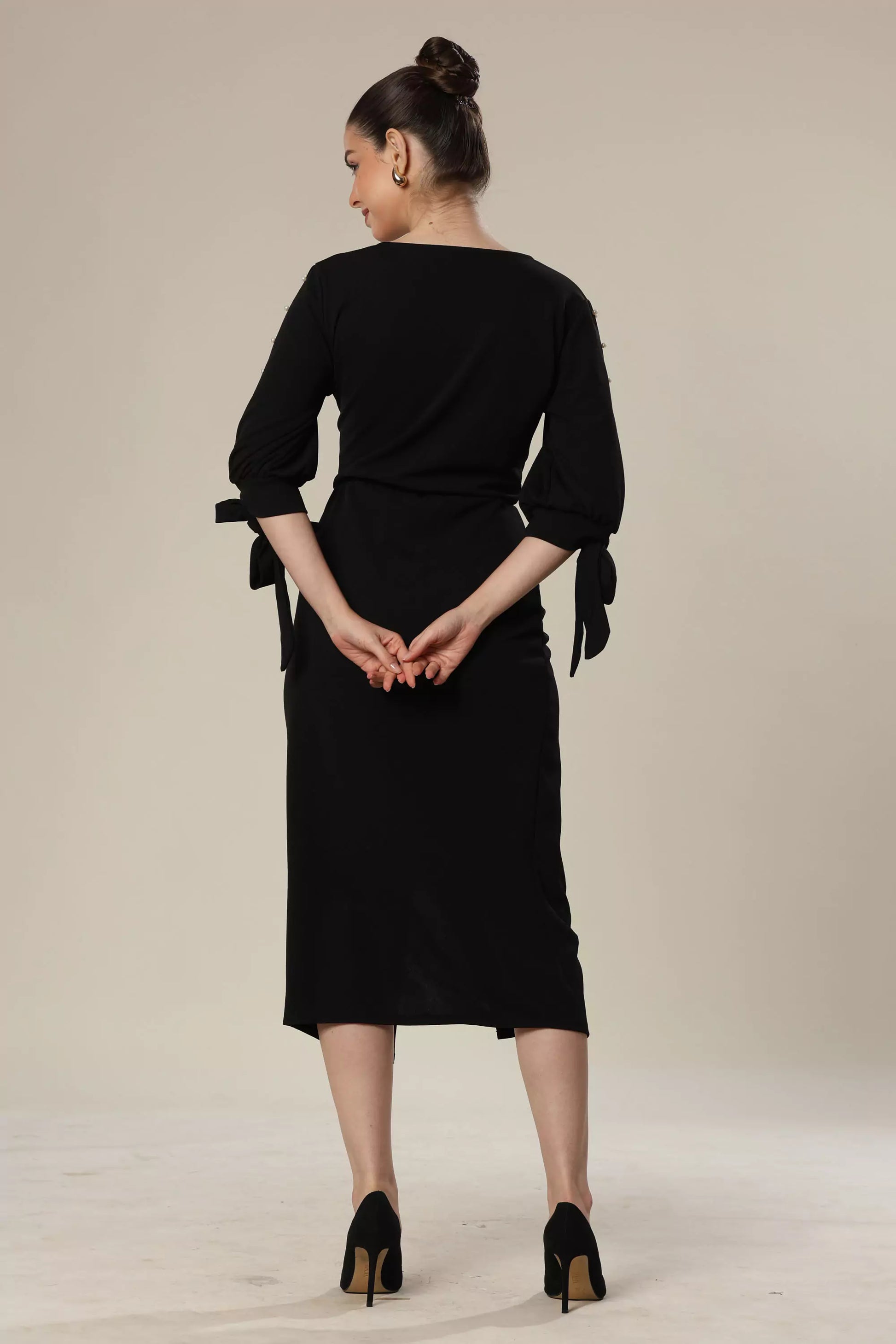 The slim-fit midi dress is made of high-quality fabric, which offers total comfort when wearing. The dress has a round neckline, 3/4 sleeves with a slit, decorative faux pearls and ribbons to tie. The high-waisted skirt is tight-fitting and made of gathered fabric. The length is below the knees.