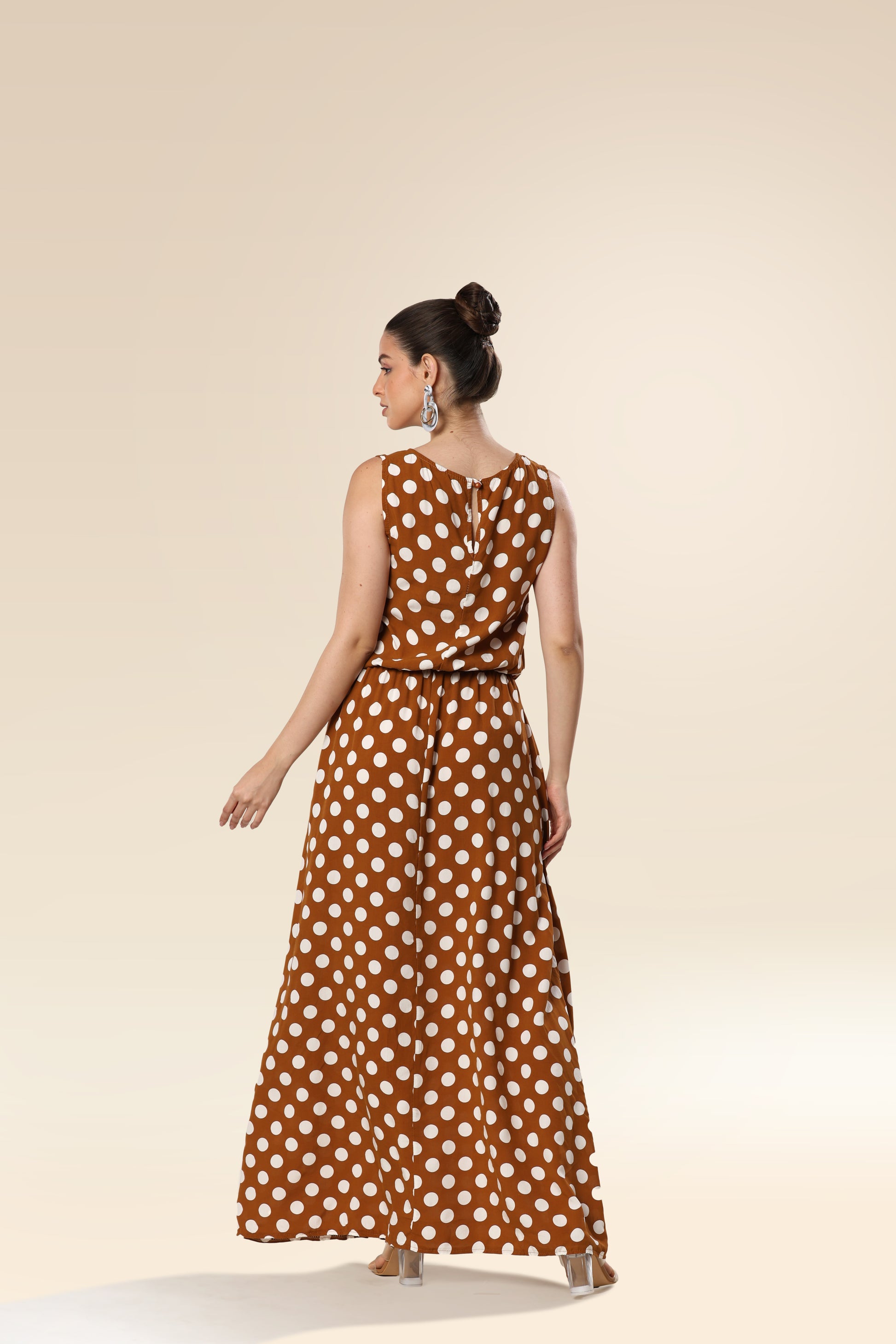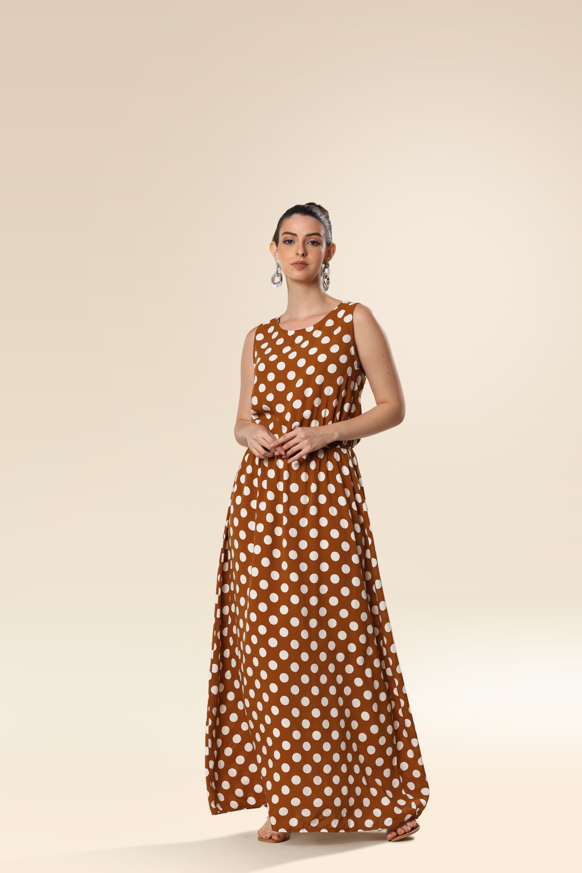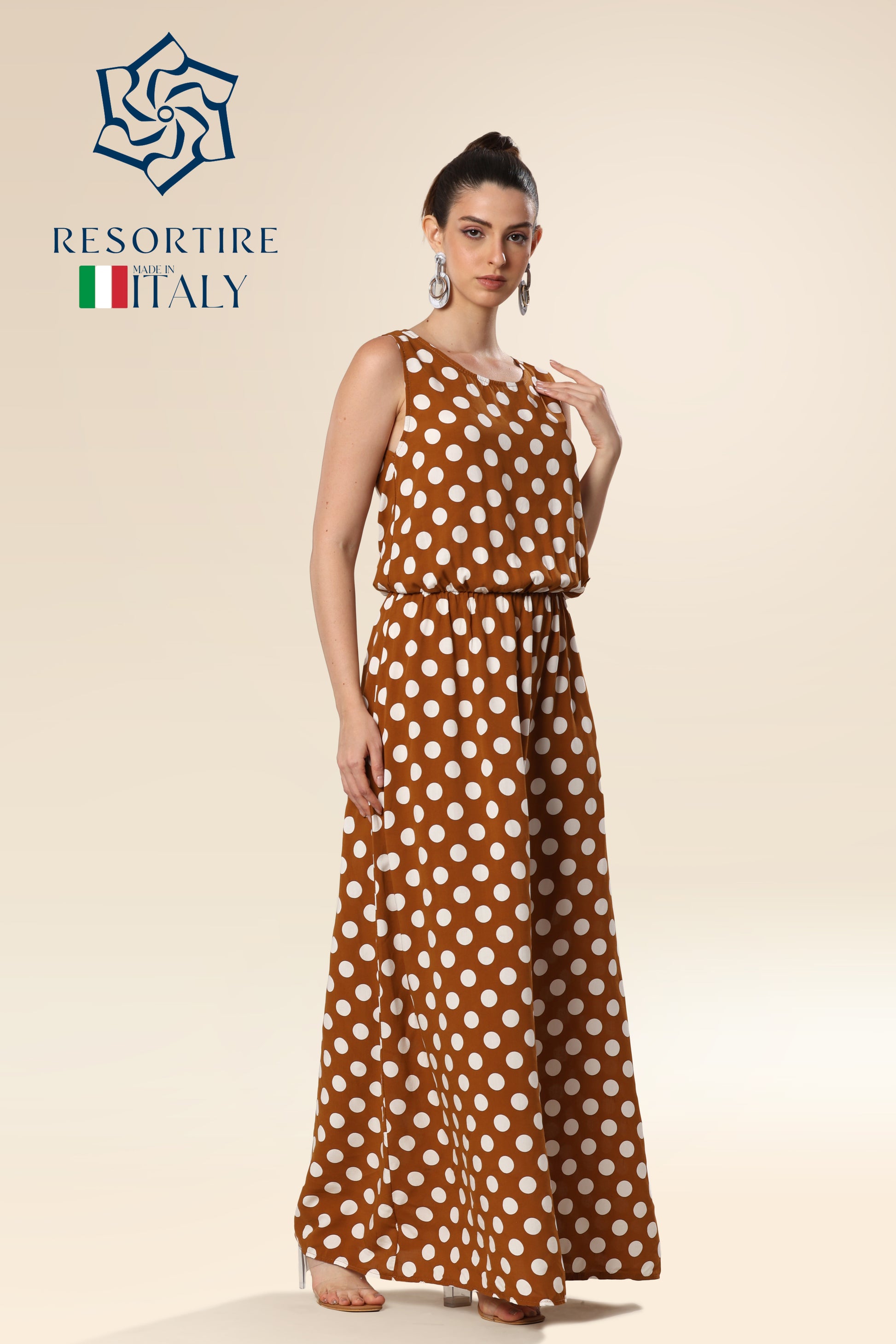 Comfortable and lightweight material. Back button closure. Elastic waist. Long, wide and very flowy skirt. Sleeveless.