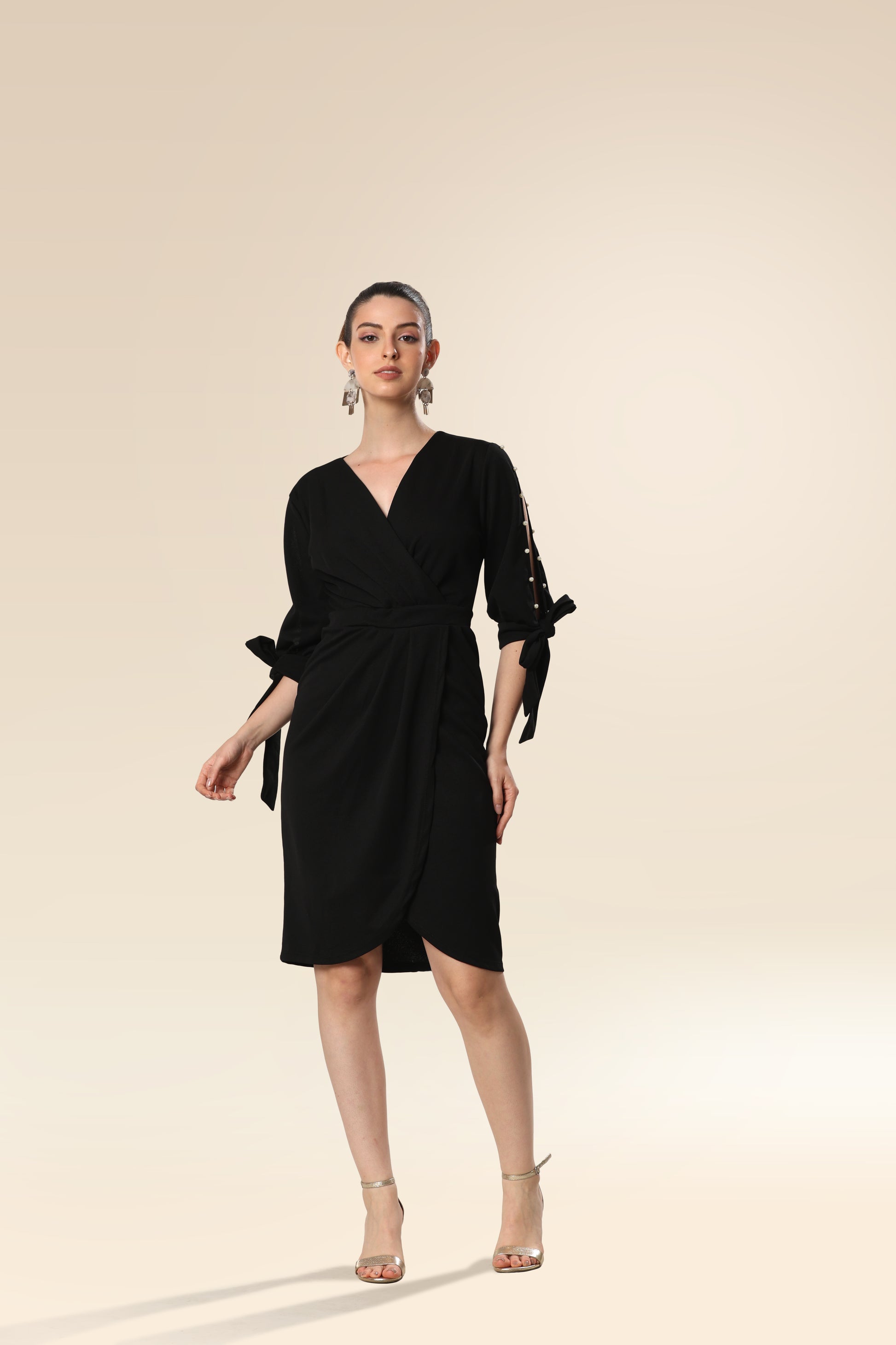 The minidress is made of high-quality, soft and compact fabric, which offers total comfort when wearing it. The top is loose, it has a wrap neckline and 3/4 sleeves with opening and pearl detail. The solid color skirt is wrapped and reaches to the knees.