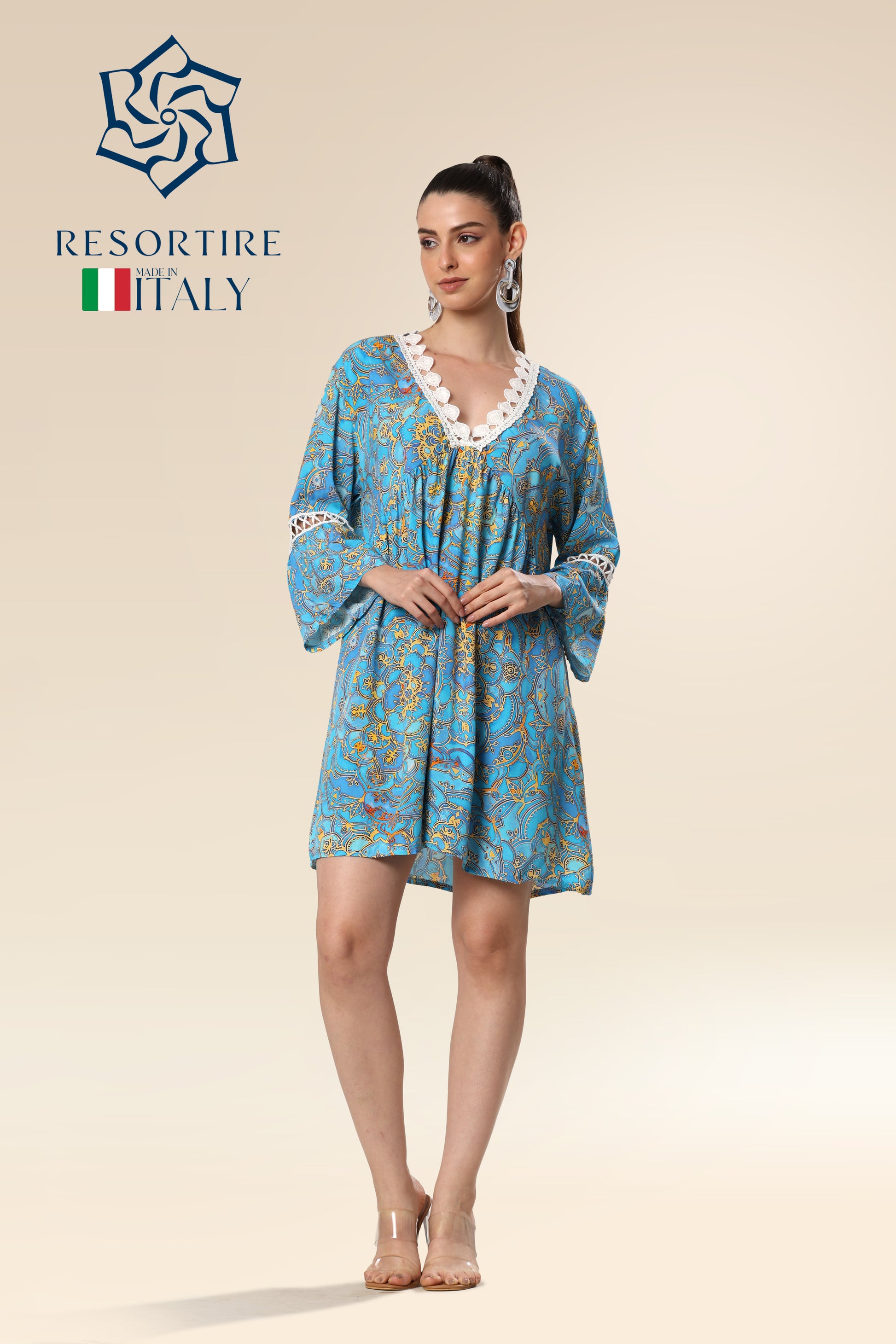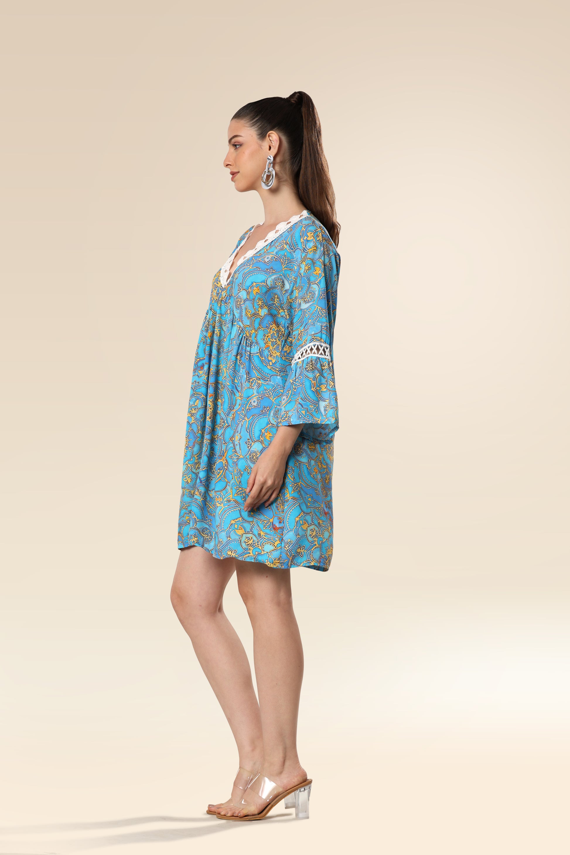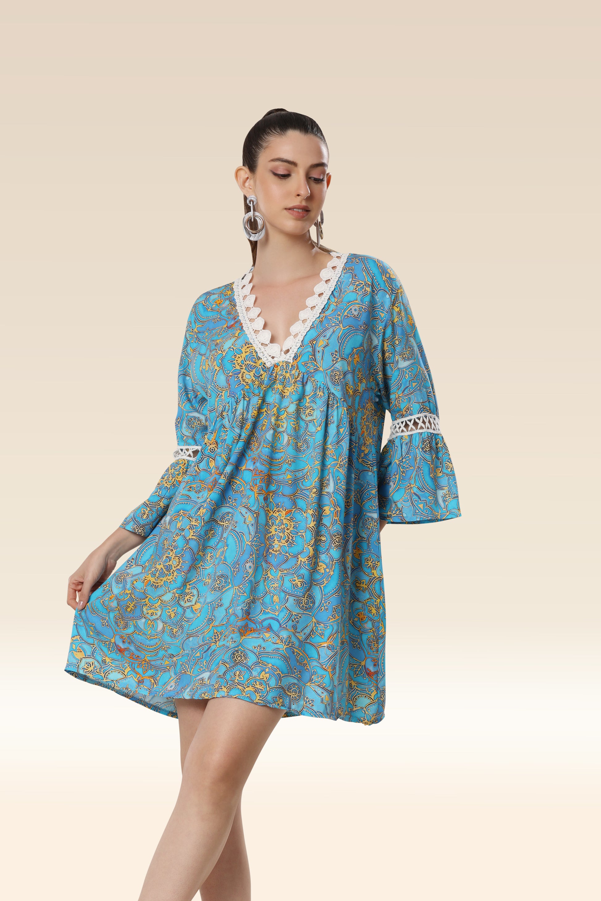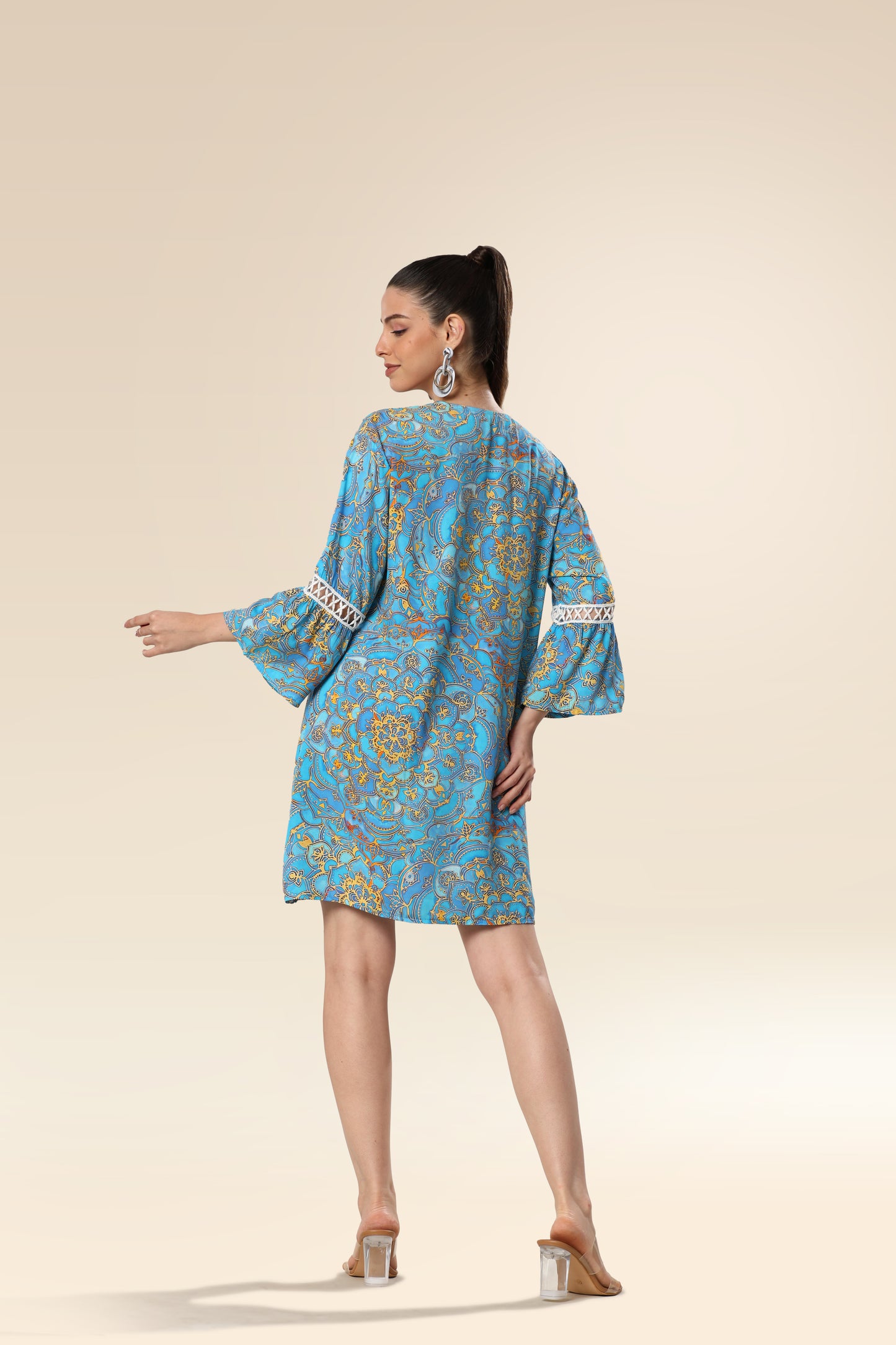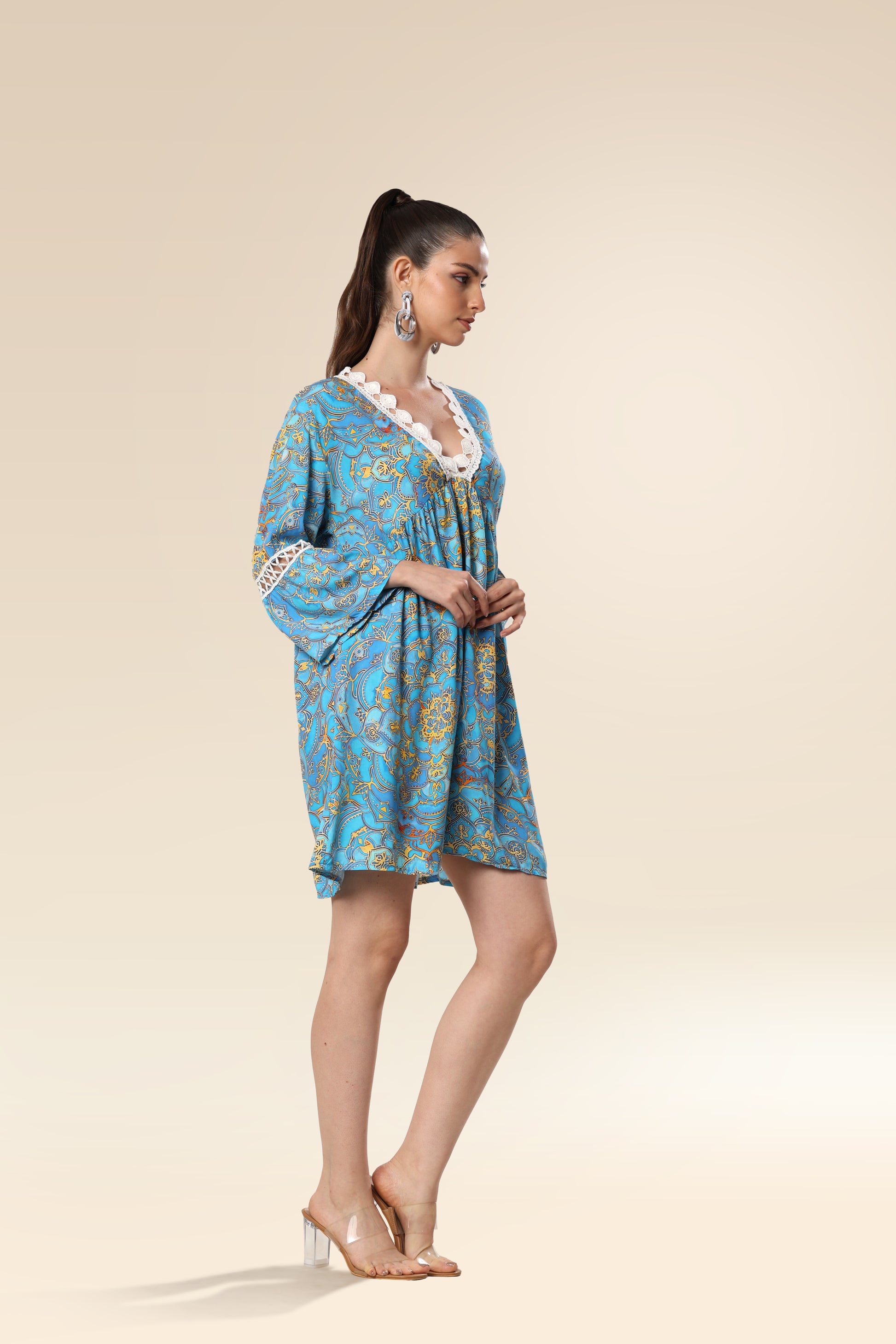 The mini dress is made of high-quality, soft compact fabric, which offers perfect wearing comfort. The multicolored print dress has a deep V-neckline with crochet details and 3/4 sleeves with ruffles. The dress is loose fitting and reaches mid-thigh.