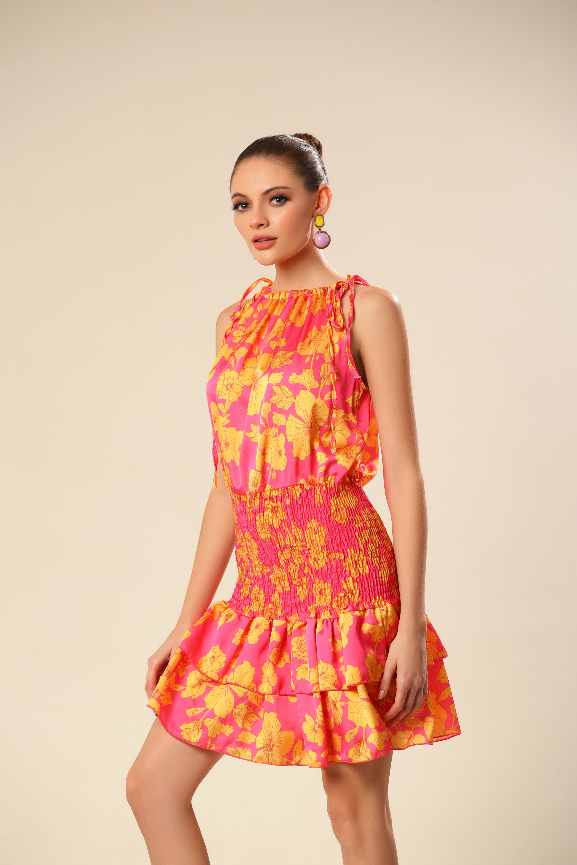 The mini dress is made of high quality imitation satin, which offers complete comfort when worn. The printed mini dress has a round neckline and thin shoulder straps. The skirt with elastic and ruffles reaches to the middle of the thighs.