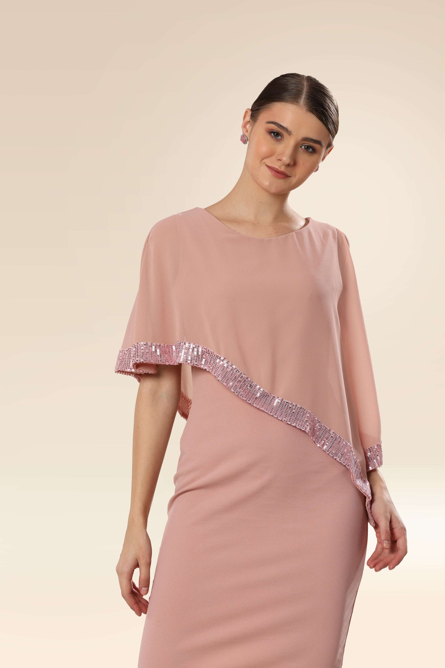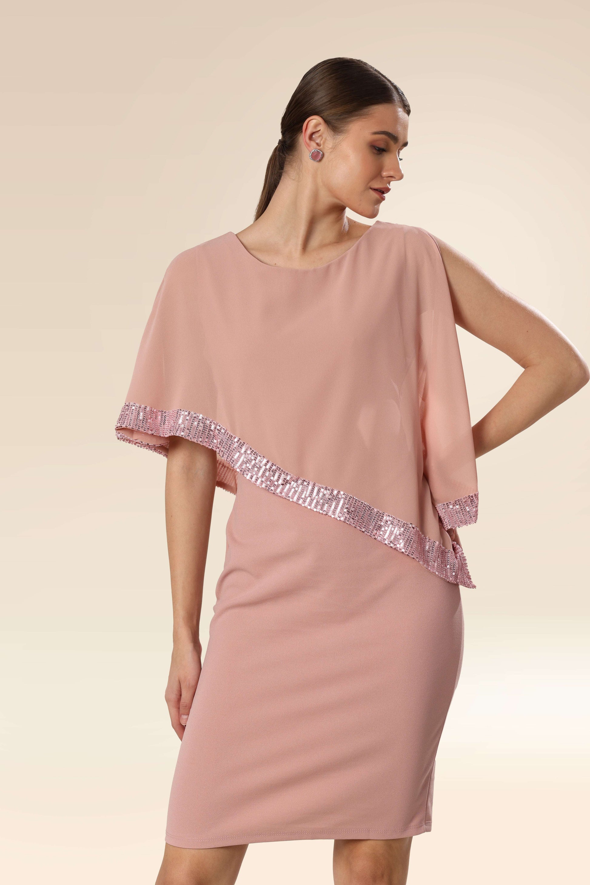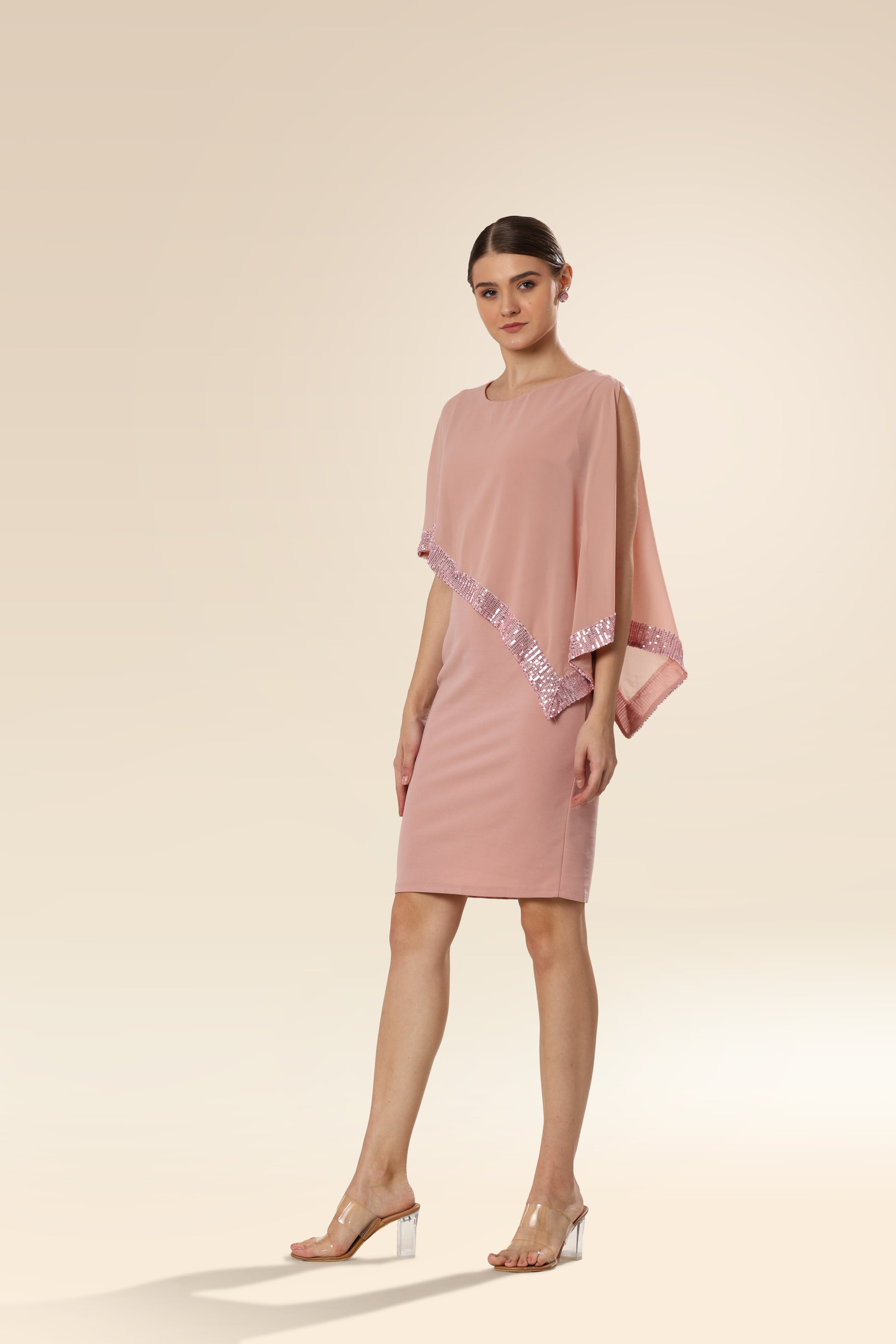 Machine wash. Soft and stretchy fabric. Round neckline. Hidden zipper closure on the side. With transparent cape finished with sequin detail.