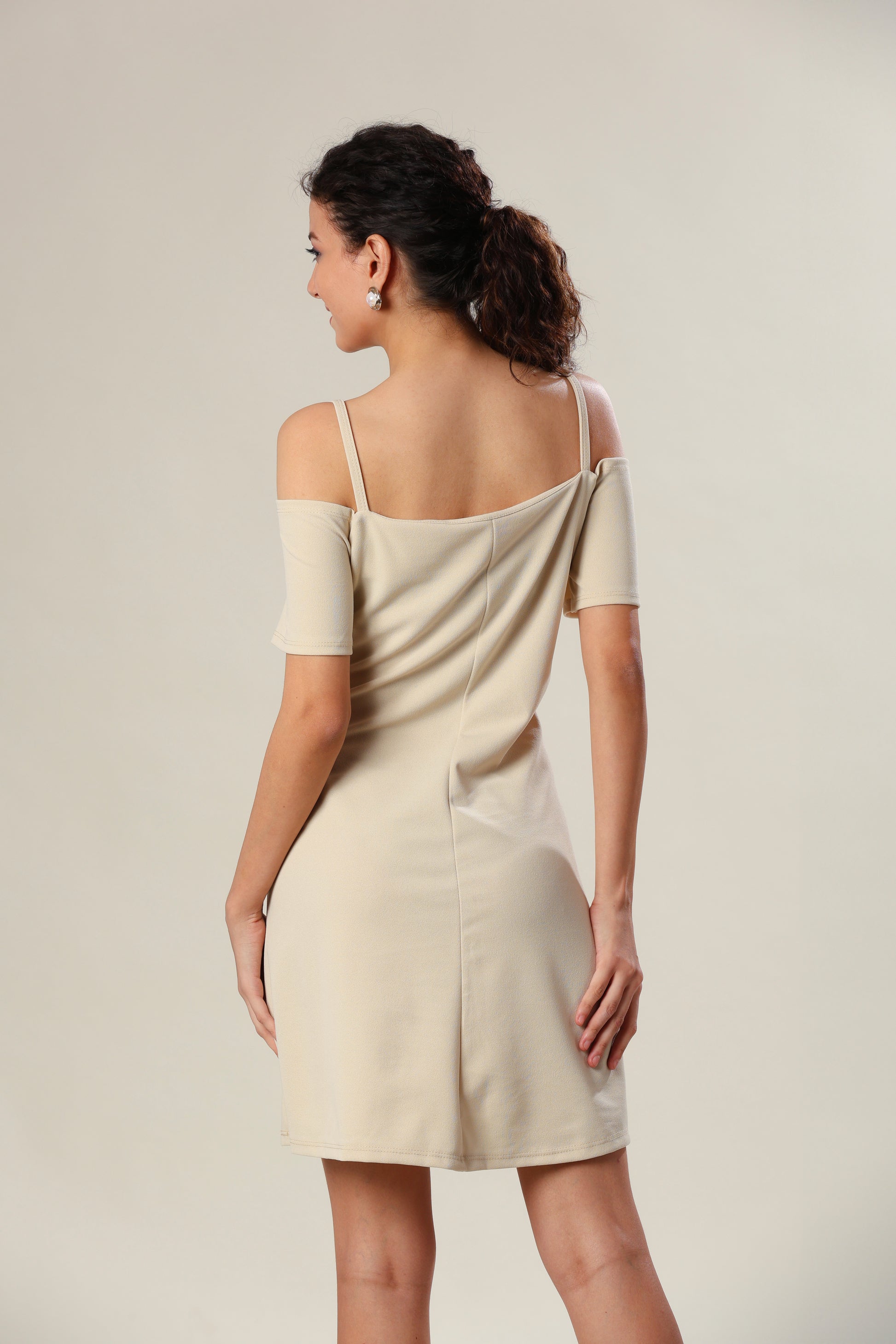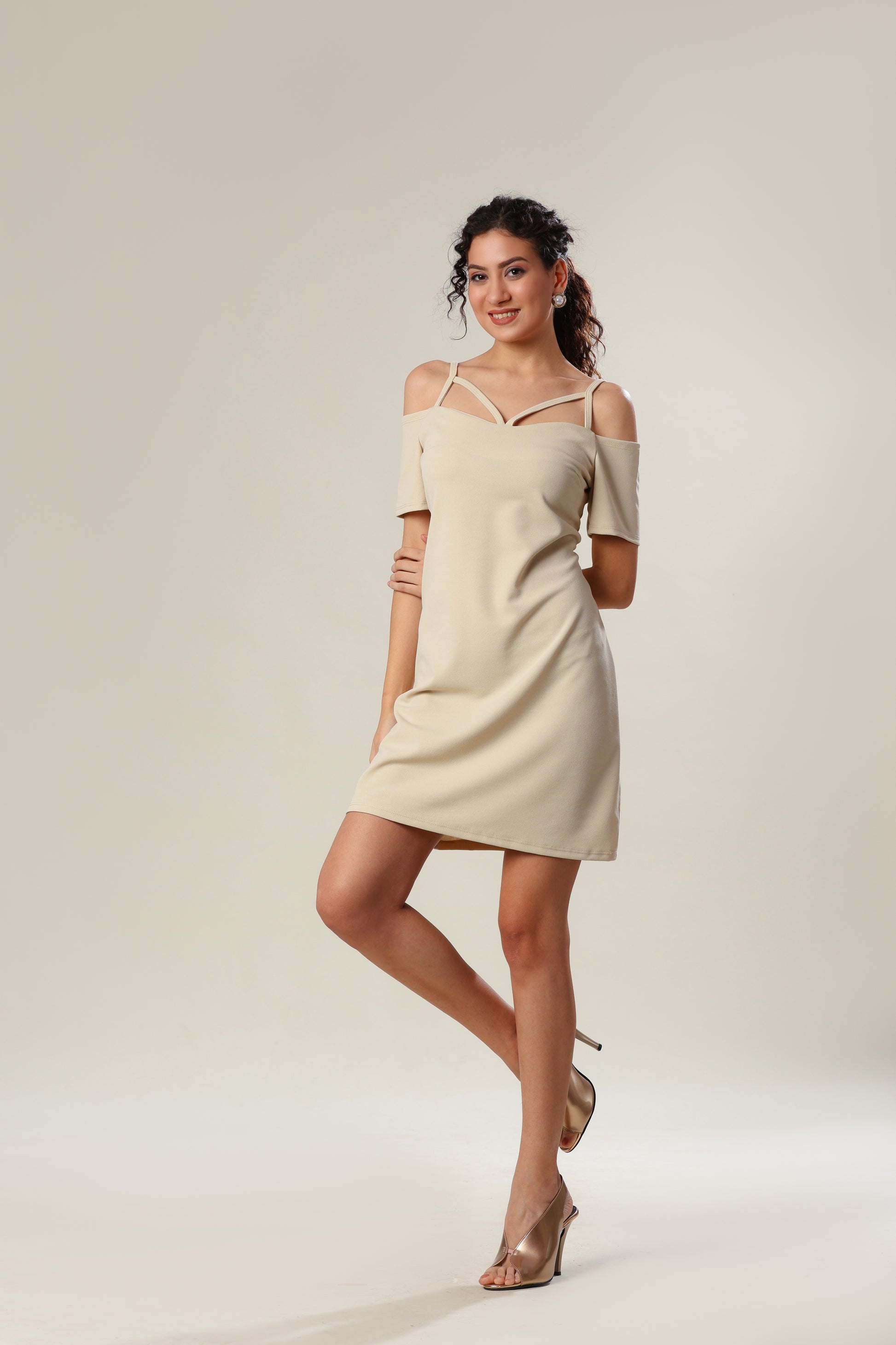 The mini dress is made of soft and compact fabric of high quality, which offers complete comfort when worn. The dress has bare shoulders, short sleeves and suspenders. The skirt is loose and reaches to the middle of the thighs.