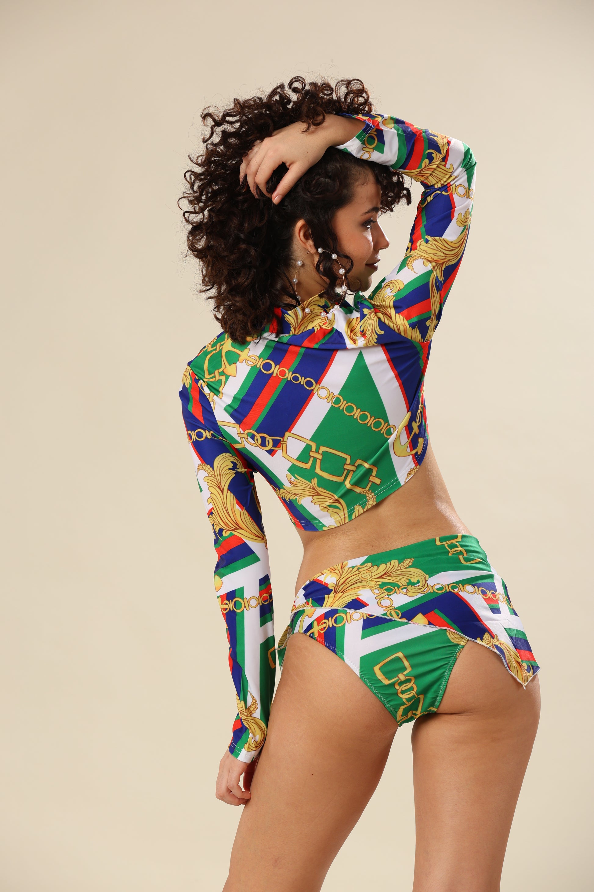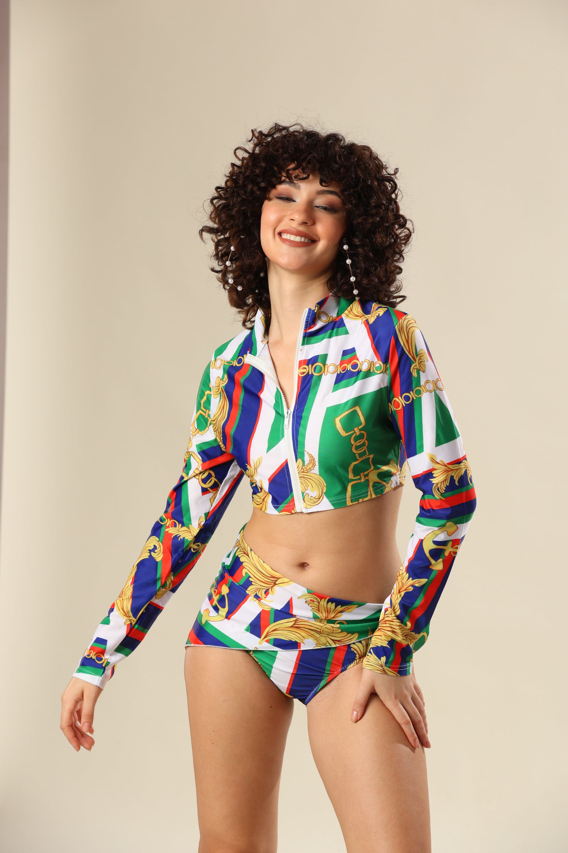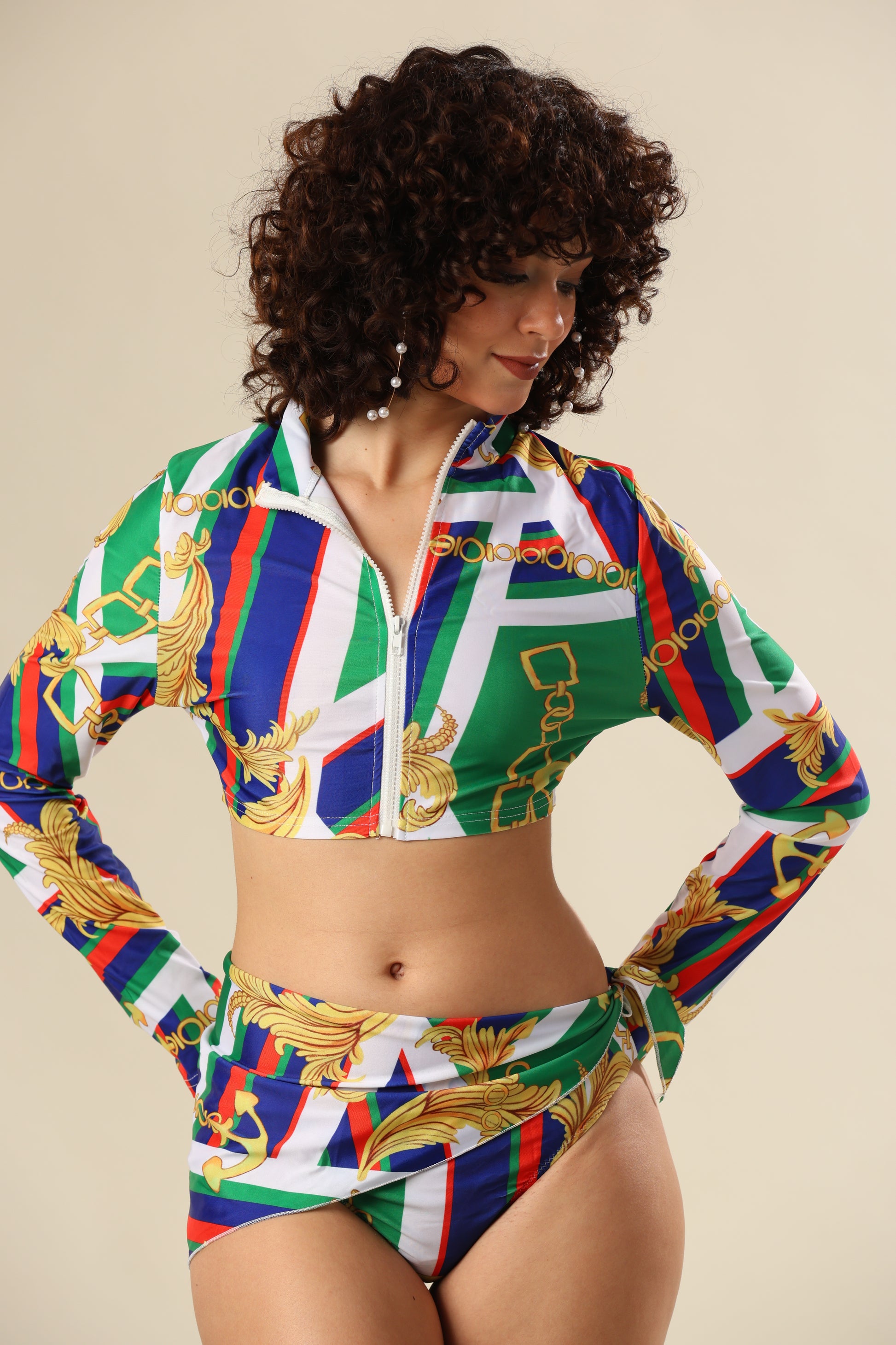 The bikini set offers a versatile styling option with vibrant print for beach vibes.