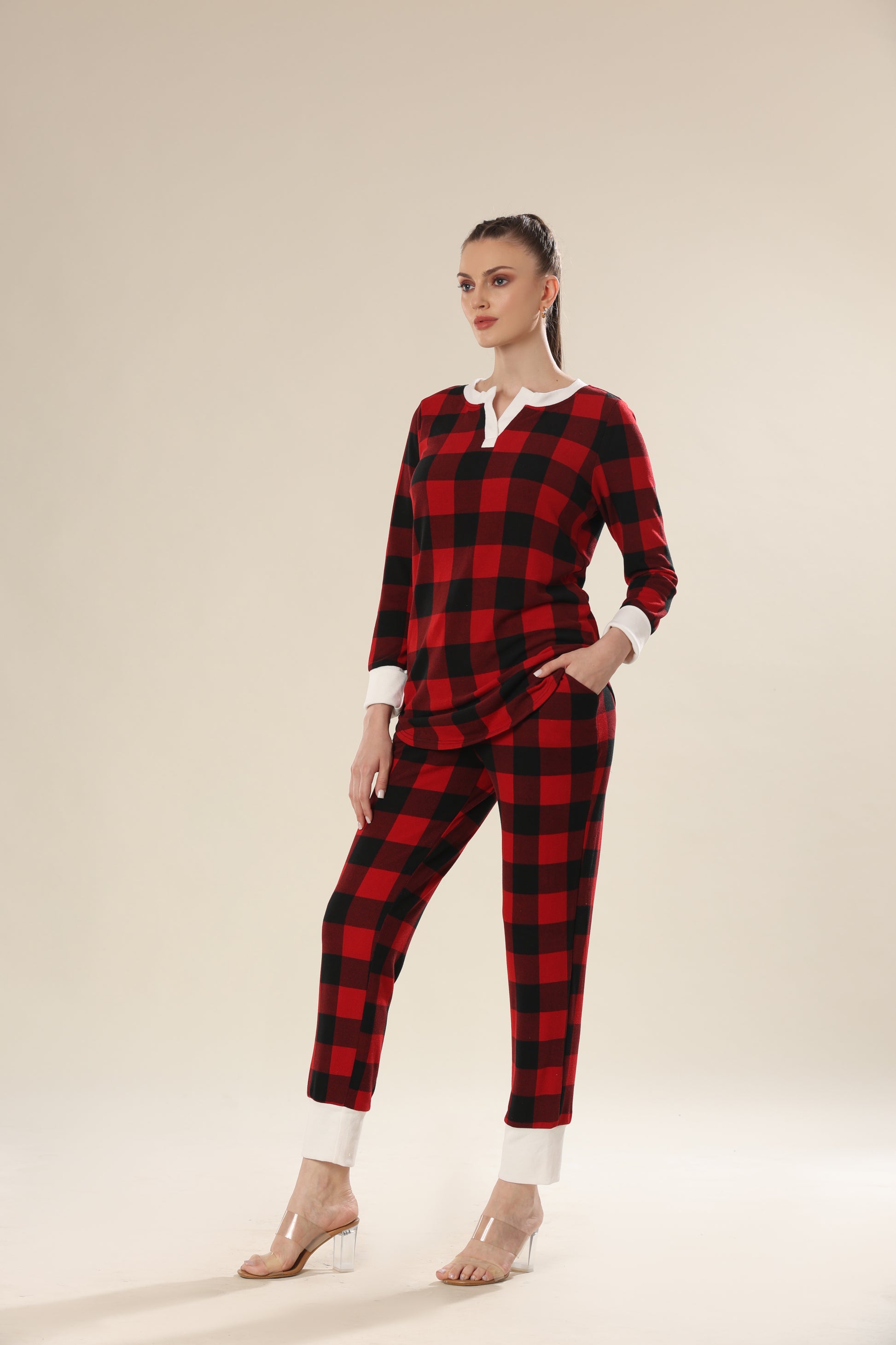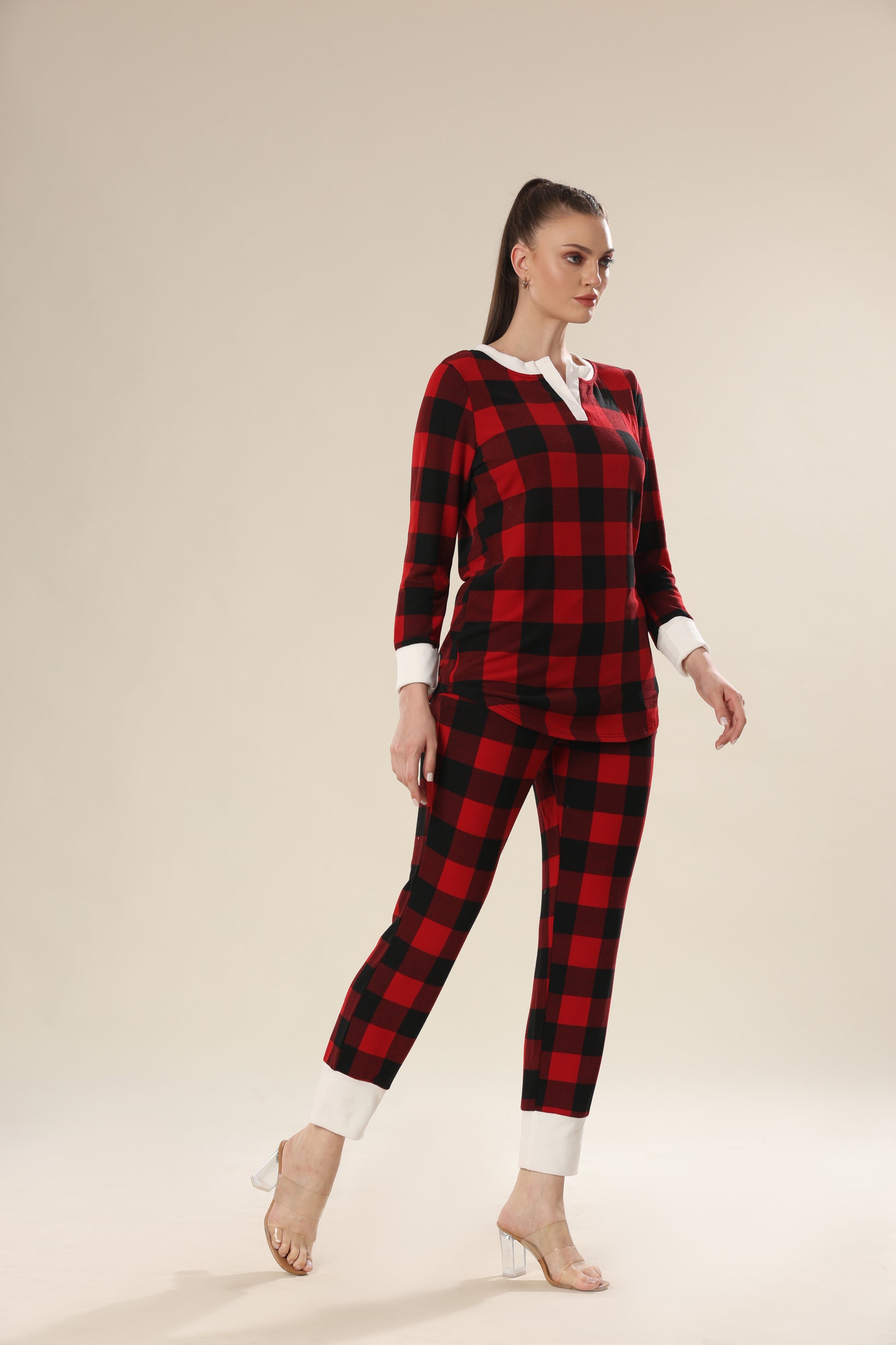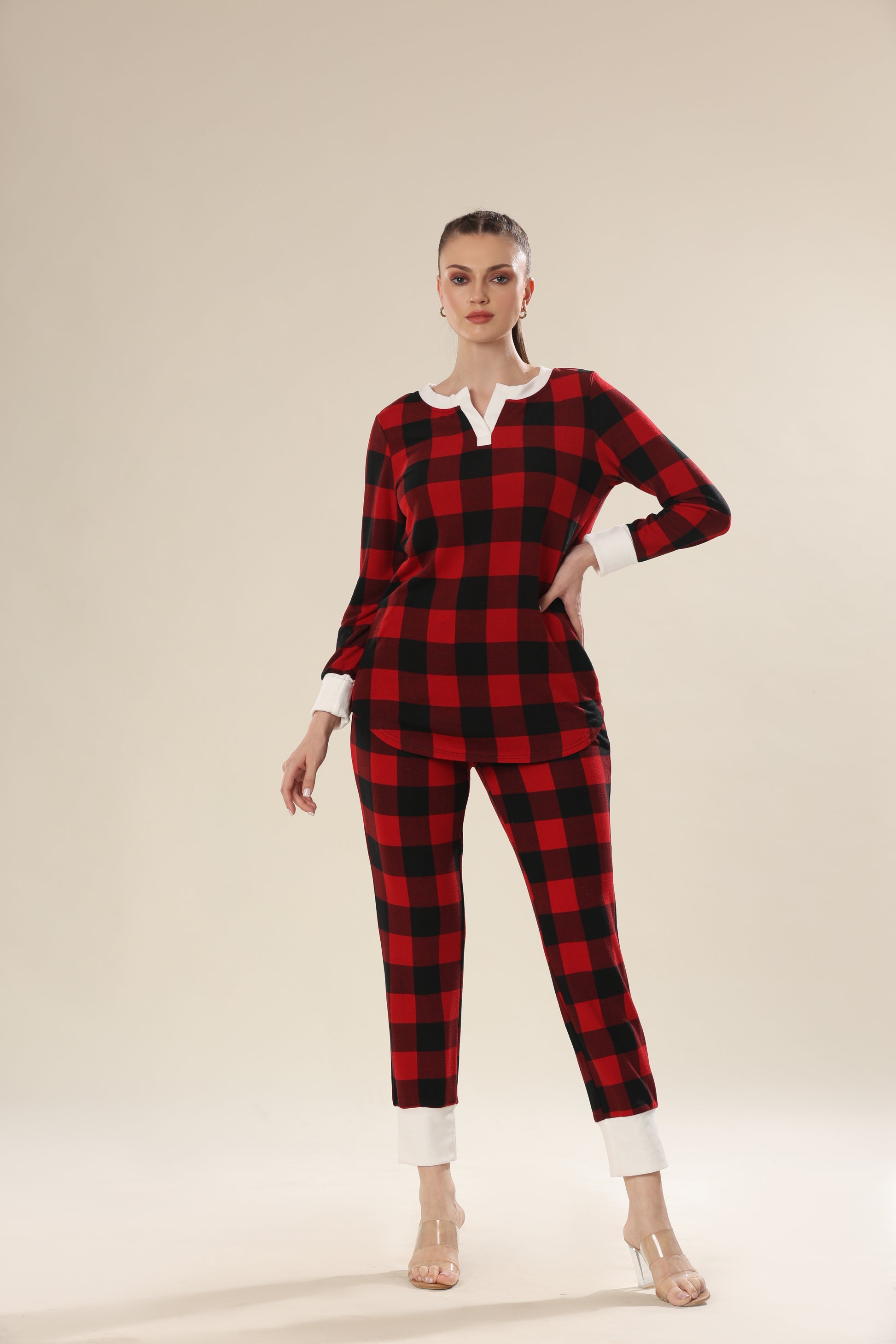 Fiery red plaid print long sleeve top & pants night wear .