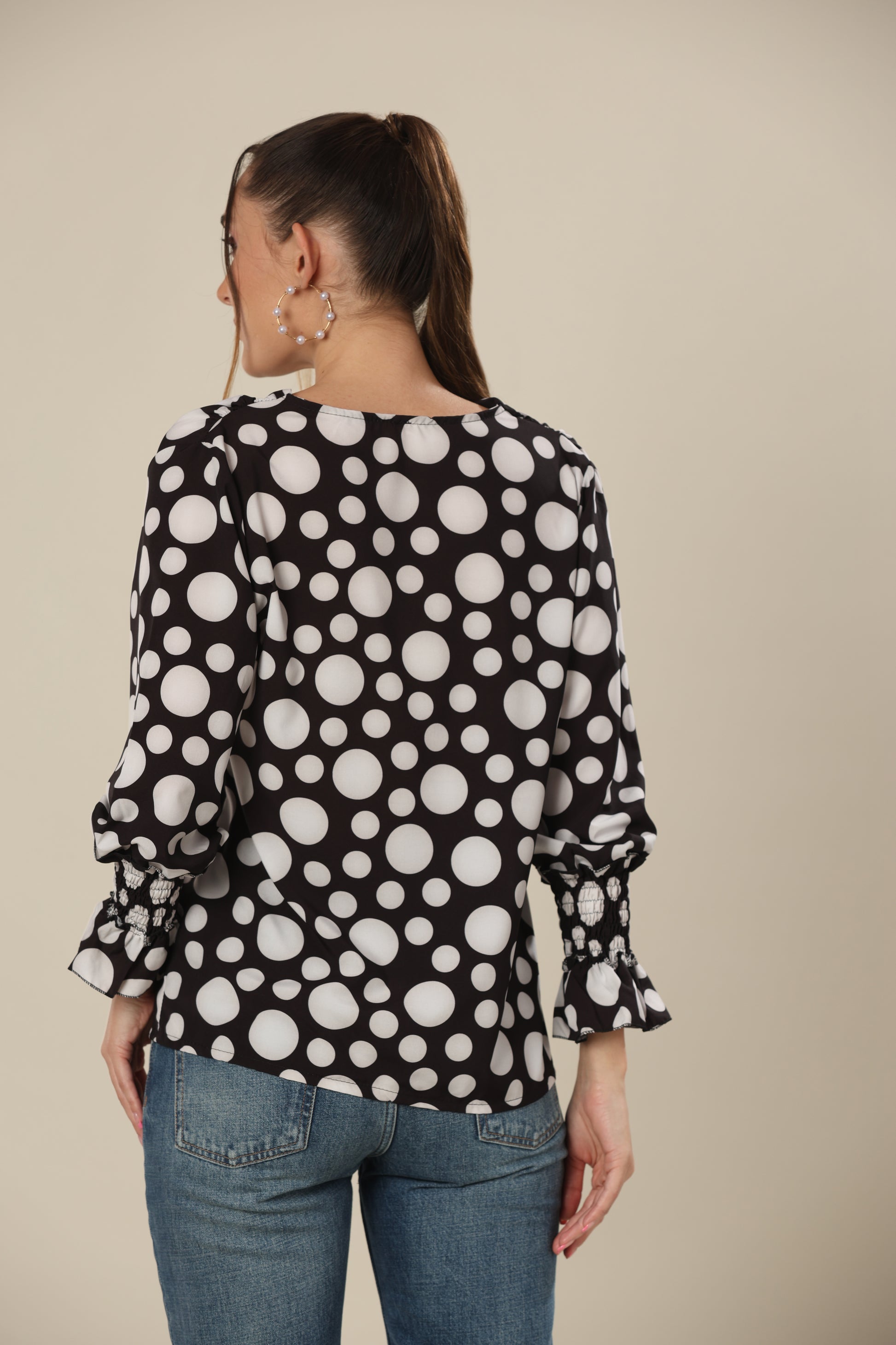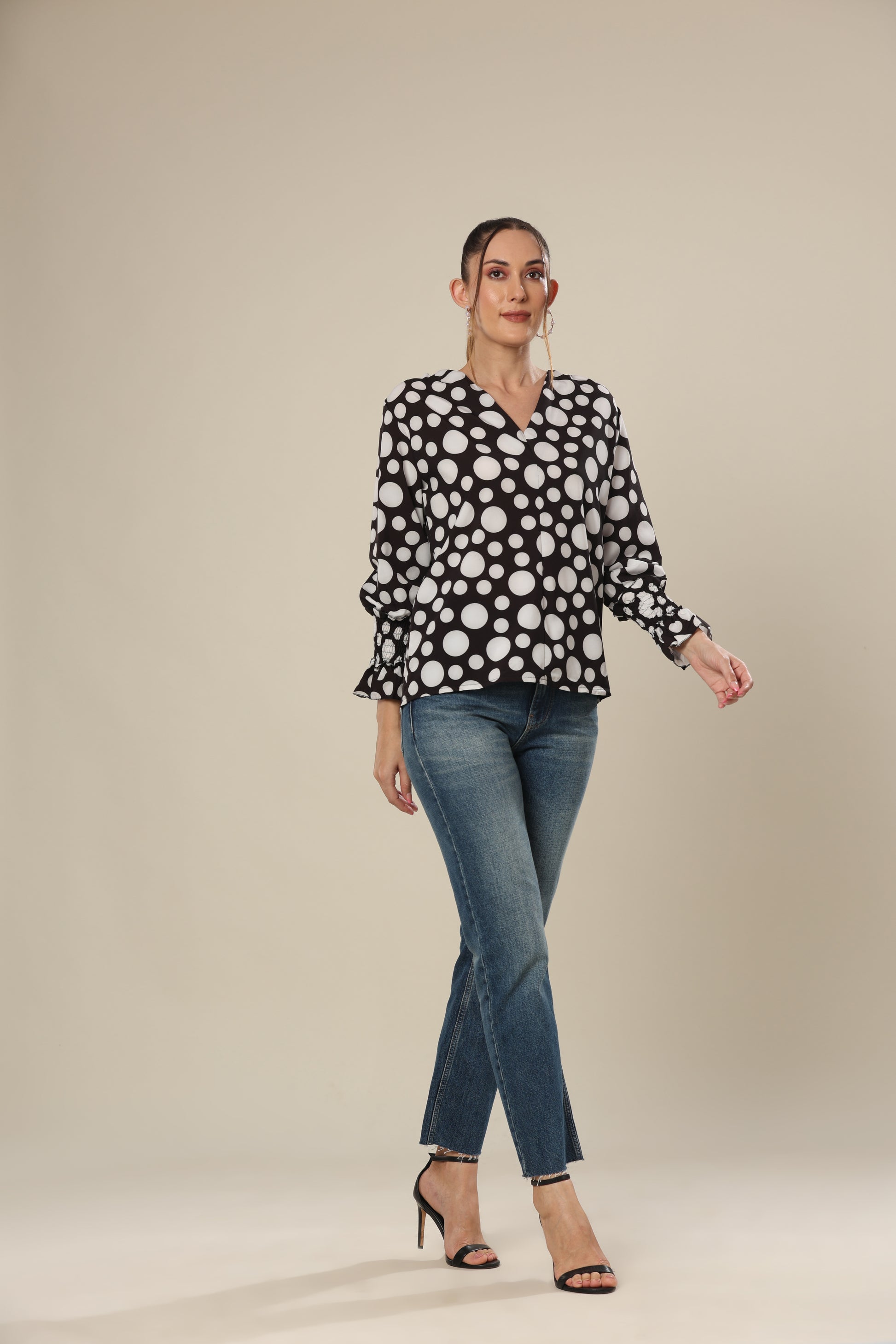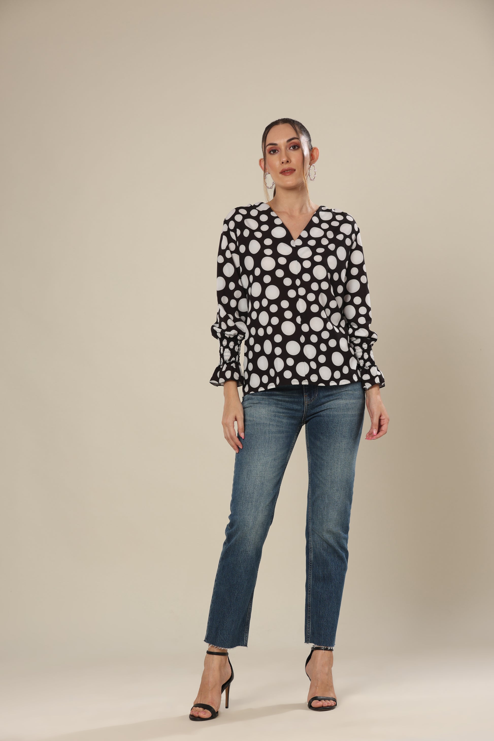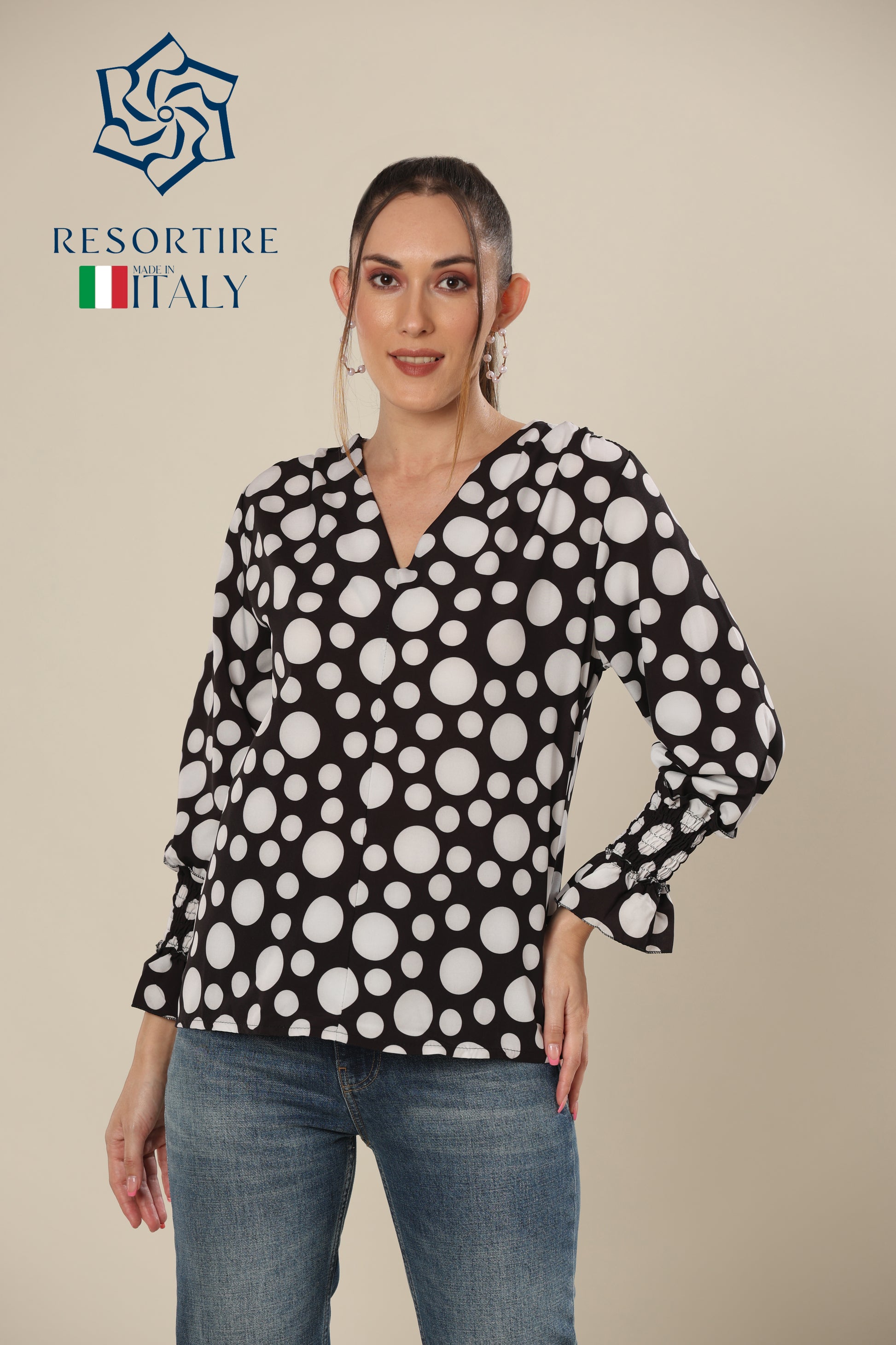 The Top is made of high-quality imitation satin, which offers total comfort. The Top with a modern polka dot print has a "V" neck and long sleeves that are compressed in the wrist area. The Top is loose fitting.