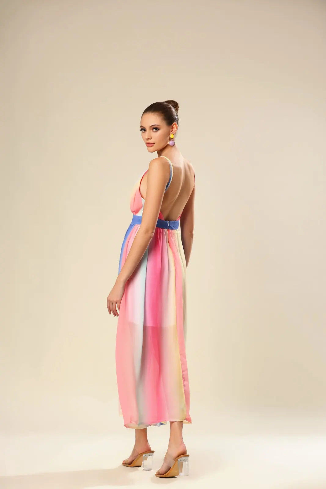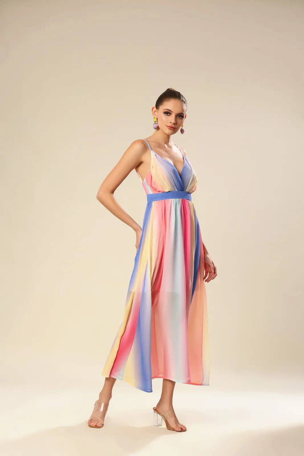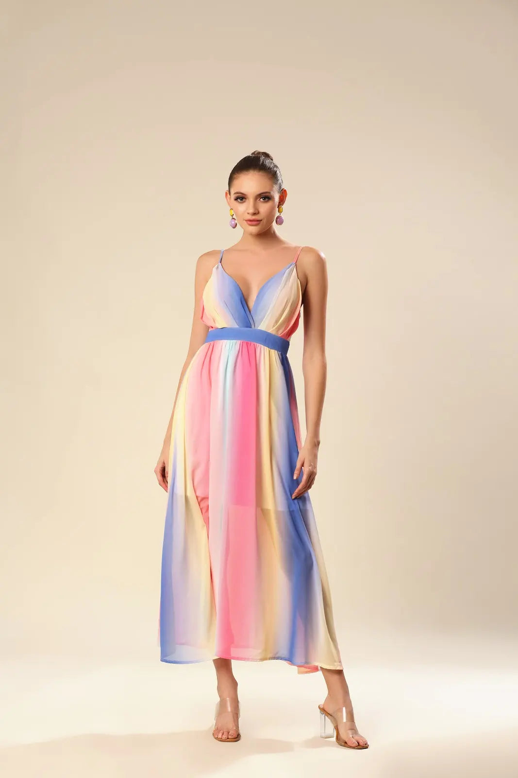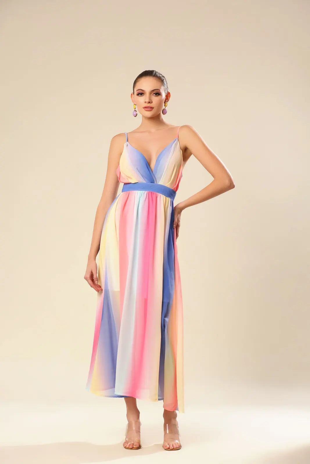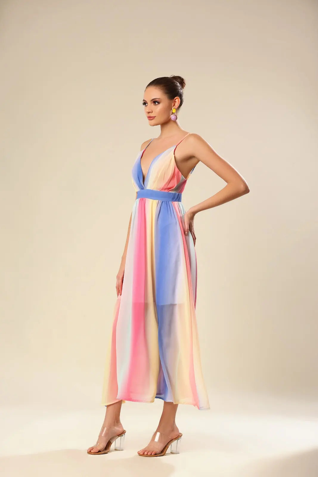 Embrace vibrant elegance with the Rainbow Dreams Maxi Dress. This stunning dress features a mesmerizing array of pastel colors, creating a beautiful gradient effect that’s perfect for any special occasion.