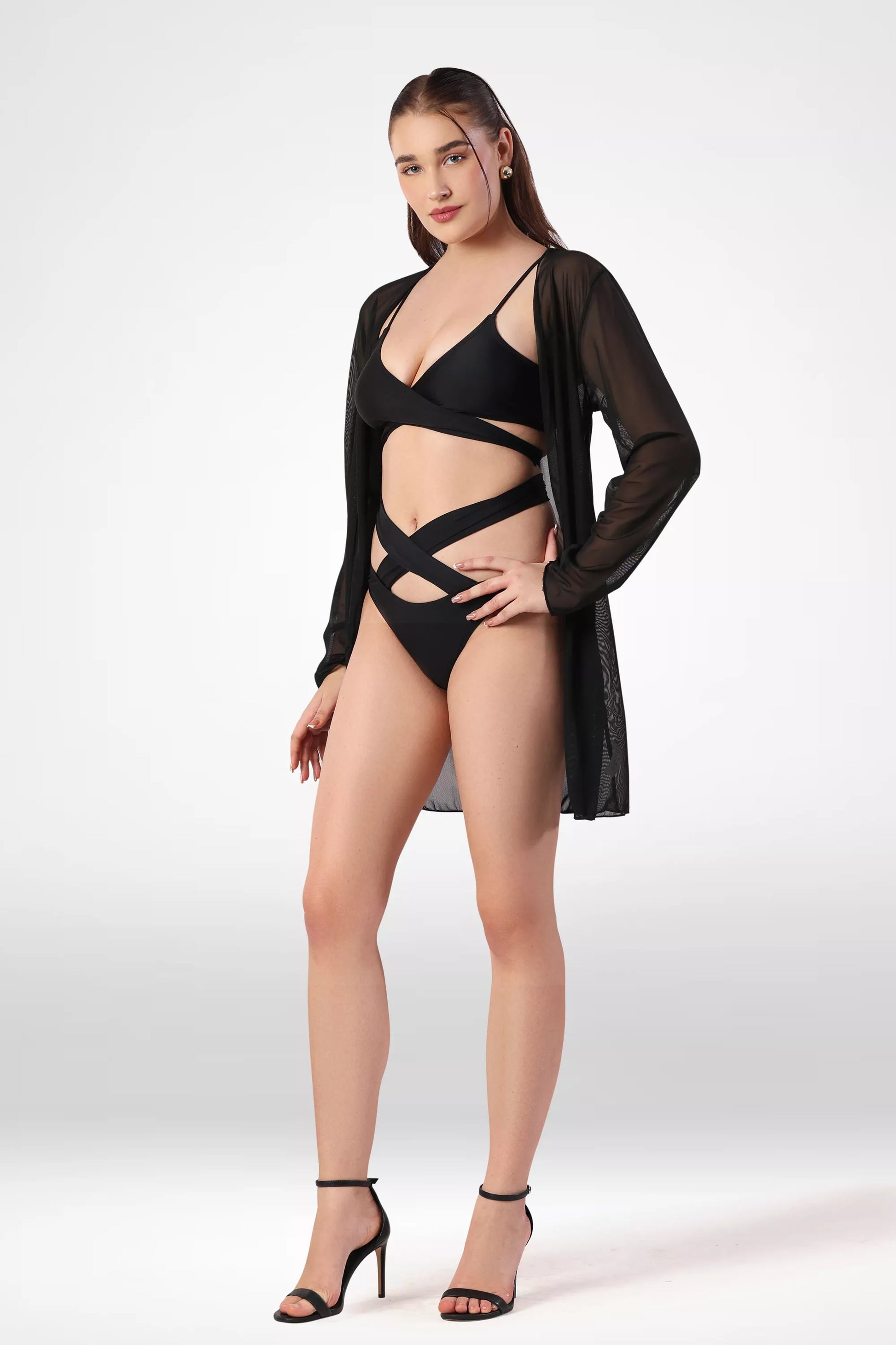 Crafted in smooth, stretch-fit premium fabric, this set blends comfort with striking modern design. The sleek black tone brings timeless elegance, while the wrap elements add a dramatic, runway-inspired edge—perfect for resort vacations, luxury poolside moments, and destination getaways.
