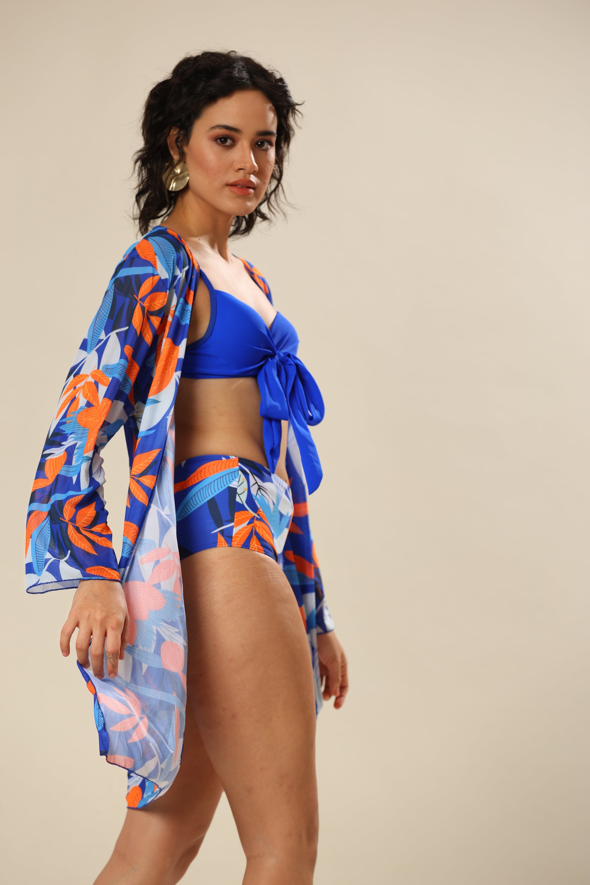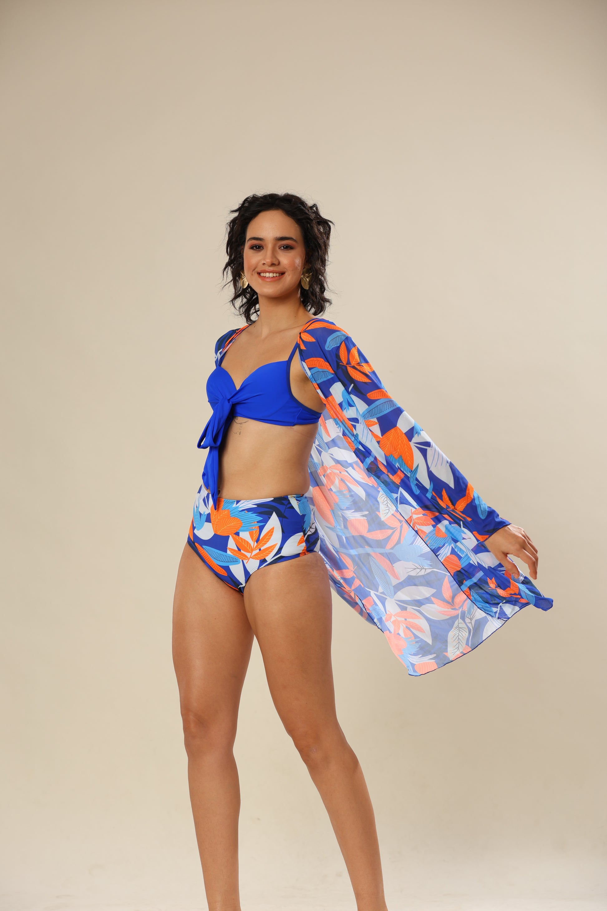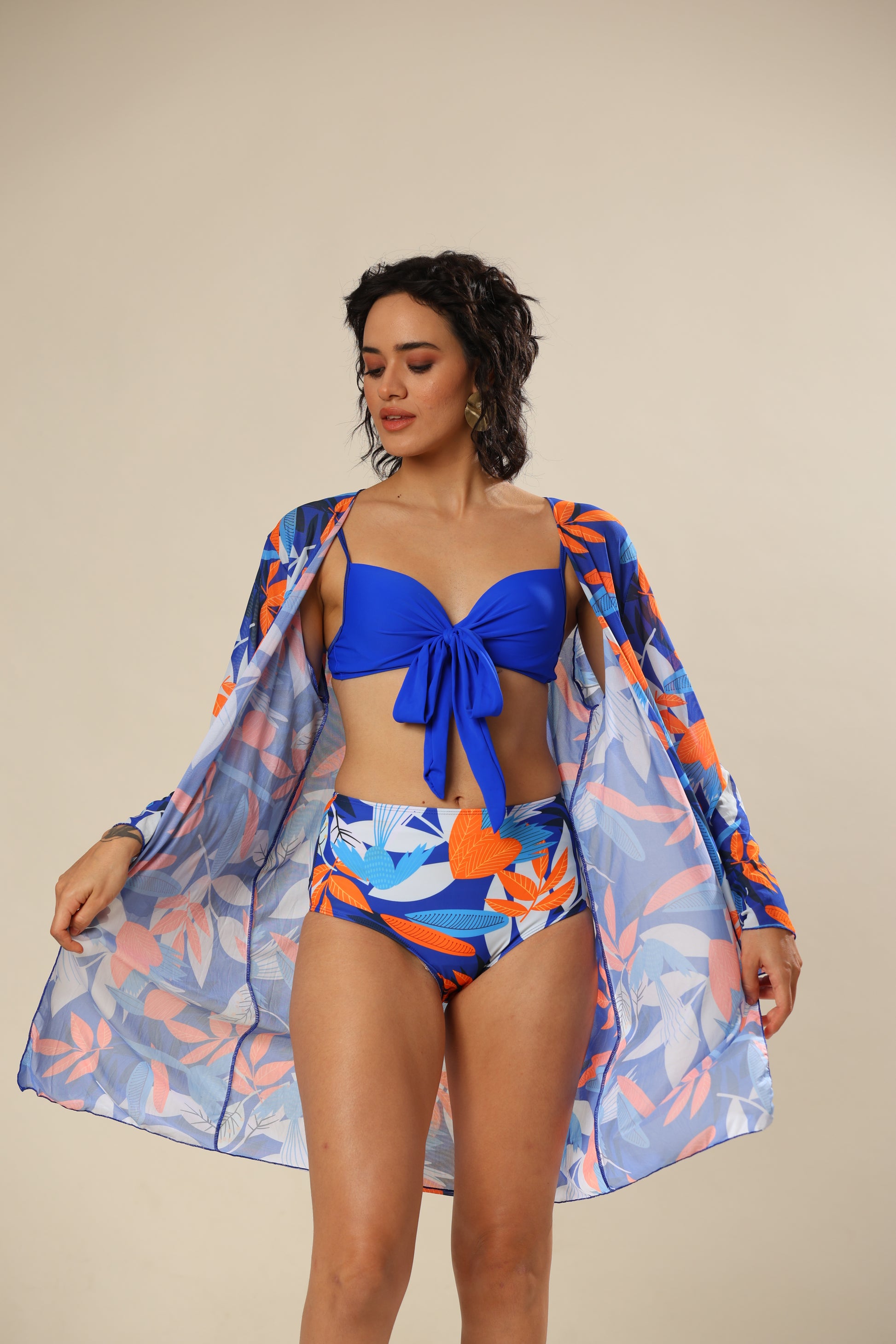 High -waist bikini set with kont top & cover-up.