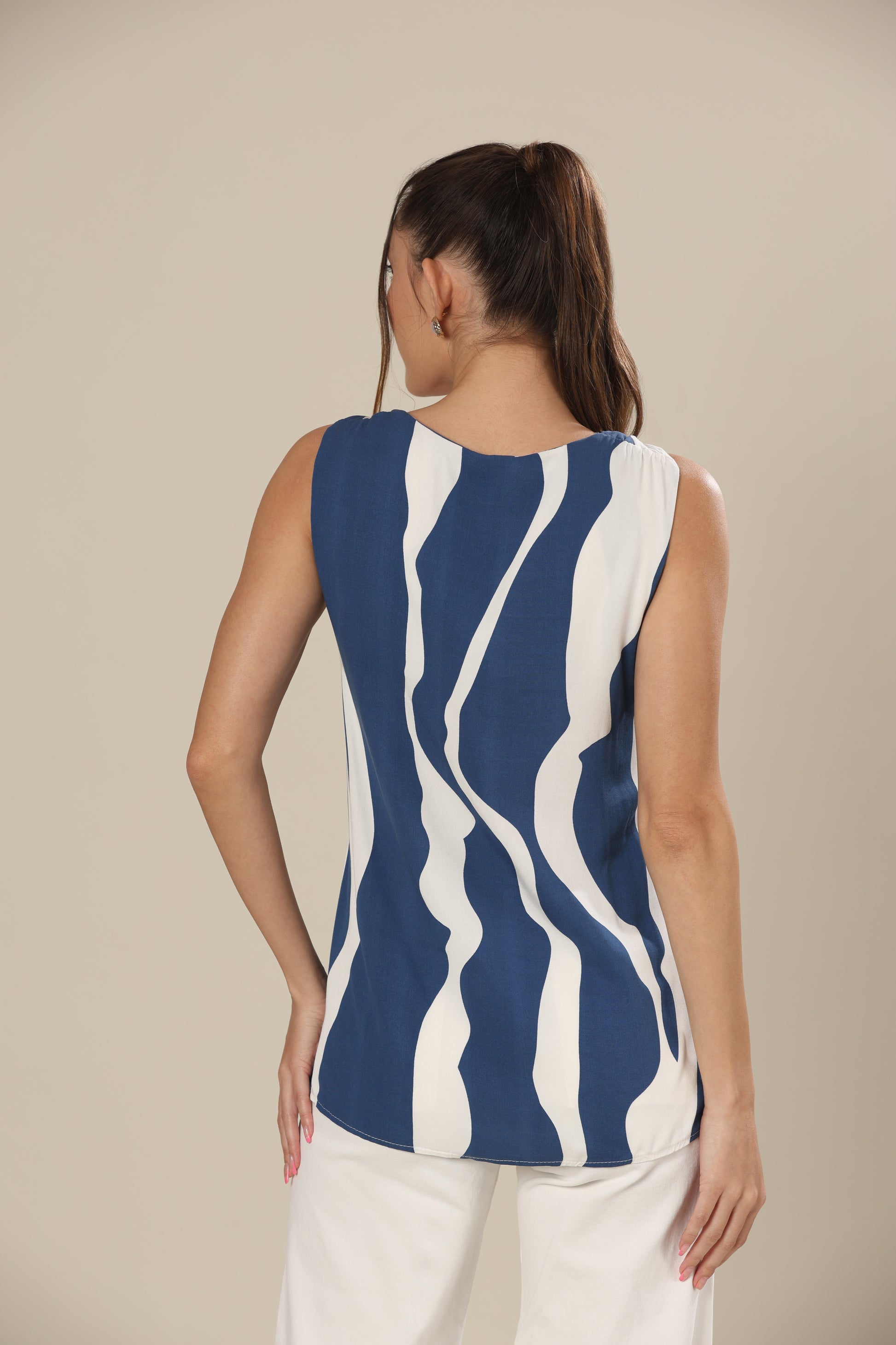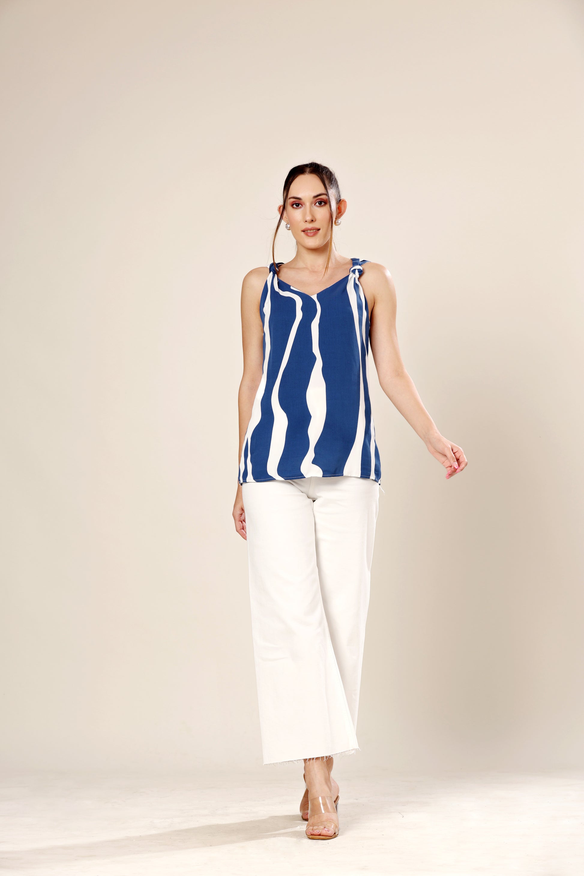 The cute sleeveless Top with a print is made of light and compact high-quality viscose, which provides complete wearing comfort. The sleeveless top has thin straps with knots, a deep "V" neckline and a loose fit.