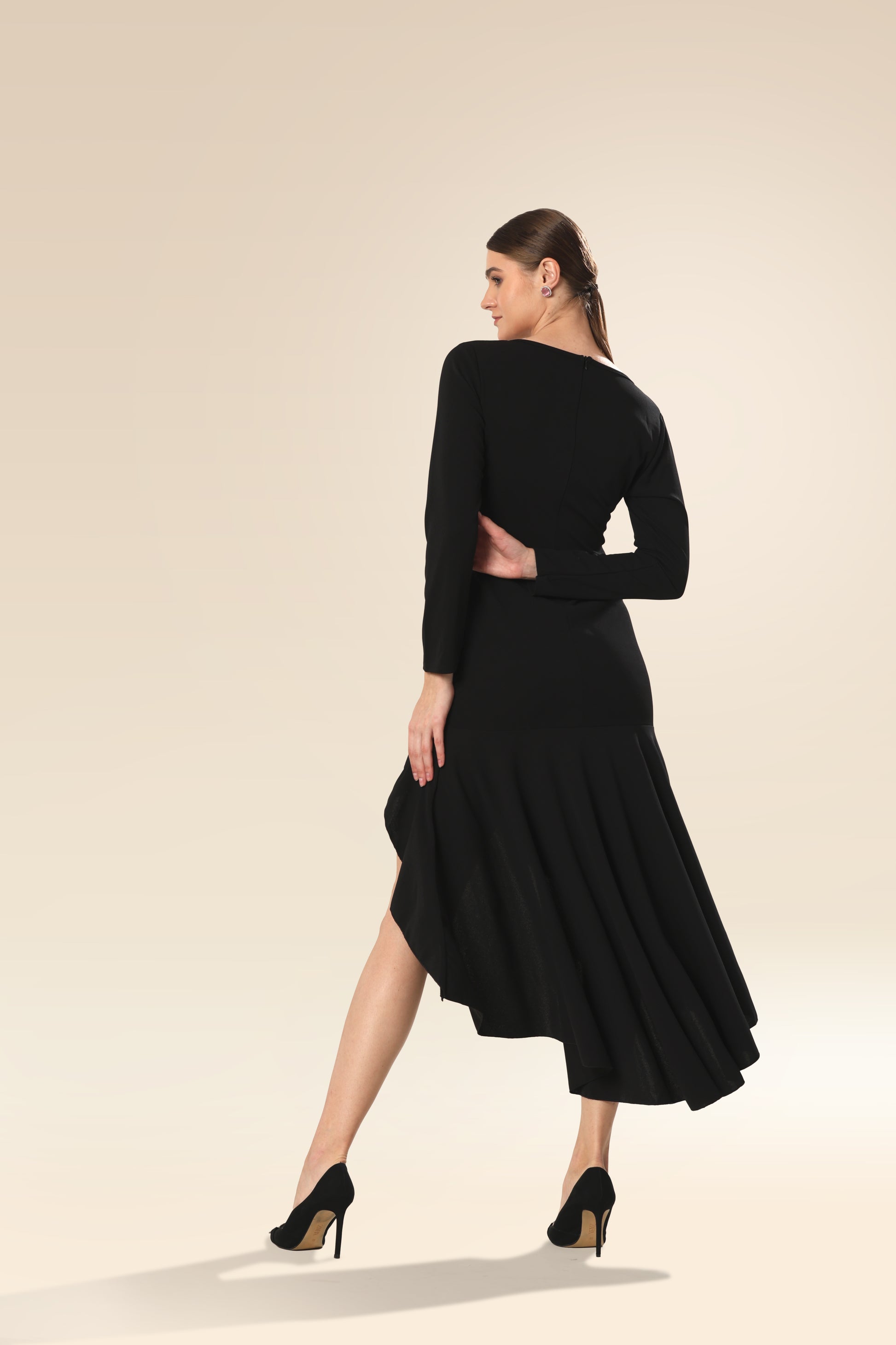 The slim fit maxi dress is made of high quality soft and stretchy fabric, offering complete comfort when worn. The dress has a deep square neckline and long fitted sleeves. The upper part of the dress is tight and closes with a zipper on the back. Skirt is asymmetrical and has a high opening and lined with ruffles at the front.
