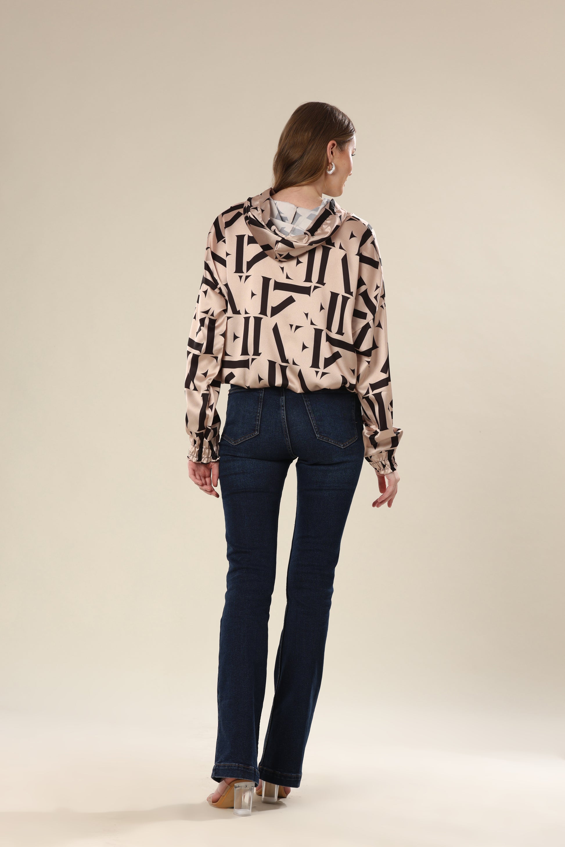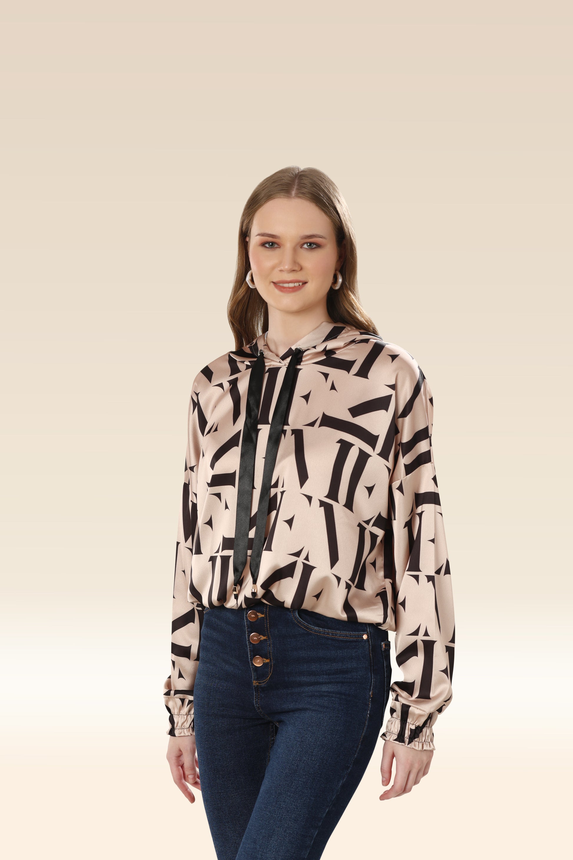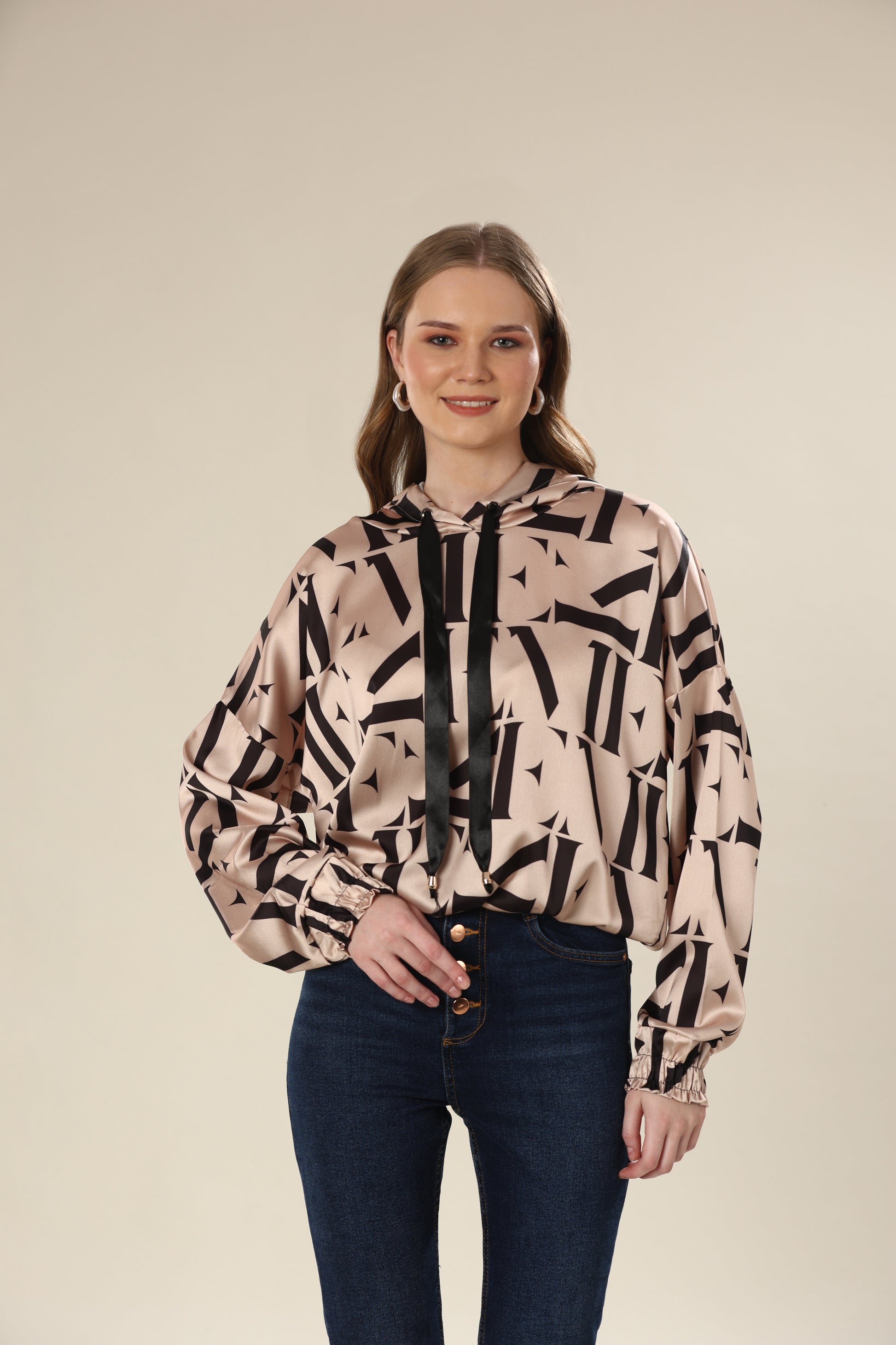 The beautiful loose fit fashion sweatshirt is made of soft and compact satin imitation fabric, which offers total comfort when worn. The trendy letter print sweatshirt features a hood with satin drawstrings and long sleeves finished with elastic. The sweatshirt is loose fitting and finished with elastic.