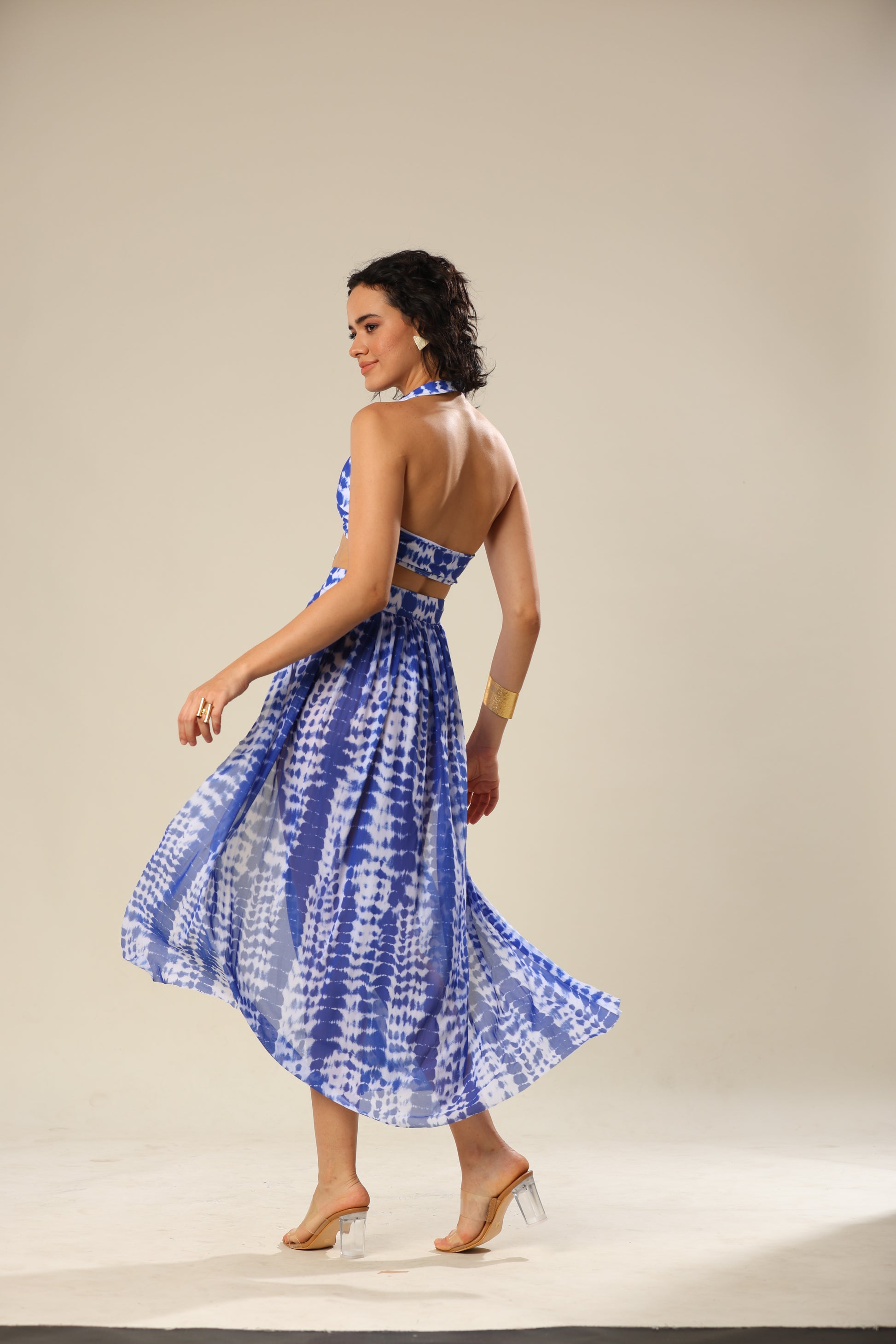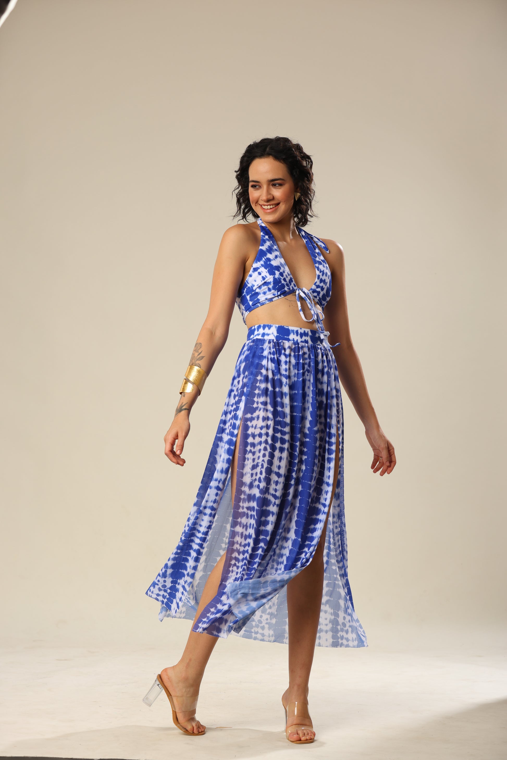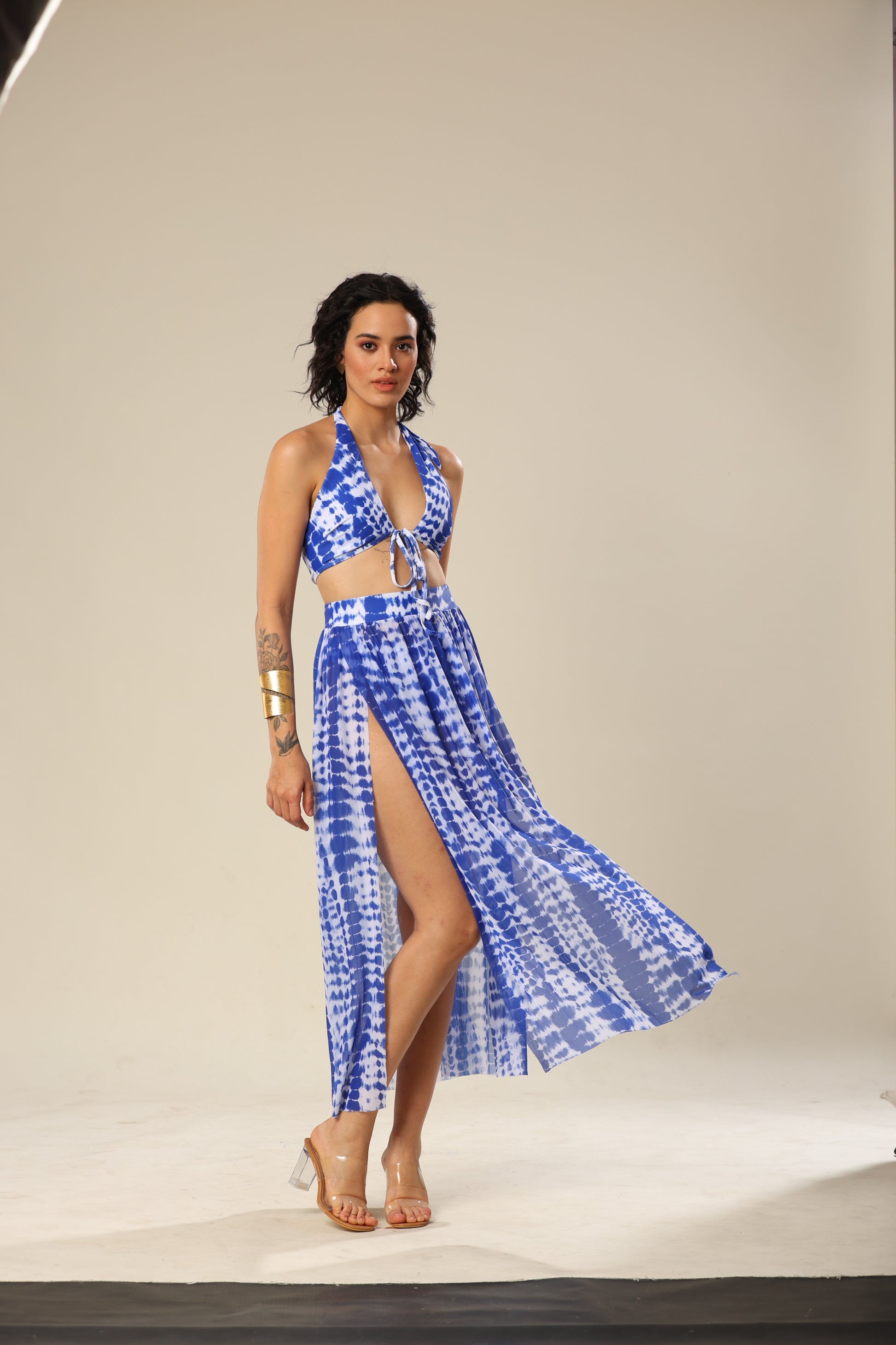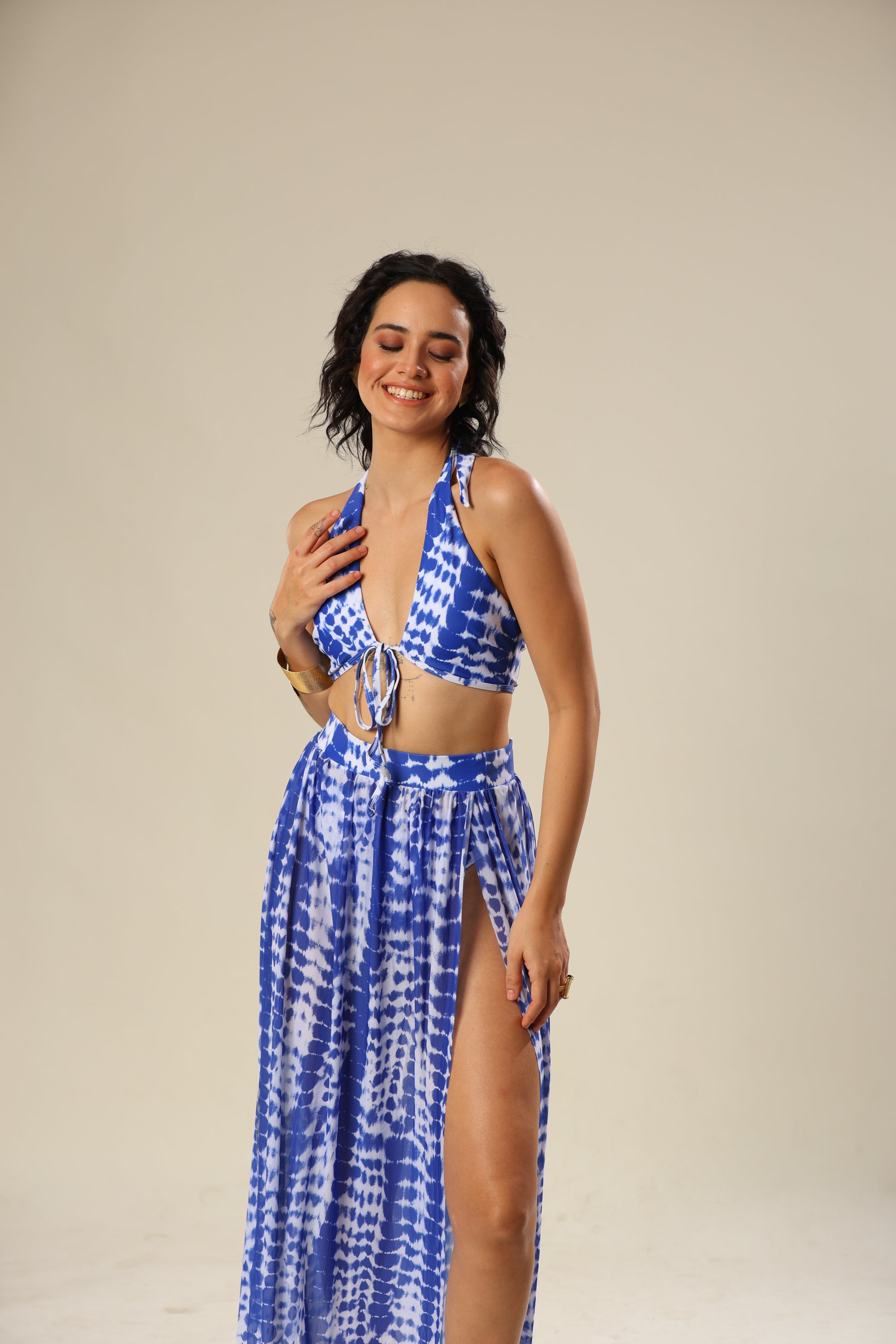 Criss cross halter wireless bra top & High cut bikini bottom & split thigh skirt 3- Piece set.