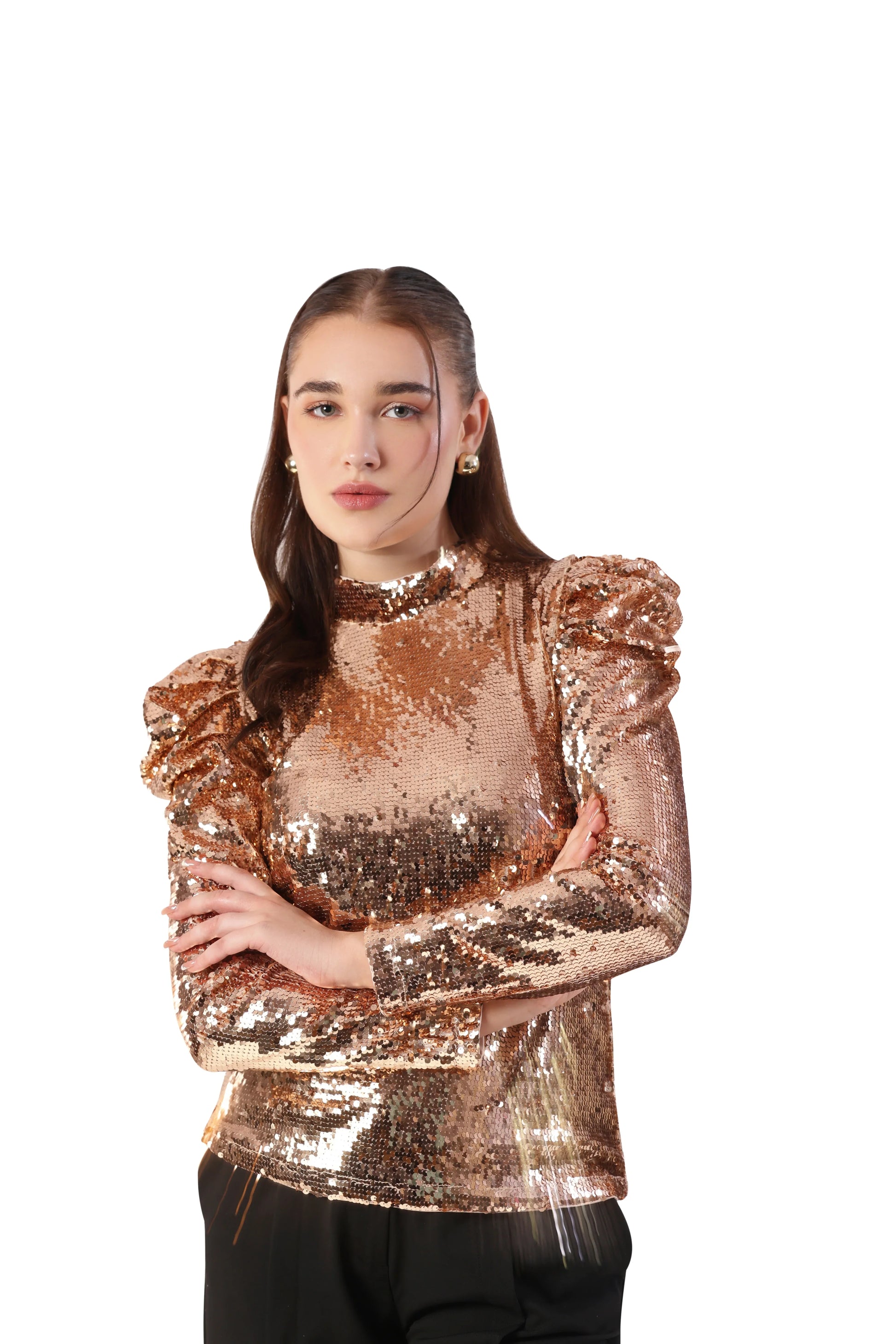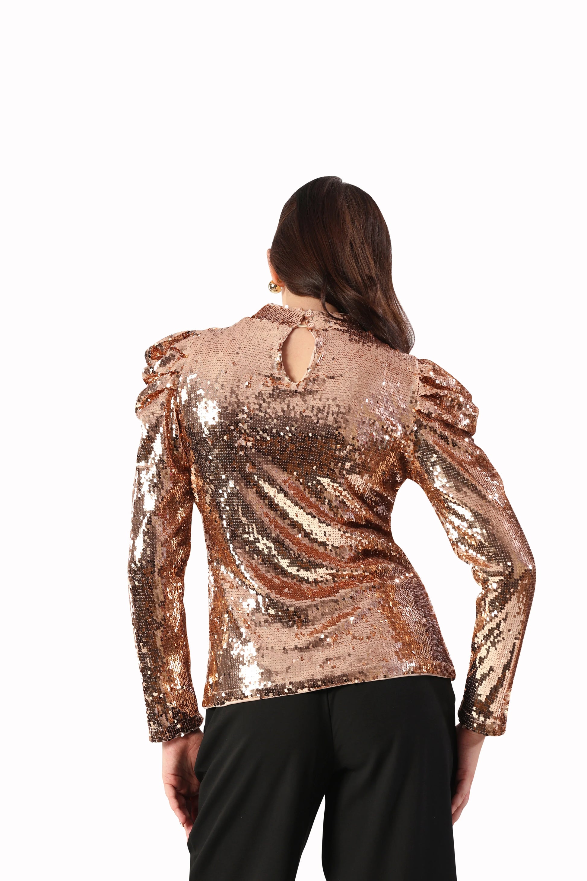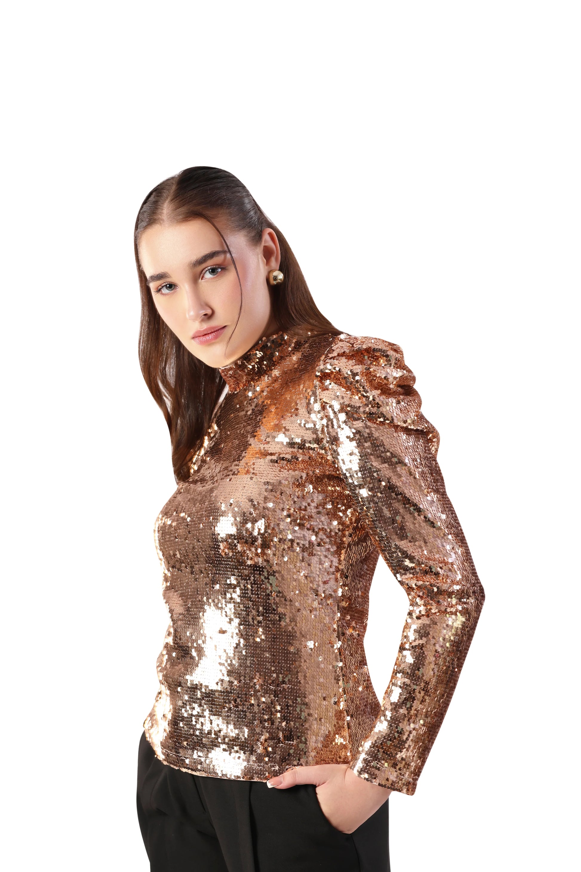 This charming top is comfortable and flattering for all body types. The sequins catch the light creating a dazzling effect that will make you stand out. The mock neck is perfect for parties. The ruched sleeves offers a unique and fashionable look. It elevate your personal style effortlessly./span>