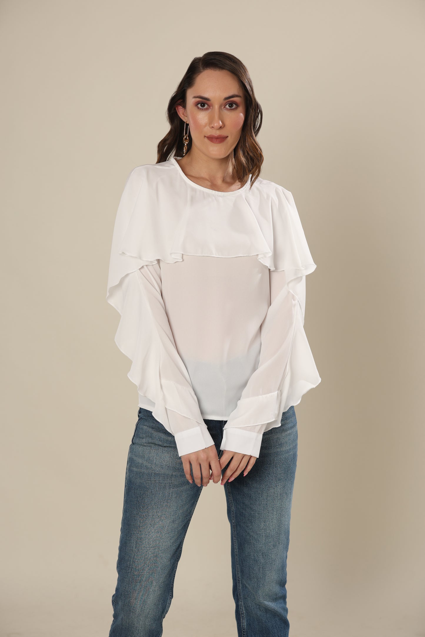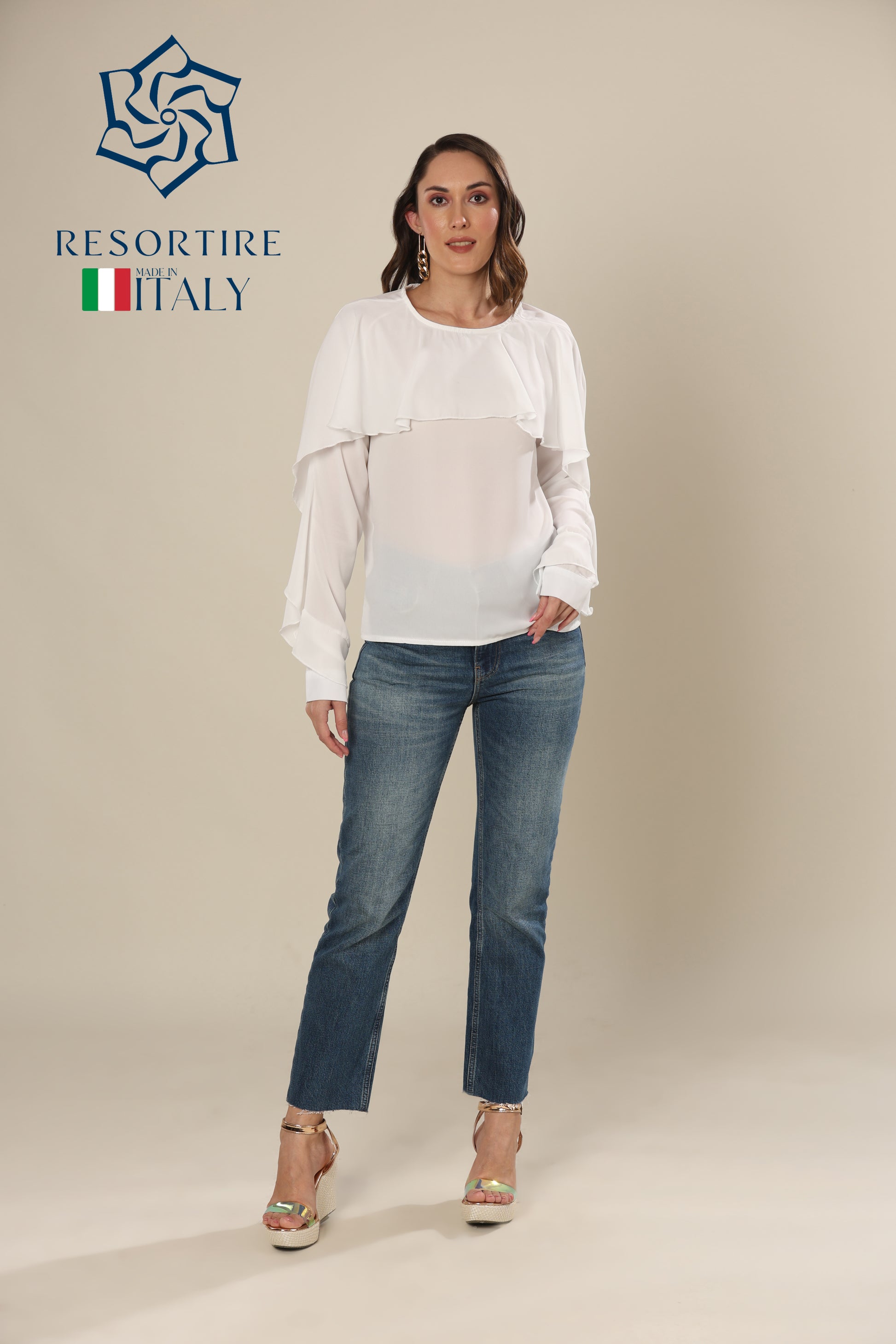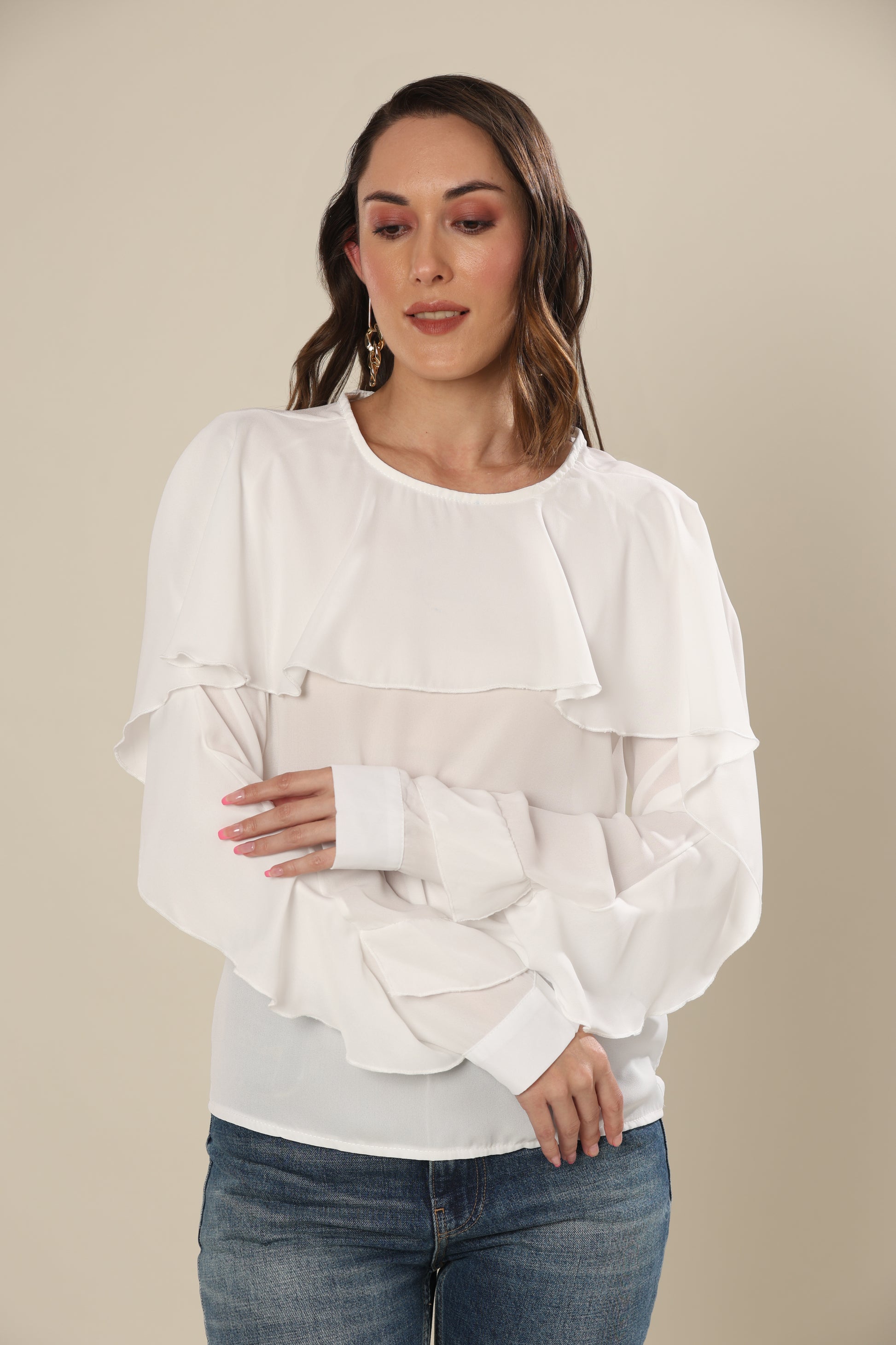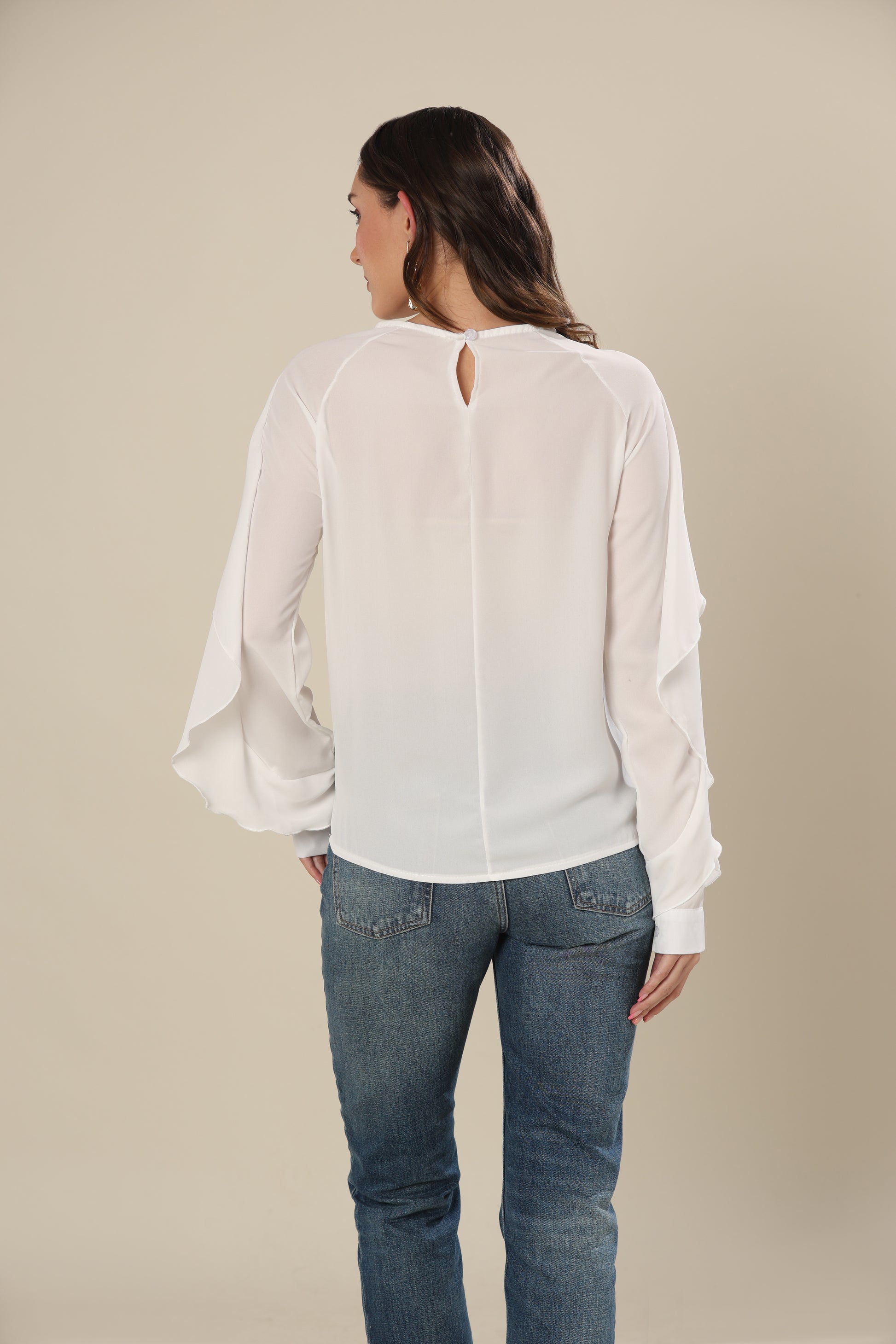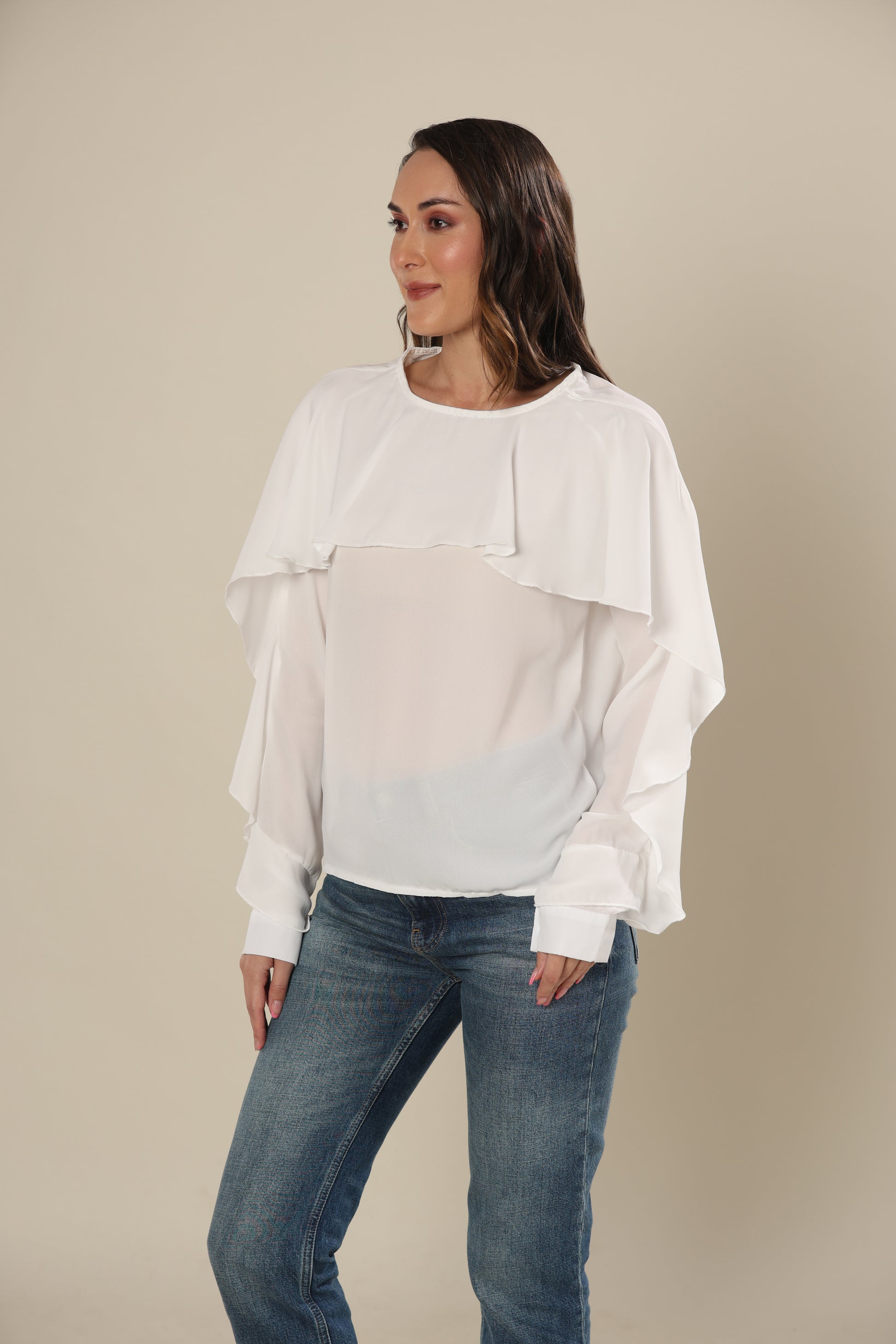 The fashionable Top is made of soft and compact fabric of high quality, which offers complete comfort when worn. The loose-fitting Top has long sleeves with ruffles and a round collar.
