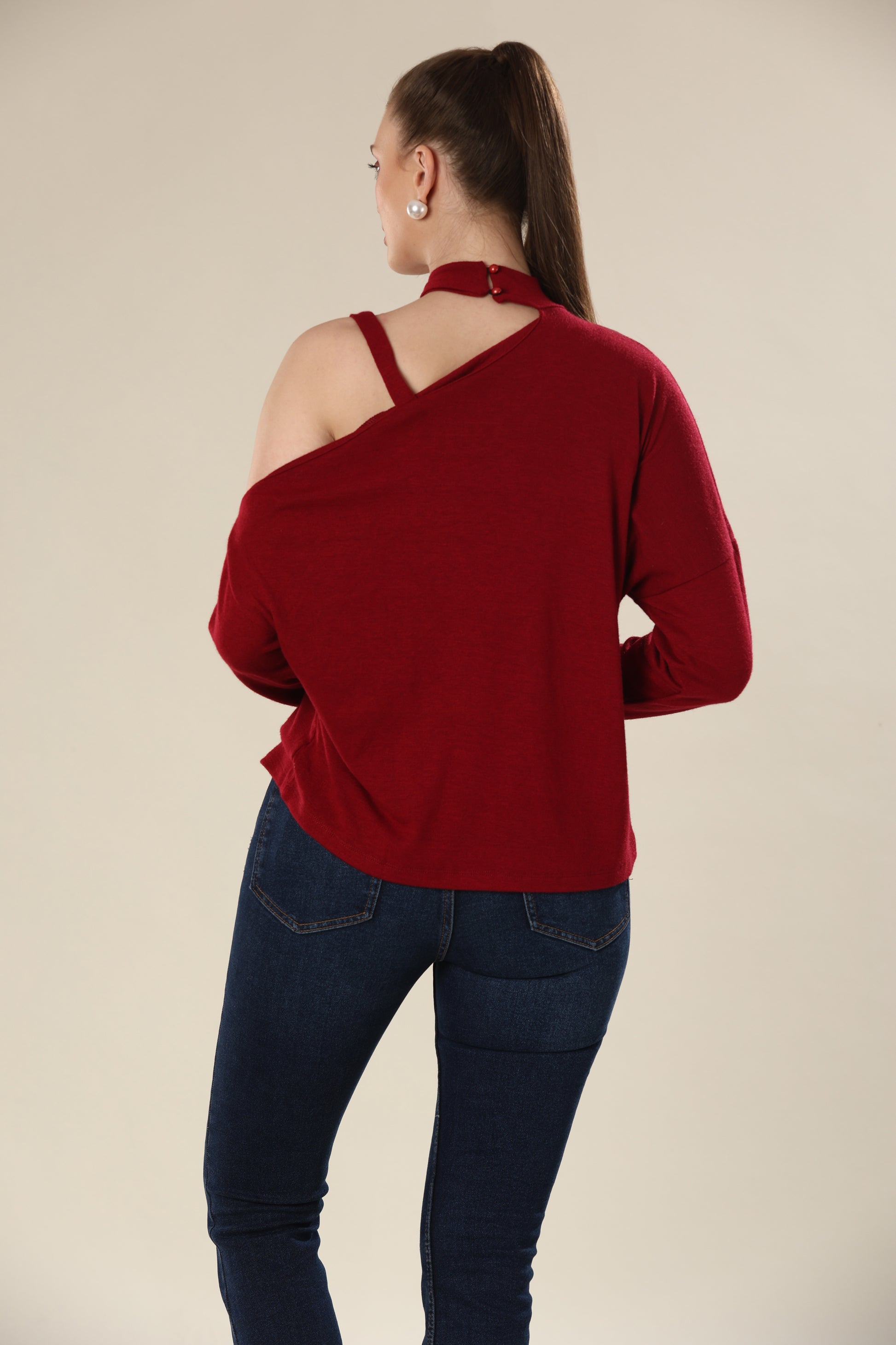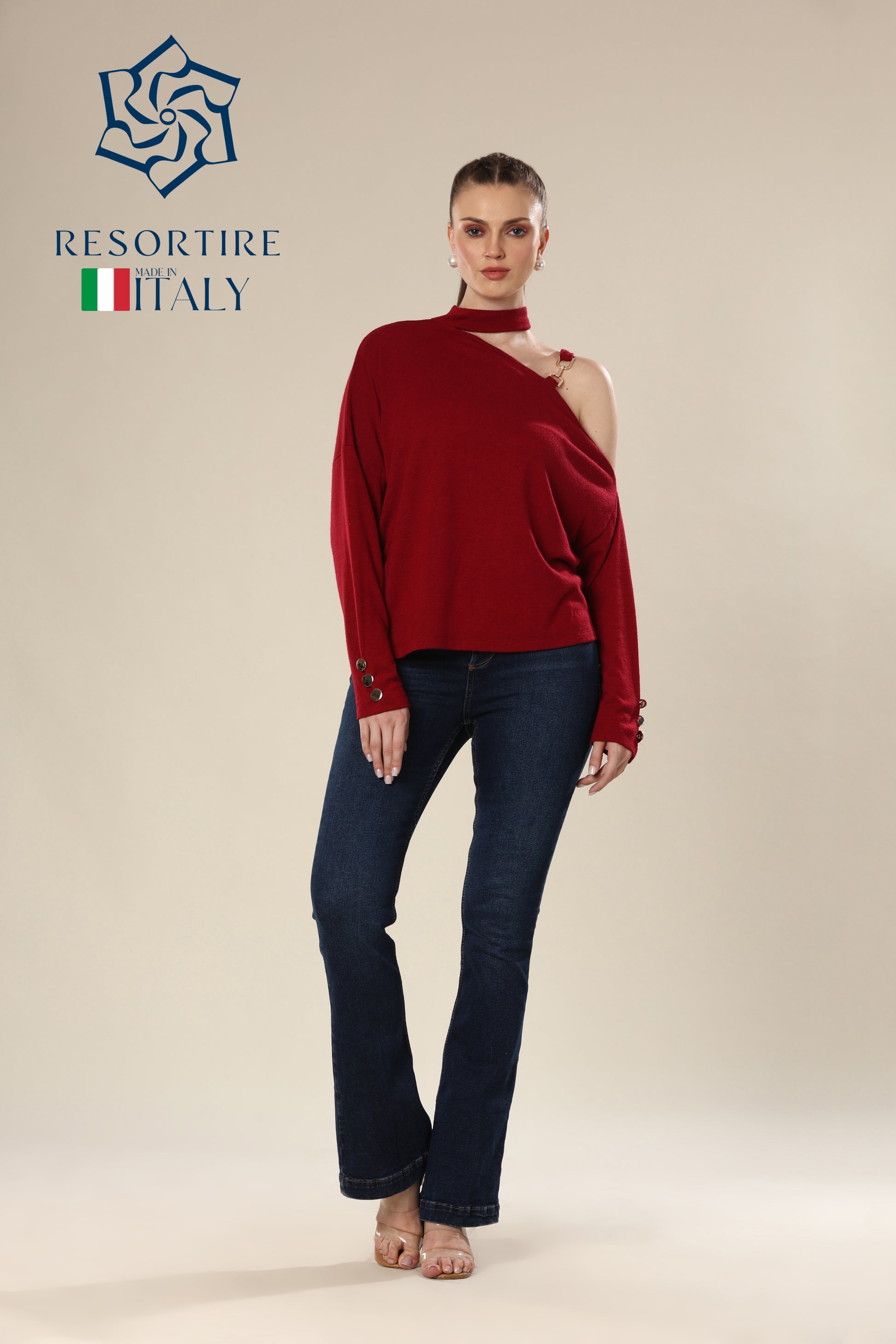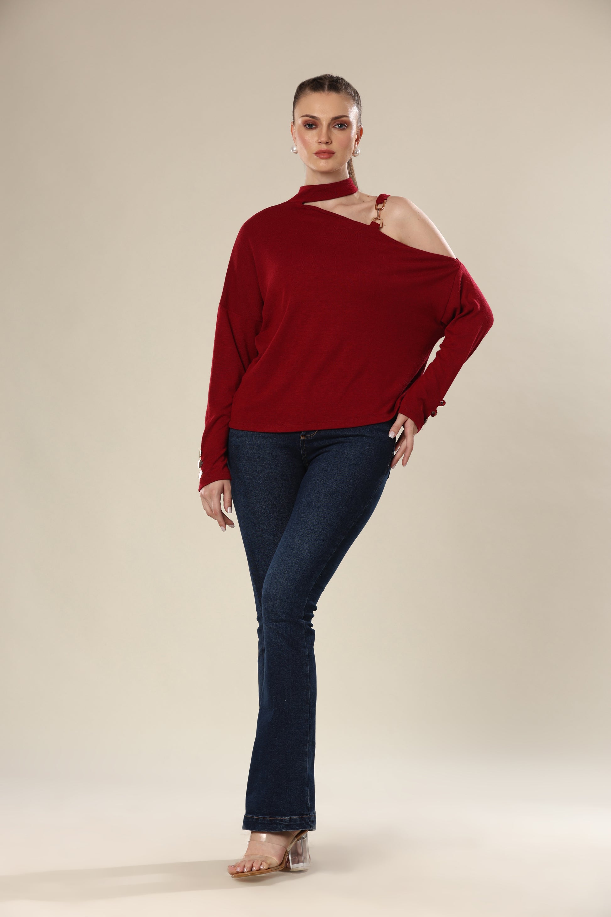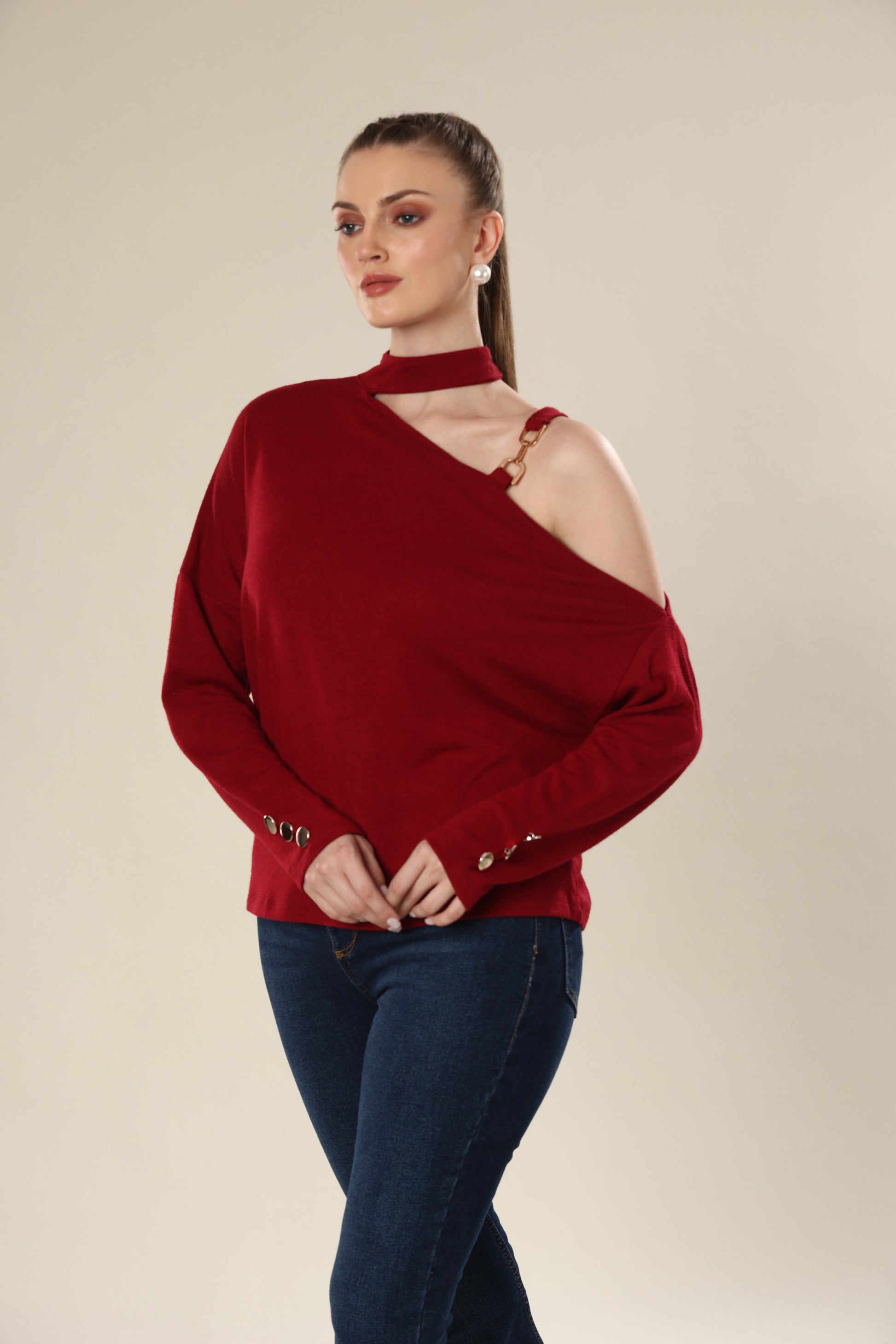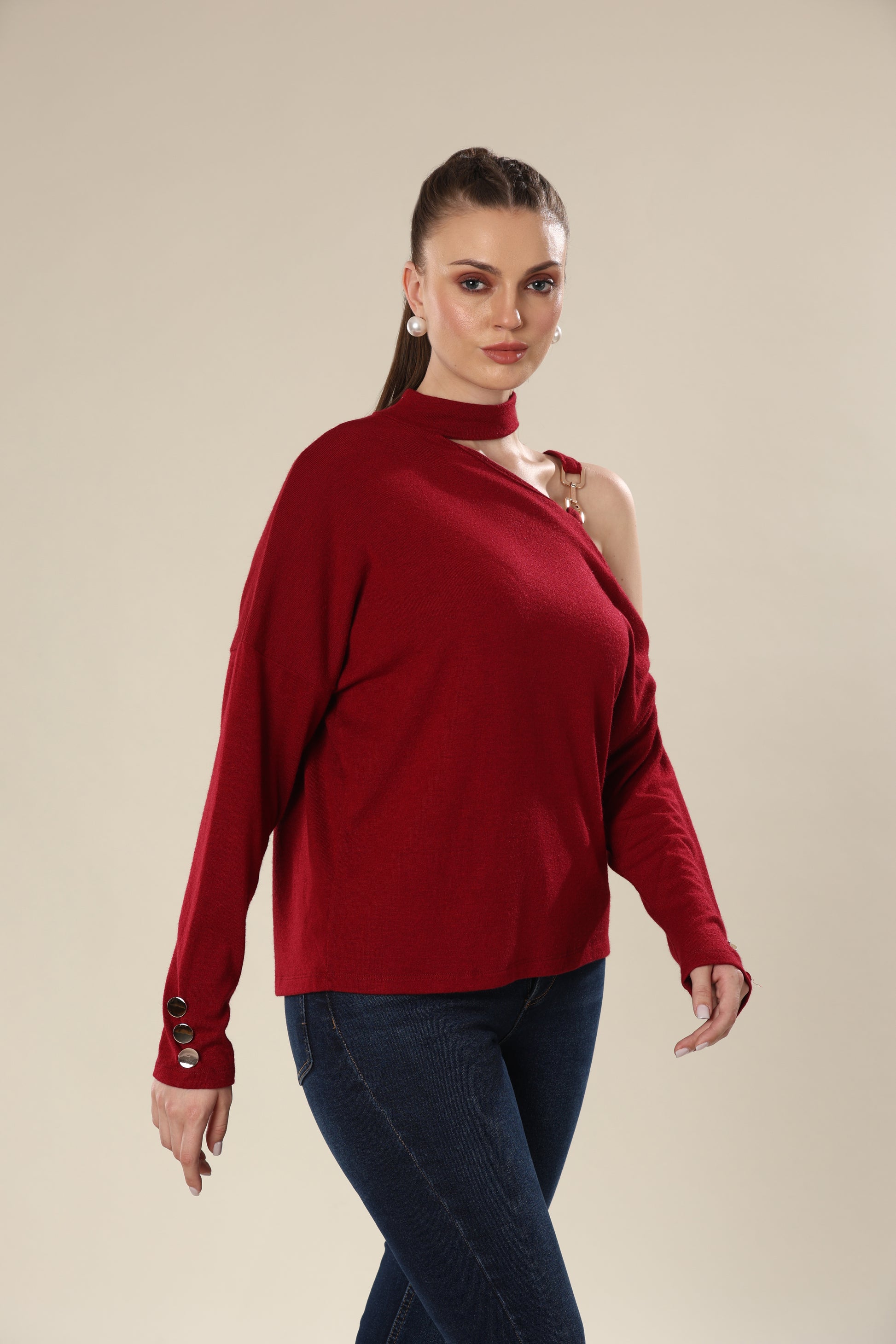 The stylish loose fit top is made from high-quality compact fabric for total comfort. Fashion top features high neckline and asymmetrical neckline and asymmetrical neckline with a metal detail strap. The sleeves are long and decorated with buttons.