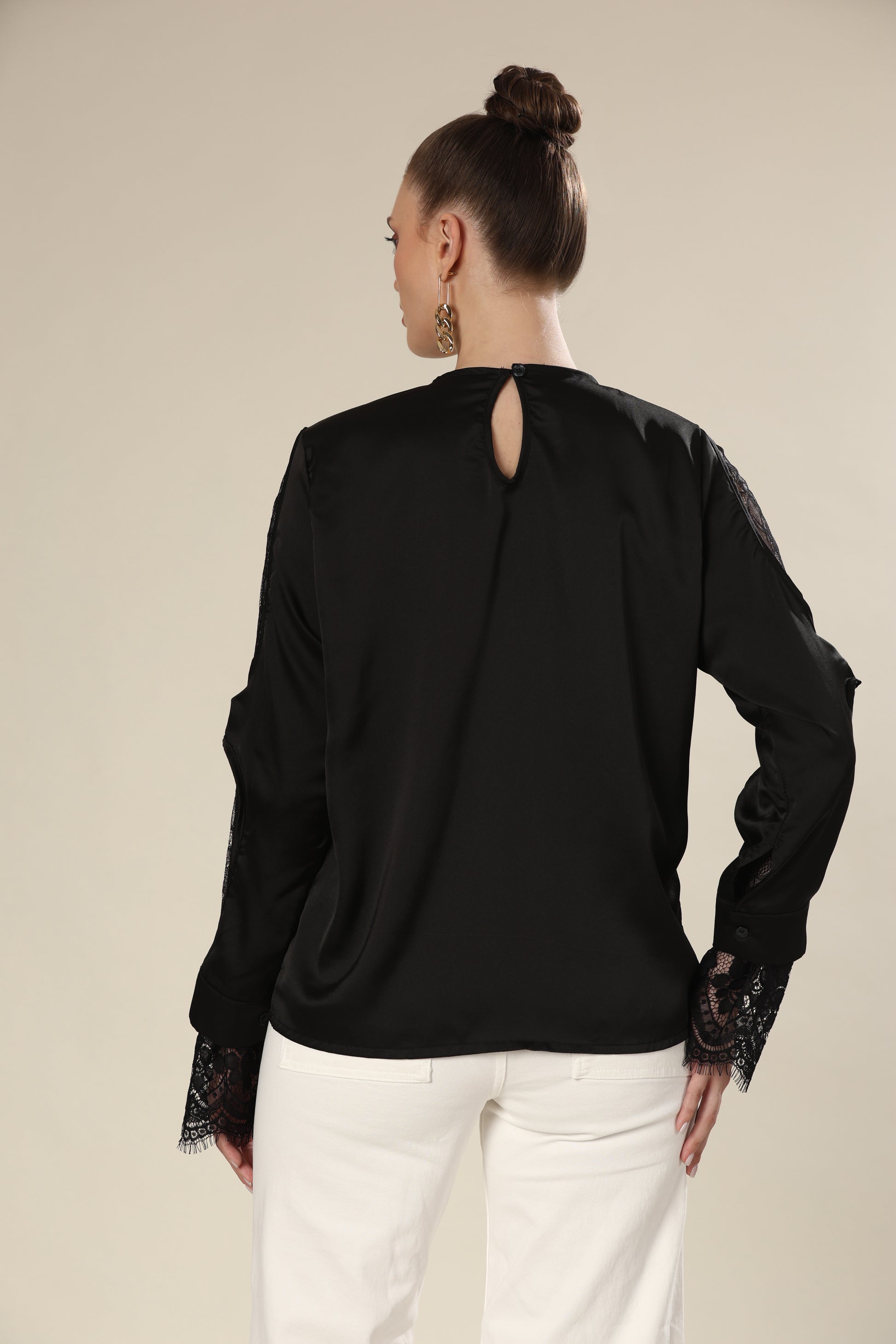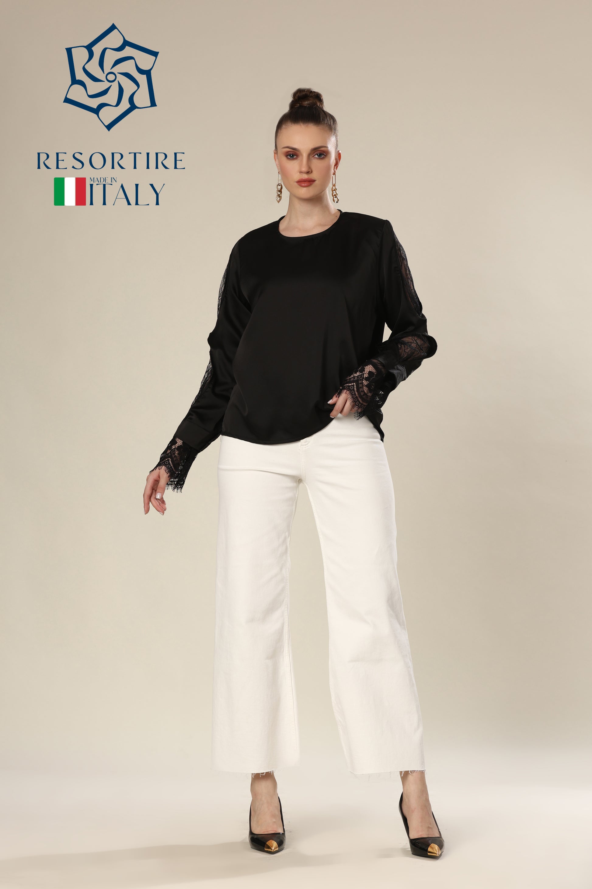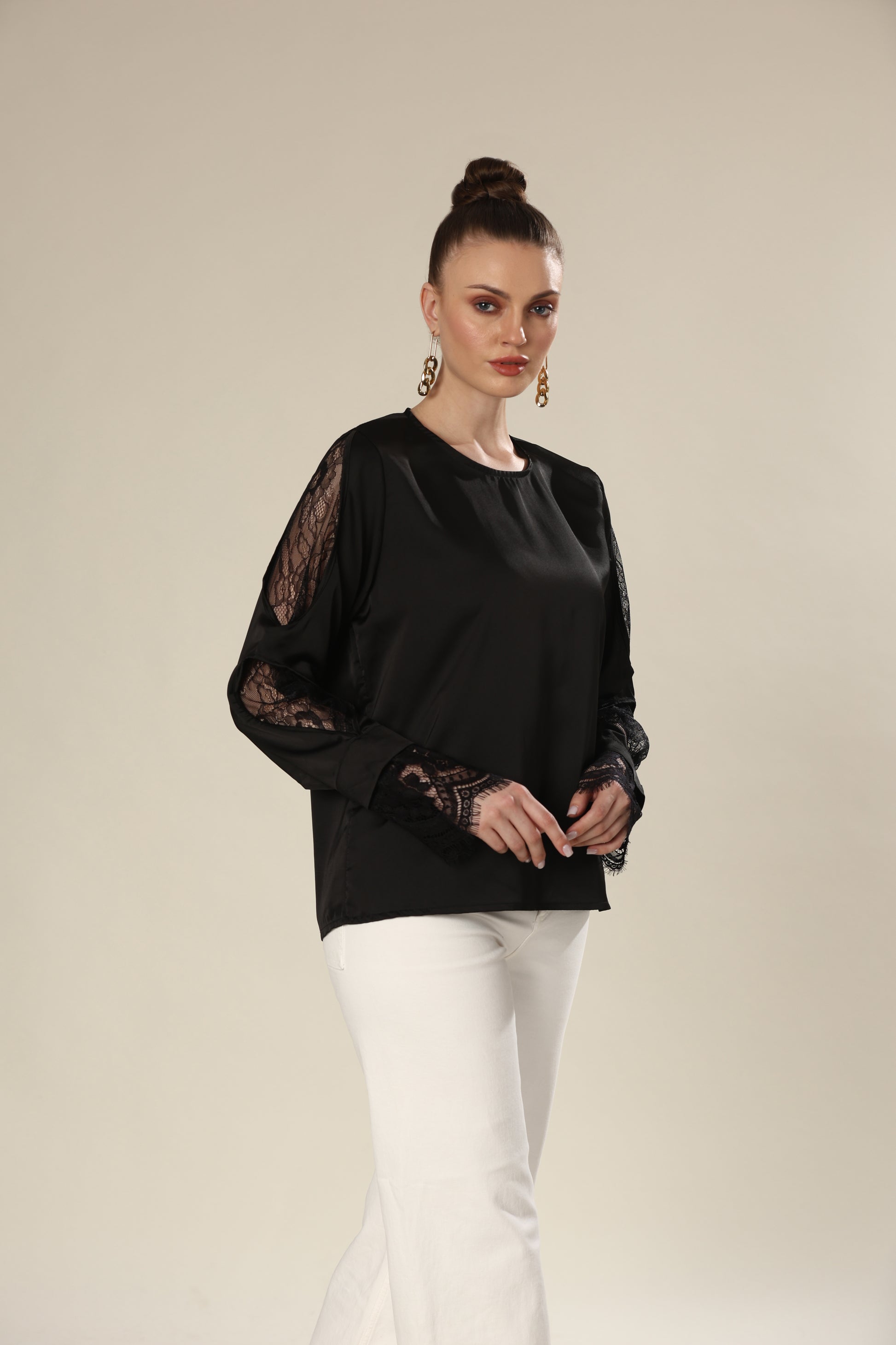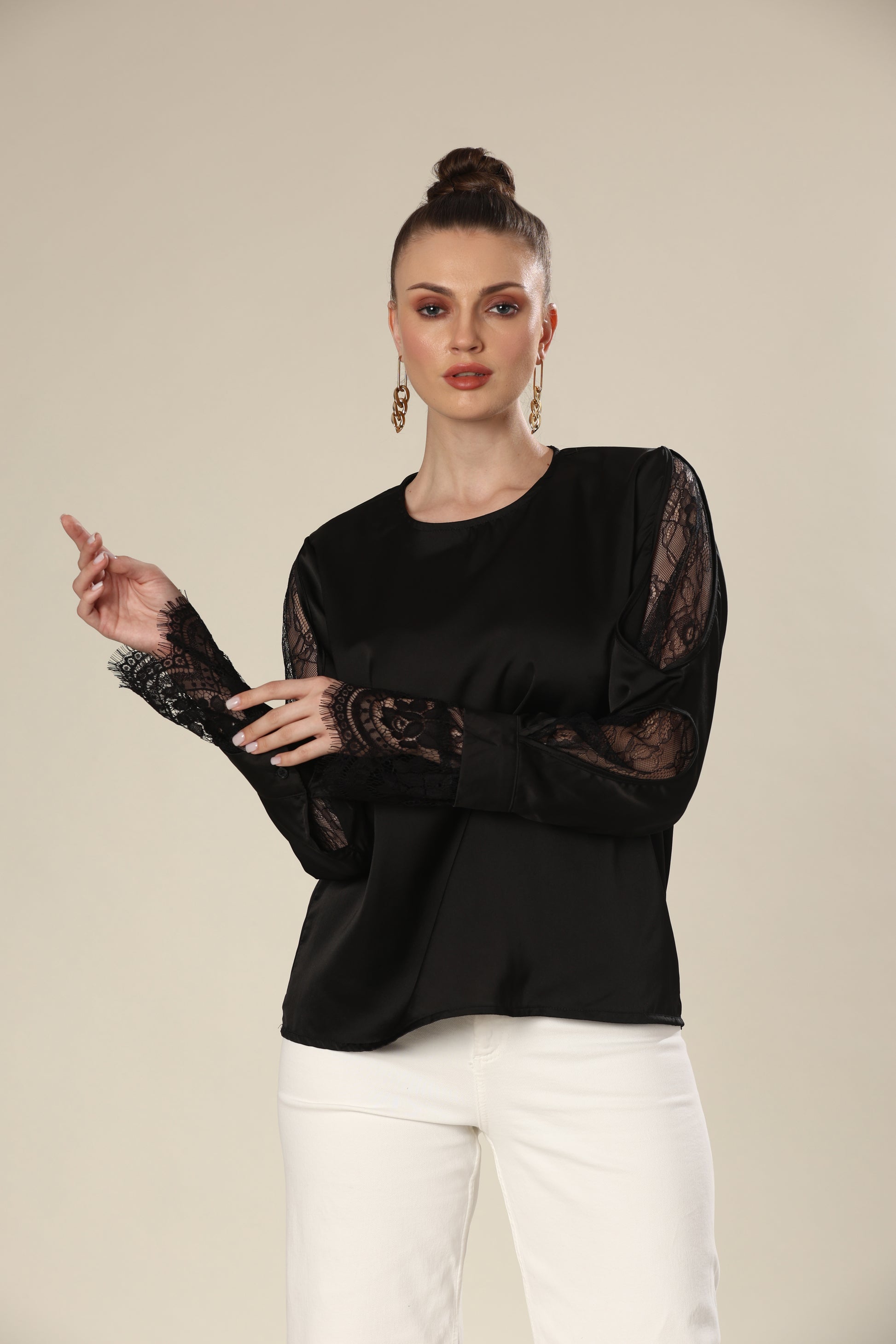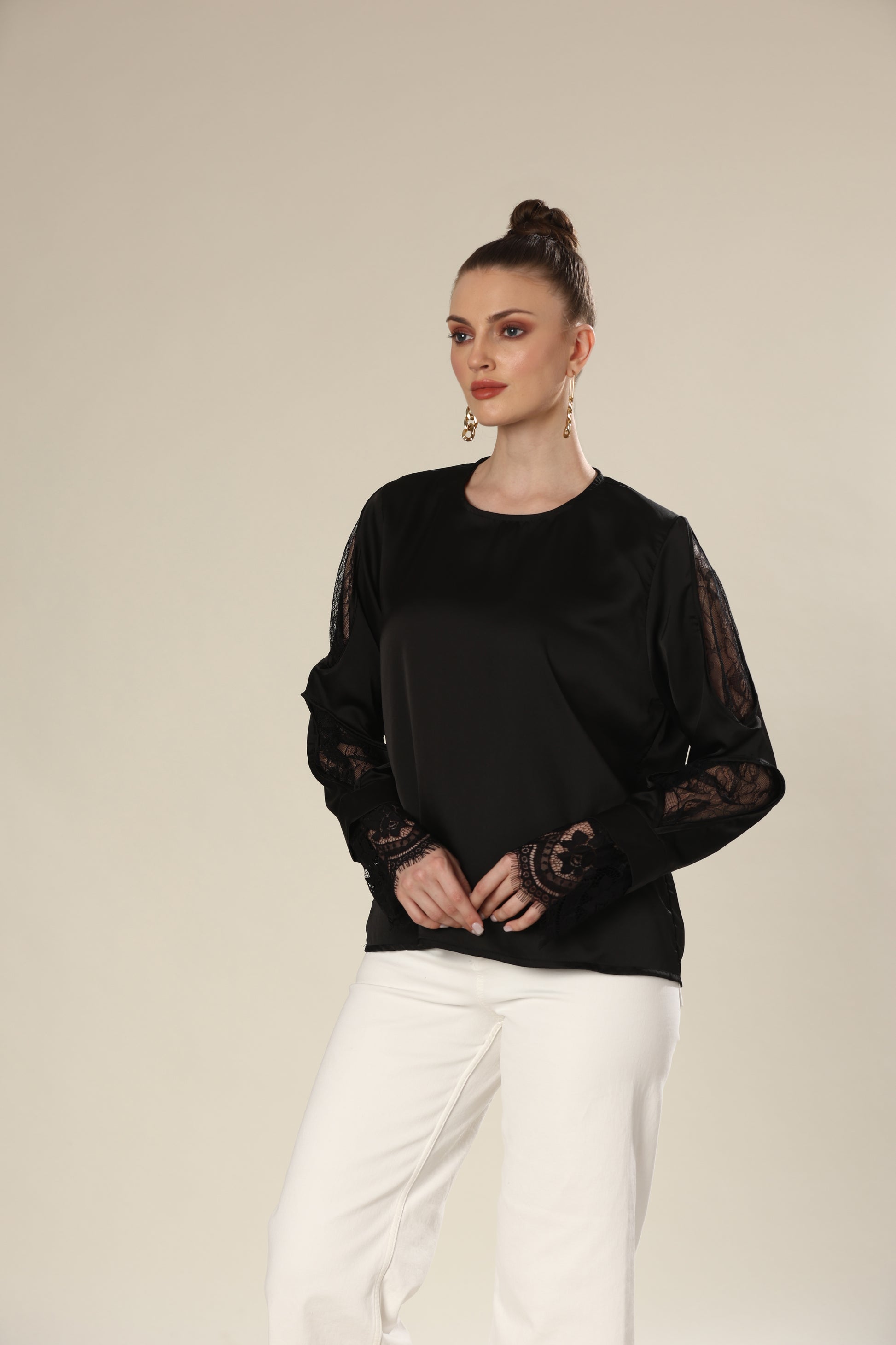 The loose-fitting Top is made of soft and compact fabric of high quality, which offers complete wearing comfort. The Top has a round collar. The sleeves are long, loose and compressed at the wrist area and are finished with lace. The sleeves are adorned with beautiful translucent lace inserts.