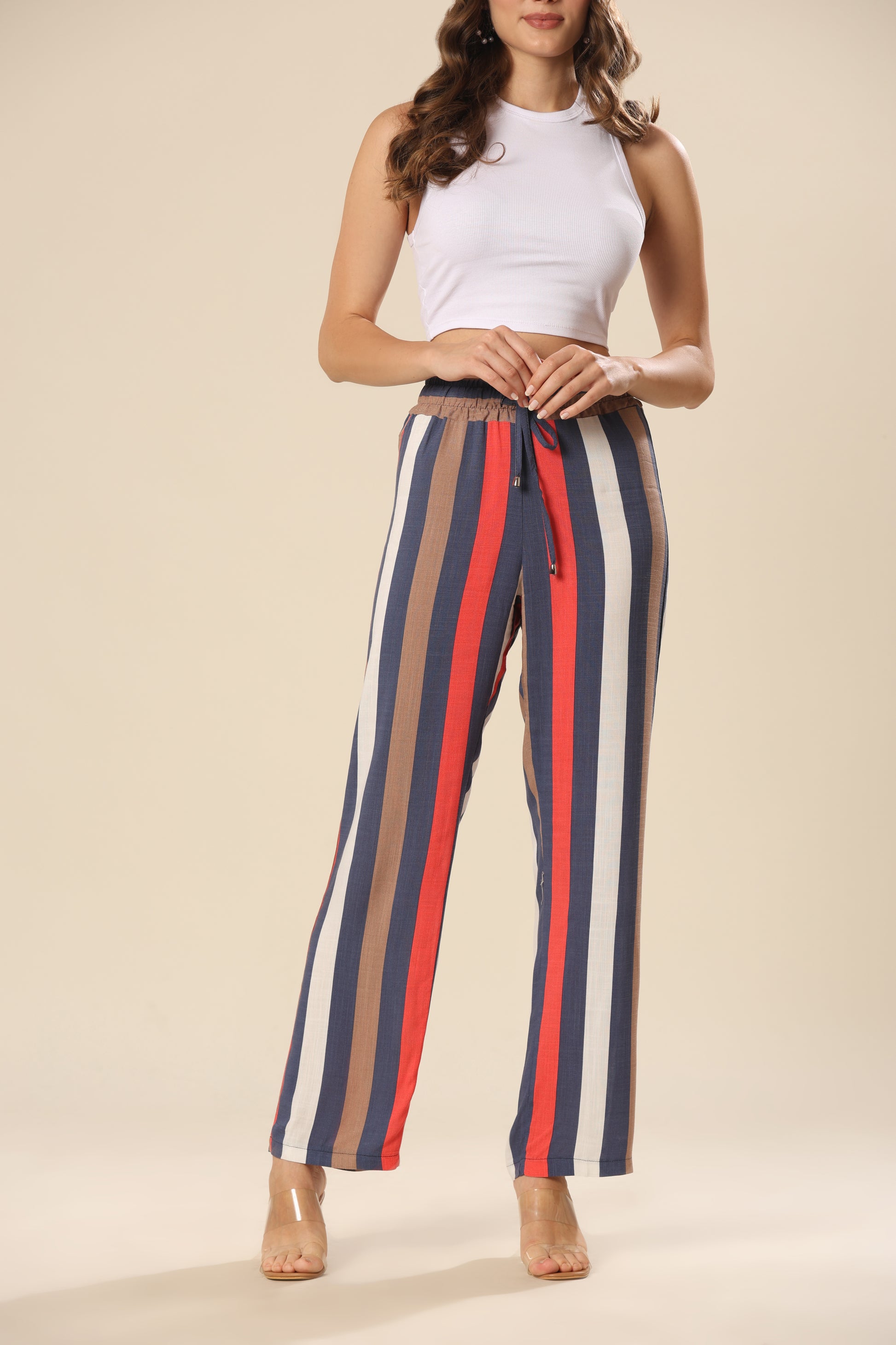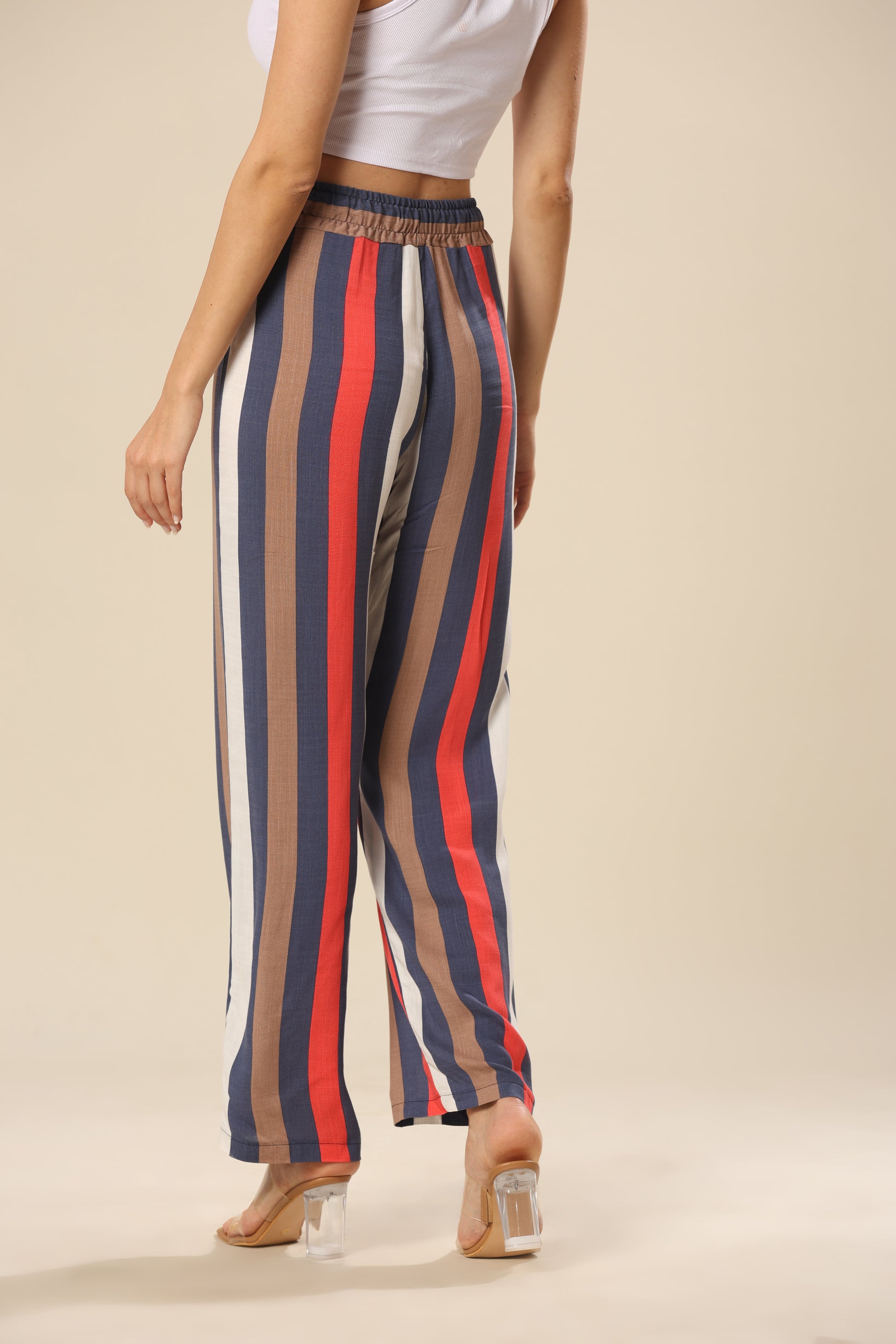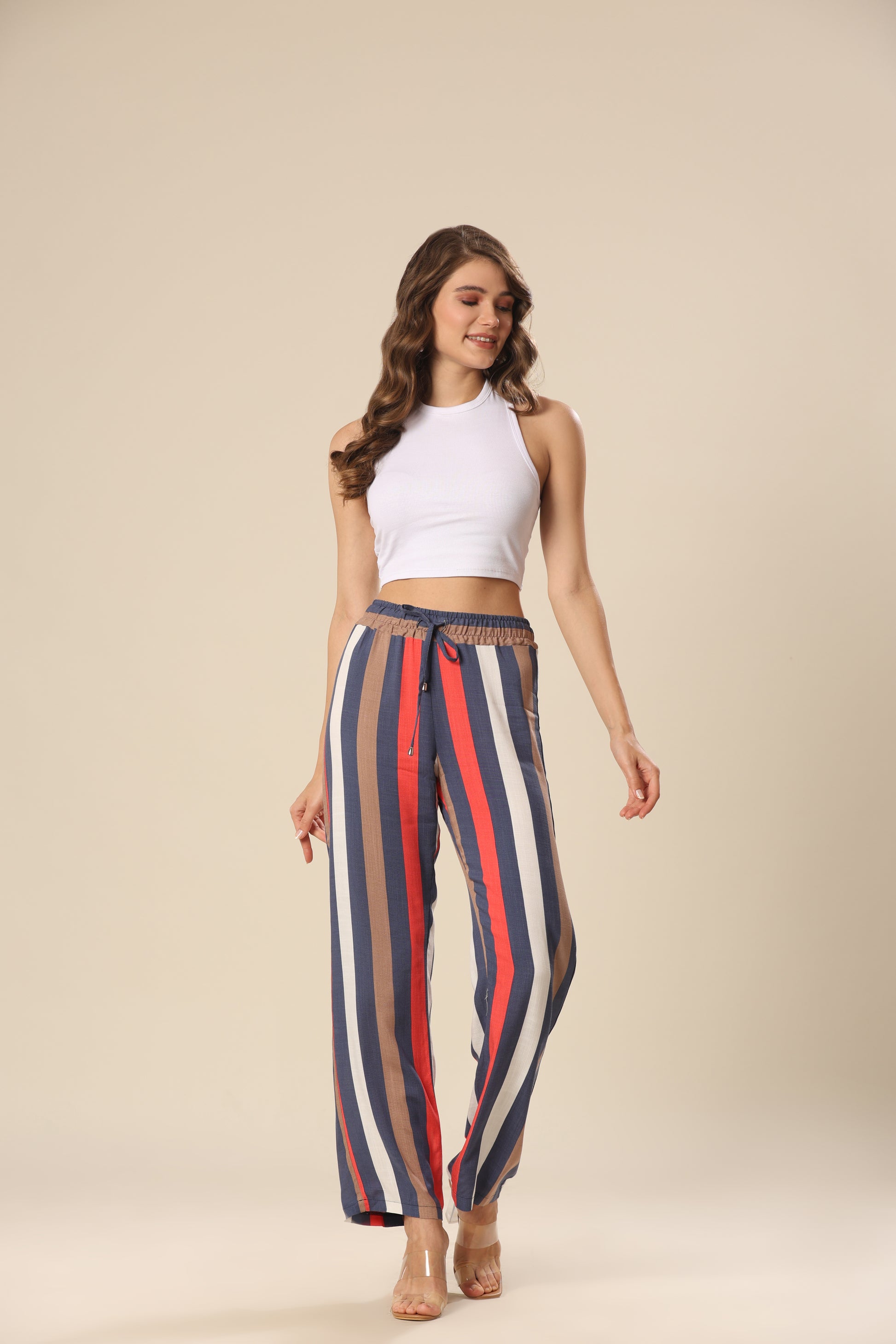The long trousers are made of 100% high-quality viscose, which offers perfect wearing comfort. The striped patterned trousers have an elasticated waist and a straight leg.