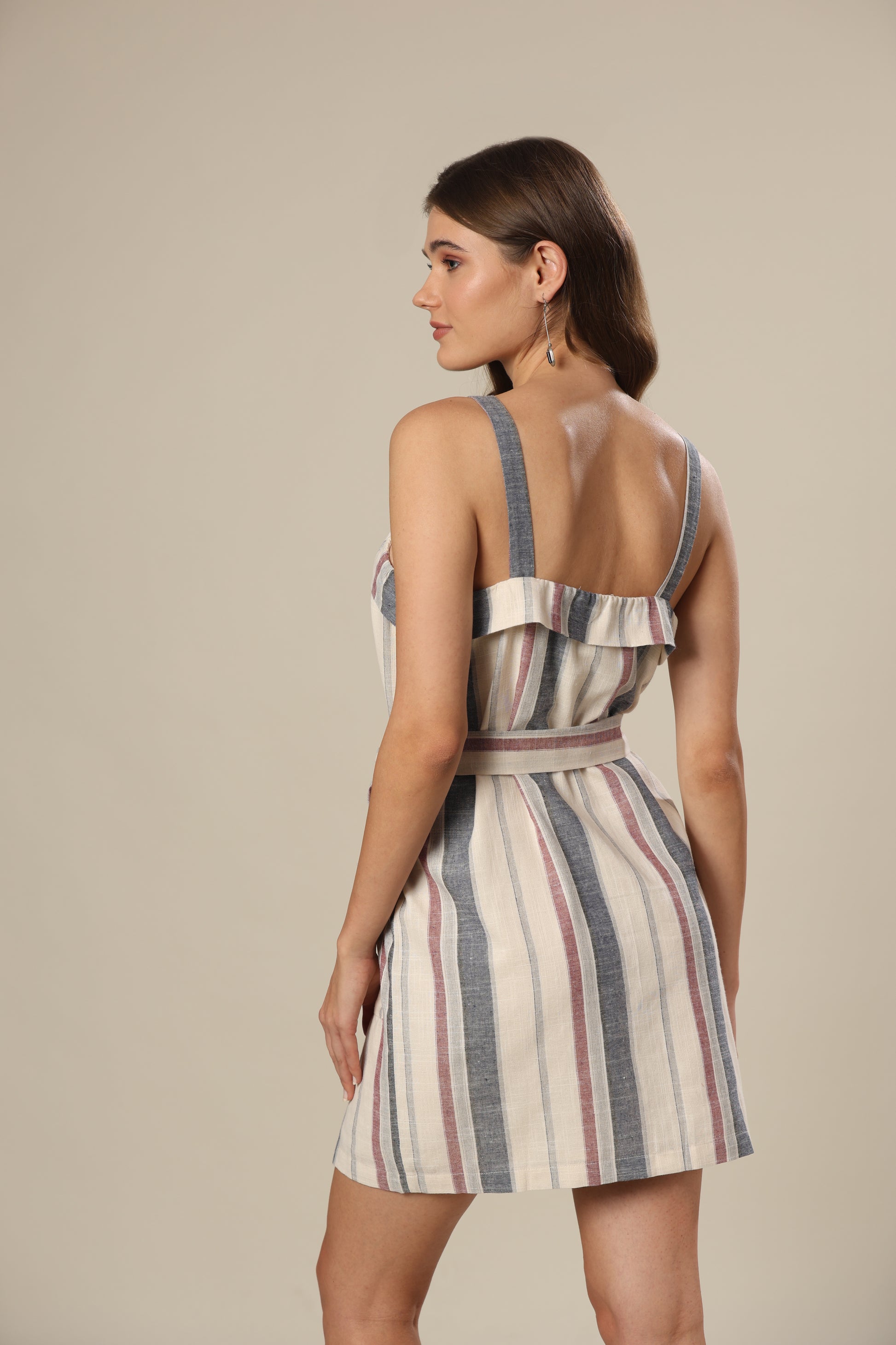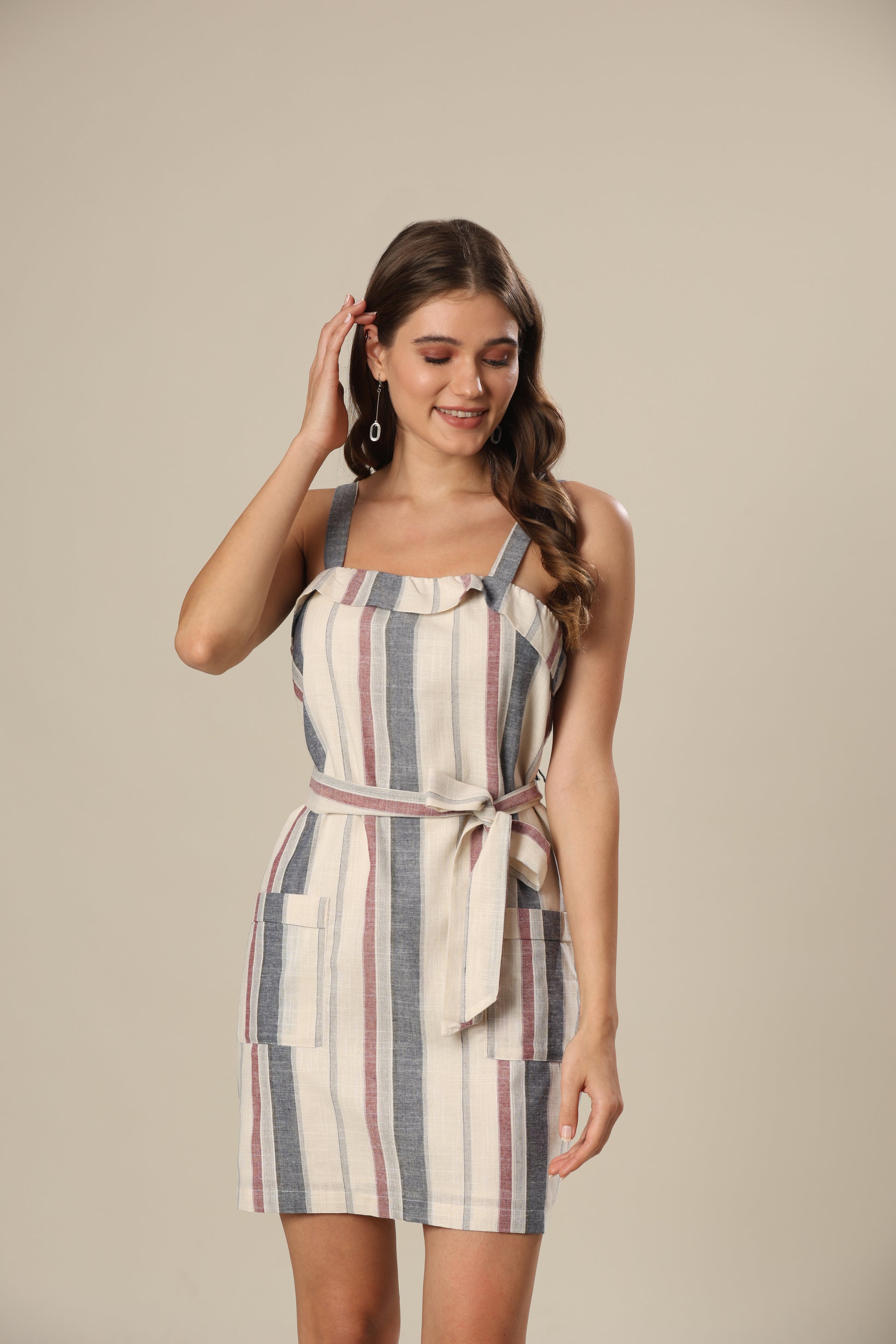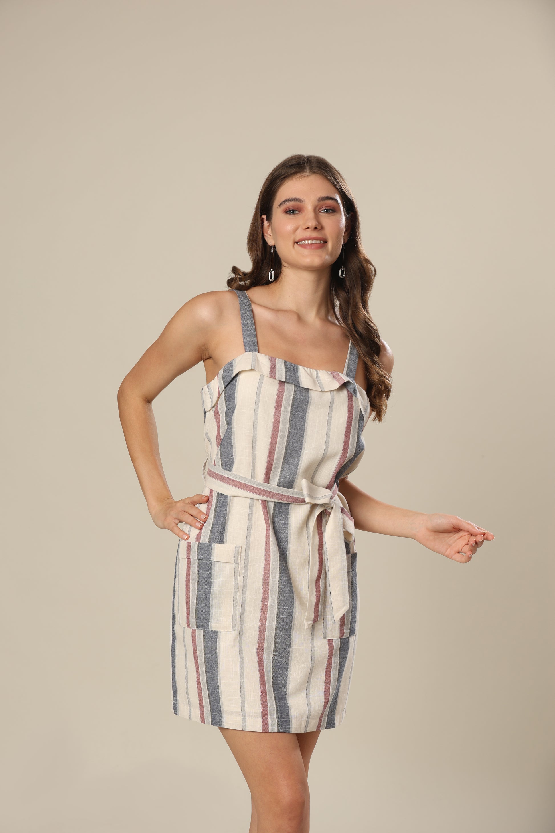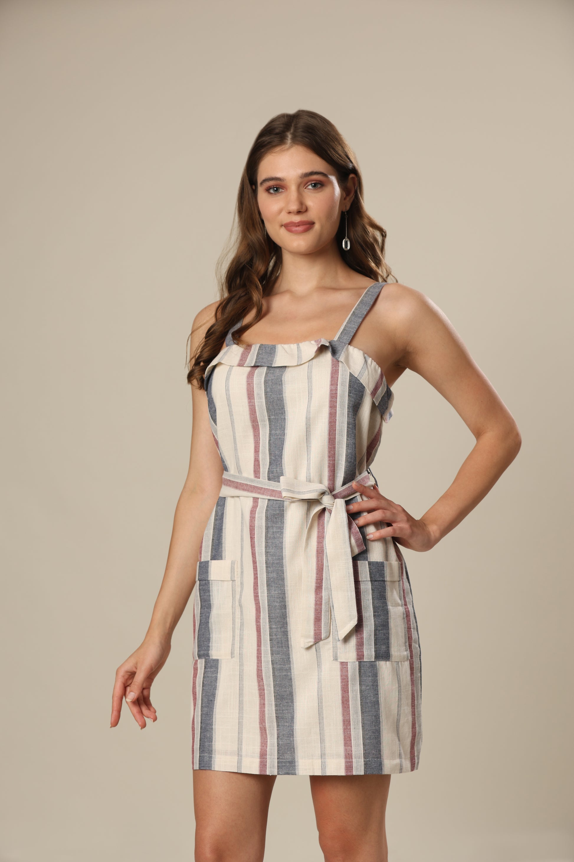Stripe frill trim patch pocket belted mini dress .